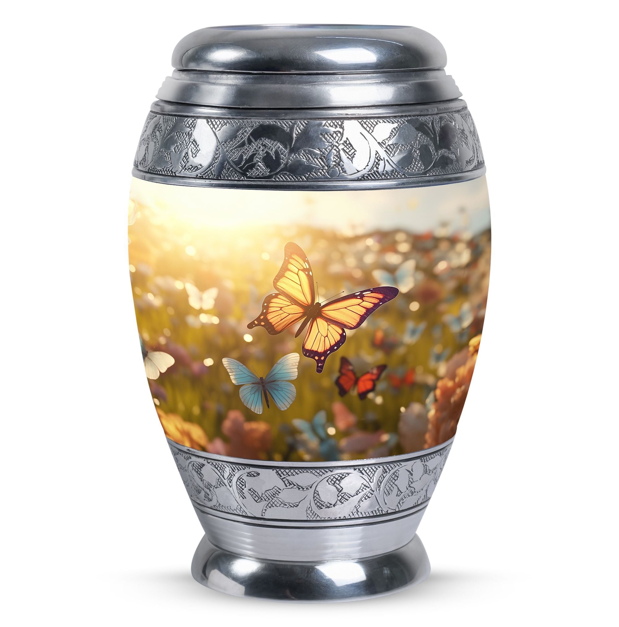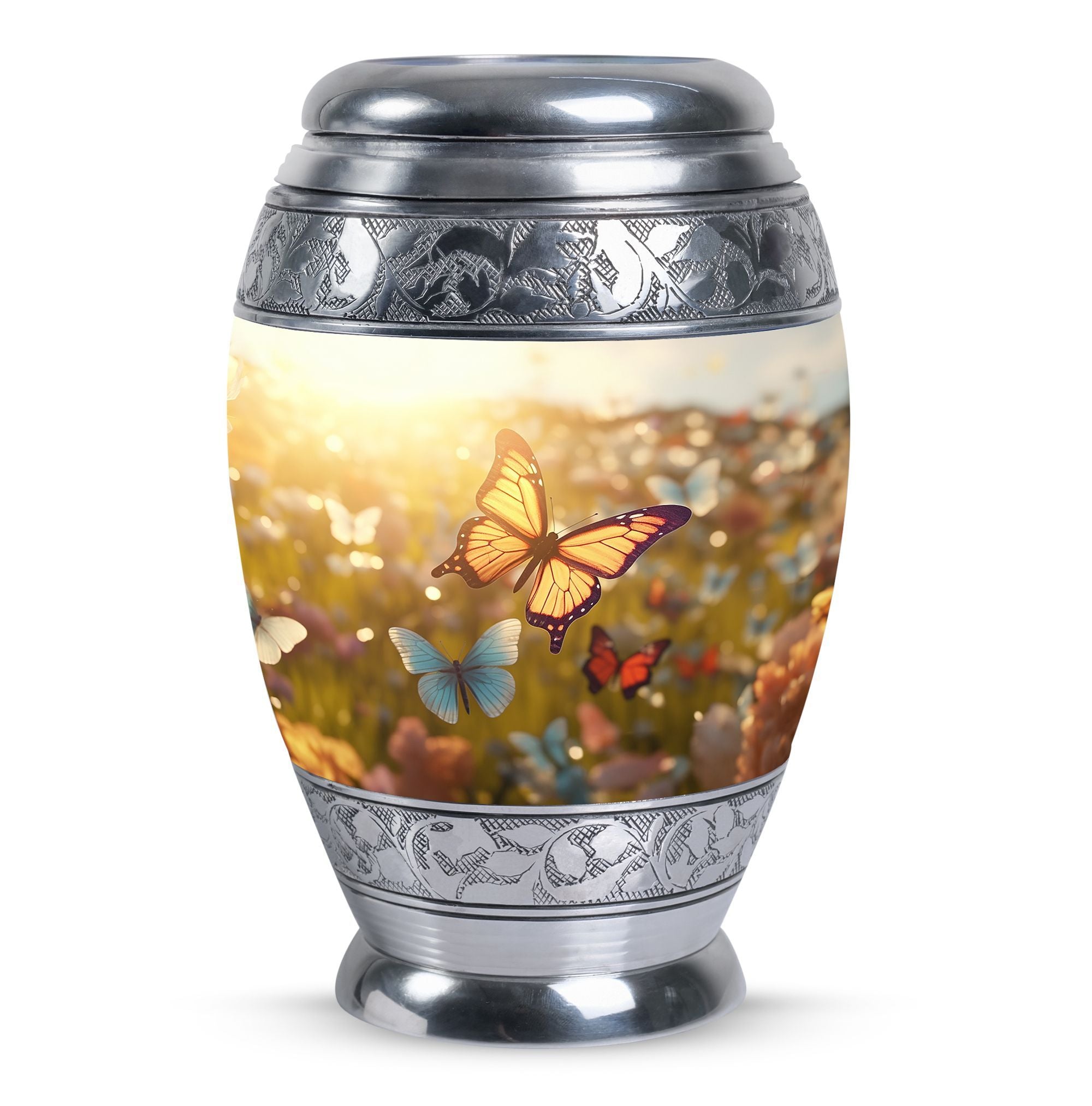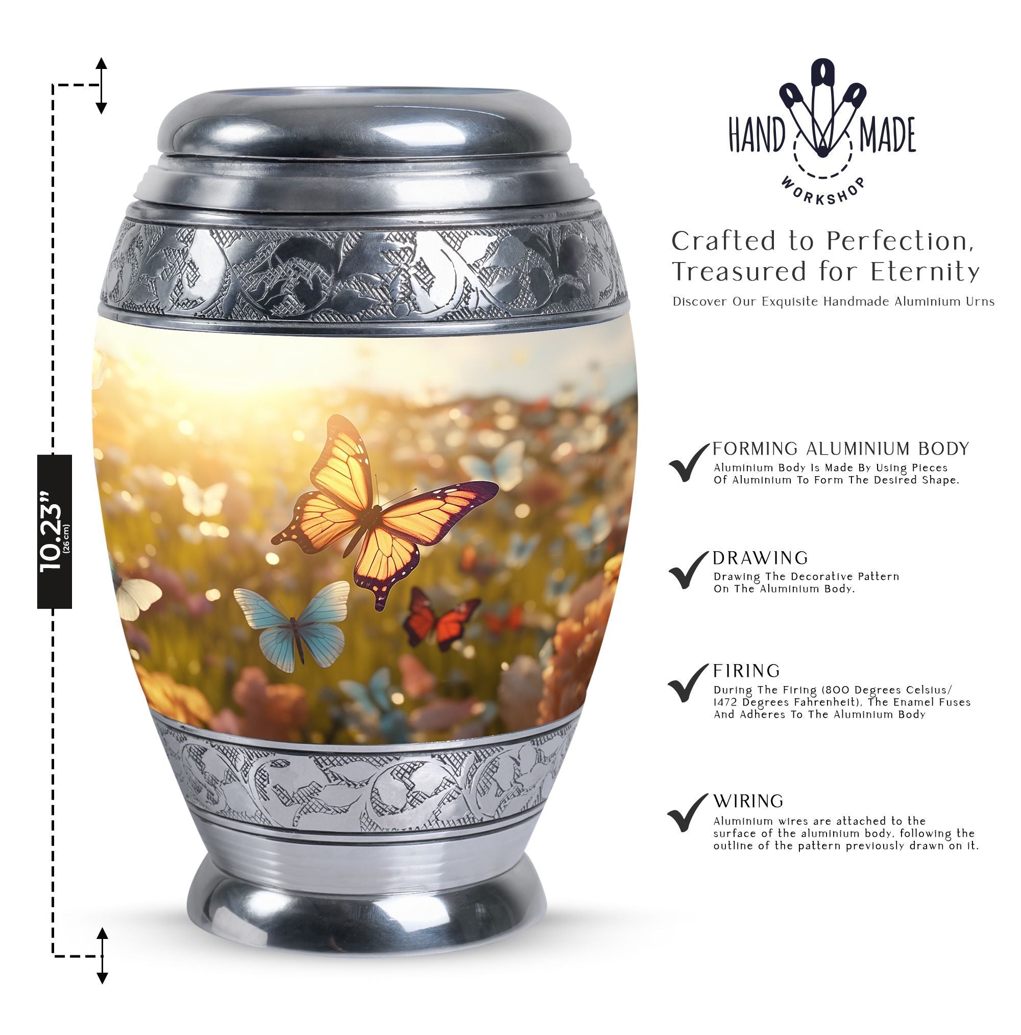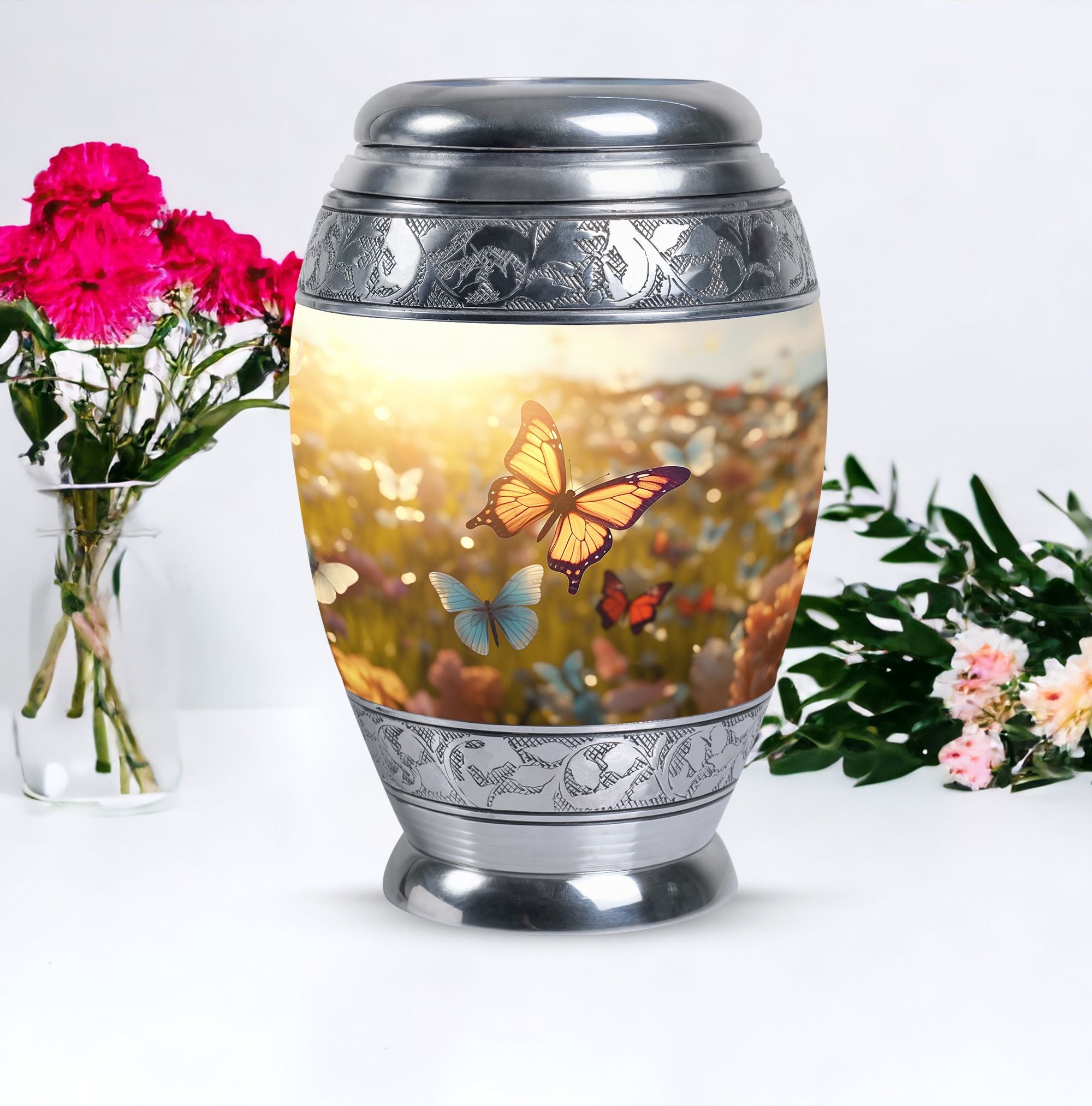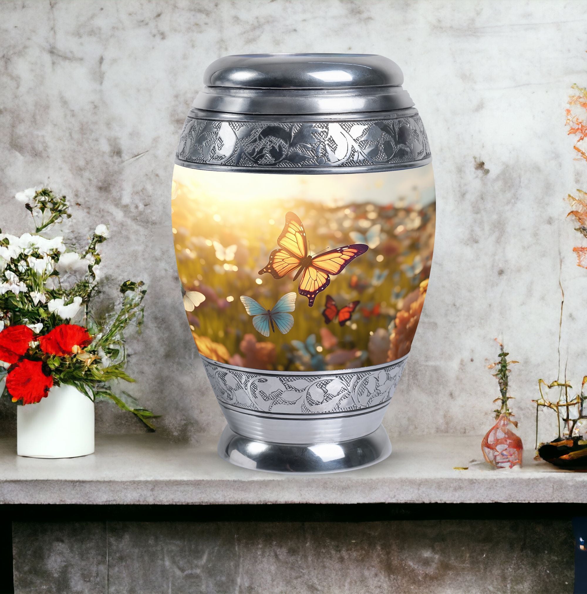 Pay your respects to your loved ones with the Purple Butterflies Urn. This exquisite memorial urn sized at 3 inches is just the right fixture for your memorial ceremonies. The classic urn is crafted from high-quality aluminium, adding a touch of timeless elegance to its design. Weighing 3.3 pounds and standing tall at 10 inches in height, this large urn's robust constitution ensures its longevity. It boasts a capacity of 200 cubic inches, offering ample space to lovingly store the ashes. The urn comes with a velvet pouch, providing respectful containment for the ashes. Enrich the sentimentality of the urn with our customization option, you can personalize it with engraved names, making it a unique urn for ashes. Recall fond memories with our Purple Butterflies Urn, a beautifully designed ashes holder, and a dignified custom cremation urn.