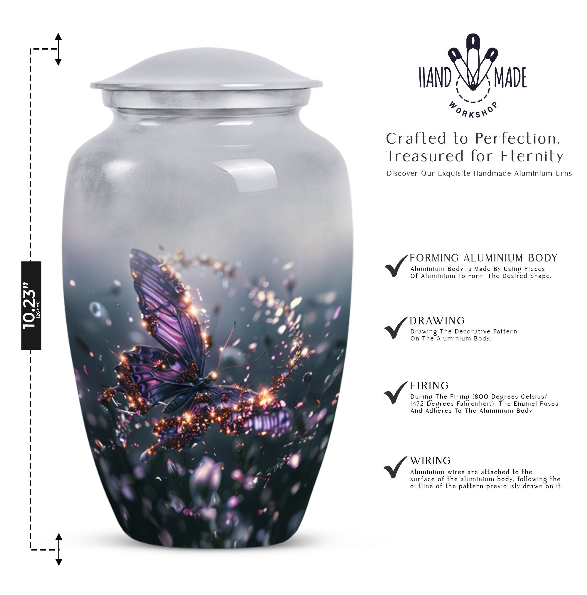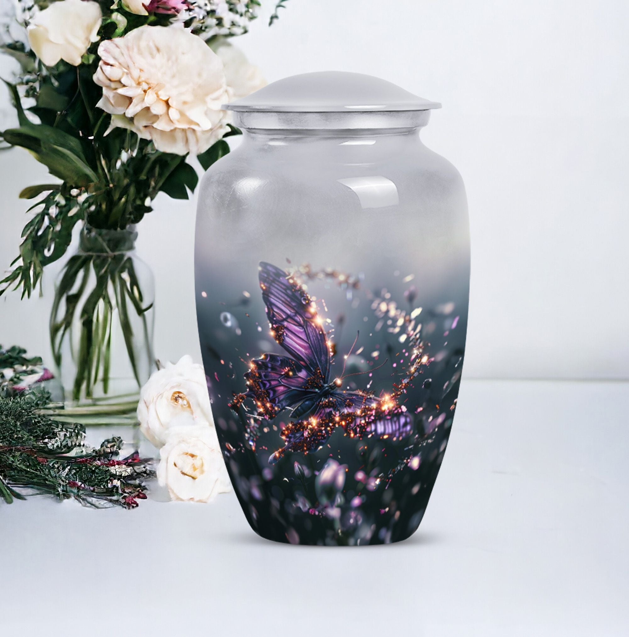 Crafted from premium aluminium, this urn blends artistry with durability. Its vivid purple butterfly design set against a soft, elegant background captures both peace and beauty. As one of our butterfly urns for human ashes, it offers security with its screw-top lid while remaining a timeless memorial piece. Perfectly sized as an adult size cremation urn, it ensures dignity and safety for your loved one’s ashes.