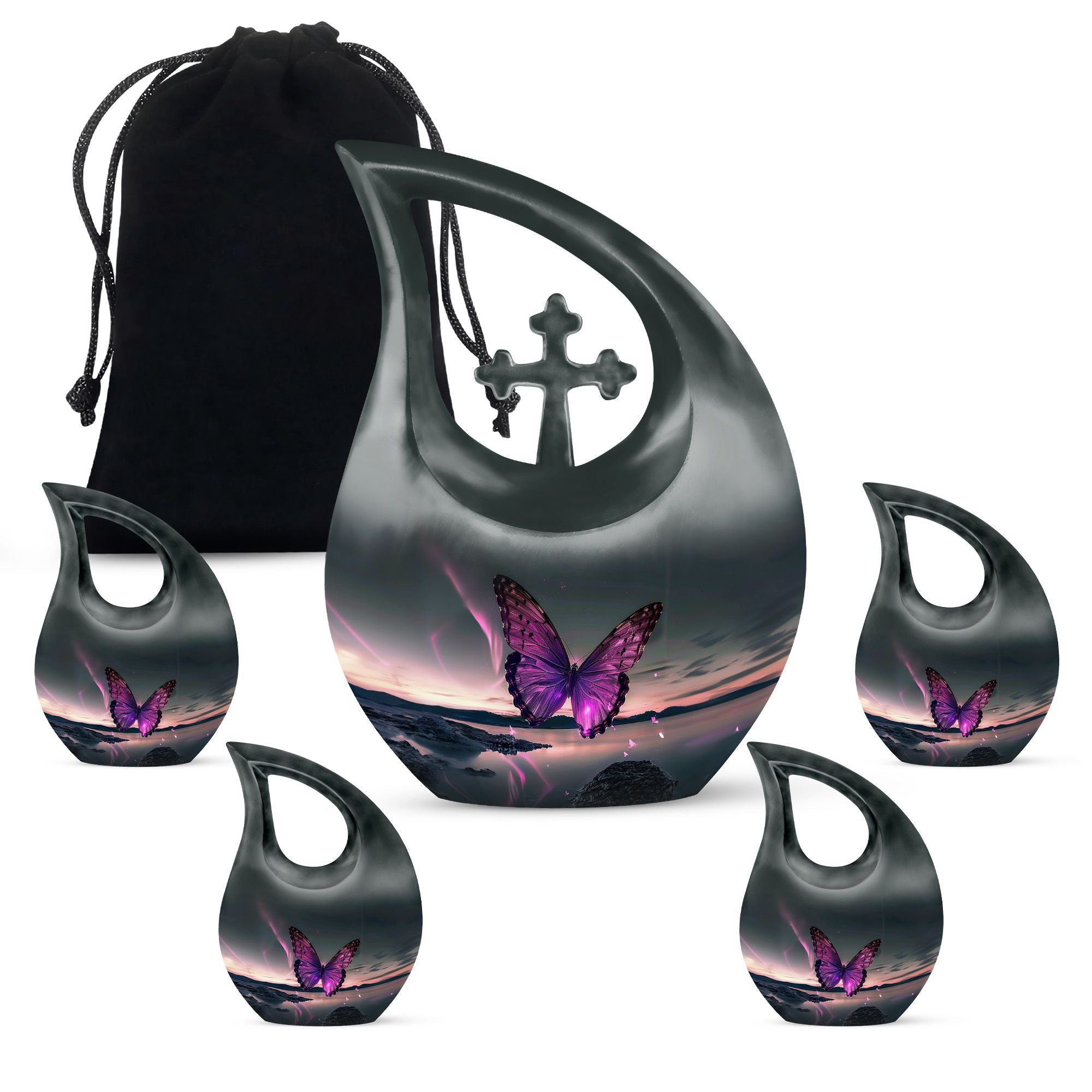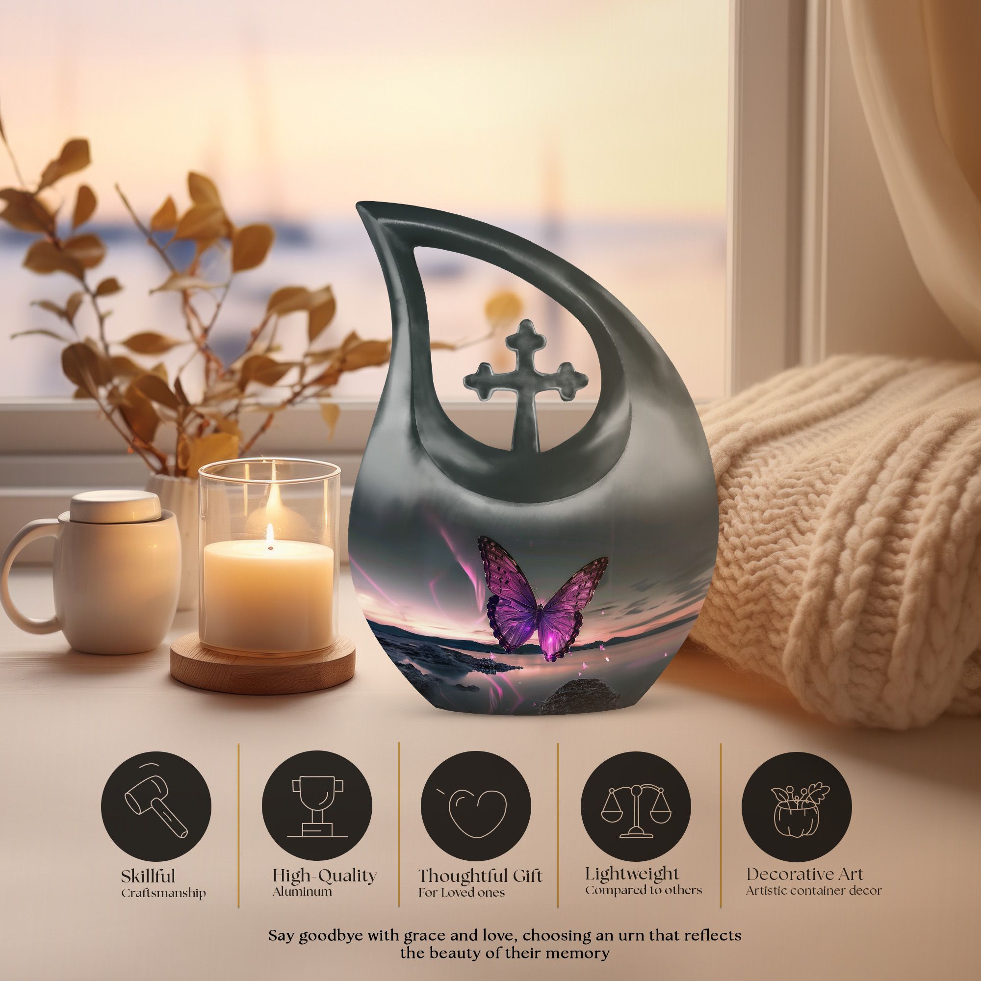 The Purple Butterfly Serene Urn – Landscape Memorial is a beautifully handcrafted cremation urn designed to honor your father’s memory. Featuring graceful purple butterflies set against a tranquil landscape scene, this urn symbolizes peace, transformation, and everlasting love. It serves as a dignified memorial urn for dad’s ashes, perfect for home display or memorial services.