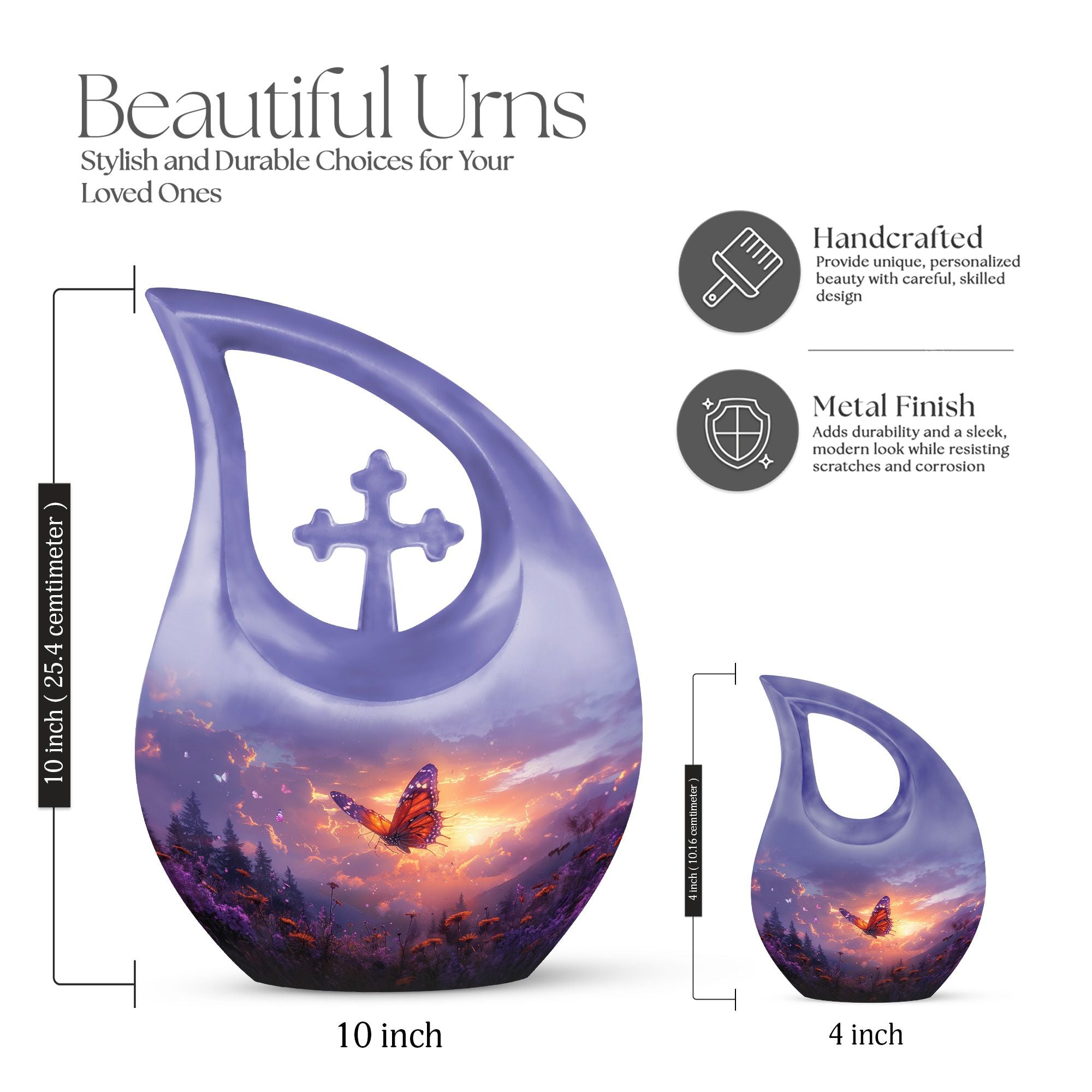The Purple Meadow Urn – Monarch Butterfly Memorial Urn for Human Ashes embodies peace, transformation, and eternal love. The delicate monarch butterflies gracefully floating over a lavender meadow symbolize the soul’s journey beyond, making this large cremation urn a heartfelt tribute for your loved one. Its deep purple tones and nature-inspired art evoke serenity and strength, offering comfort to families remembering those they cherish.