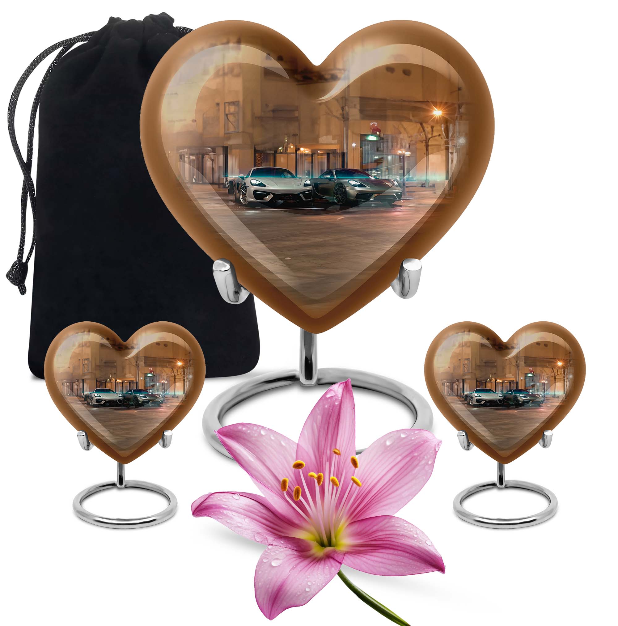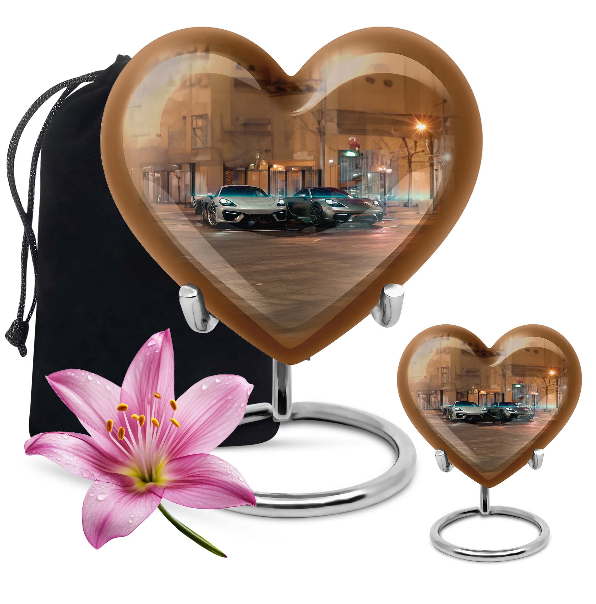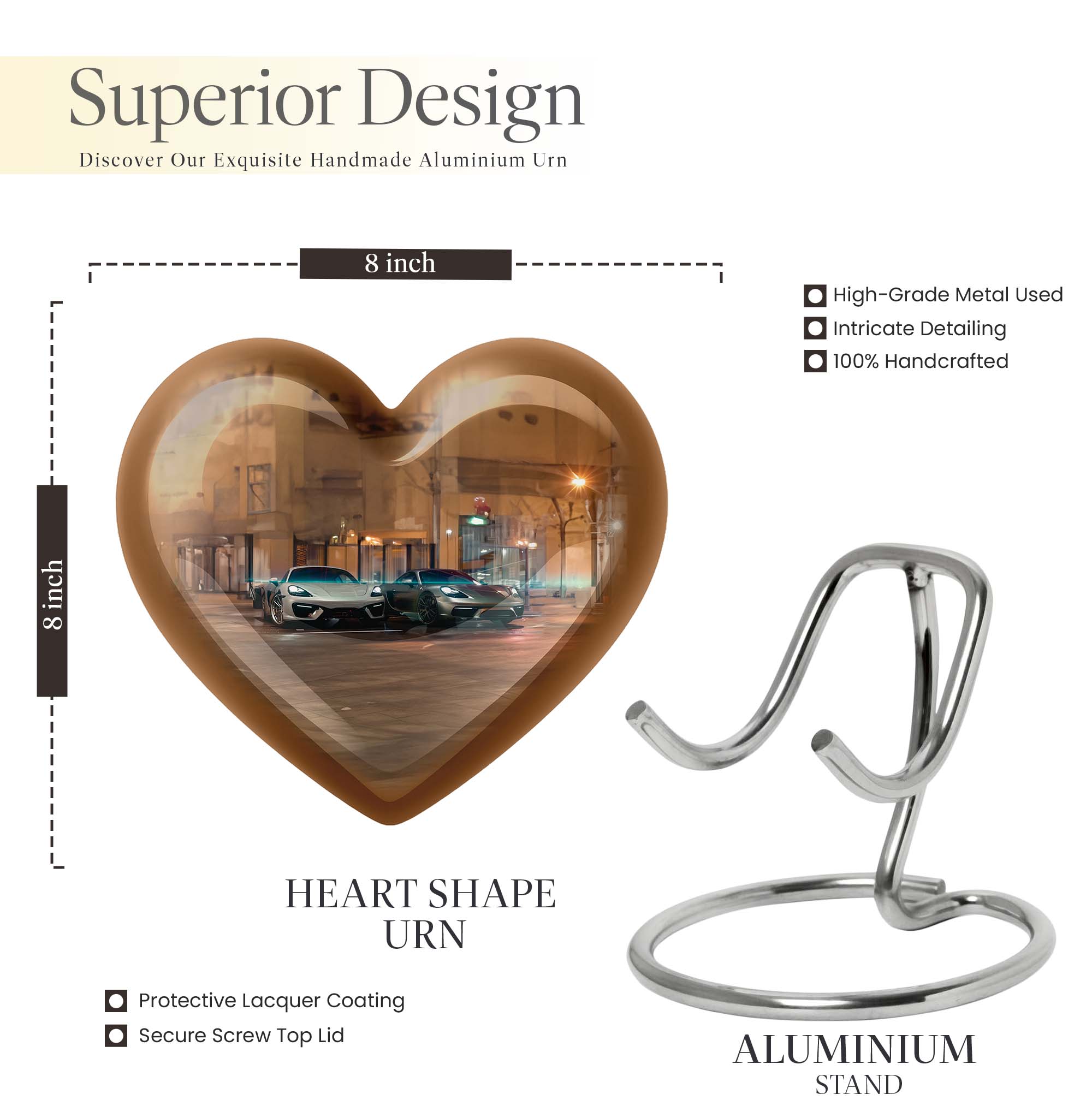 Elevate your memorial ceremony with our uniquely made funeral urn, an extraordinary product that combines affection and remembrance. This large urn is crafted with utmost precision from solid aluminium, showcasing durability and longevity. Weighing just 3.3 pounds, its 10-inch height offers a capacity of accommodating 200 cubic inches. The exquisite Heart Urn design resonates with love and respect for the departed soul. Further enhancing its significance is the enchanting Car theme reflecting the transcendent nature of life. The package comes inclusive of a velvet pouch, allowing secure containment of the precious ashes. What's more, our urn provides a personalized touch as we engrave names to make it extra special for you. This well-crafted, memorial adult urn serves as a perfect vessel to preserve the remainings of your loved ones. When you search for terms such as 'memorial urns', 'car urn' or 'urn ash adult', our custom cremation urns stand out as a fitting choice for their quality and craftsmanship. Remember your mom with respect through our bespoke 'funeral urn for mom', a symbol of lasting memory.