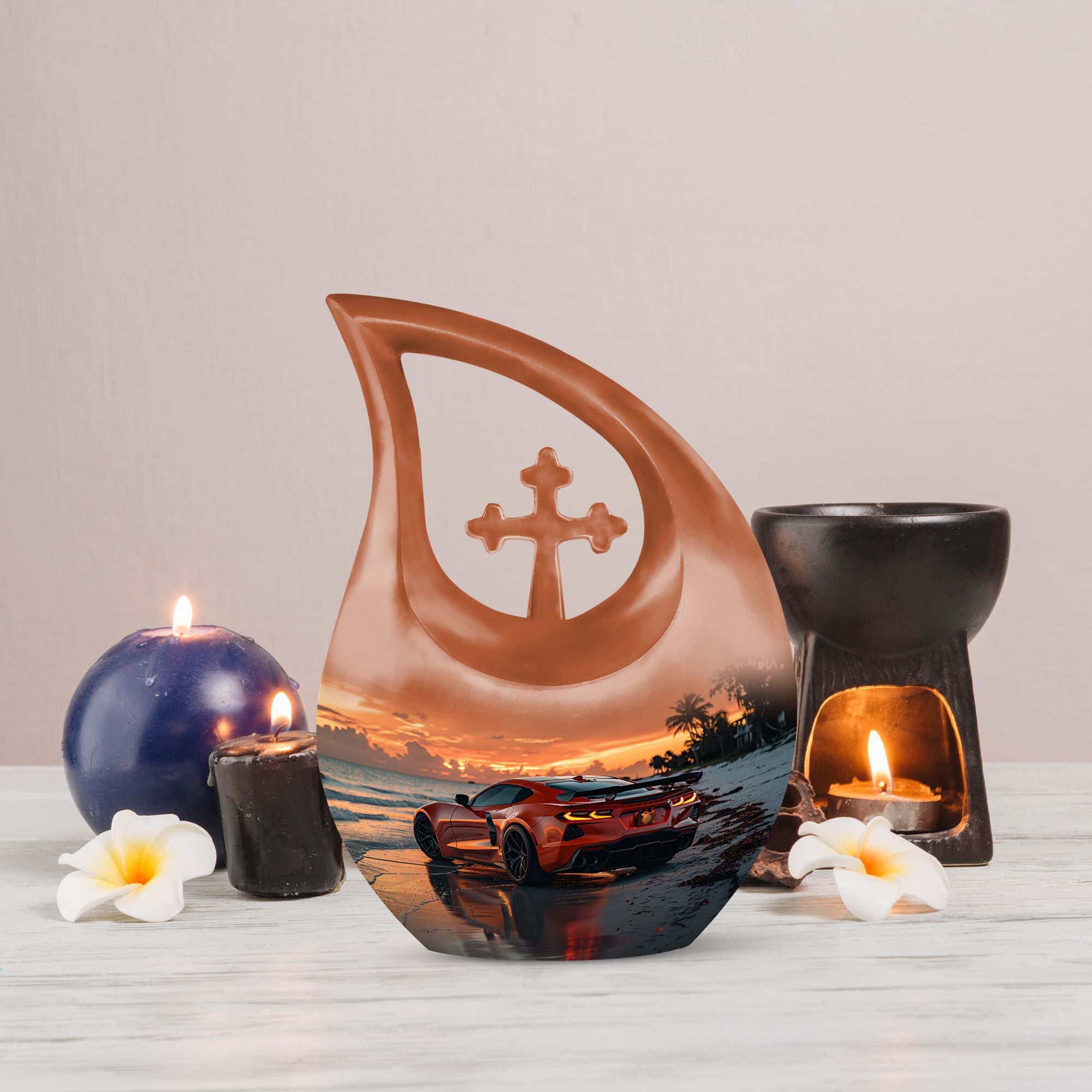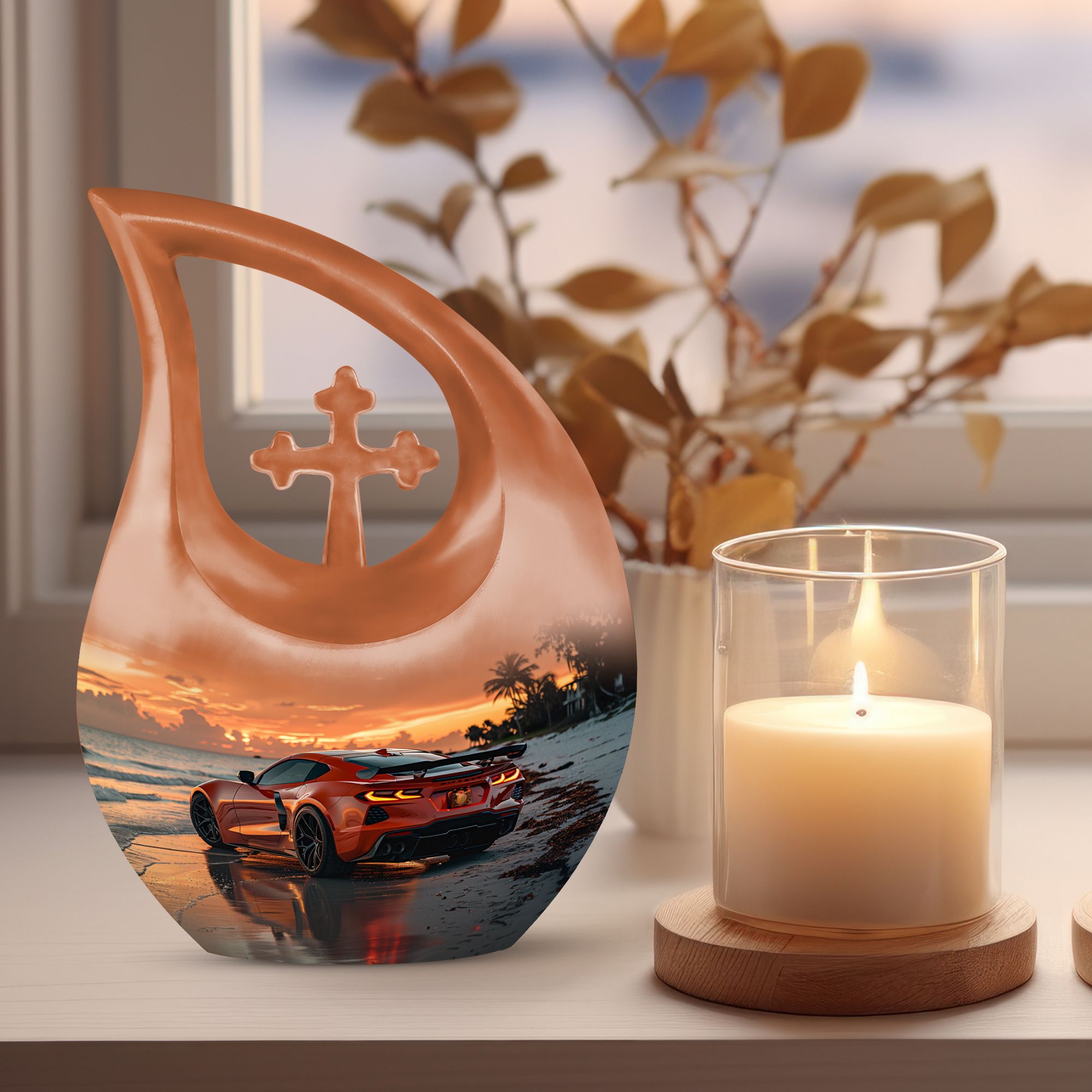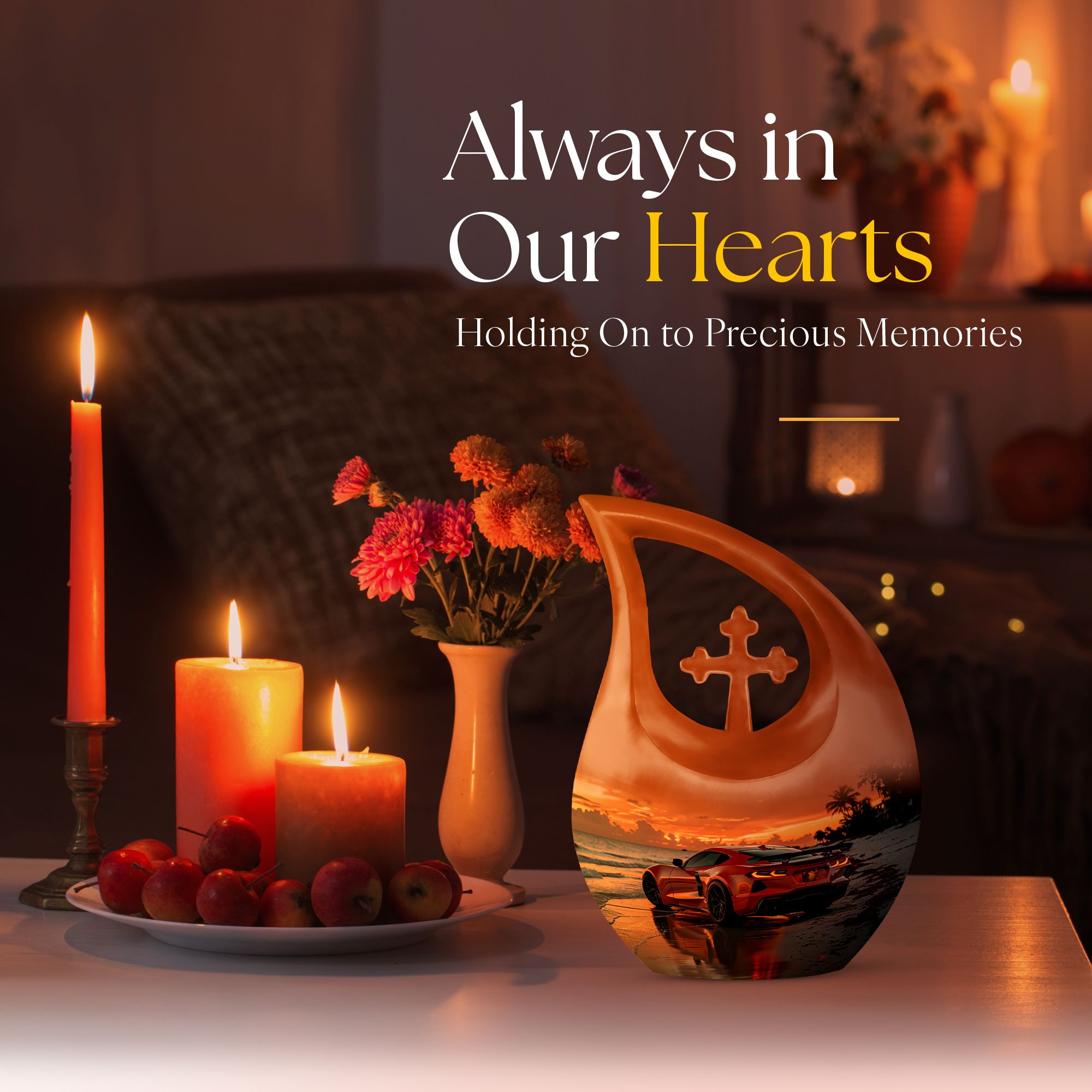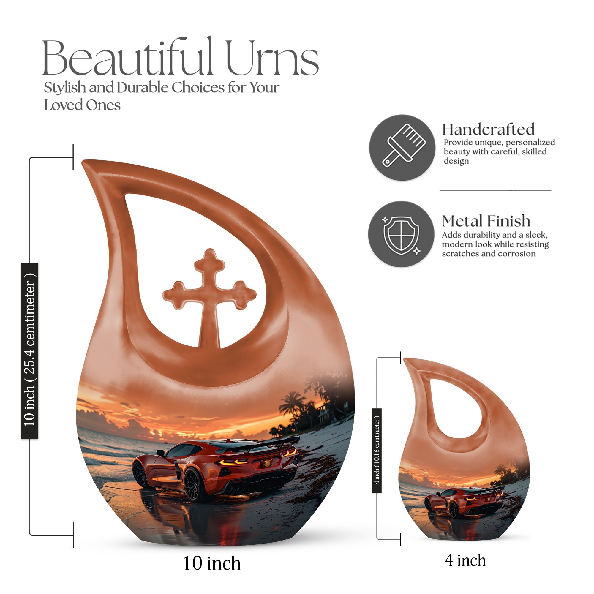 Fully recognize and cherish the memories of your loved one with our uniquely styled Cross Drop Car Urn. This exquisite, yet robust aluminium memorial urn lends an understated elegance to your remembrance. A size of 10 inches and weighing 3.3 pounds, this large, car-themed Urn is designed to securely hold up to 200 cubic inches of ashes. Available with the option to personalize with names engraved, it's a truly unique token of memory. As an added convenience, every Car Urn comes with a plush velvet pouch, perfect for the containment of ashes. This grand memento not only serves as a personalized tribute but also as a tasteful decorative piece. Forget about common butterfly urns for ashes or double urns, this car urn stands out, offering a meaningful way to keep your departed dear one in your thoughts. Whether you are seeking to turn ashes into keepsakes or want a decorative urn for ashes, our Car Urn answers exactly to such requisites.
