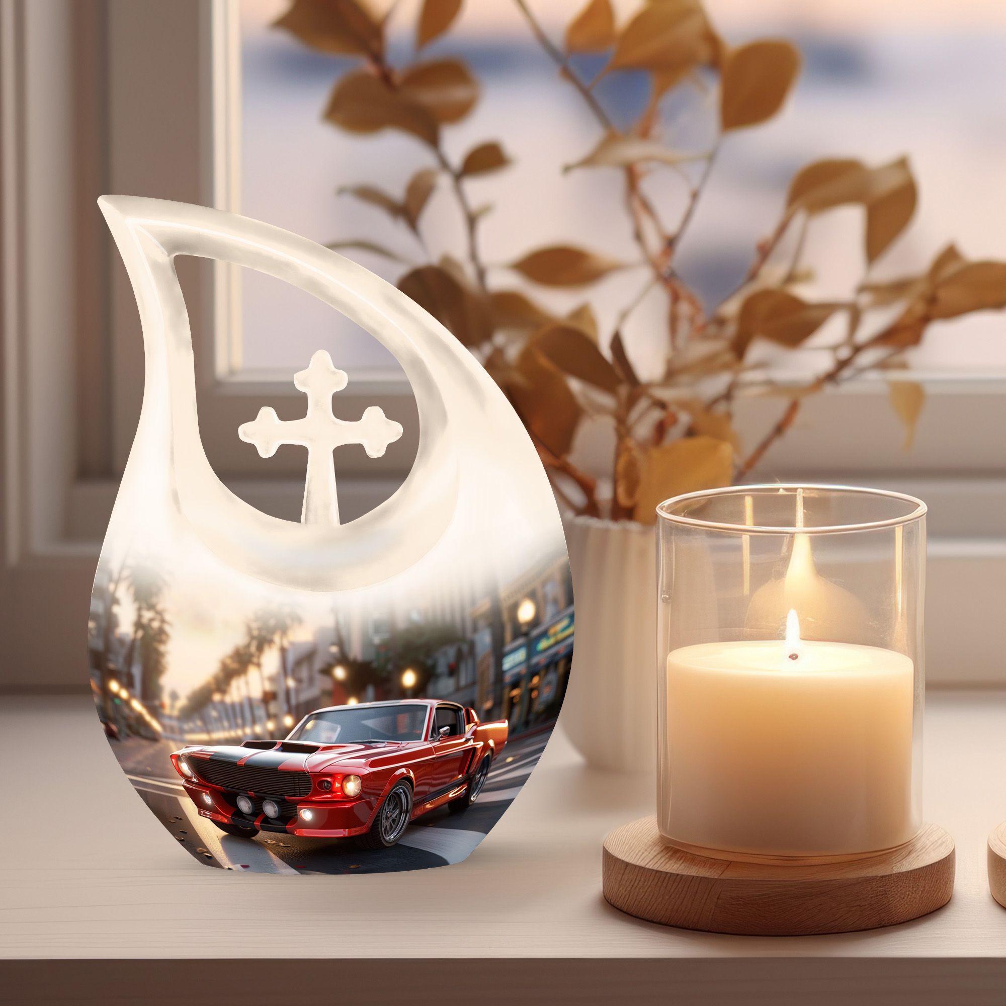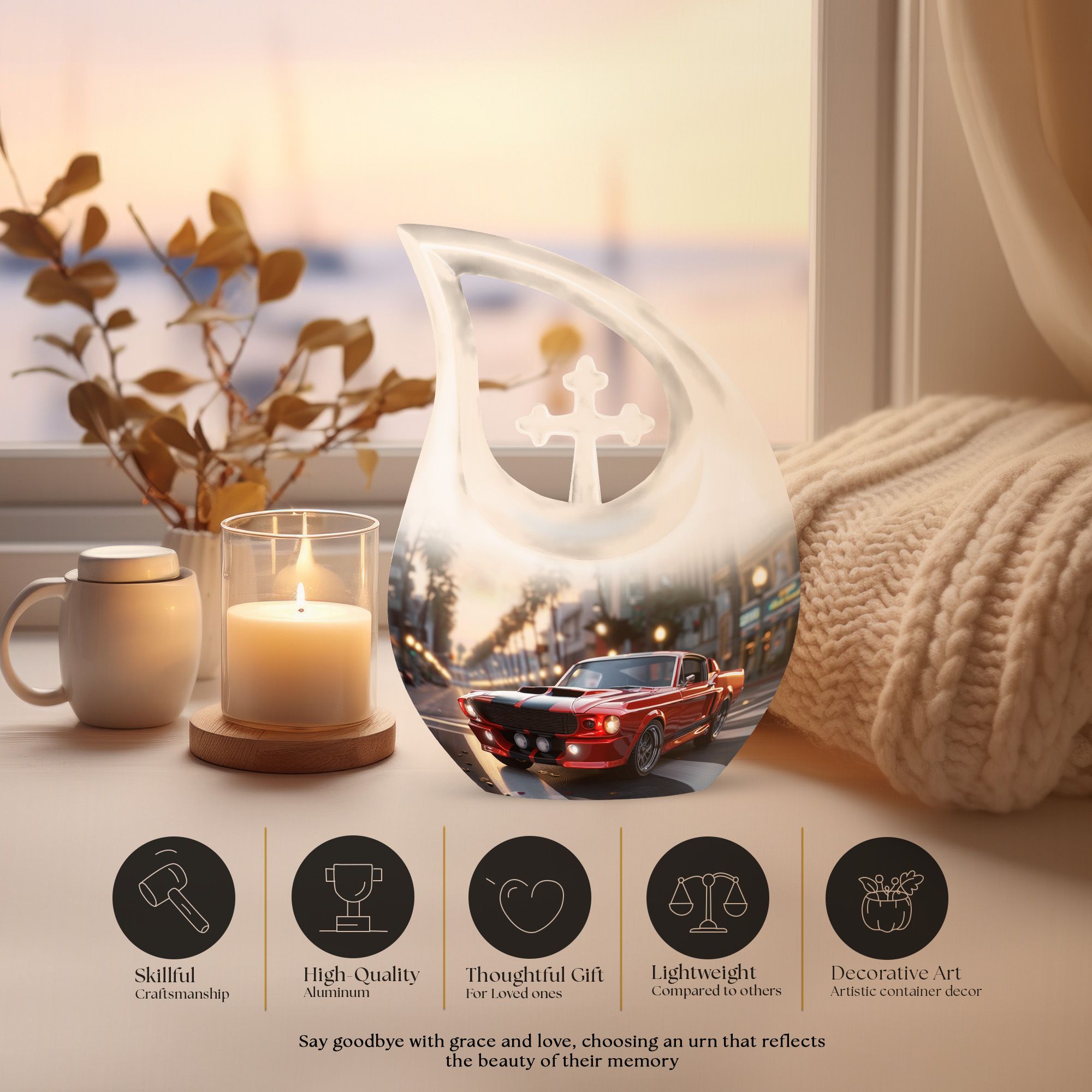 Experience a tribute that radiates both admiration and fond remembrance with this large, 10 Inch Car Urn rendered in high-quality Aluminium. This meticulously crafted memorial urn emanates comfort in the wake of loved ones' parting; its 3.3 pounds weight goes unnoticed, yet it embodies strength. Its tangible presence in a room whispers solace during the span of loss. With a dependable capacity of 200 cubic inches, it serves as a dignified container for ashes. The urn package is paired with a velvet pouch, providing an additional layer to the containment of ashes. A 'Cross Drop' pattern graces the urn, bestowing it with an aura of grace. Additionally, there's an option to personalize this urn with engraved names - a heartfelt ode to mom or other cherished family members. Apart from being distinctive in its name as 'Car Urn', it is also apt for those who search for 'Urns For Mom', 'Cremation Vaults', or 'Urns With Love'.