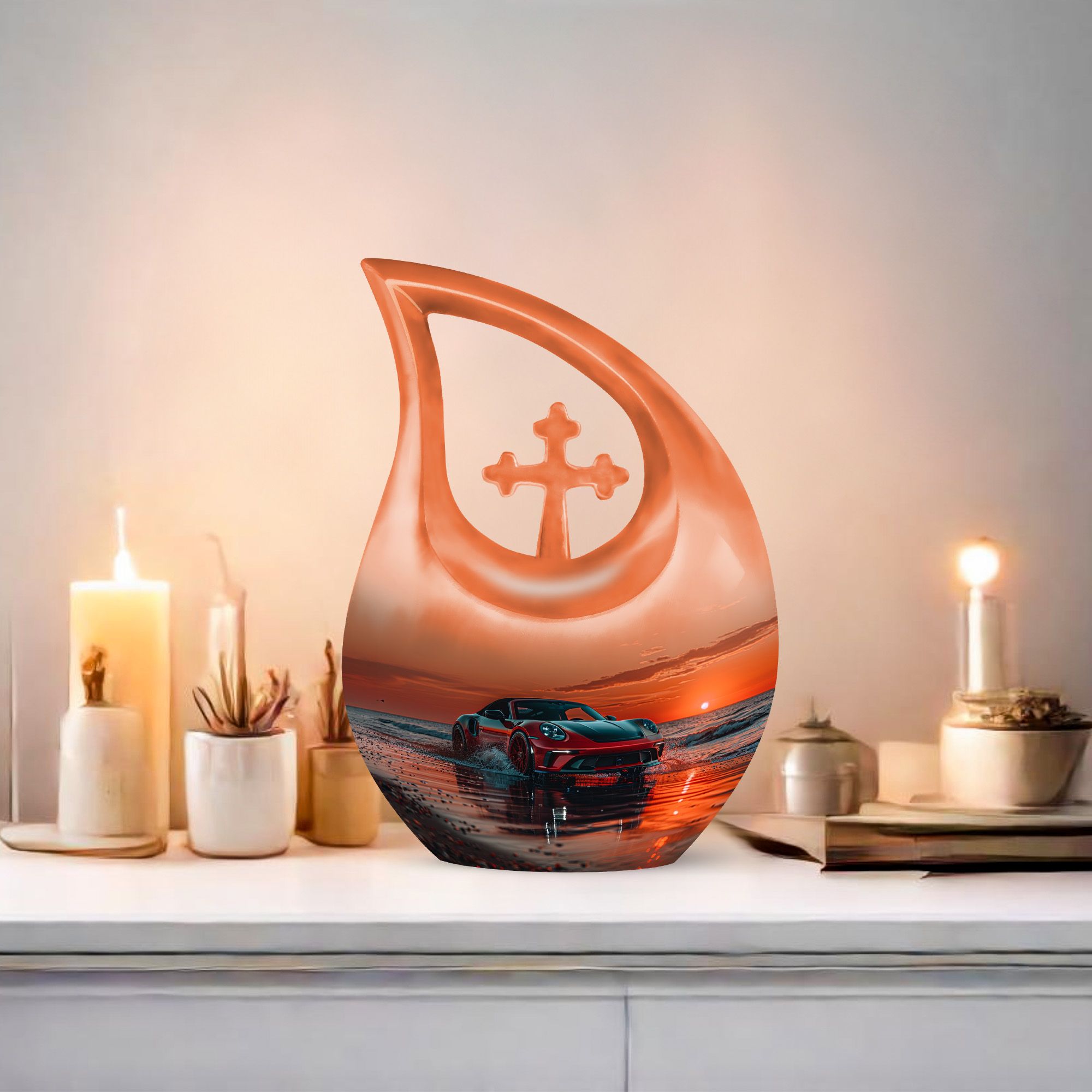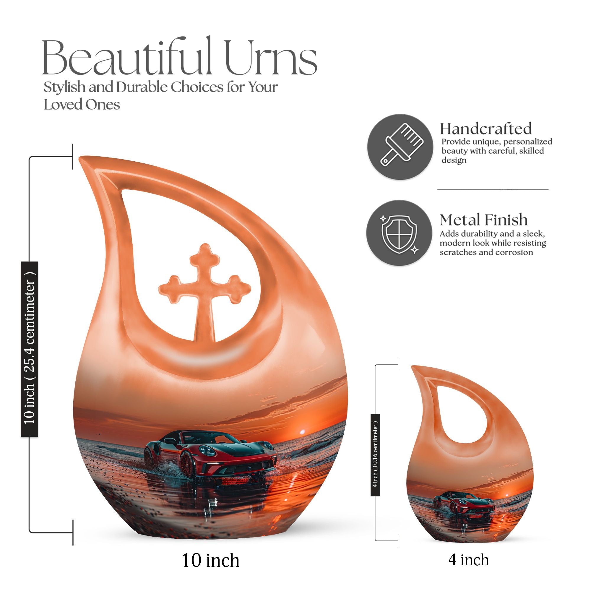 Honor your loved one's memory and keep their essence with you always with this beautiful 10-inch Car Urn. Expertly toting an inspiring 'Cross Drop' design, it not just pays homage to their life, but also aligns perfectly with your spiritual beliefs. The urn, made from high-quality aluminium, is robust, durable, and designed to last a lifetime. Weighing just 3.3 pounds and with a holding capacity of 200 cubic inches, this urn for ashes seamlessly blends efficacy with artistry. Our funeral urns offer a way for you to remember your loved ones with dignity and grace. Add a personal touch to the urn by opting for our customization options, get names engraved and make your tribute unique. Our package includes a luxurious velvet pouch for containment of ashes, providing an elegant final resting place for your beloved. Choose this large urn as a fitting tribute and practical funeral option during these difficult times. Perfect for searches including 'Urn For Mom', 'Funeral Urns For Ashes,' or 'Beautiful Urns', this product links heartfelt emotion with superior craftsmanship.