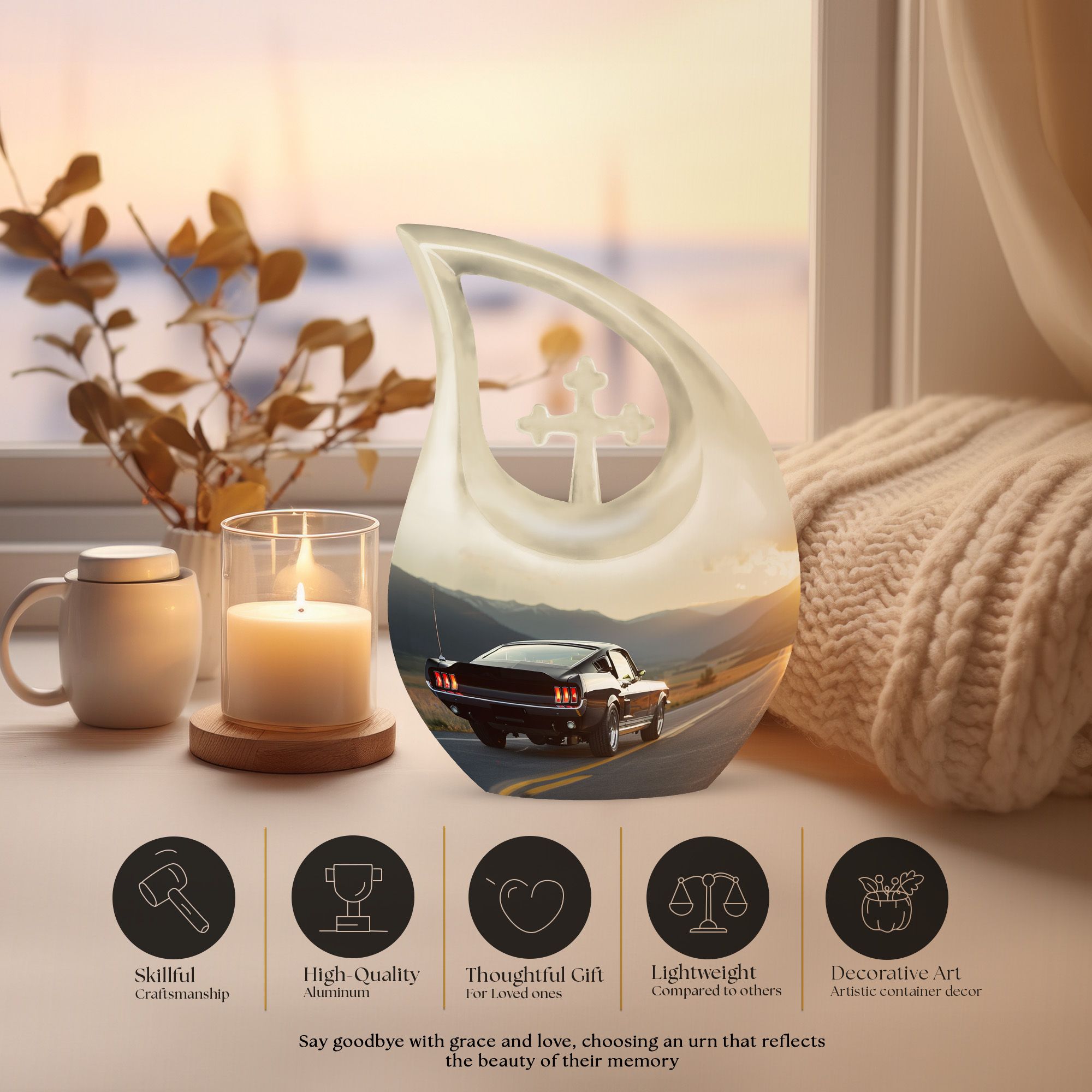 Illuminate your memorial space with a beautiful touch of fond remembrance. Our elegant Cross Drop Car Urn infuses both love and dignity into any setting. Sized optimally at 10 inches and weighing 3.3 pounds, this large-sized urn is robust and durable. Crafted from high-quality aluminium, it ensures long-lasting keepsake value. The urn possesses a magnificent capacity of 200 cubic inches for containment of ashes, packaged neatly in an accompanying, plush velvet pouch. Render a personal touch by personalizing the urn with engraved names, providing an intimate reminder of your loved one. This Pink Urn is effortlessly significant, and the car theme adds a unique appeal that will resonate with automotive enthusiasts. It is quite suitable for those looking for 'Memorial Urns', 'Personalized Urns For Human Ashes', 'Medium Urns For Human Ashes', 'Personalized Urns For Adults', or a 'Large Urn'. Remember your departed in a treasured manner with our Cross Drop Car Urn.