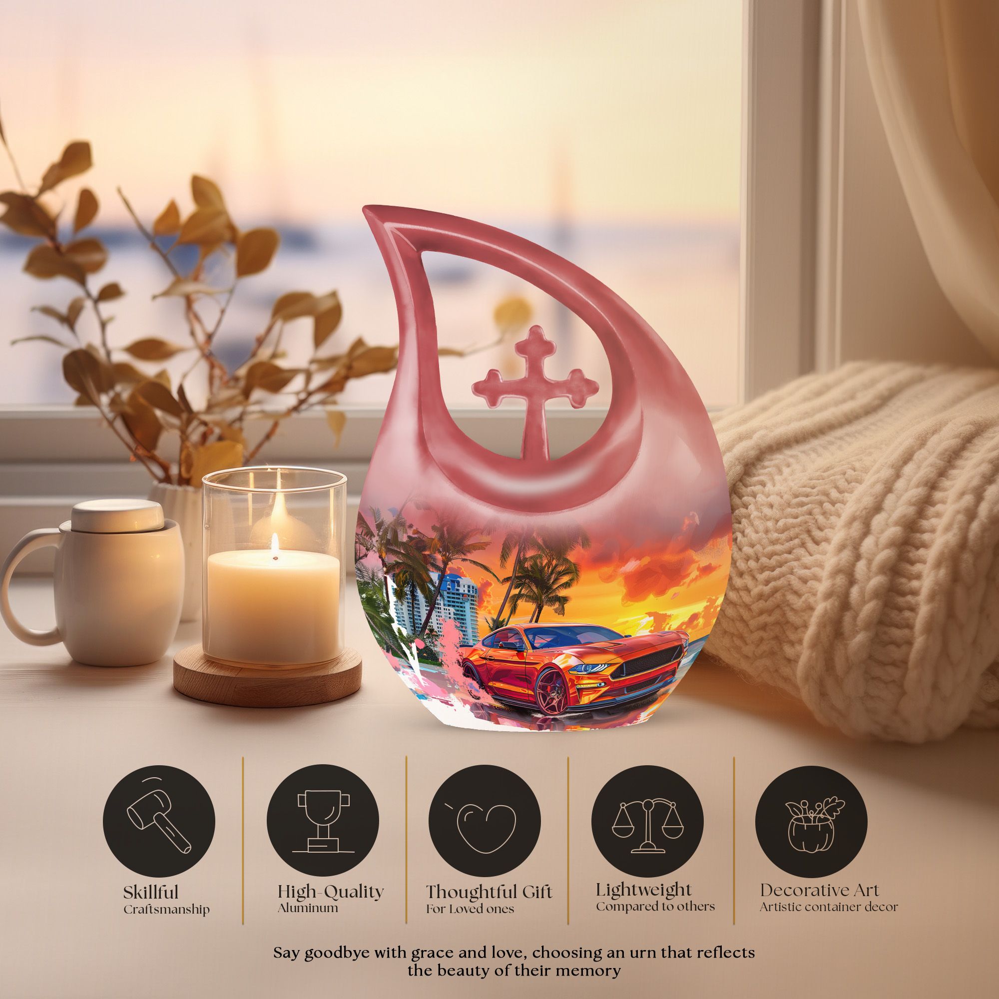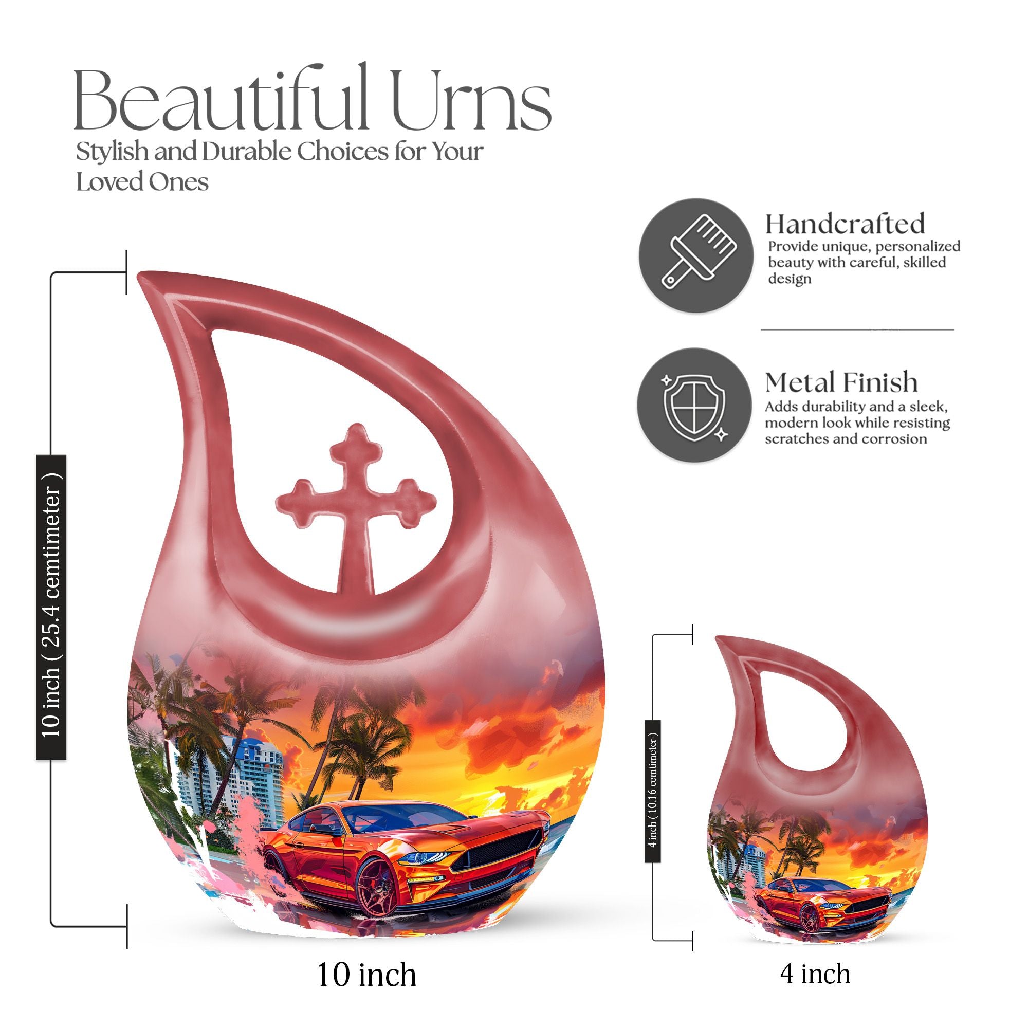 Celebrate and honor the memory of your loved one with this unique and heartfelt Car Urn. Crafted from solid Aluminium, this cremation urn stands 10 inches high, weighing 3.3 pounds while boasting a substantial capacity of 200 cubic inches. The 'Cross Drop' theme of this keepsake is thoughtfully designed to evoke memories of your beloved. This large urn is accompanied by a velvet pouch, providing careful containment of the precious ashes. Ideal for personalization, the urn can be engraved with your loved ones' names, making it a truly unique and special memorial. Finding the right urn can be challenging, but with this captivating car-themed urn, you can rest assured that it will serve as a fitting tribute to the dearly departed. While strongly resonating with the primary keywords like 'car urn', 'cremation urns for human ashes', the urn also aligns with secondary keywords such as 'cremation vaults', 'urn for mom', 'cheap urns', 'ashes container'. This keepsake is not only a poignant reminder of the strong bond shared but also a triumphant mark of your loved one's journey.