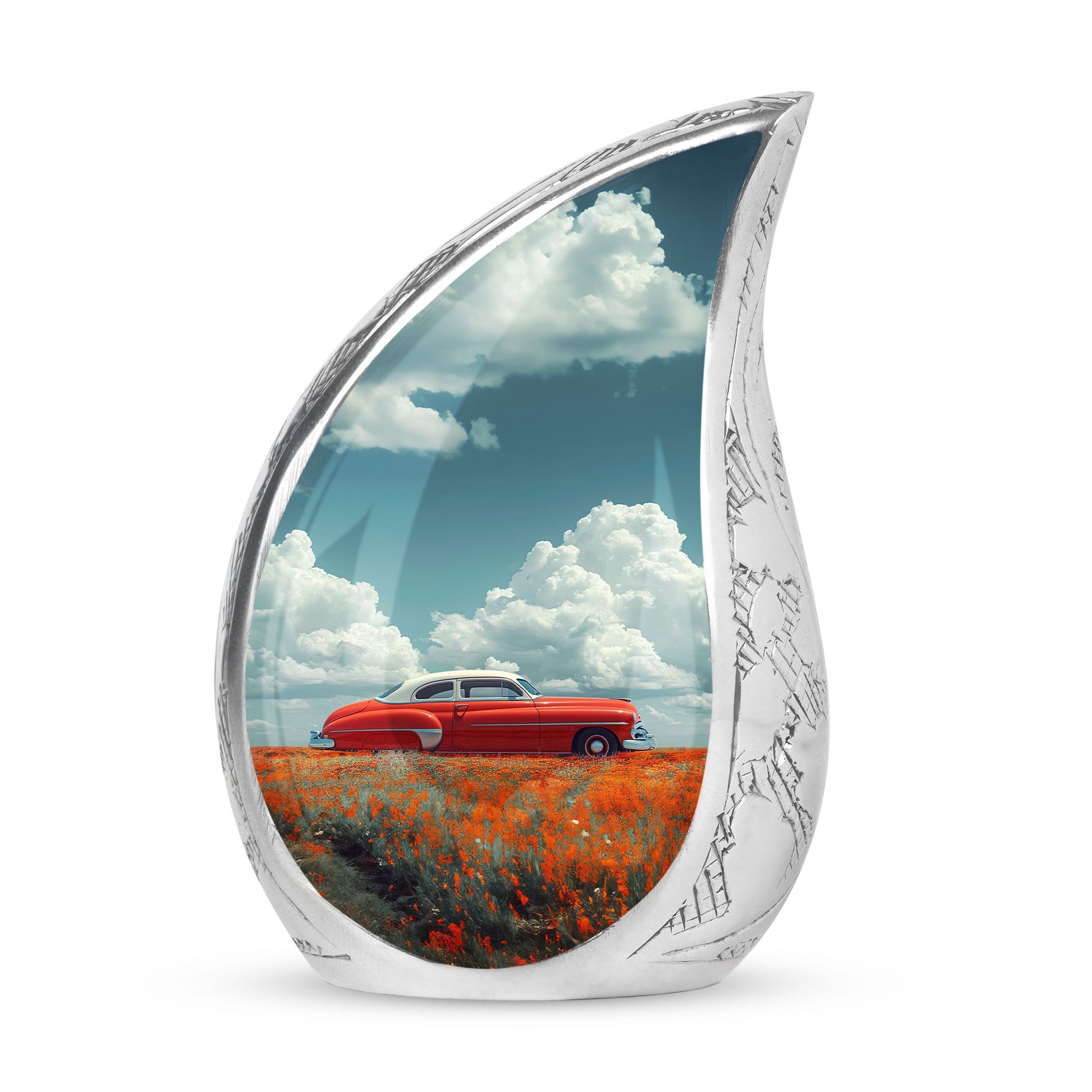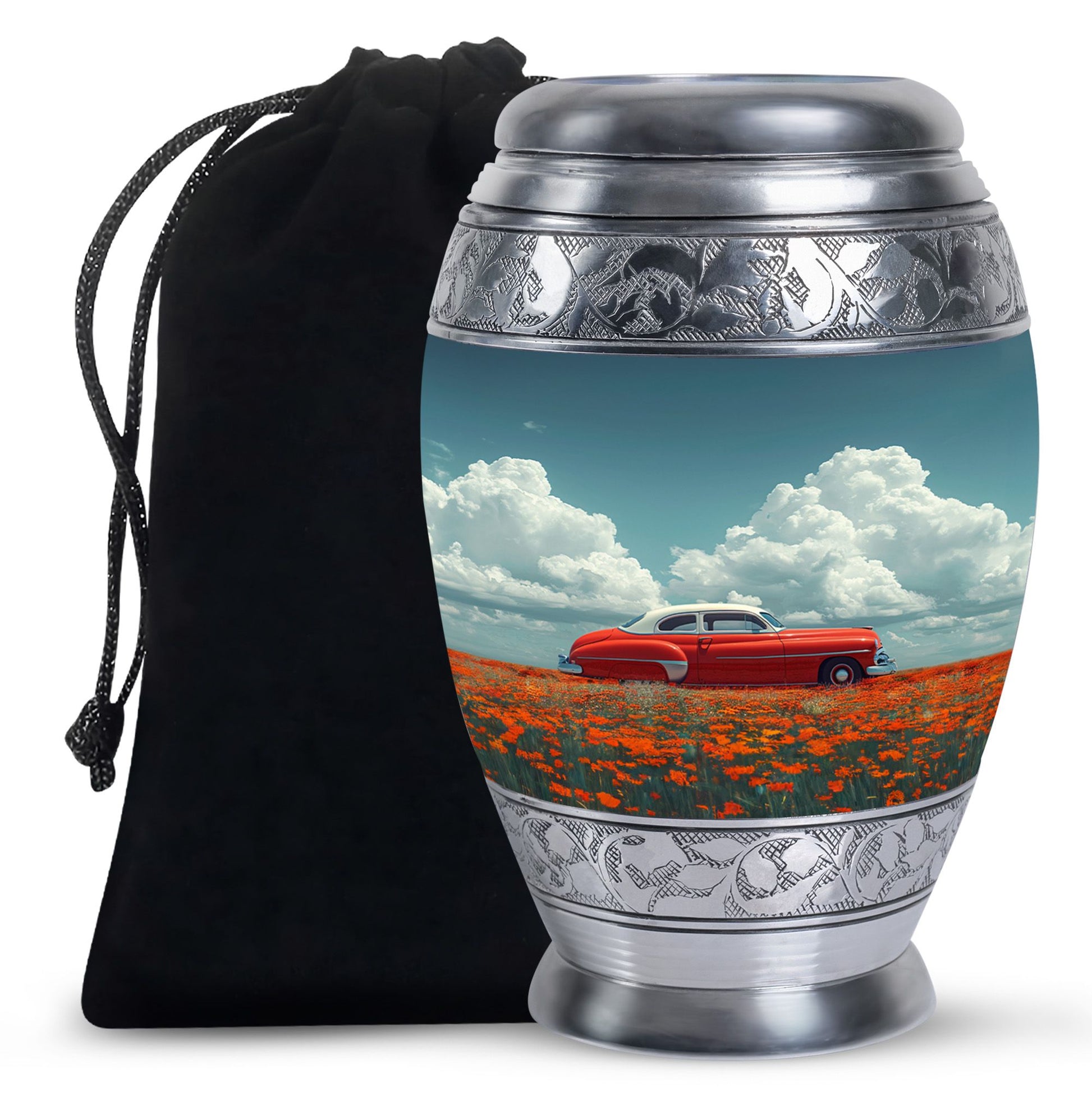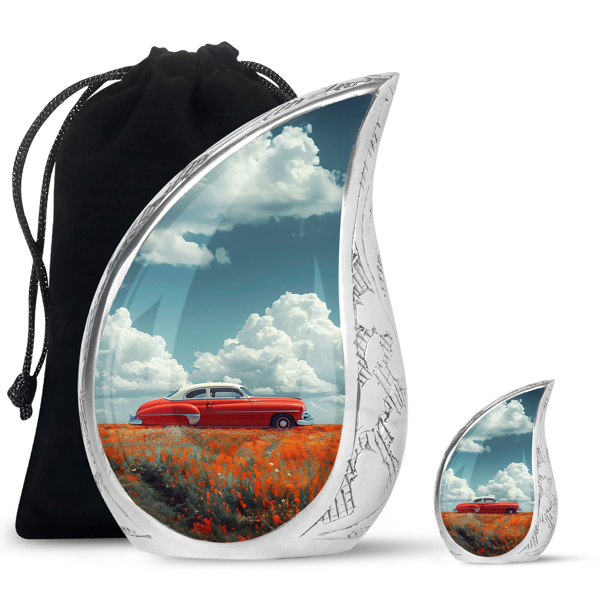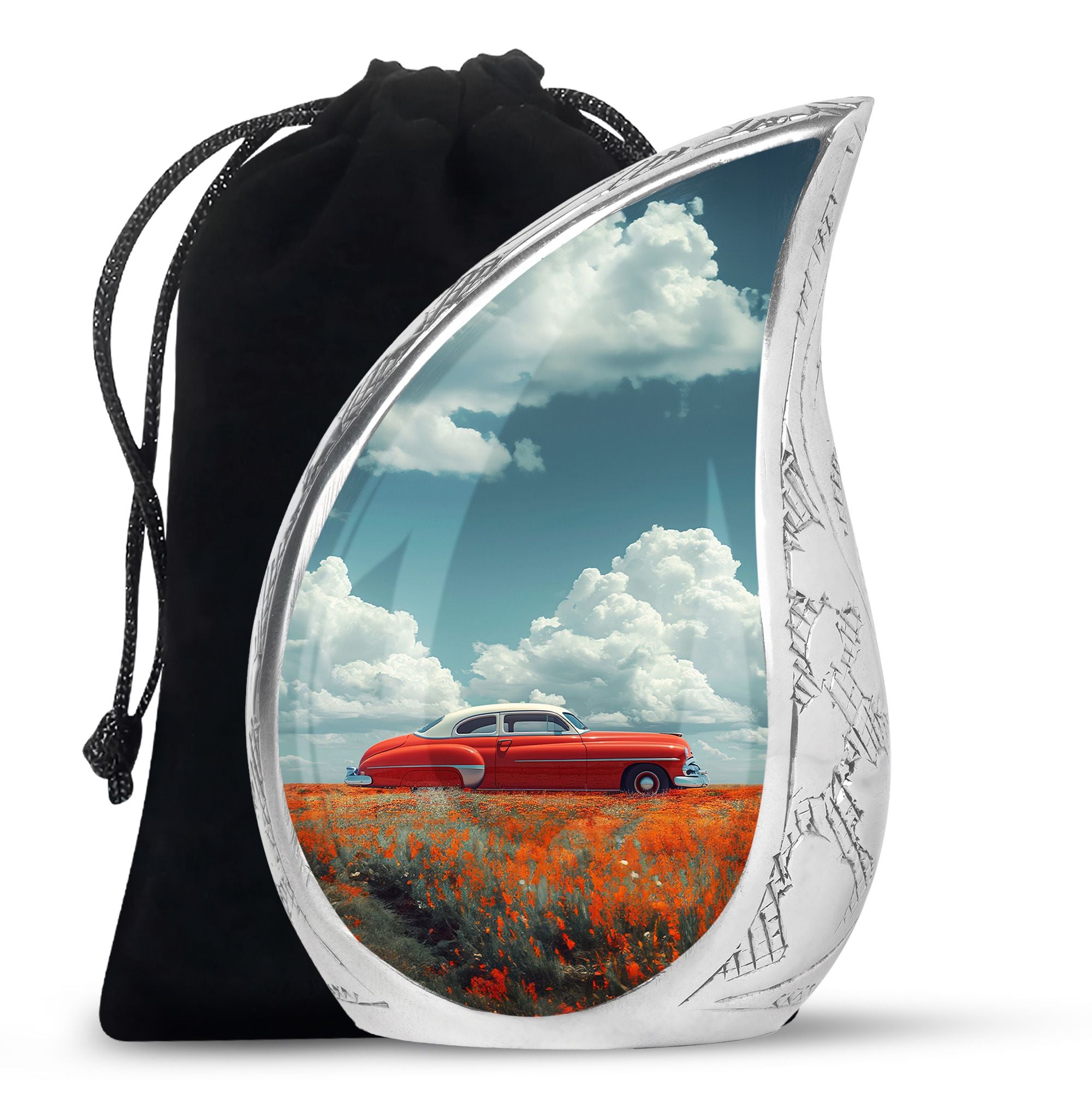 Expertly handcrafted, this large decorative urn for human ashes features a radiant red vintage car design, symbolizing vitality and timeless elegance. Made from durable aluminum, it ensures long-lasting protection and beauty. The secure screw-top lid offers peace of mind, keeping your loved one’s ashes safe. This large adult urn is perfect for home display or burial, blending artistry with heartfelt significance. Each large urn human ashes is finished with care, making it a meaningful keepsake for generations to come.