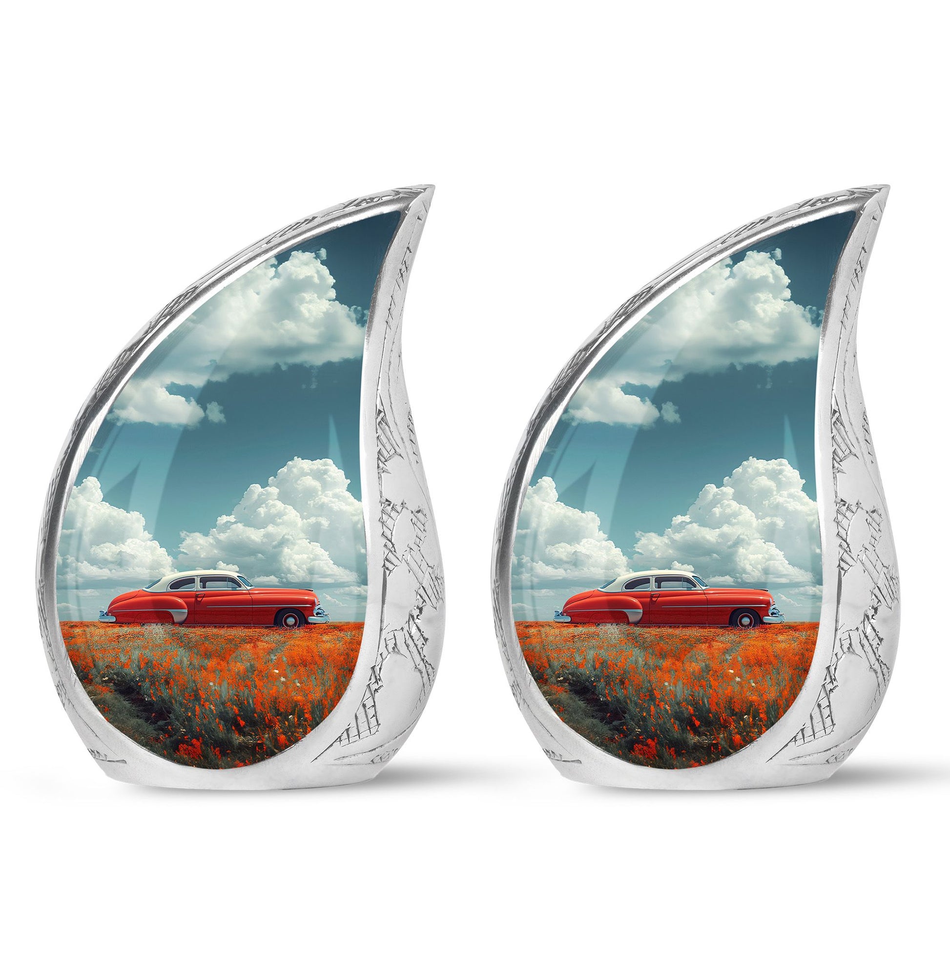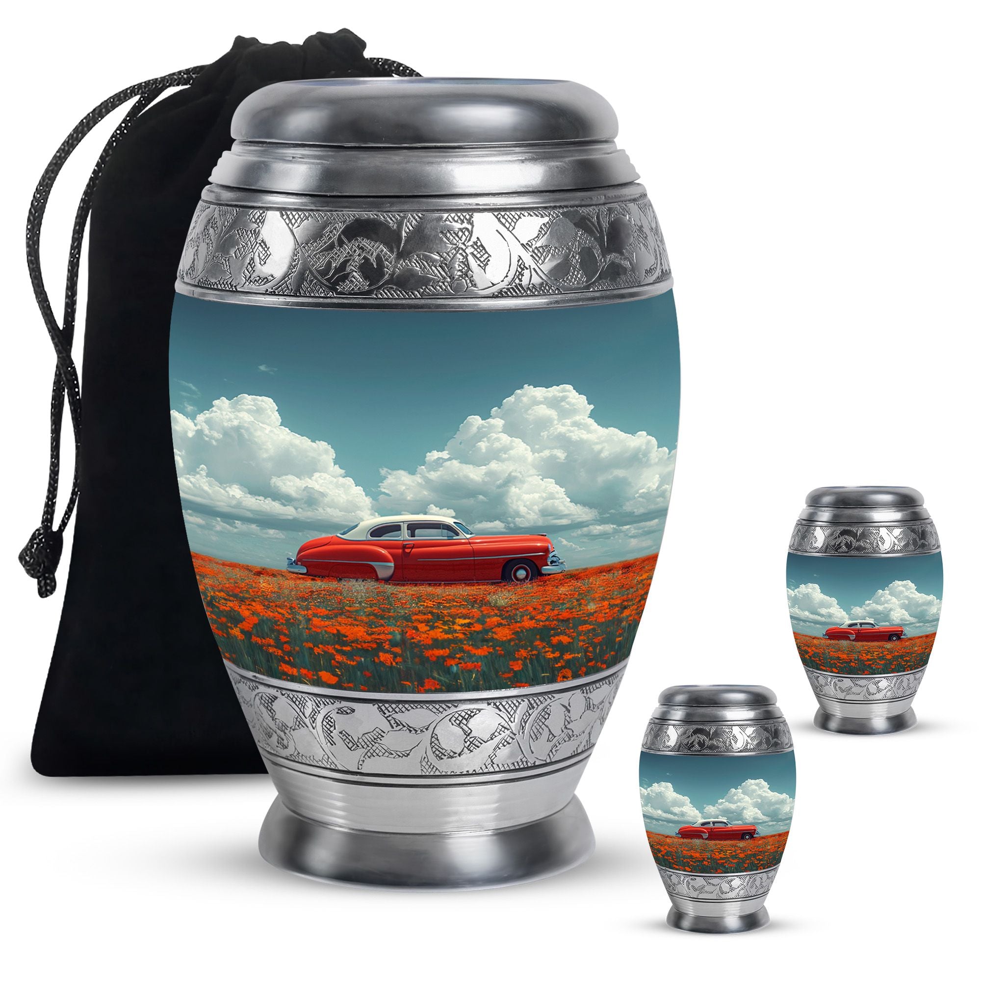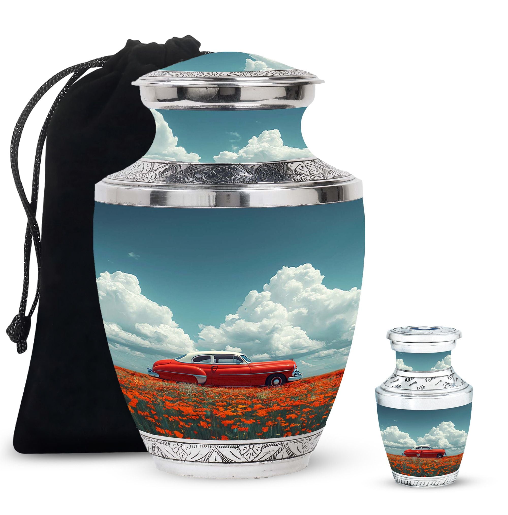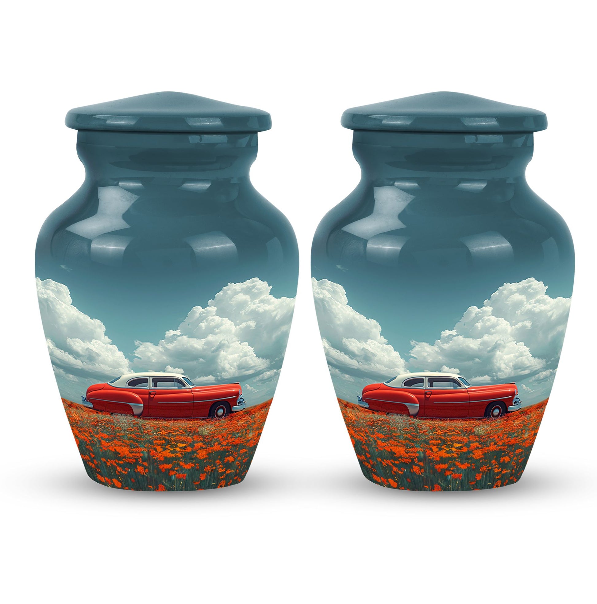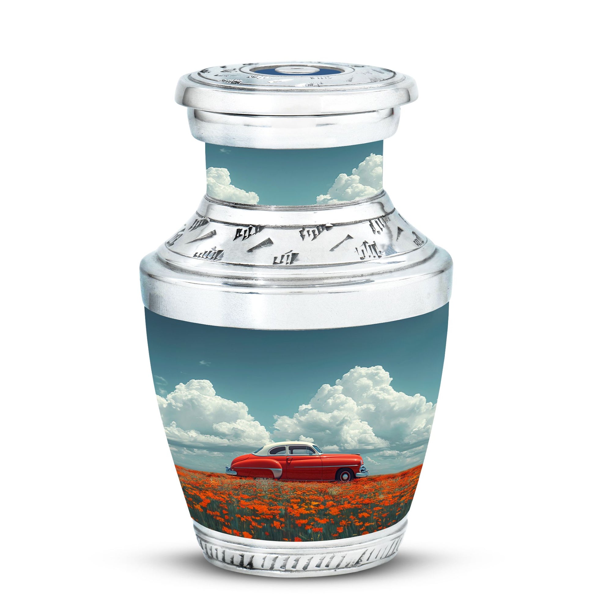 Expertly handcrafted, this large decorative urn for human ashes features a radiant red vintage car design, symbolizing vitality and timeless elegance. Made from durable aluminum, it ensures long-lasting protection and beauty. The secure screw-top lid offers peace of mind, keeping your loved one’s ashes safe. This large adult urn is perfect for home display or burial, blending artistry with heartfelt significance. Each large urn human ashes is finished with care, making it a meaningful keepsake for generations to come.