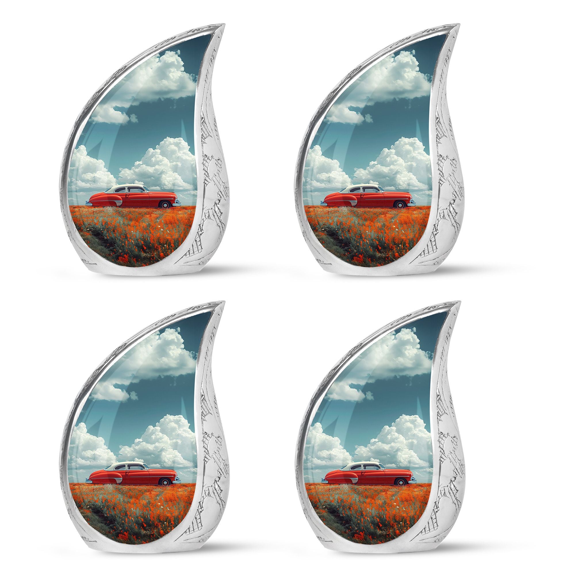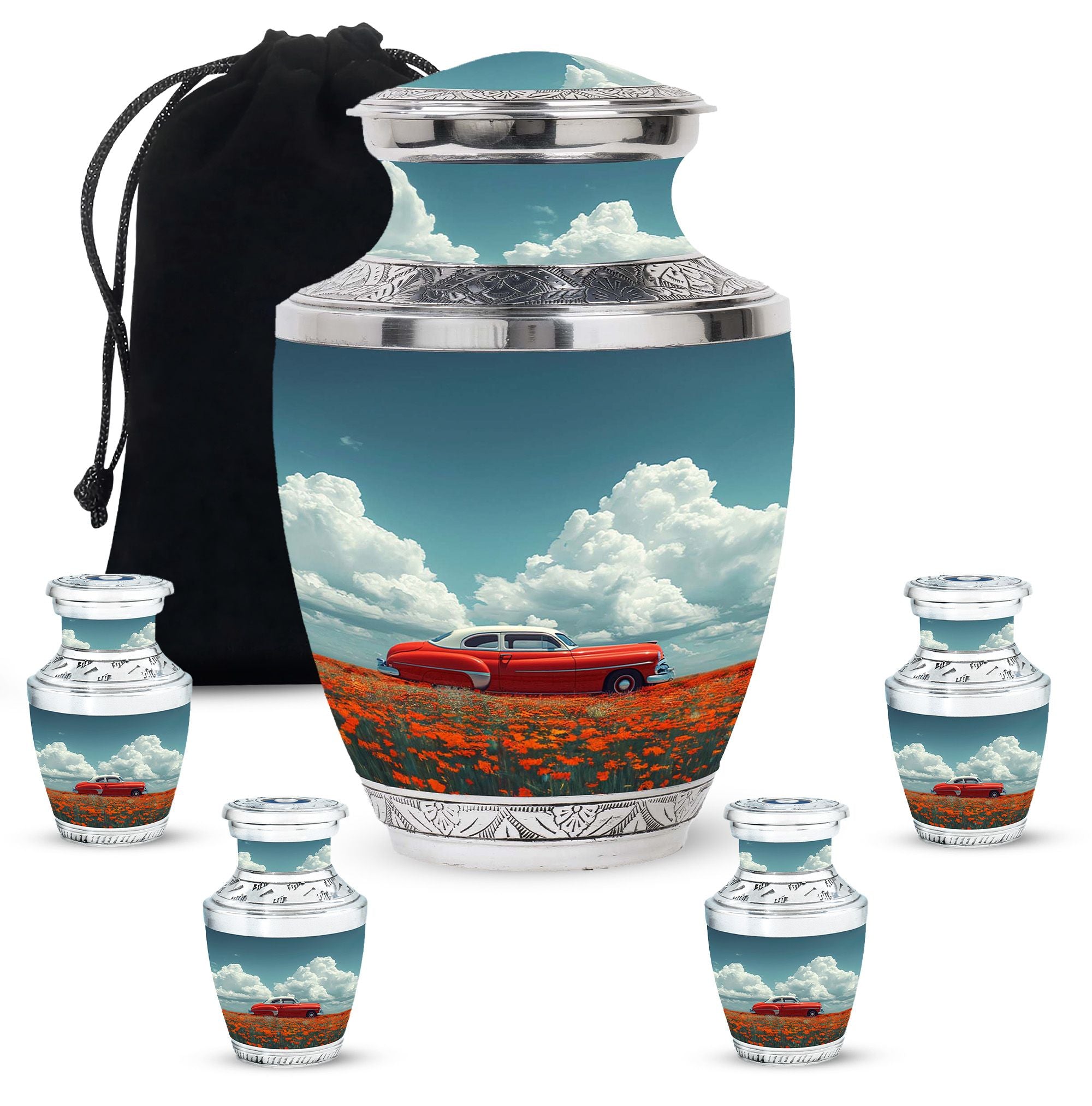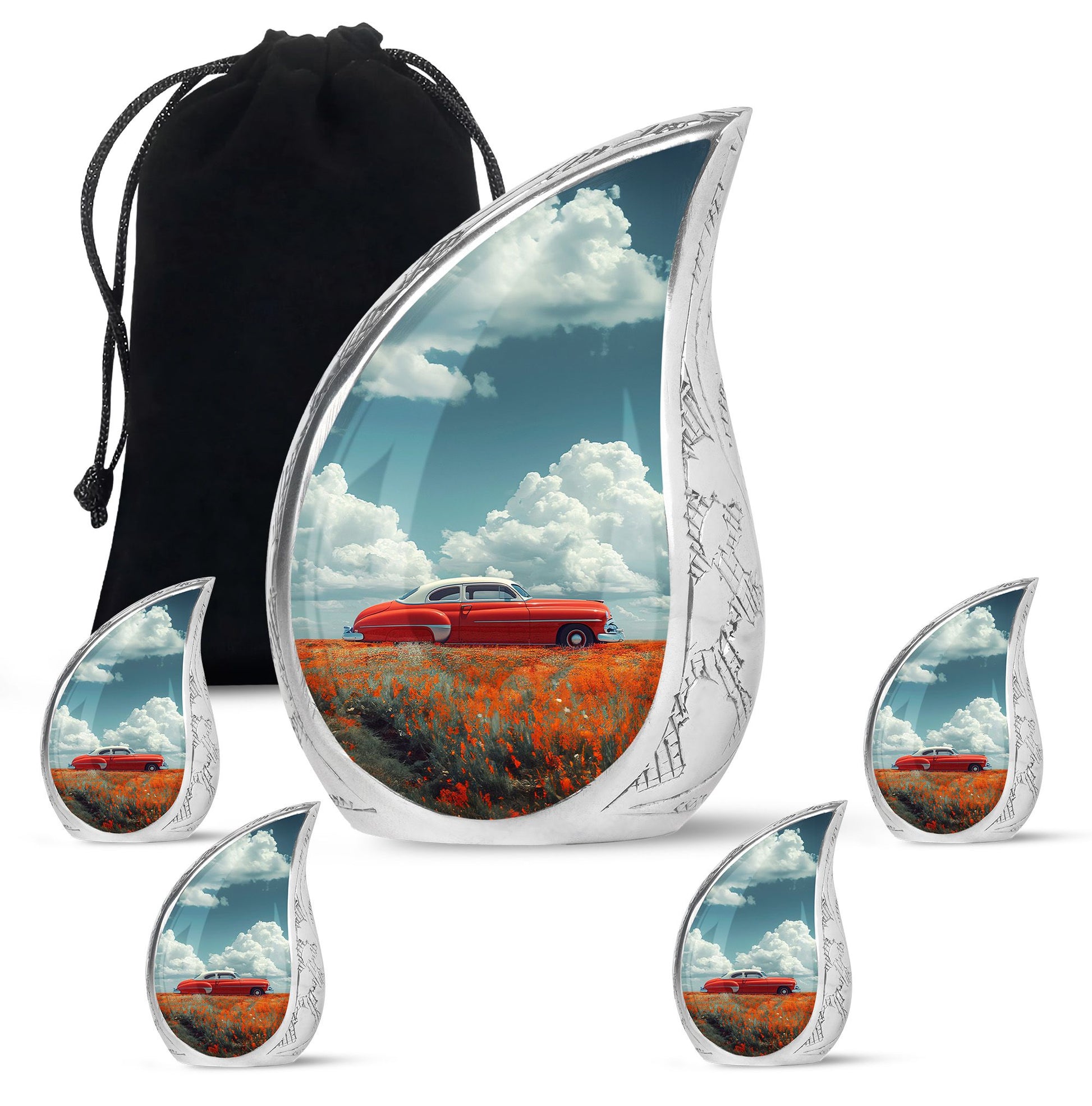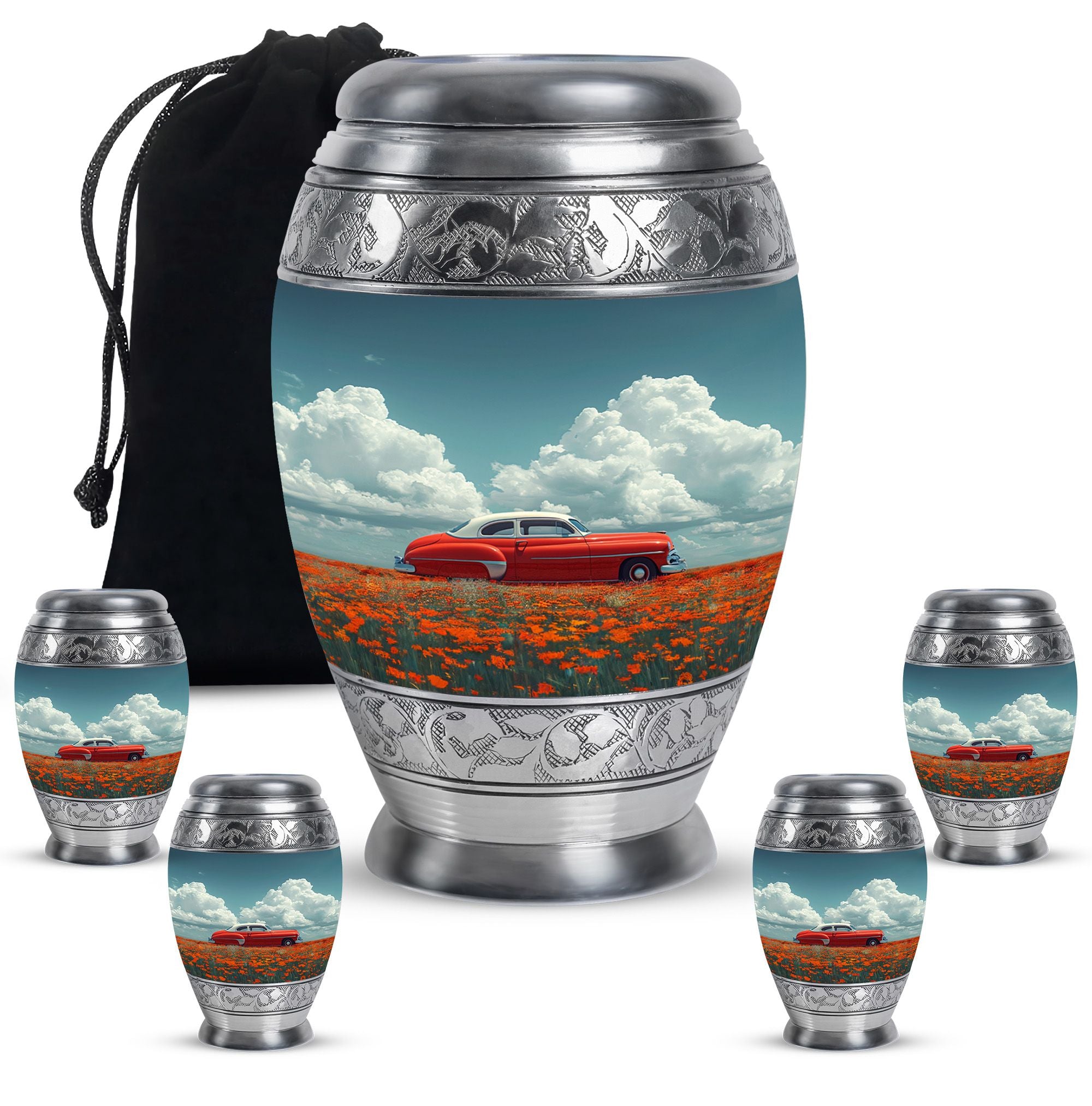 Expertly handcrafted, this large decorative urn for human ashes features a radiant red vintage car design, symbolizing vitality and timeless elegance. Made from durable aluminum, it ensures long-lasting protection and beauty. The secure screw-top lid offers peace of mind, keeping your loved one’s ashes safe. This large adult urn is perfect for home display or burial, blending artistry with heartfelt significance. Each large urn human ashes is finished with care, making it a meaningful keepsake for generations to come.