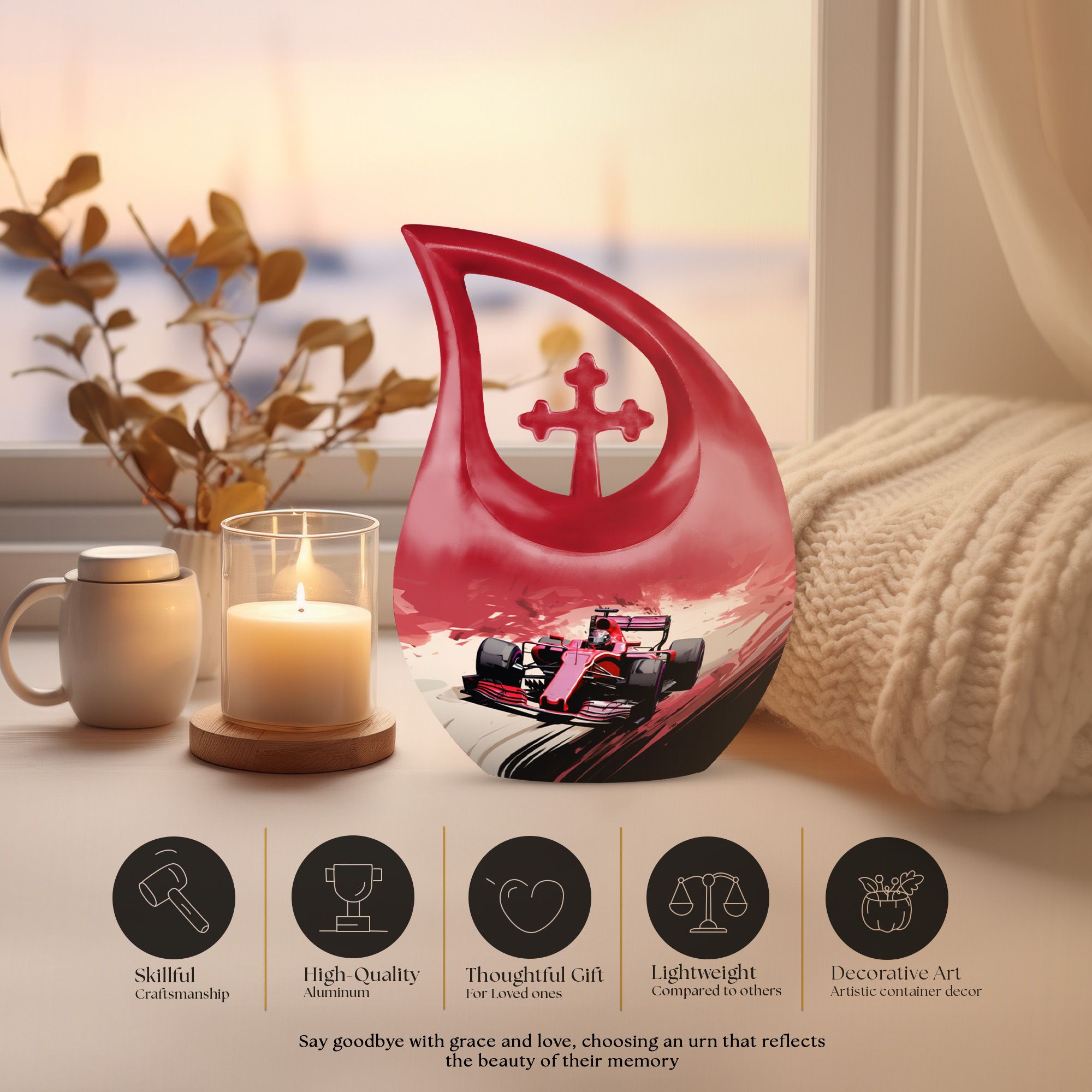 Take a moment to appreciate the deep significance of our unique Aluminium Car Race Urn, specifically designed to pay honorable tribute to your departed loved one and to keep their memory close to your heart. This large urn measures a respectful 10 inches in height and weighs a sturdy 3.3 pounds. The sleek Cross Drop design showcases the urn's exceptional craftsmanship. It's an ideal choice for fans of racing aficionados, with its automotive theme, making it a one-off piece in our unique collection of memorial urns. Not only is it visually impressive, but it also boasts a capacity of 200 cubic inches, perfectly suited to safeguard the ashes. The urn comes packaged along with a velvet pouch for containment of ashes. Moreover, it gives you the option to add a personal touch with engraved names. This Car Race Urn, excellent for human remains, is a subtle blend of beauty and functionality, making it a top selection amongst various others, like 'Together Again Companion Urn,' 'Best Urns,' 'Urns For Men's Ashes,' and 'Bio Urn For Humans.' Our magnificent piece proudly stands out in its own individual way.