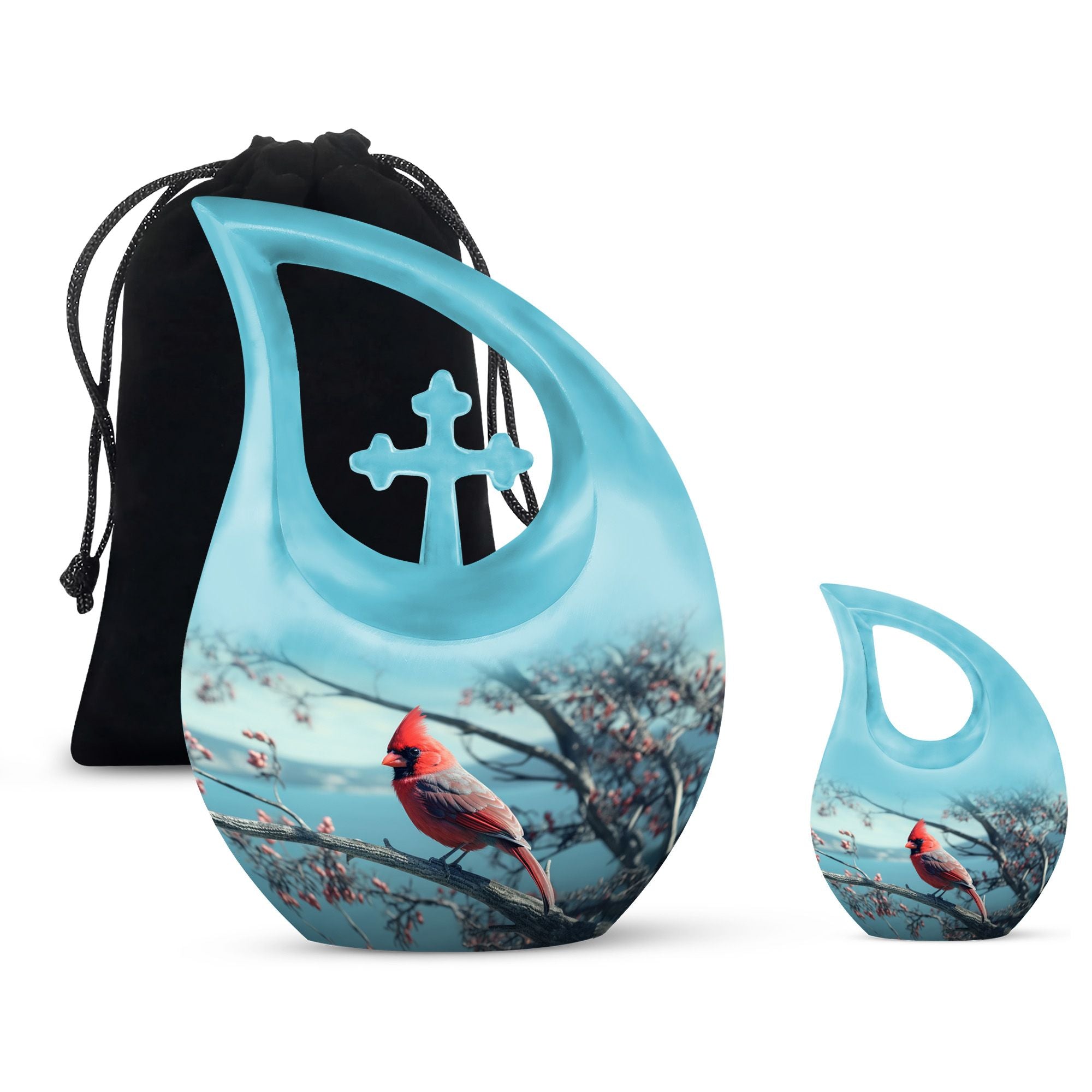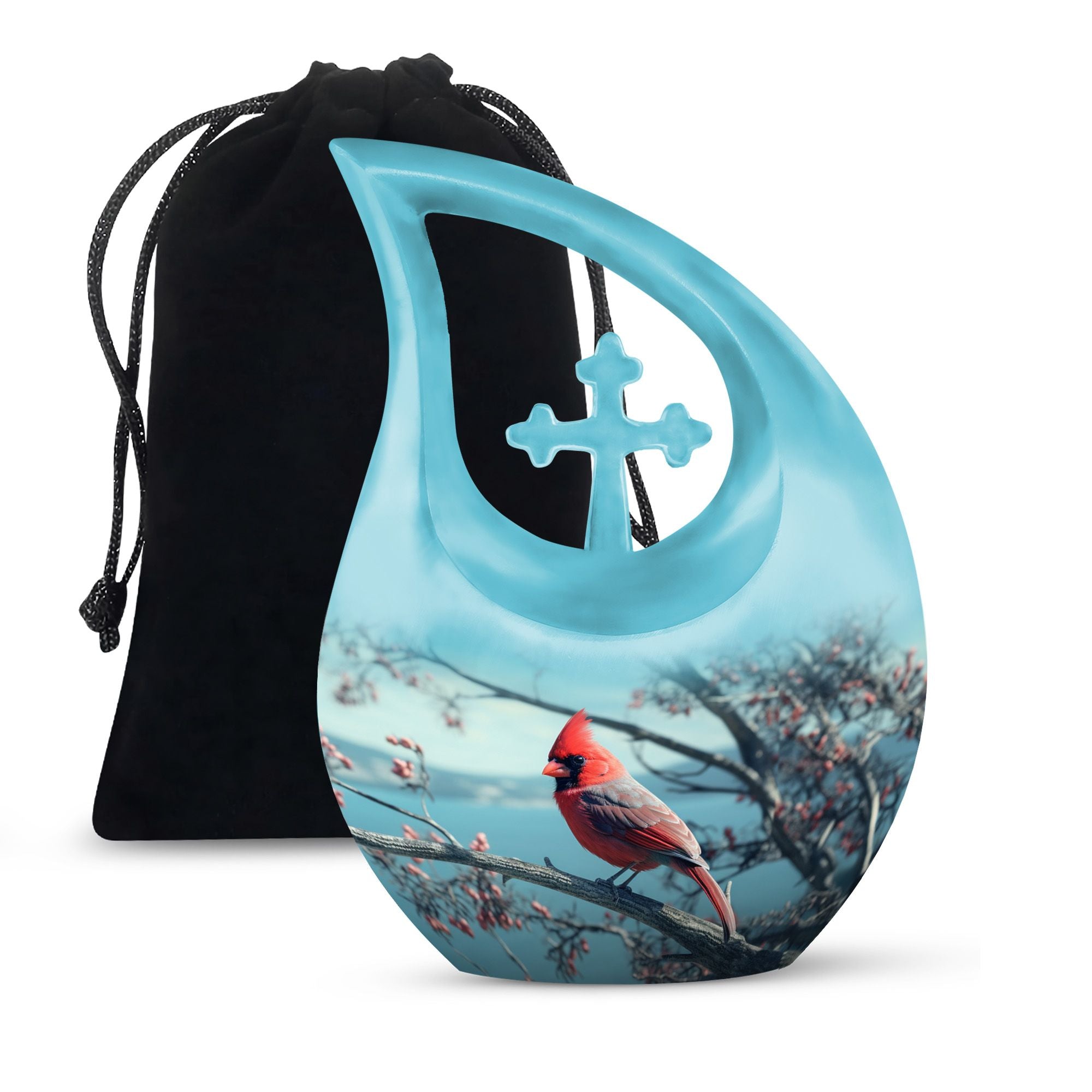 Handcrafted from durable aluminum, this urn features a polished light-blue finish complemented by a delicately engraved red cardinal motif. Ideal as a funeral urn for adult ashes men or women, it combines strength with refined artistry. The secure screw-top lid provides lasting peace of mind, making it perfect for display, burial, or sharing ashes among family members. Families seeking cremation urns for men or keepsake urns for women will find this design deeply meaningful.