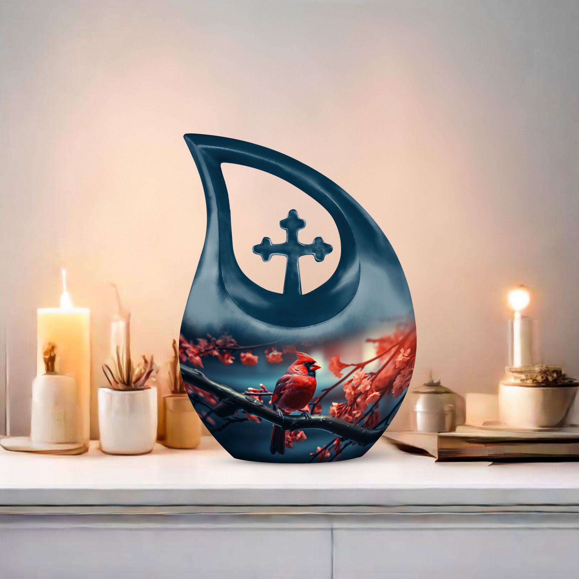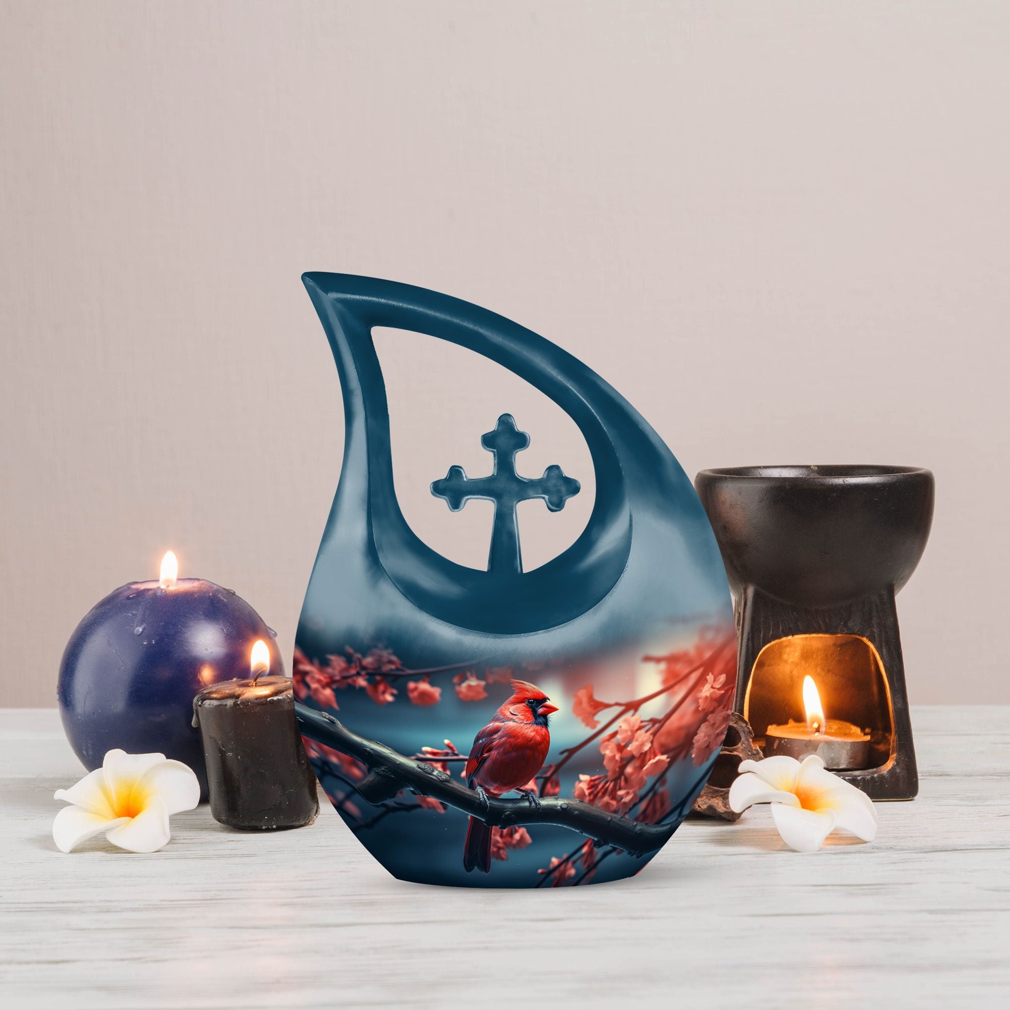 Crafted with precision from durable aluminum, this urn features a stunning deep finish enhanced by a vibrant red cardinal motif. Its high-quality craftsmanship ensures longevity and security, making it ideal for home display or burial. Designed as a urn for ashes adult male or adult urns women, this piece embodies timeless elegance. The secure screw-top lid provides peace of mind while preserving the ashes safely.