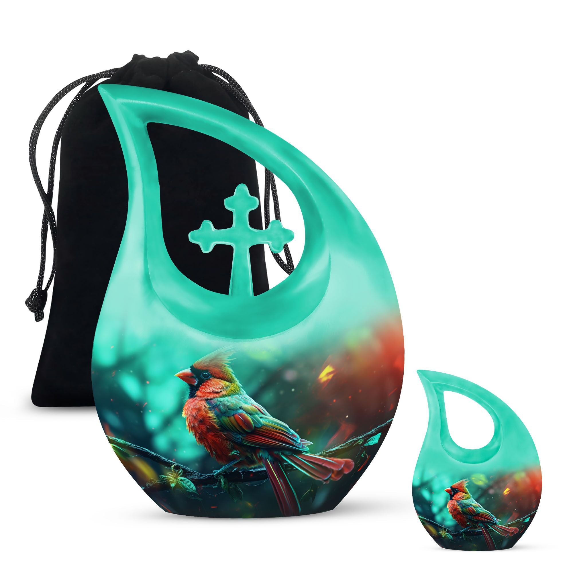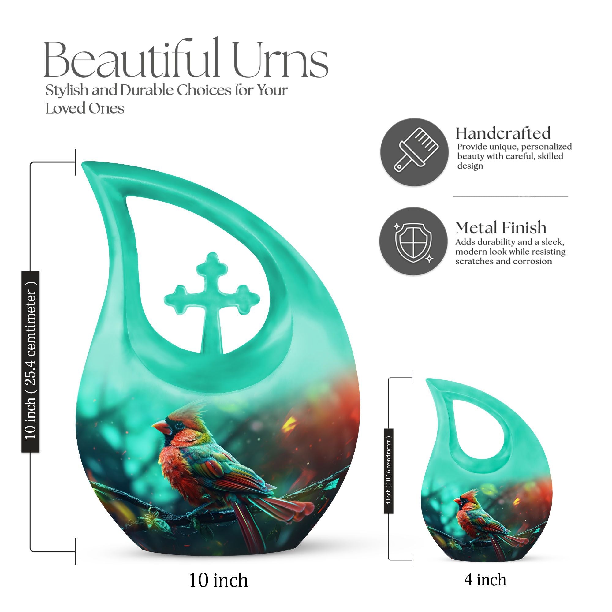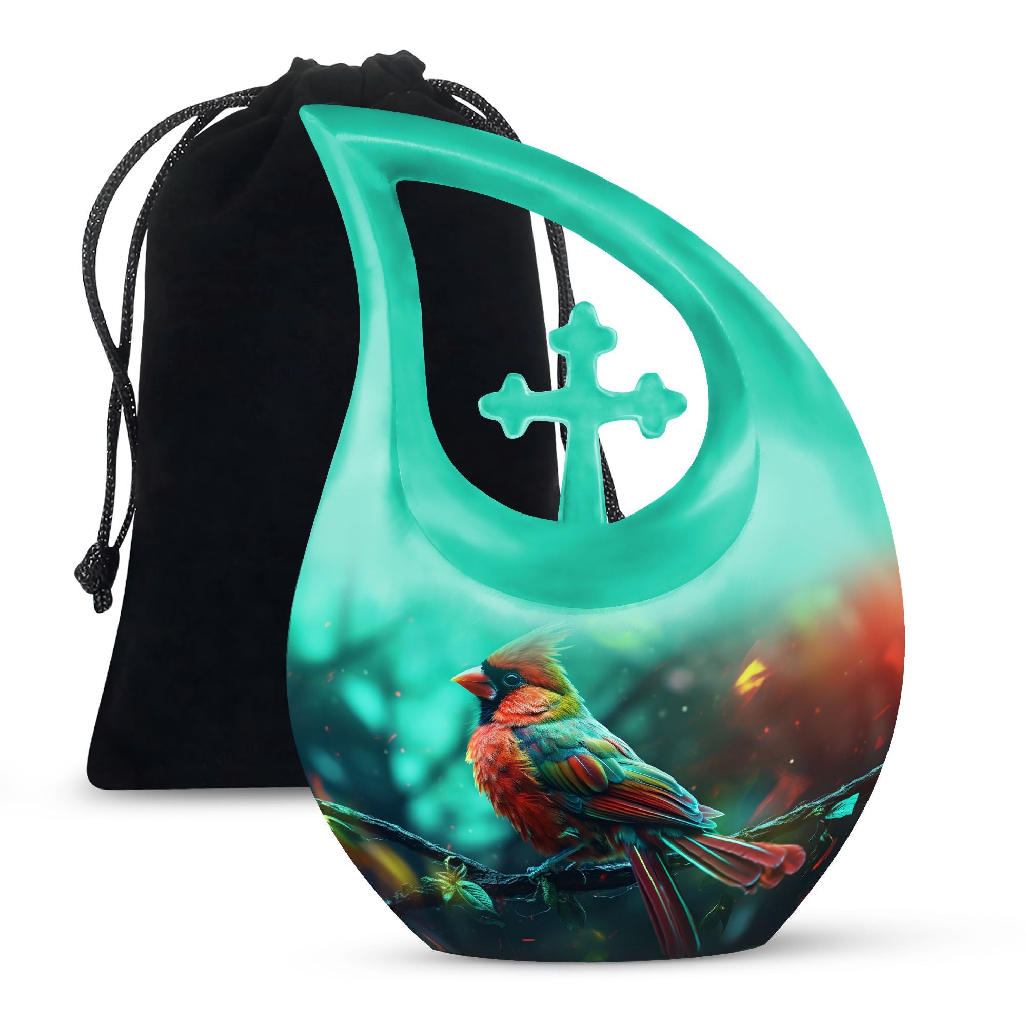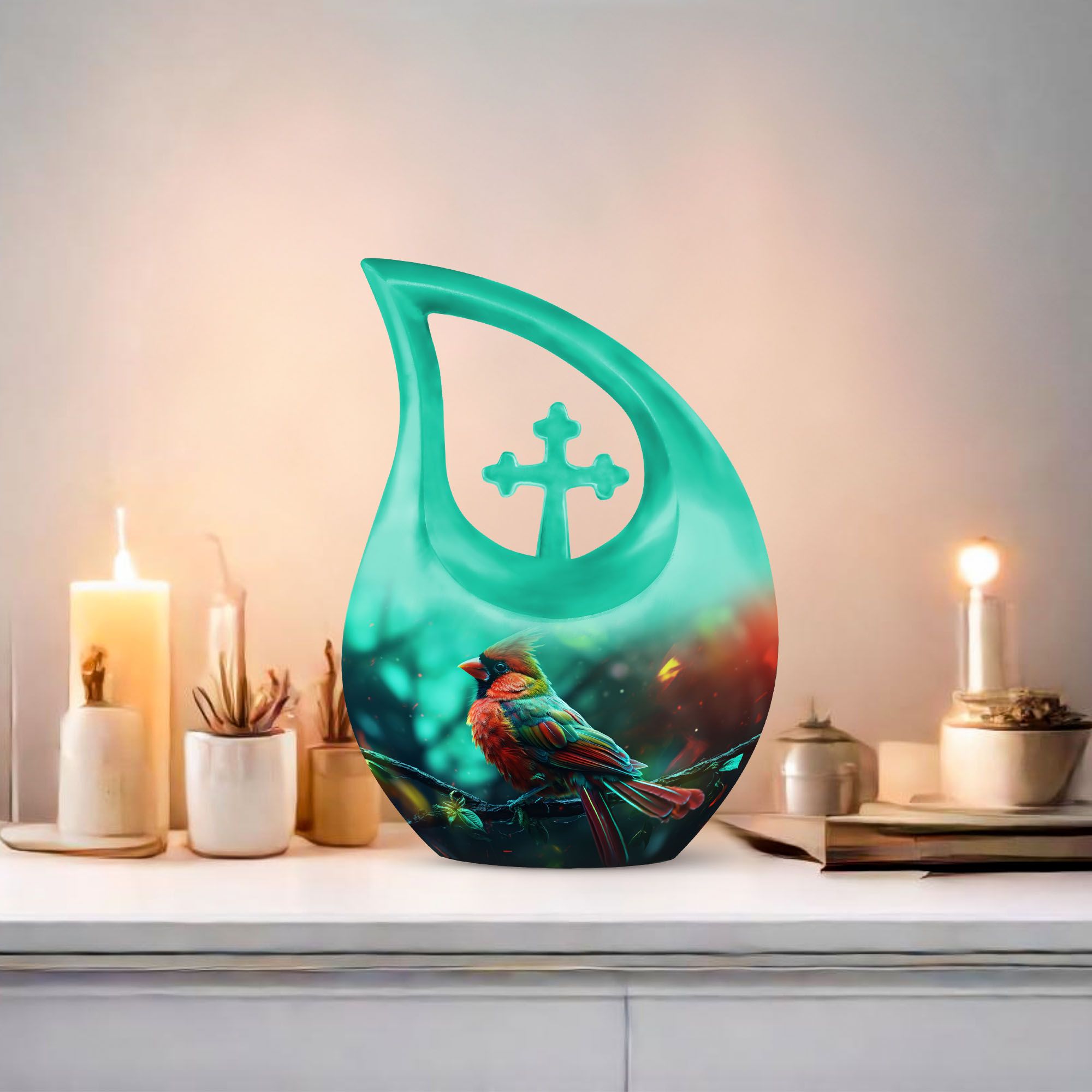 Expertly crafted from durable aluminum, this urn features a luminous aqua green surface accented by a delicate red cardinal motif—representing hope and spiritual presence. Ideal as a small urn women or a tiny urn for women & men, it’s perfect for sharing ashes among family members or displaying as a memorial keepsake. Each urn is thoughtfully designed to hold cherished memories within a secure, elegant vessel.