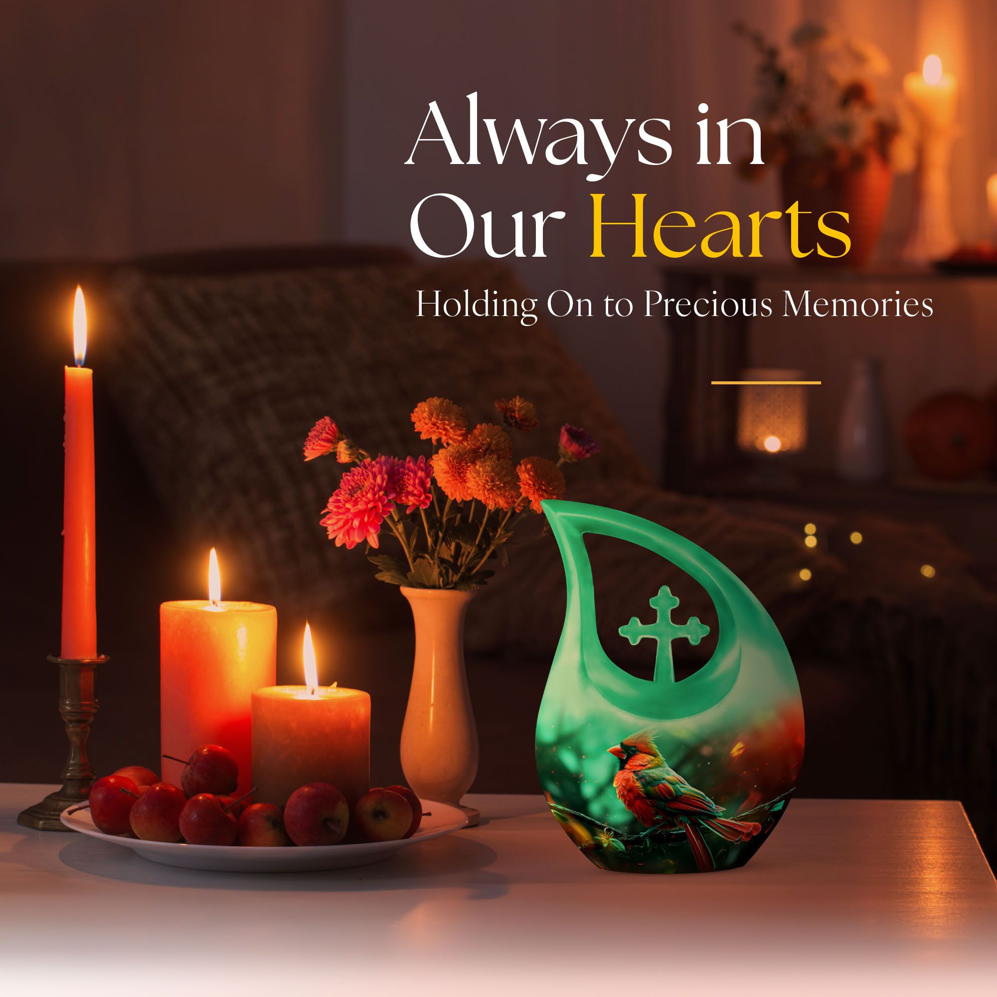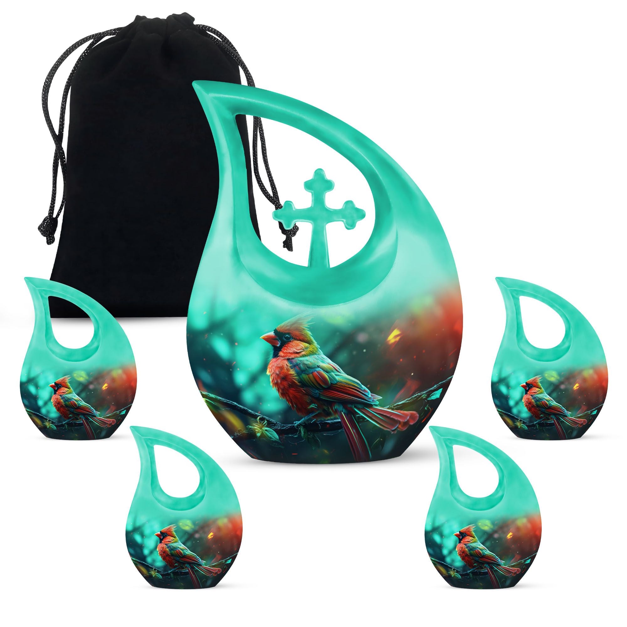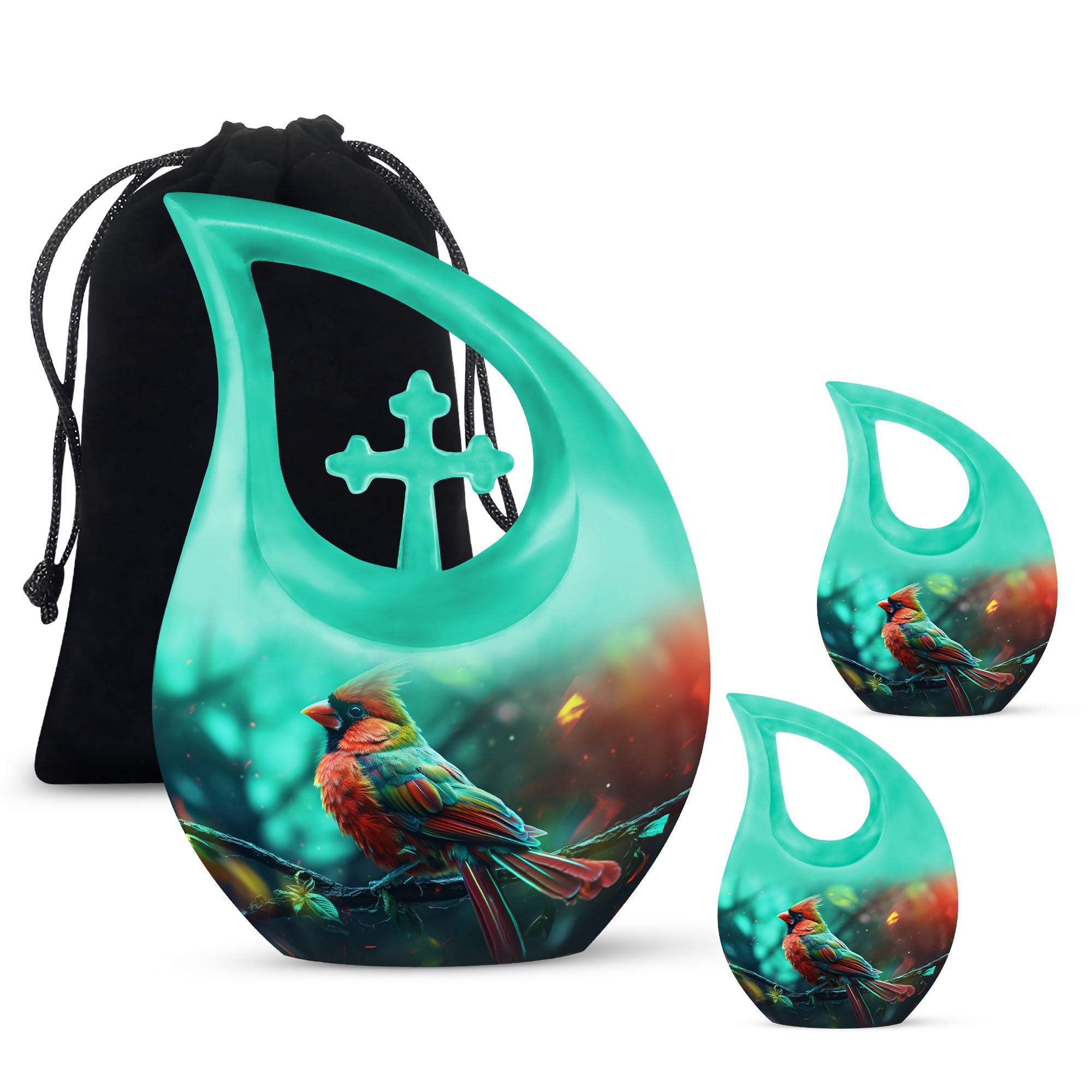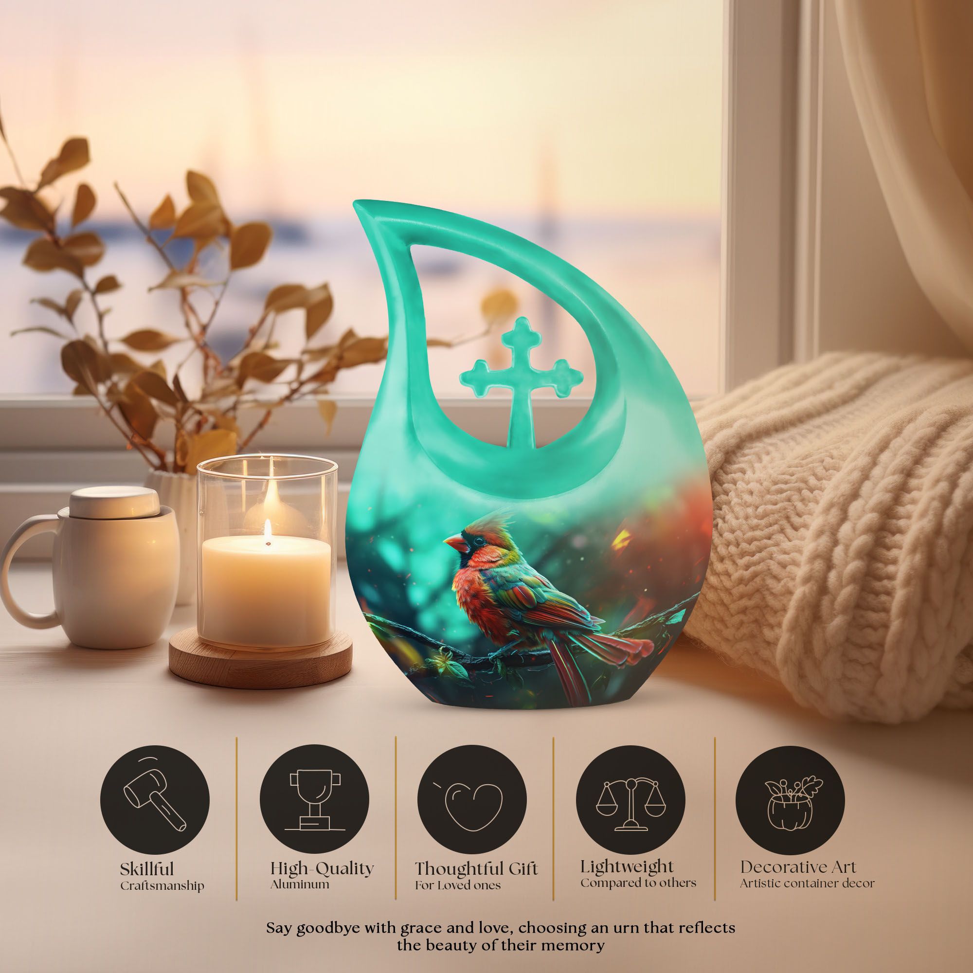 Expertly crafted from durable aluminum, this urn features a luminous aqua green surface accented by a delicate red cardinal motif—representing hope and spiritual presence. Ideal as a small urn women or a tiny urn for women & men, it’s perfect for sharing ashes among family members or displaying as a memorial keepsake. Each urn is thoughtfully designed to hold cherished memories within a secure, elegant vessel.