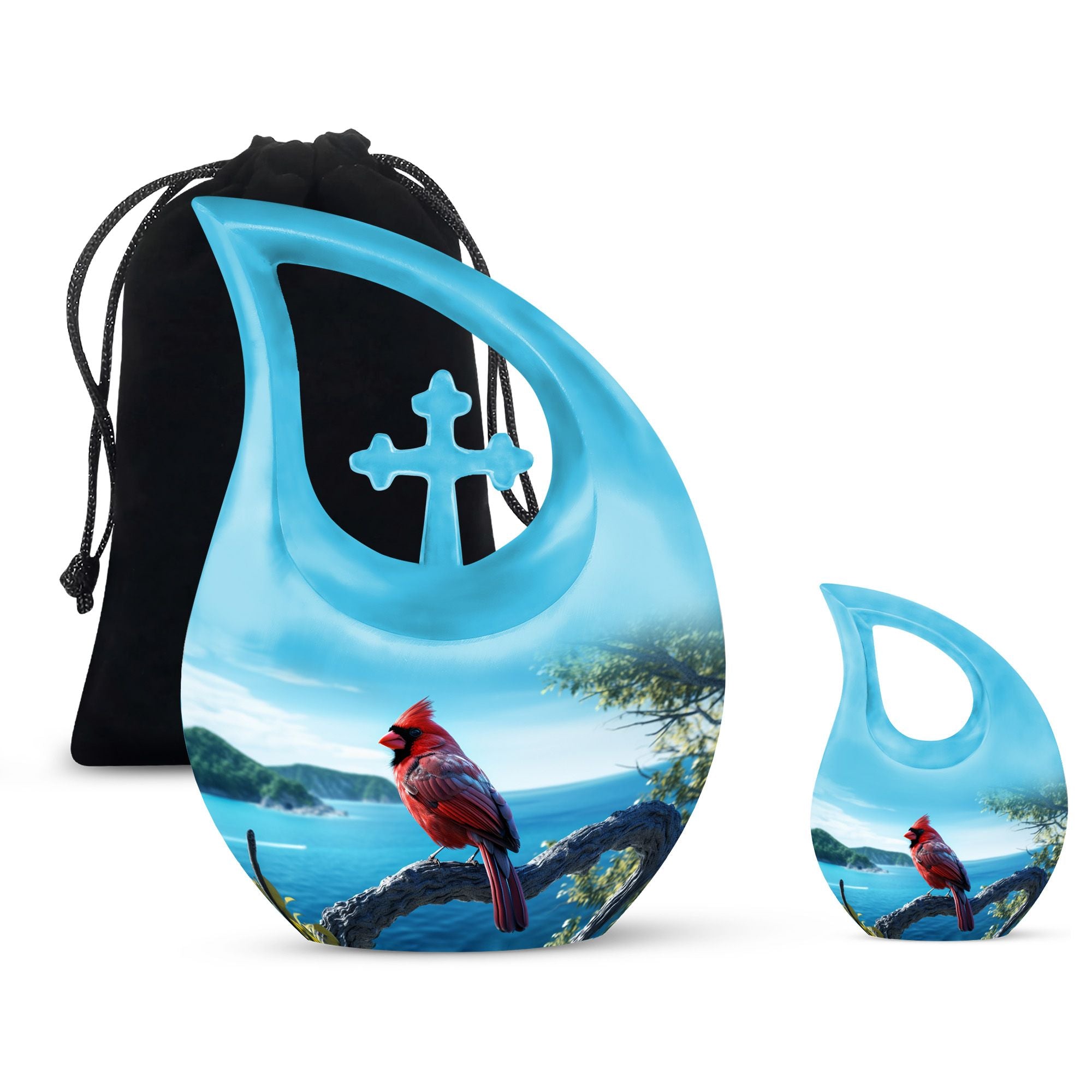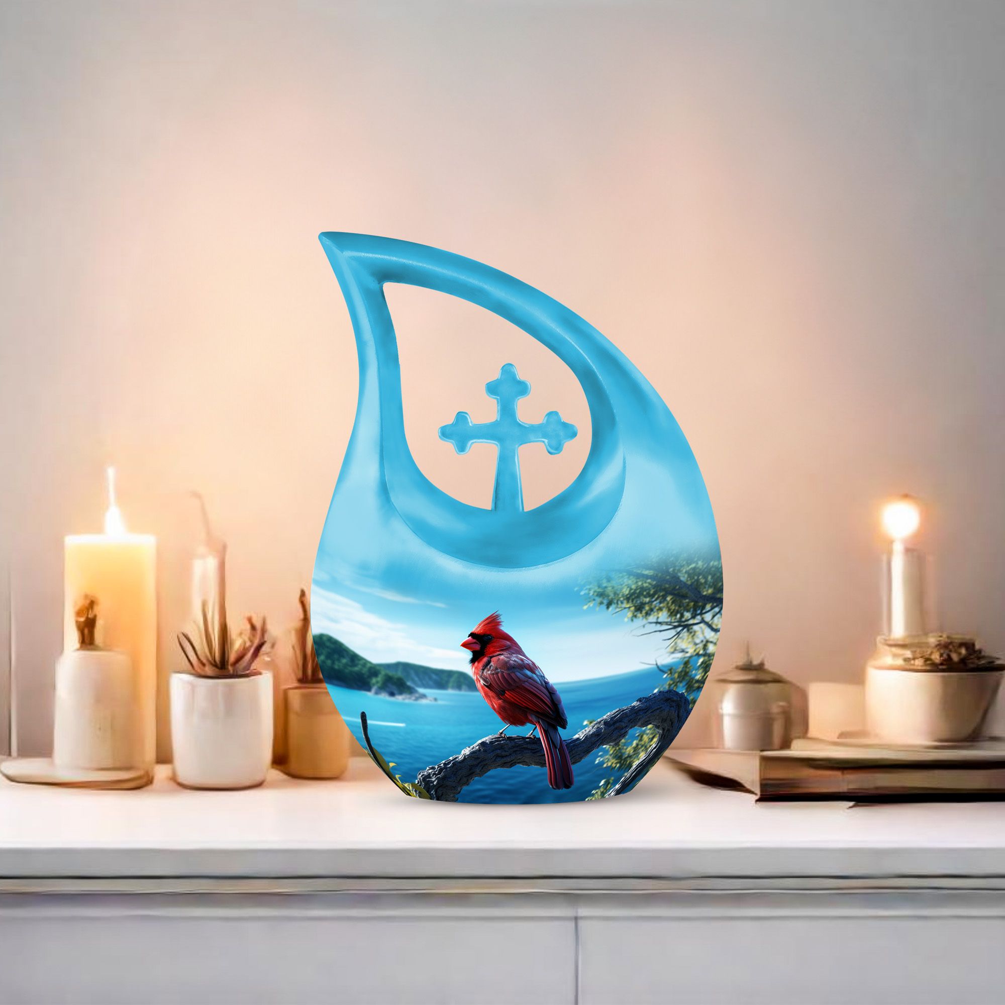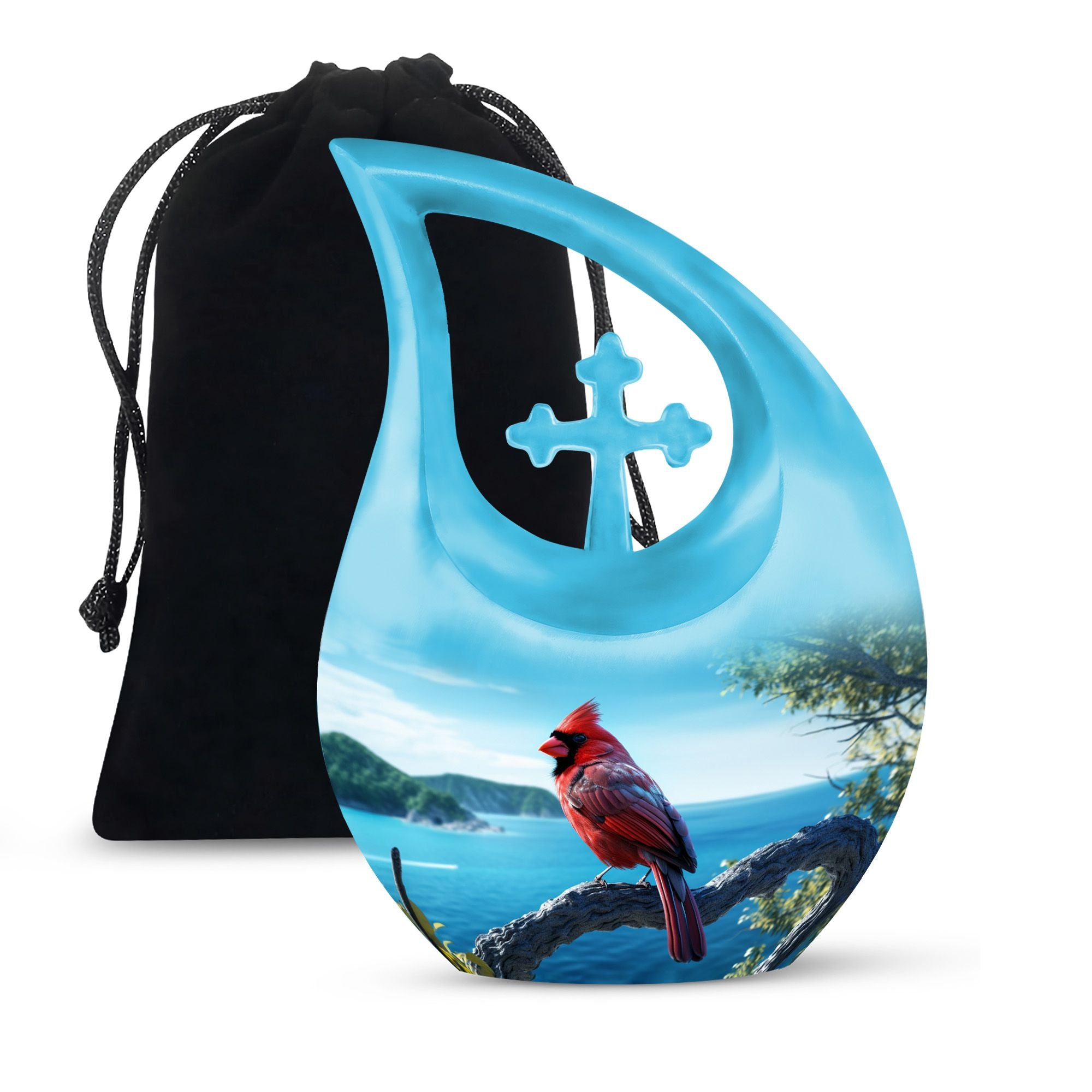 The Red Cardinal Bird Funeral Urn embodies timeless love and remembrance, offering comfort through its vivid colors and heartfelt symbolism. The red cardinal—often seen as a messenger of hope—graces this bright blue cremation urn for humans, reminding us that love endures beyond life. Crafted with care and respect, it serves as a beautiful urn adult cremation choice for men or women.