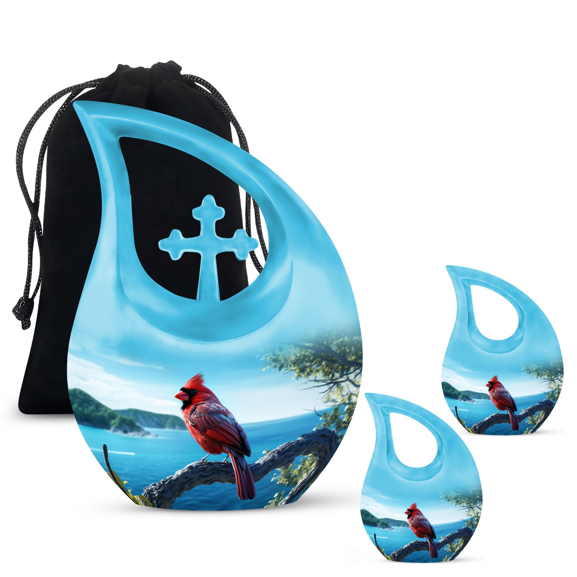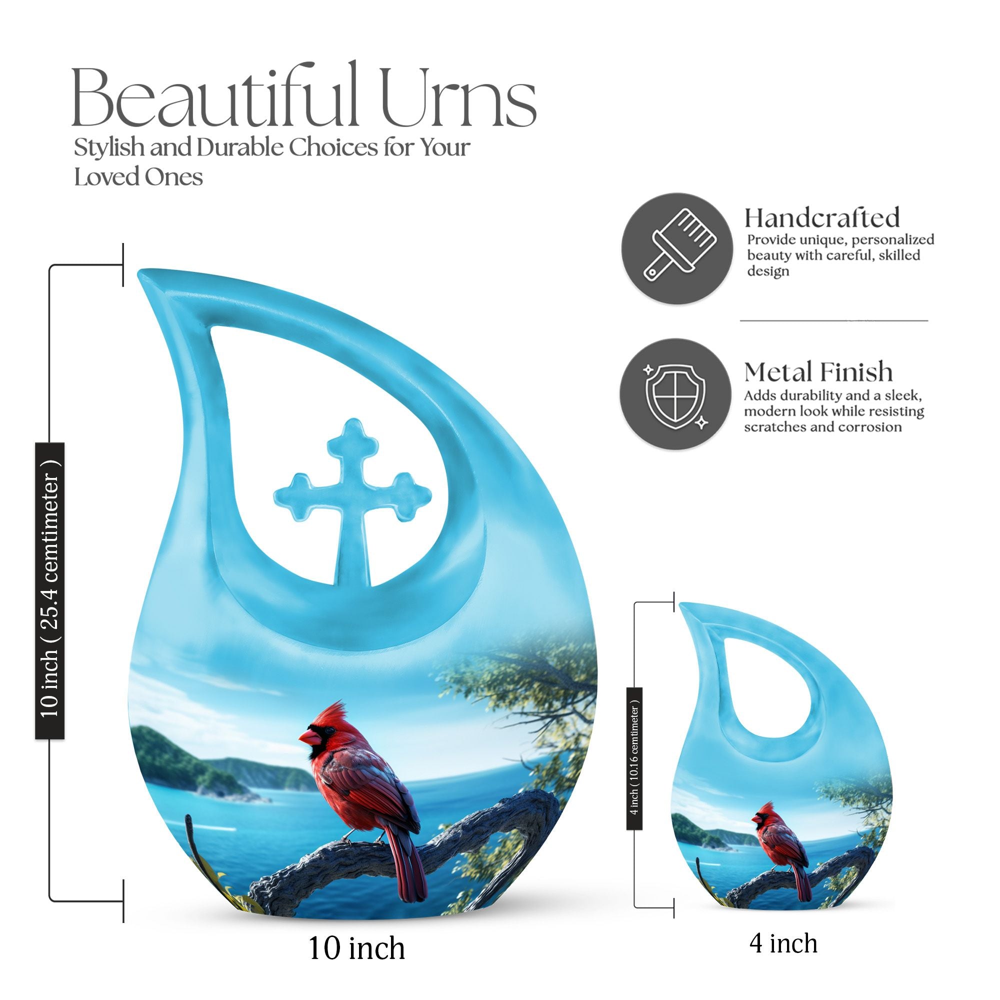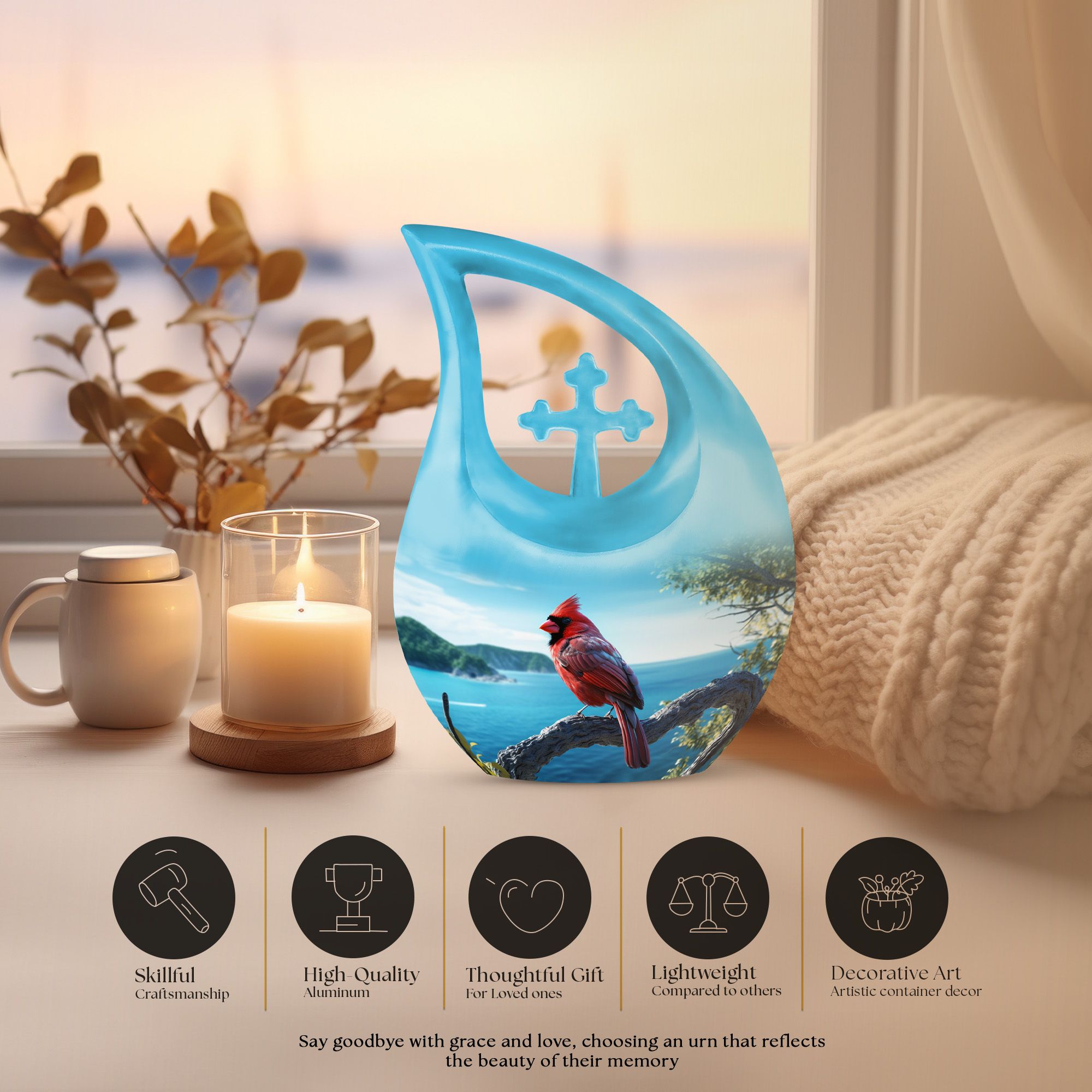The Red Cardinal Bird Funeral Urn embodies timeless love and remembrance, offering comfort through its vivid colors and heartfelt symbolism. The red cardinal—often seen as a messenger of hope—graces this bright blue cremation urn for humans, reminding us that love endures beyond life. Crafted with care and respect, it serves as a beautiful urn adult cremation choice for men or women.