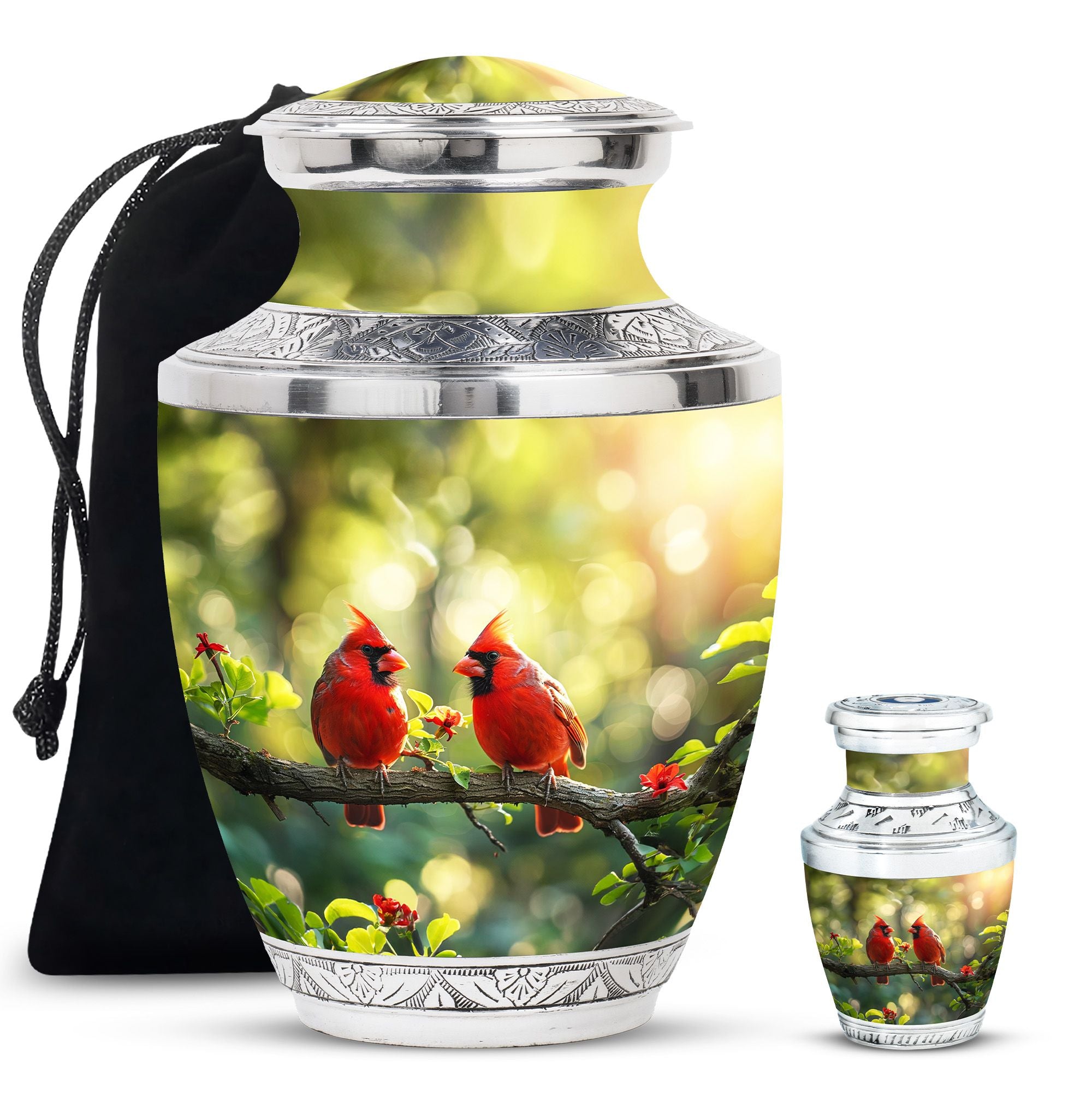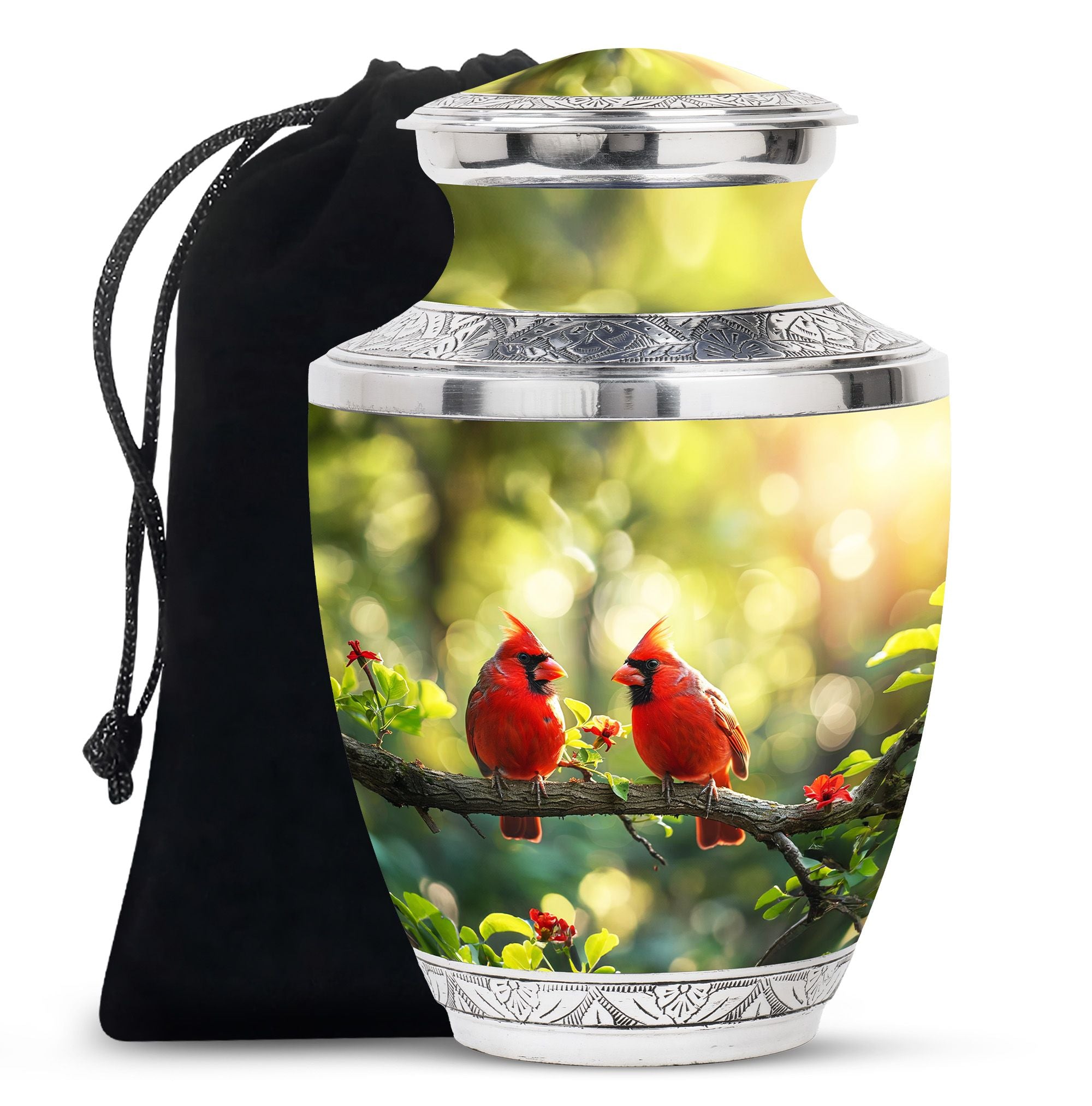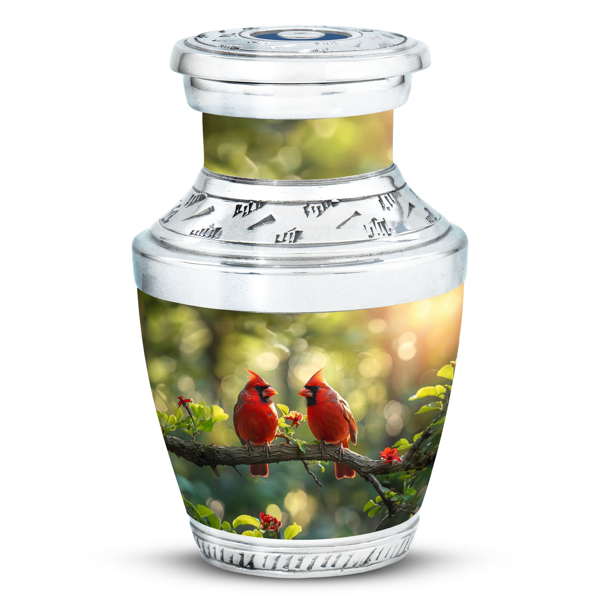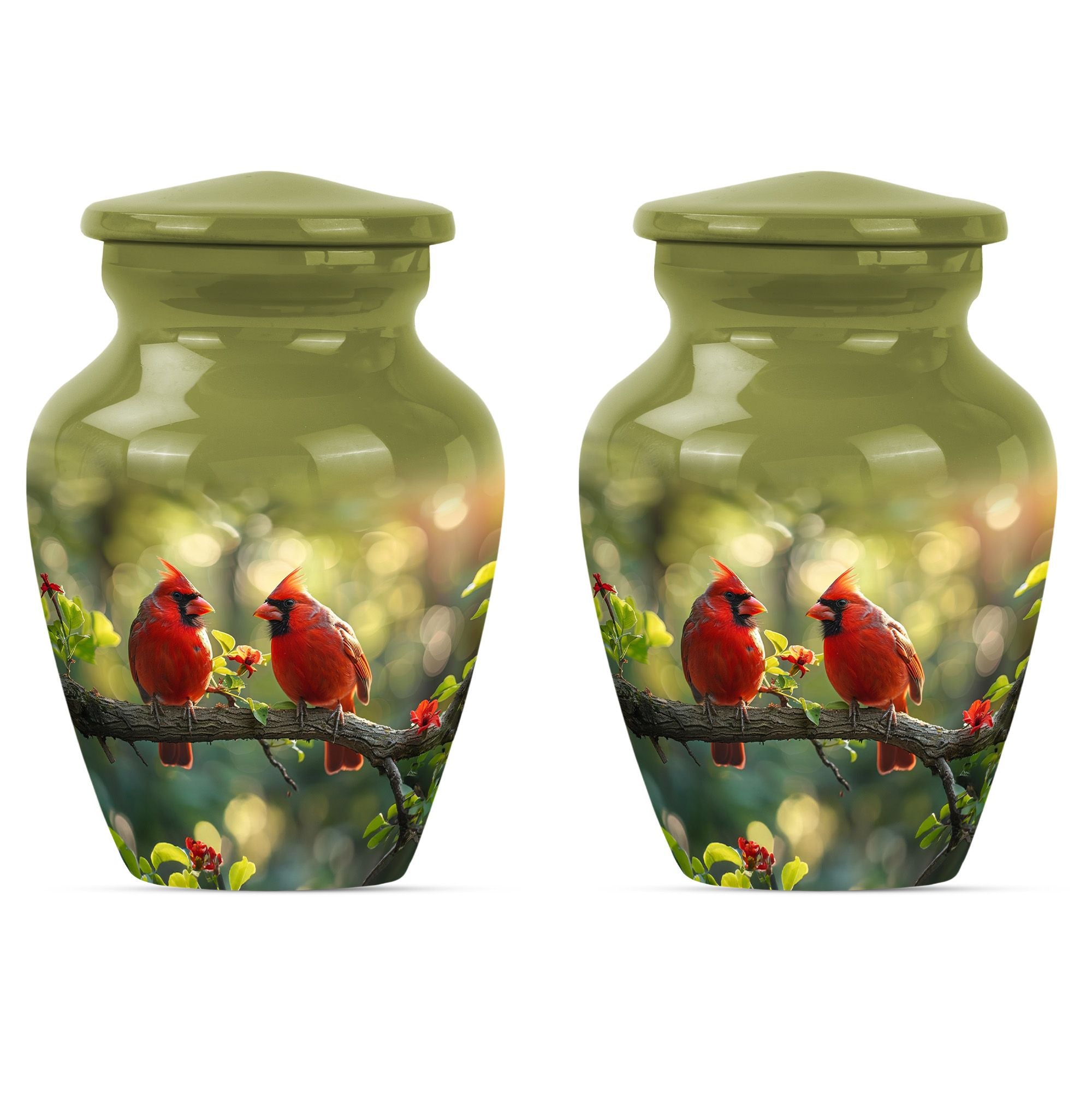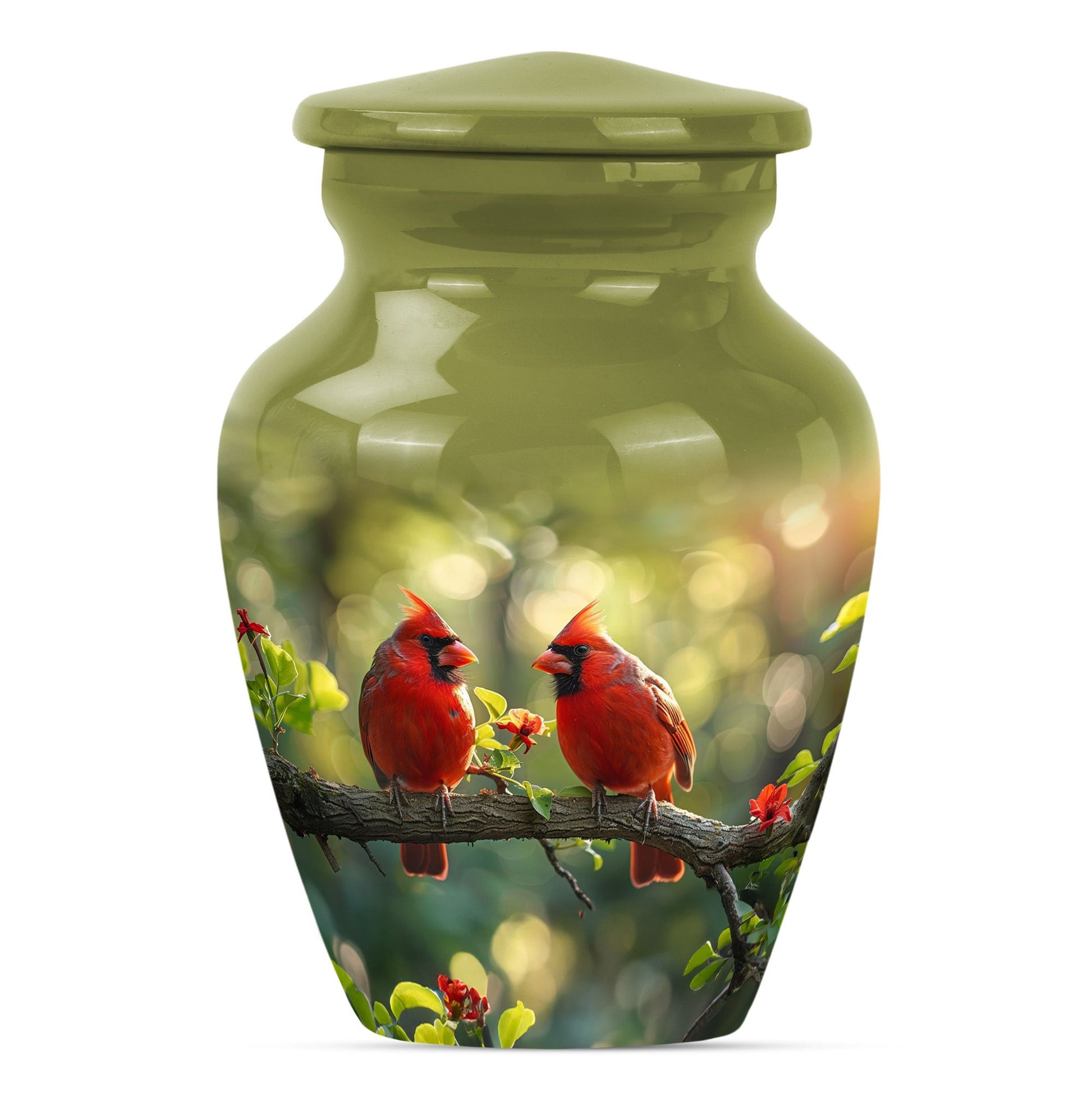 Beautifully crafted, this funeral urn features durable aluminum construction with a secure screw-top lid, ensuring ashes remain safely protected. The green background adorned with cardinal bird couples adds warmth and serenity. Whether used as an adult funeral urn, part of funeral urns for human ashes small, or treasured as keepsake funeral urns, this piece blends artistry with strength, providing a meaningful way to honor a life well-lived.
