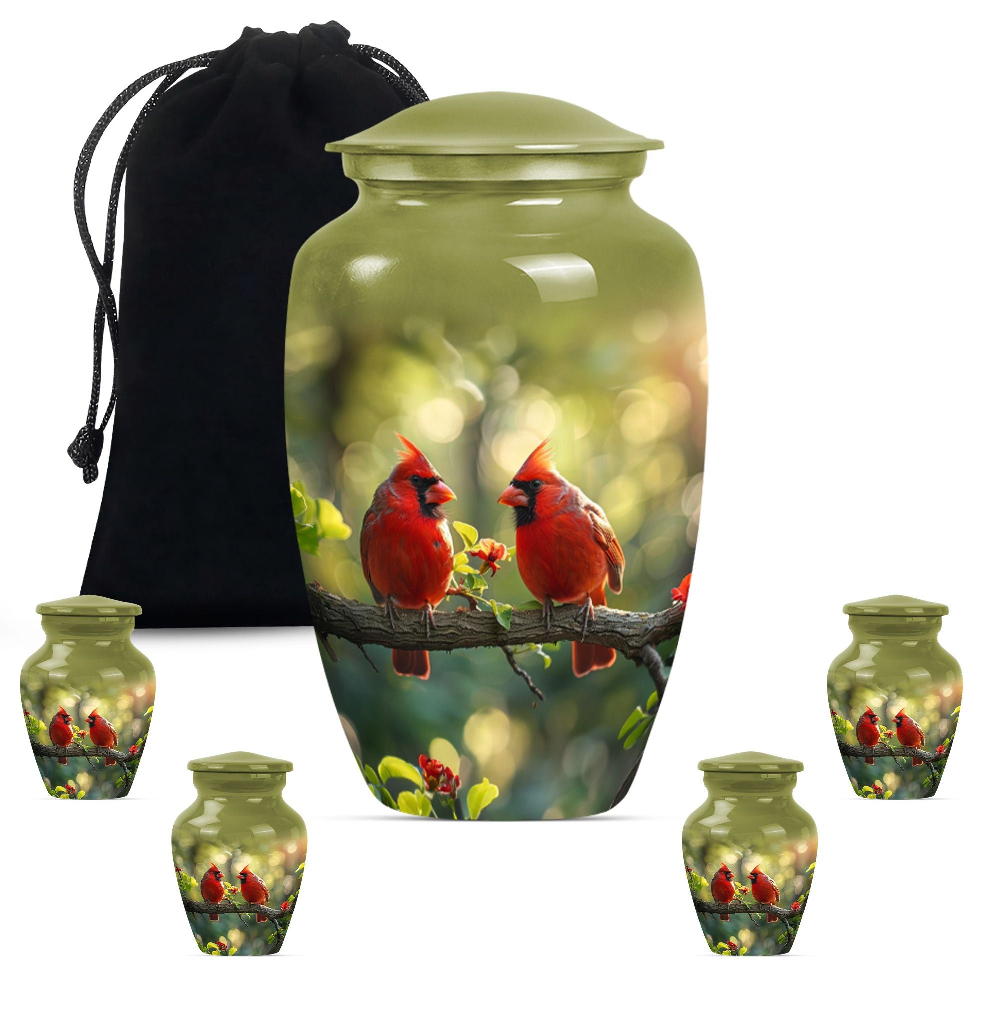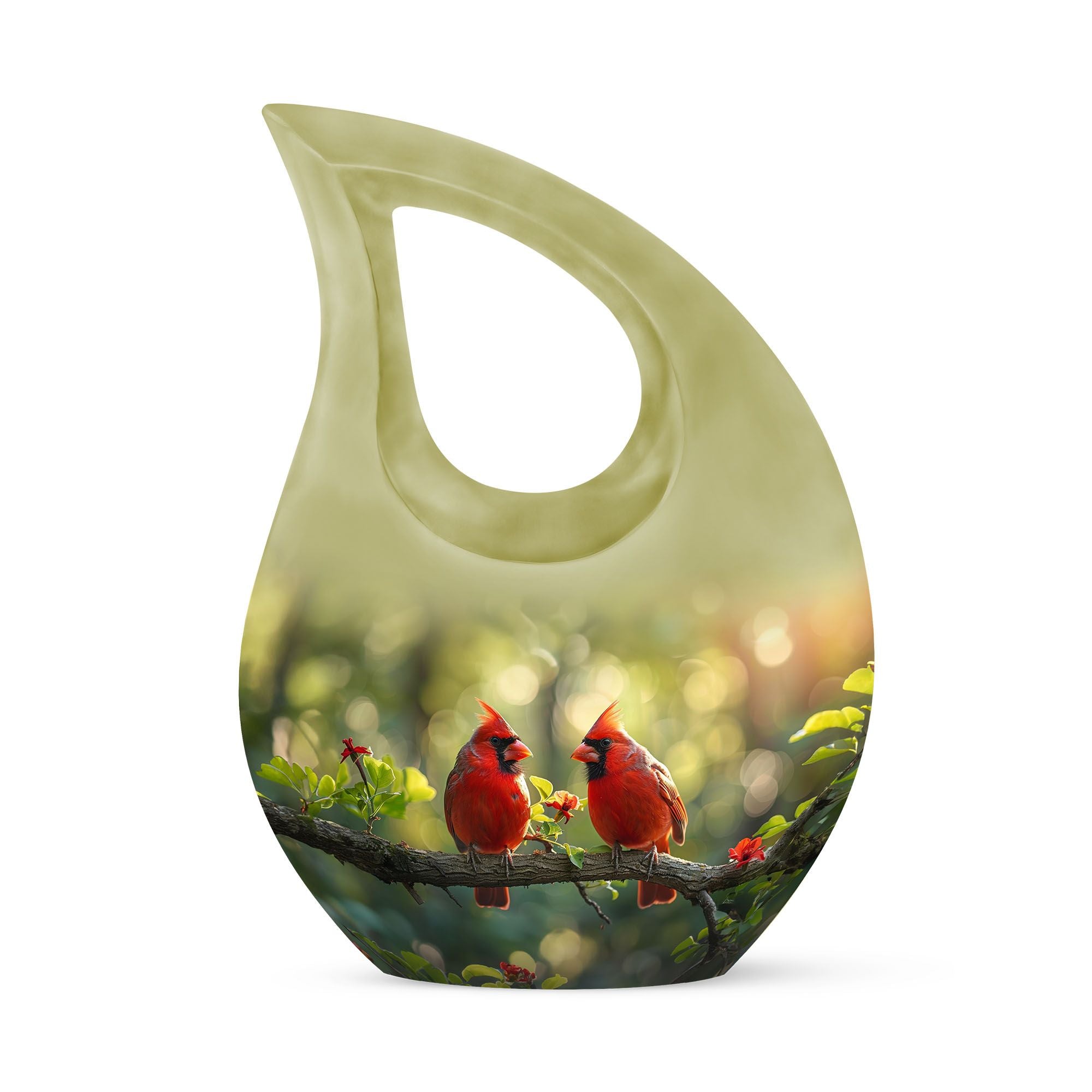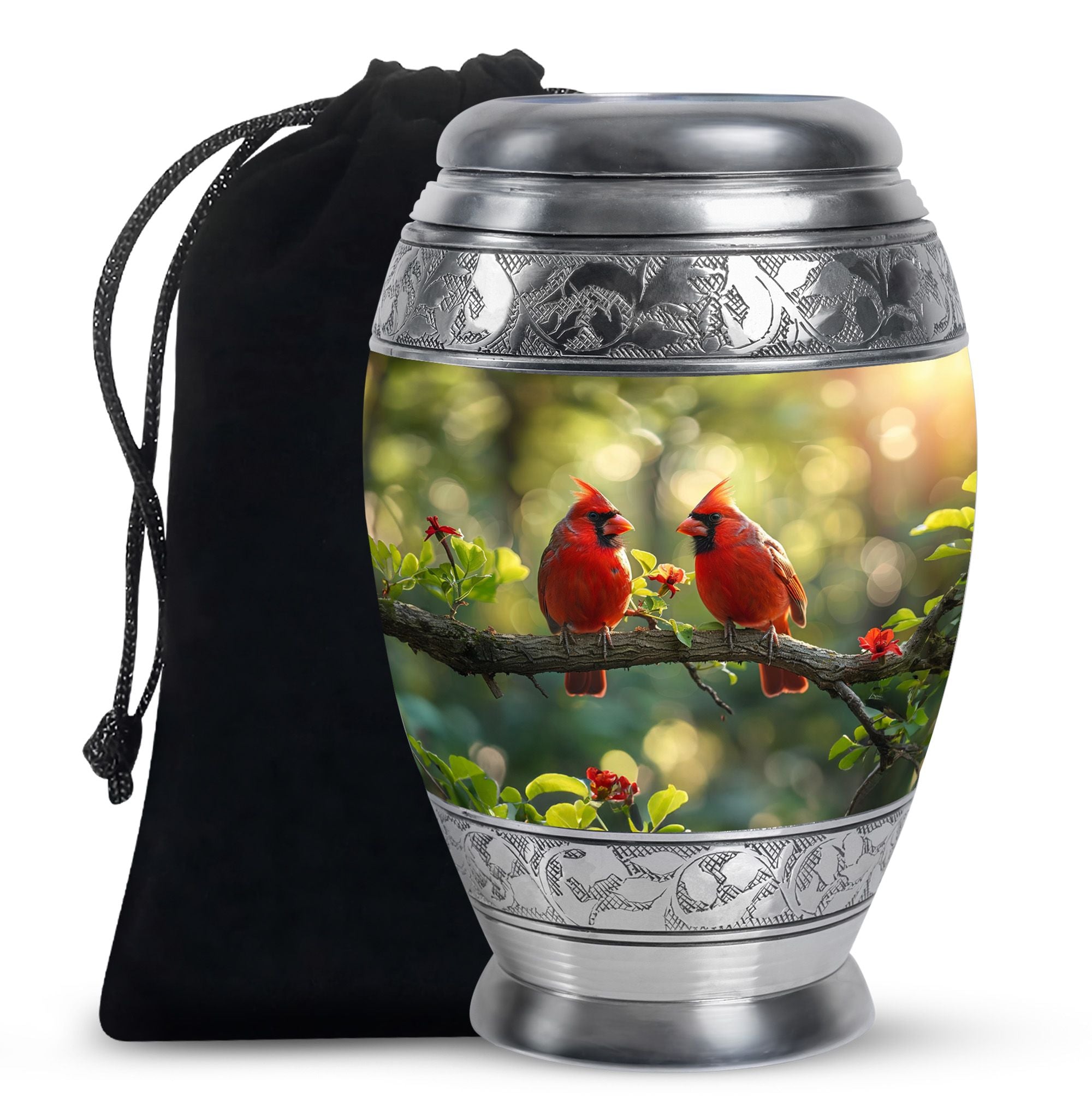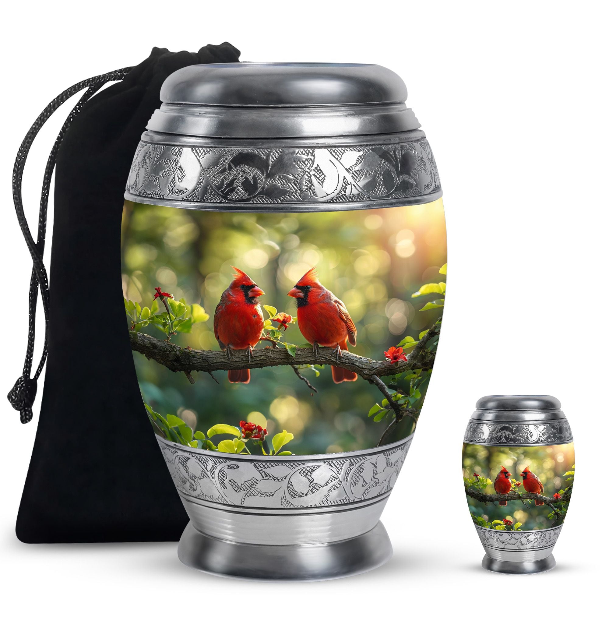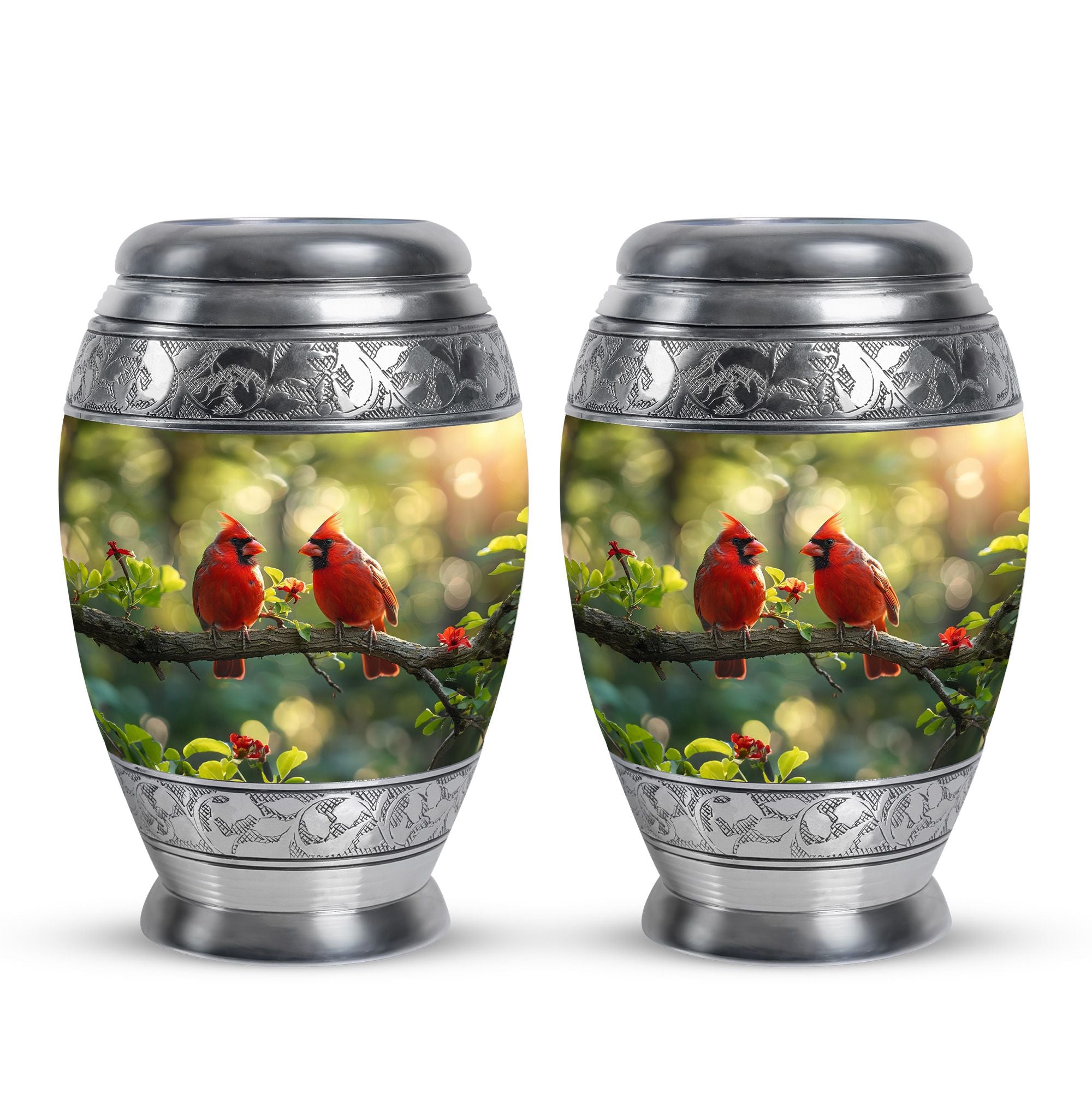 Beautifully crafted, this funeral urn features durable aluminum construction with a secure screw-top lid, ensuring ashes remain safely protected. The green background adorned with cardinal bird couples adds warmth and serenity. Whether used as an adult funeral urn, part of funeral urns for human ashes small, or treasured as keepsake funeral urns, this piece blends artistry with strength, providing a meaningful way to honor a life well-lived.