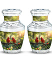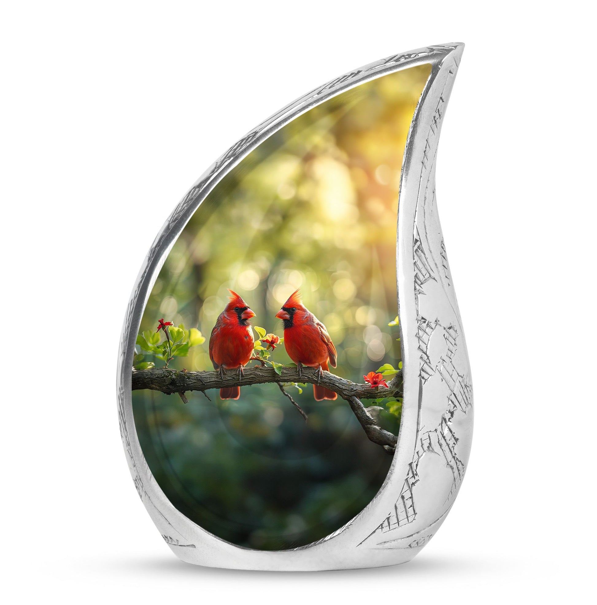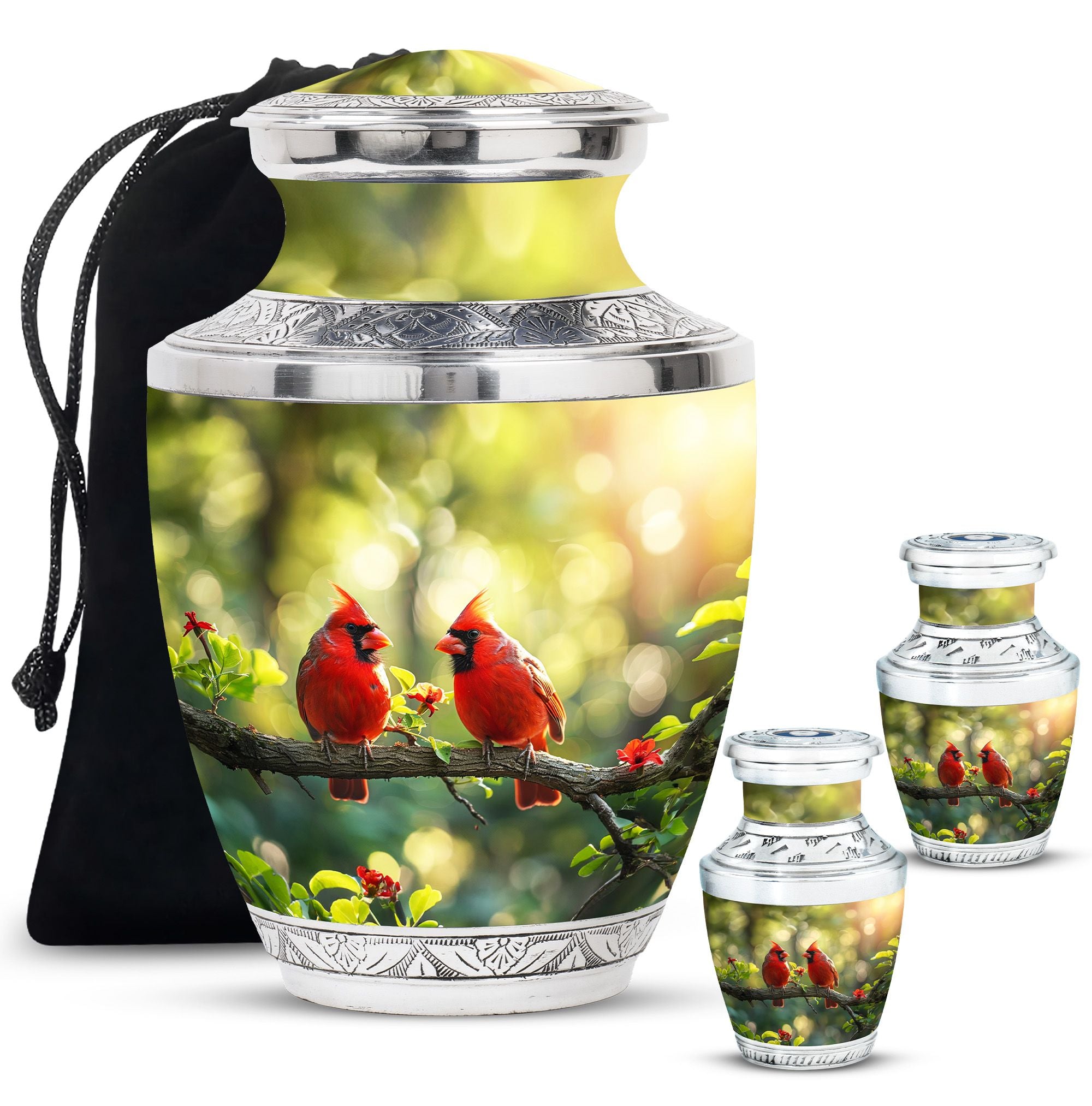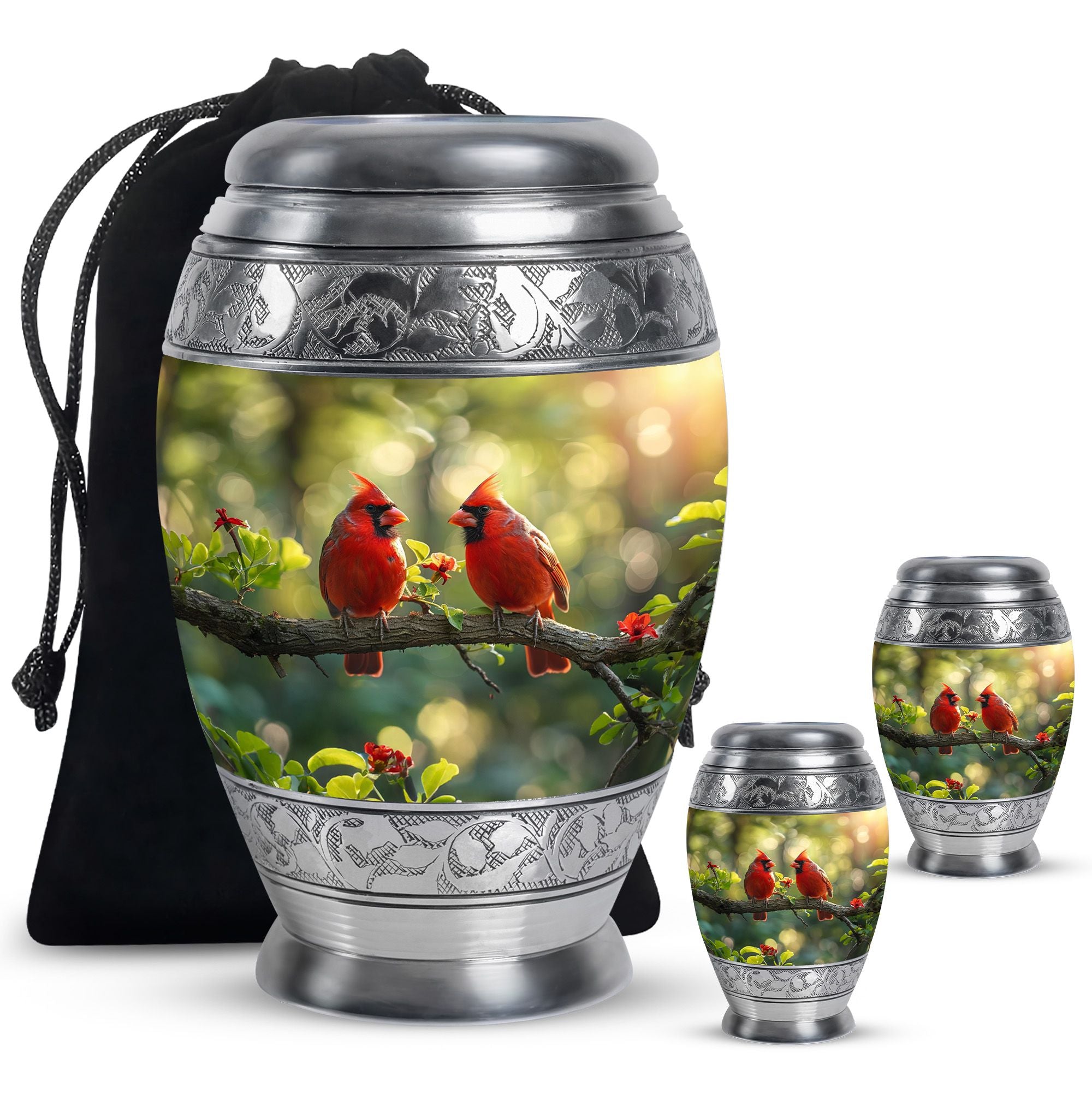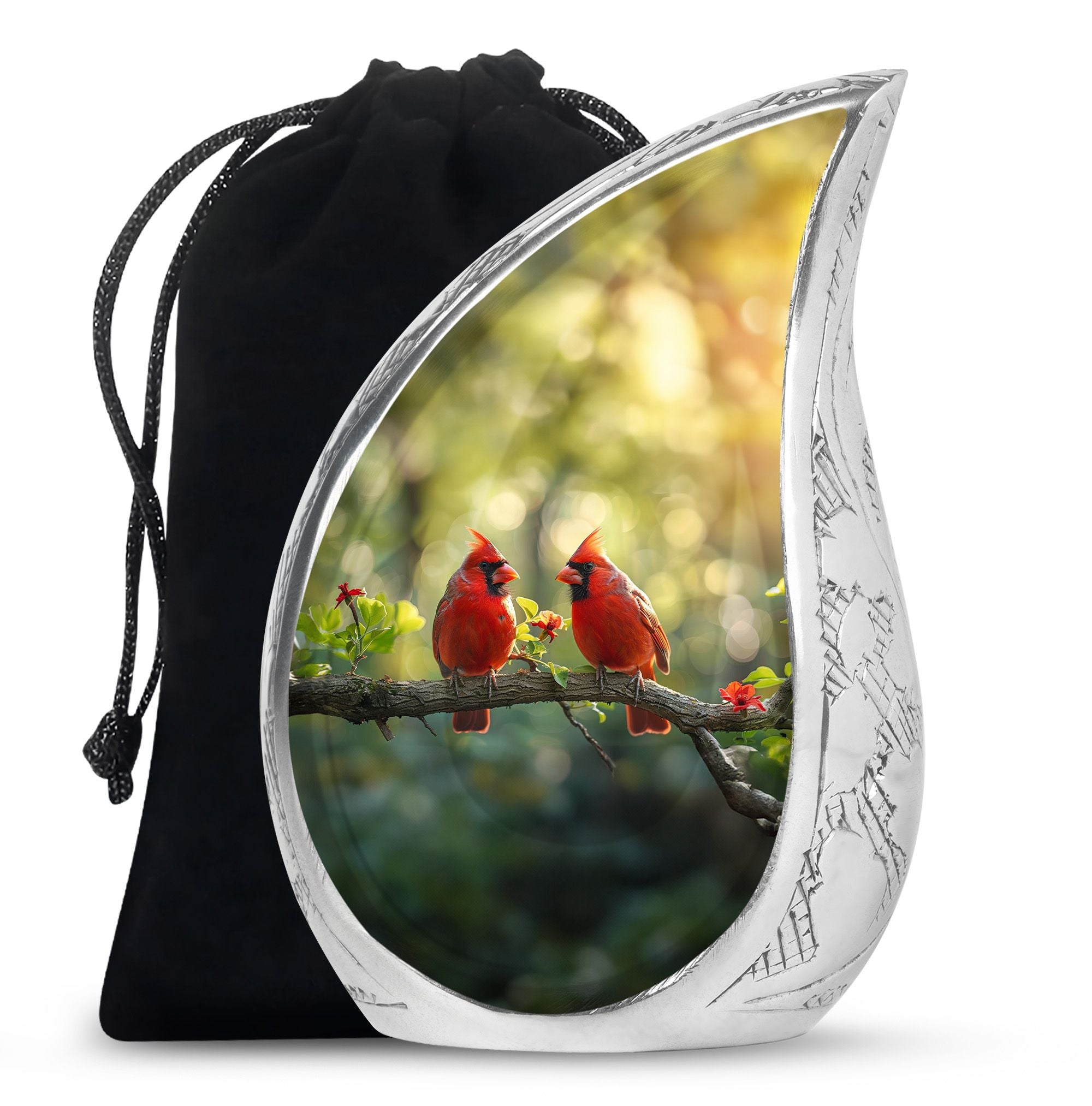 Beautifully crafted, this funeral urn features durable aluminum construction with a secure screw-top lid, ensuring ashes remain safely protected. The green background adorned with cardinal bird couples adds warmth and serenity. Whether used as an adult funeral urn, part of funeral urns for human ashes small, or treasured as keepsake funeral urns, this piece blends artistry with strength, providing a meaningful way to honor a life well-lived.