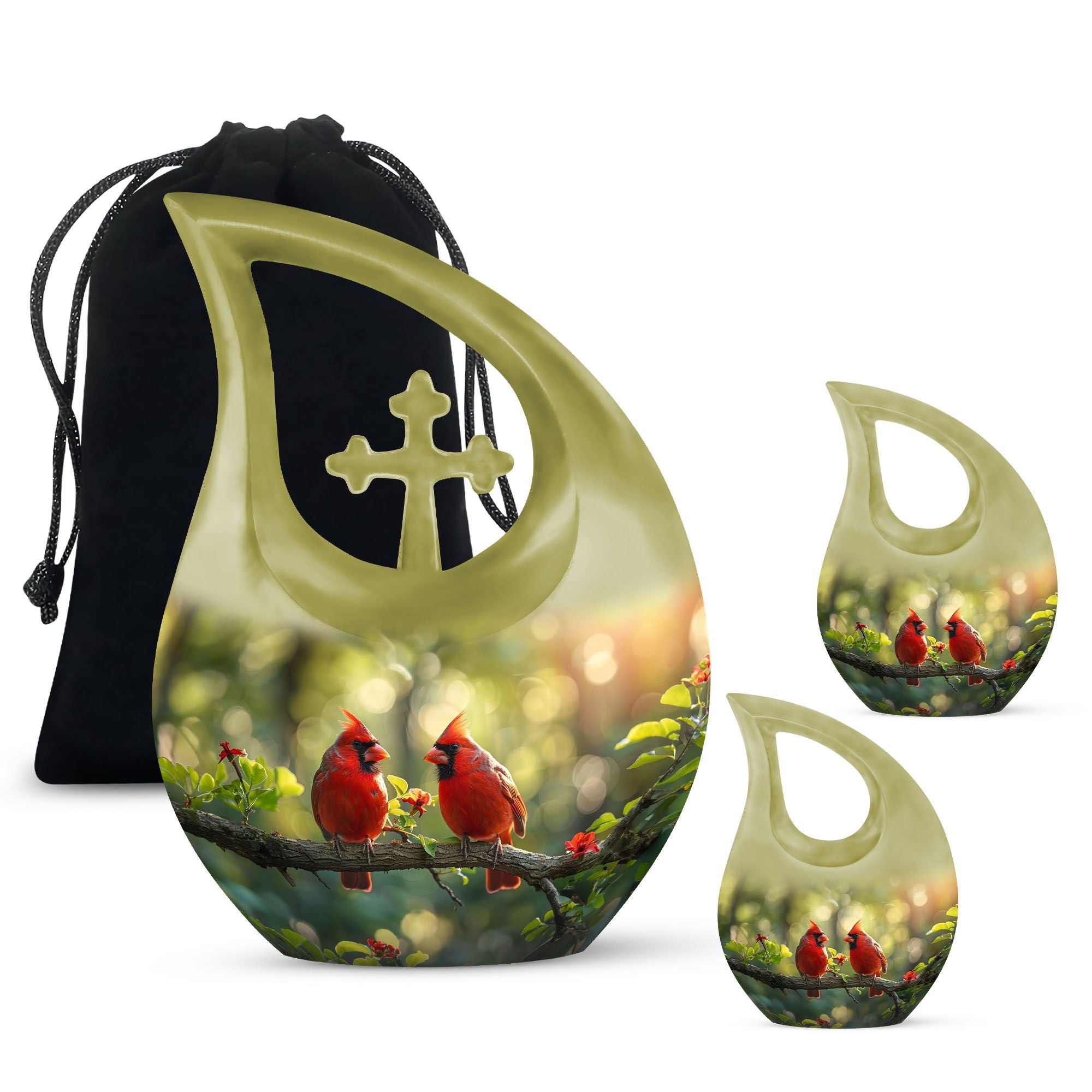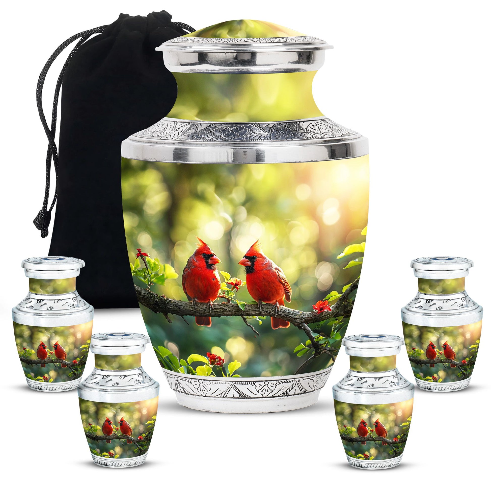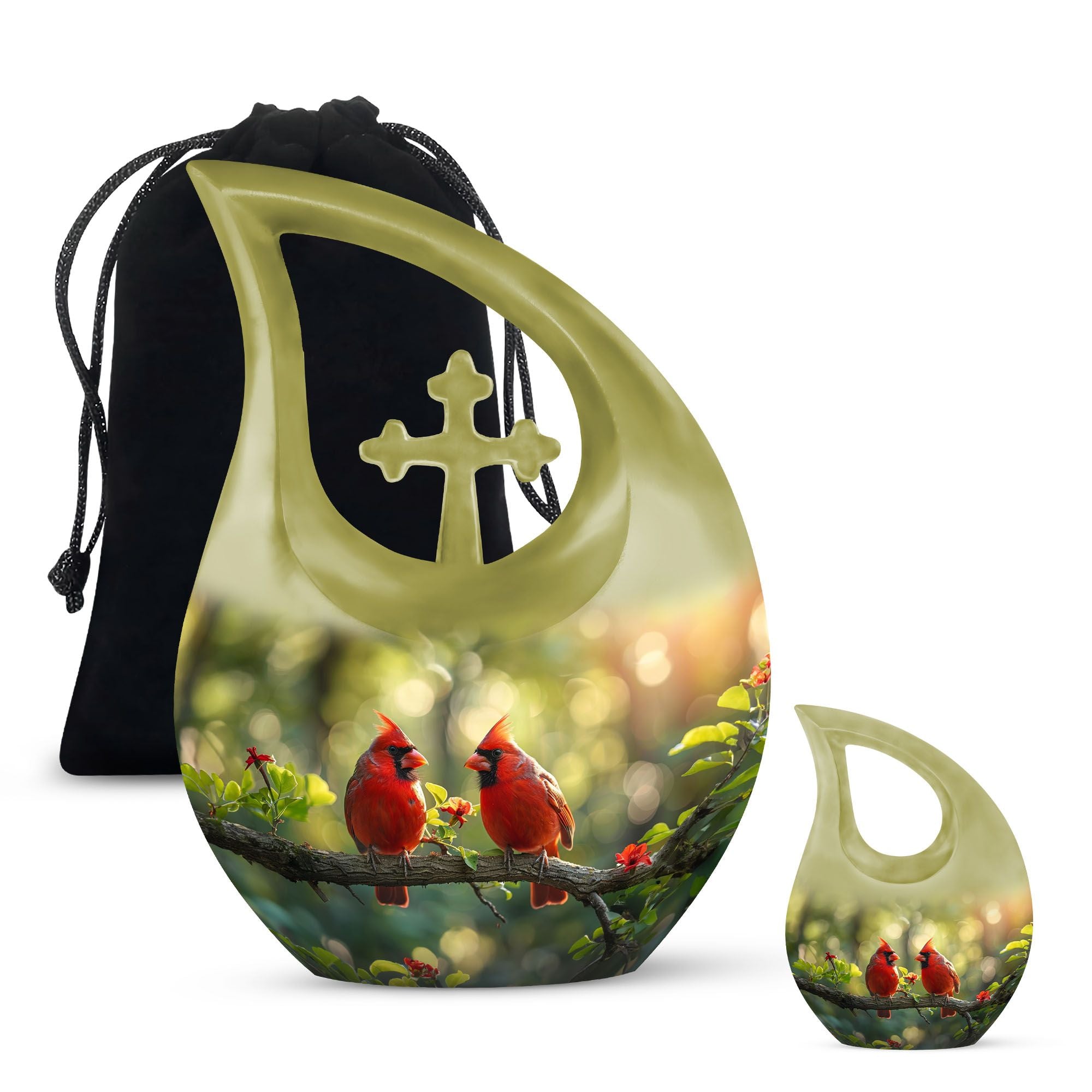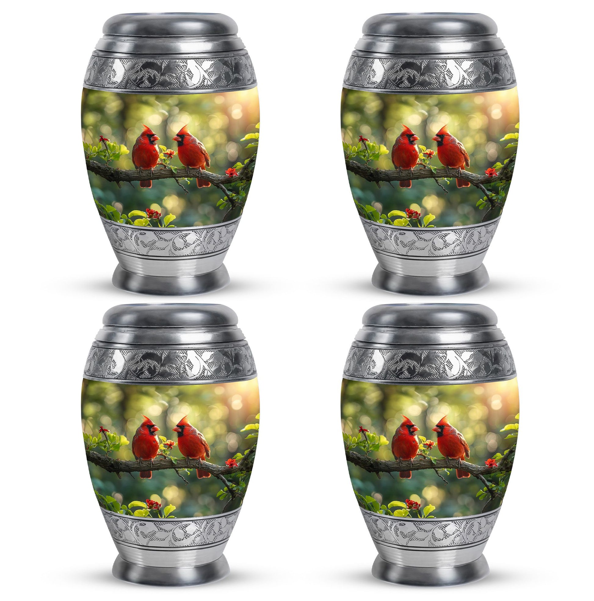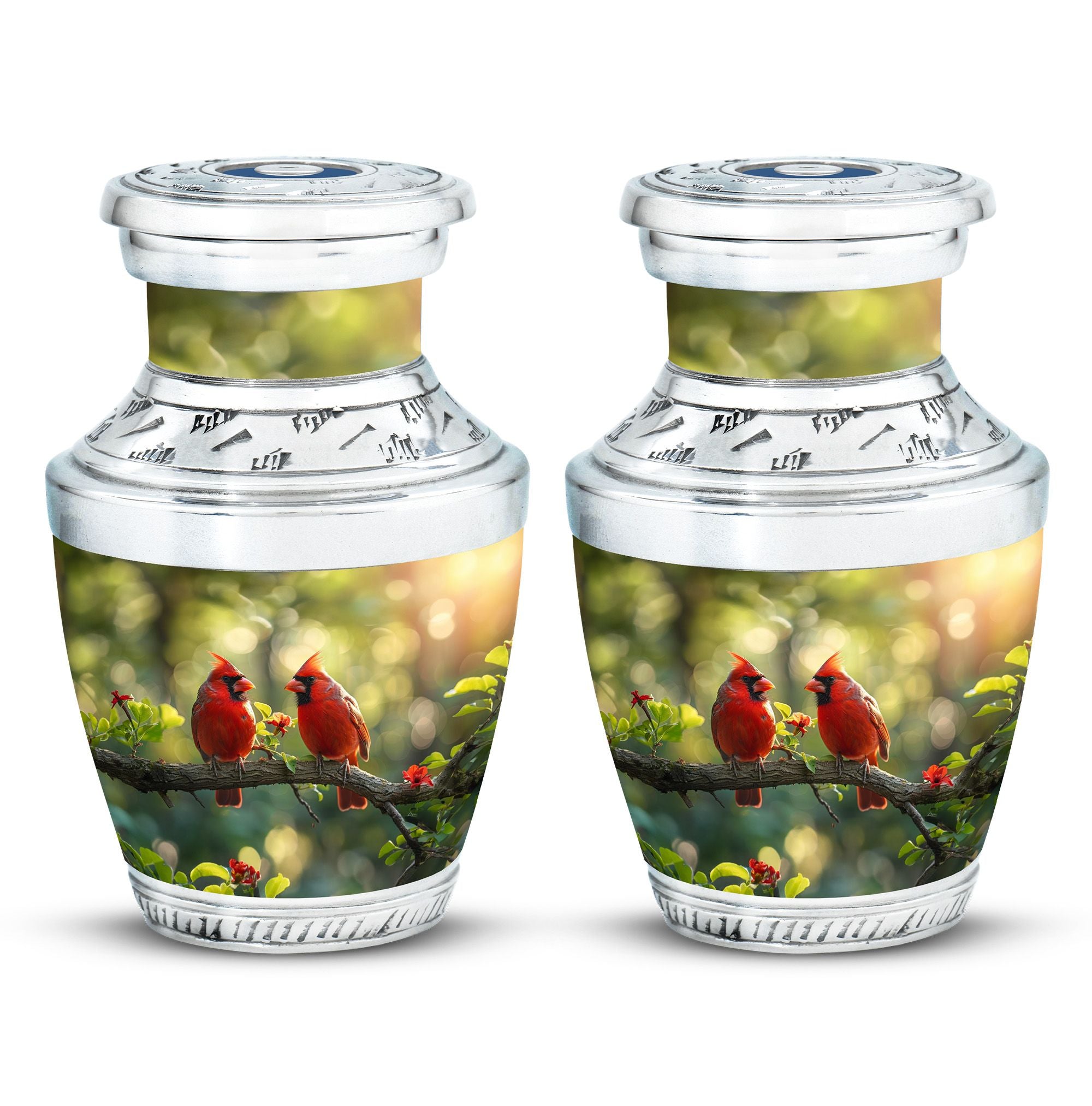 Beautifully crafted, this funeral urn features durable aluminum construction with a secure screw-top lid, ensuring ashes remain safely protected. The green background adorned with cardinal bird couples adds warmth and serenity. Whether used as an adult funeral urn, part of funeral urns for human ashes small, or treasured as keepsake funeral urns, this piece blends artistry with strength, providing a meaningful way to honor a life well-lived.