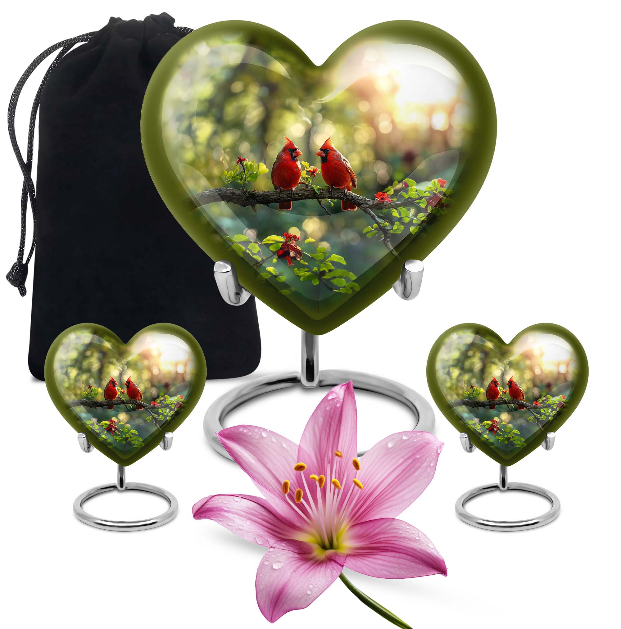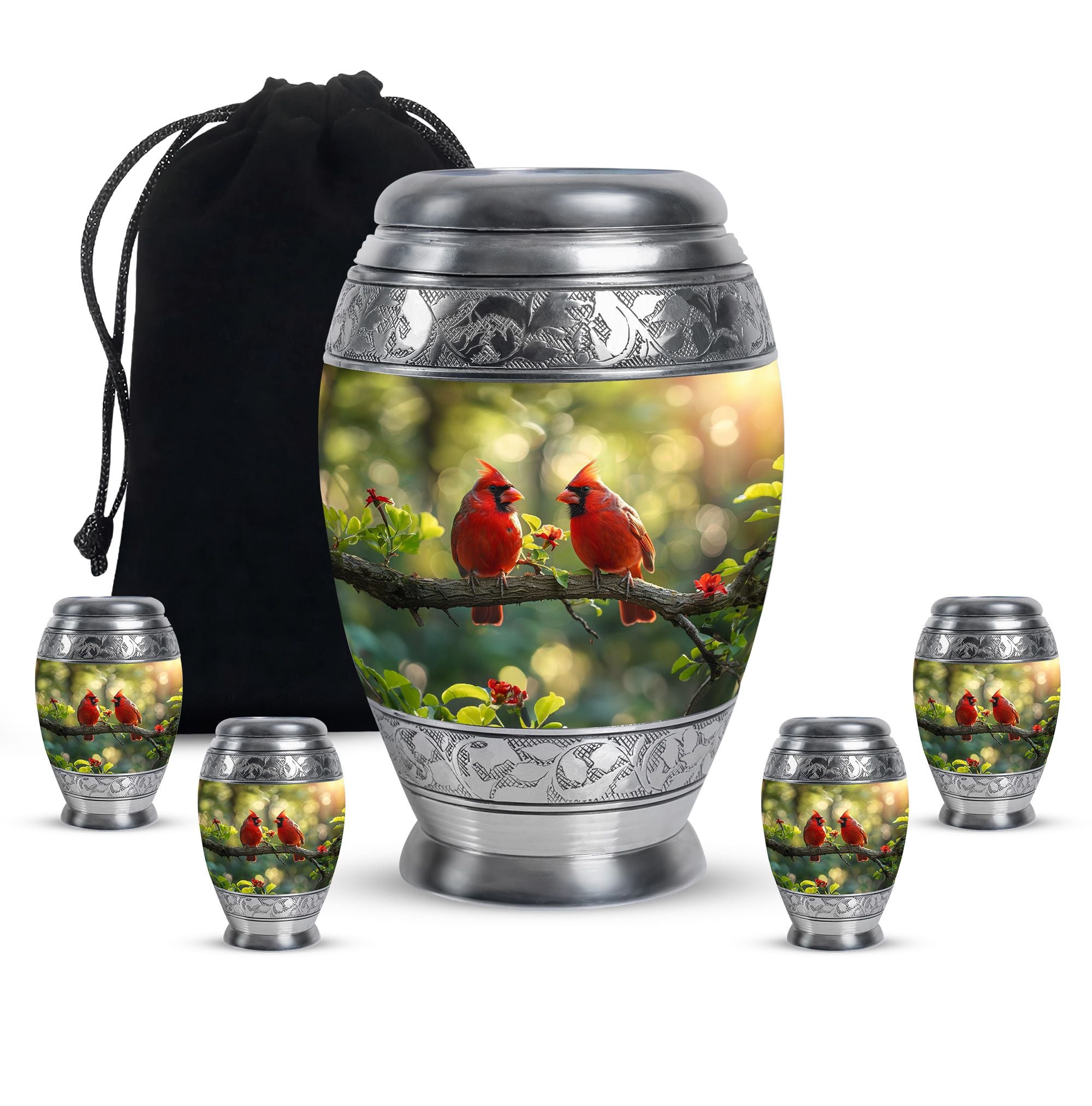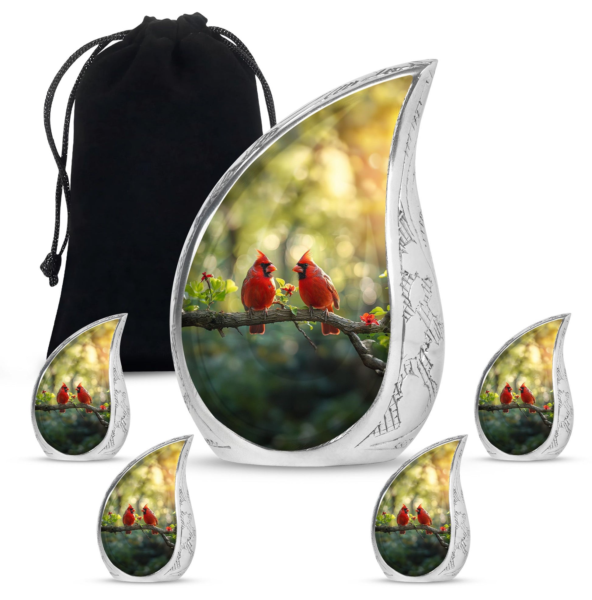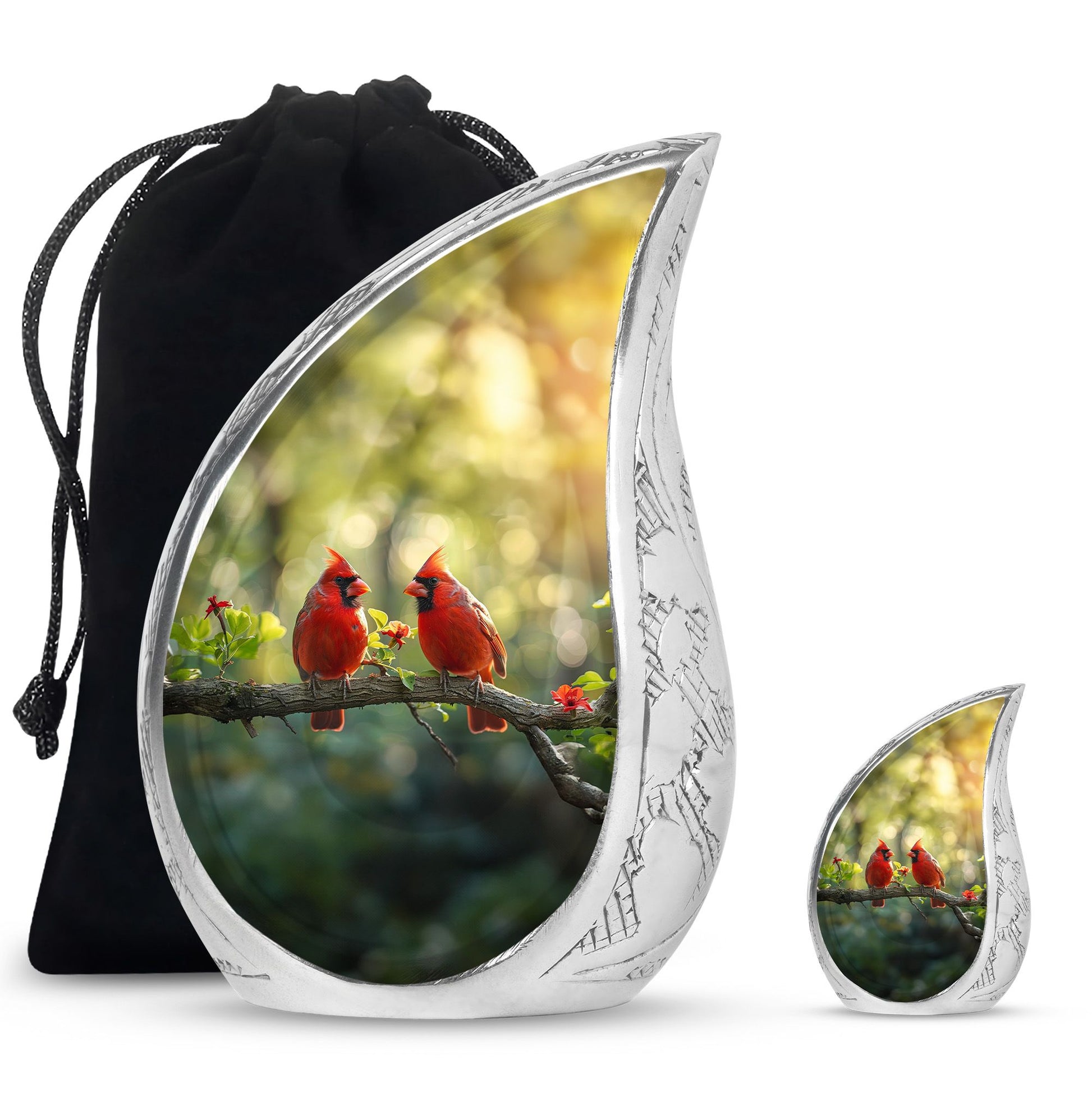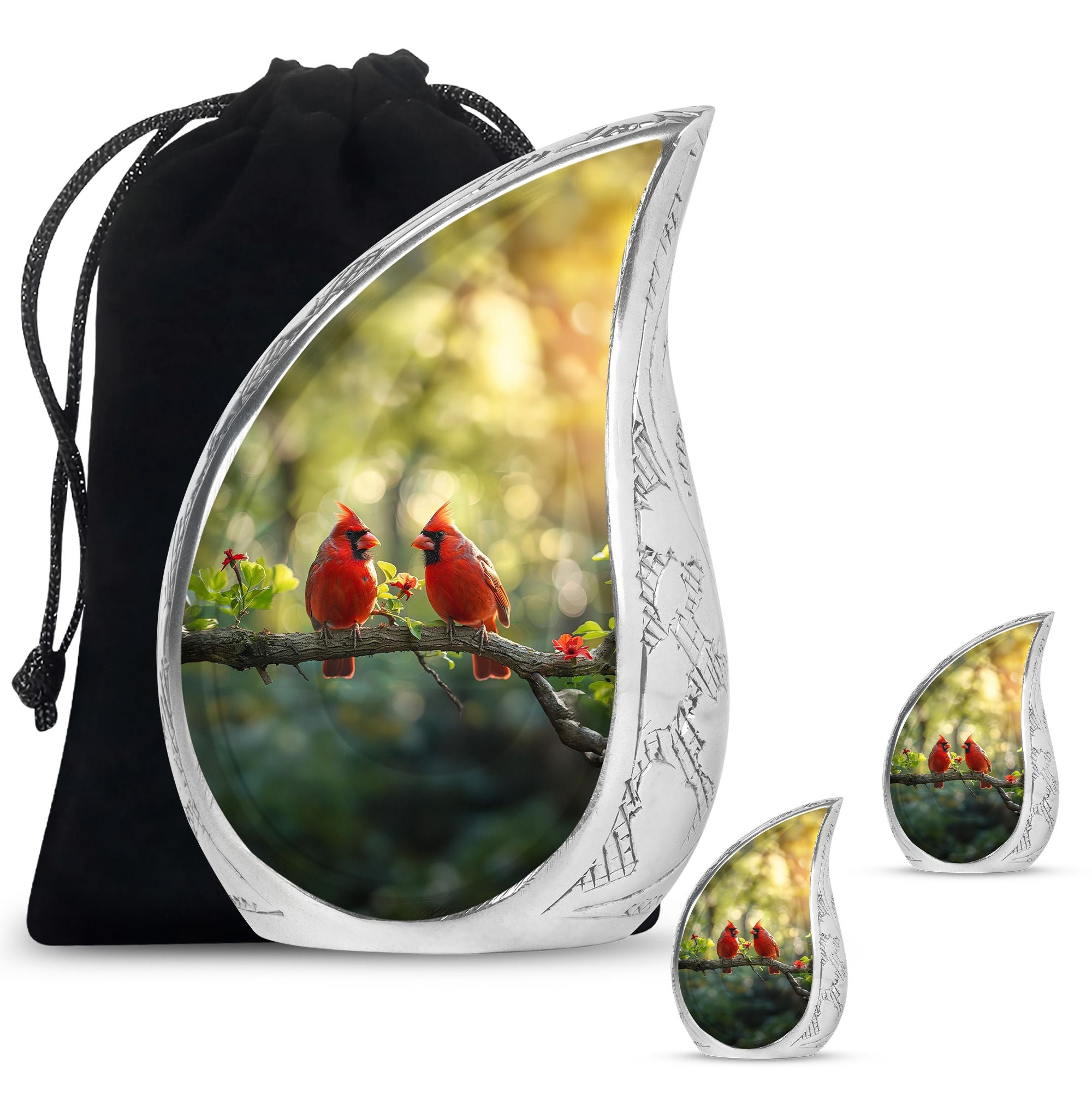 Beautifully crafted, this funeral urn features durable aluminum construction with a secure screw-top lid, ensuring ashes remain safely protected. The green background adorned with cardinal bird couples adds warmth and serenity. Whether used as an adult funeral urn, part of funeral urns for human ashes small, or treasured as keepsake funeral urns, this piece blends artistry with strength, providing a meaningful way to honor a life well-lived.