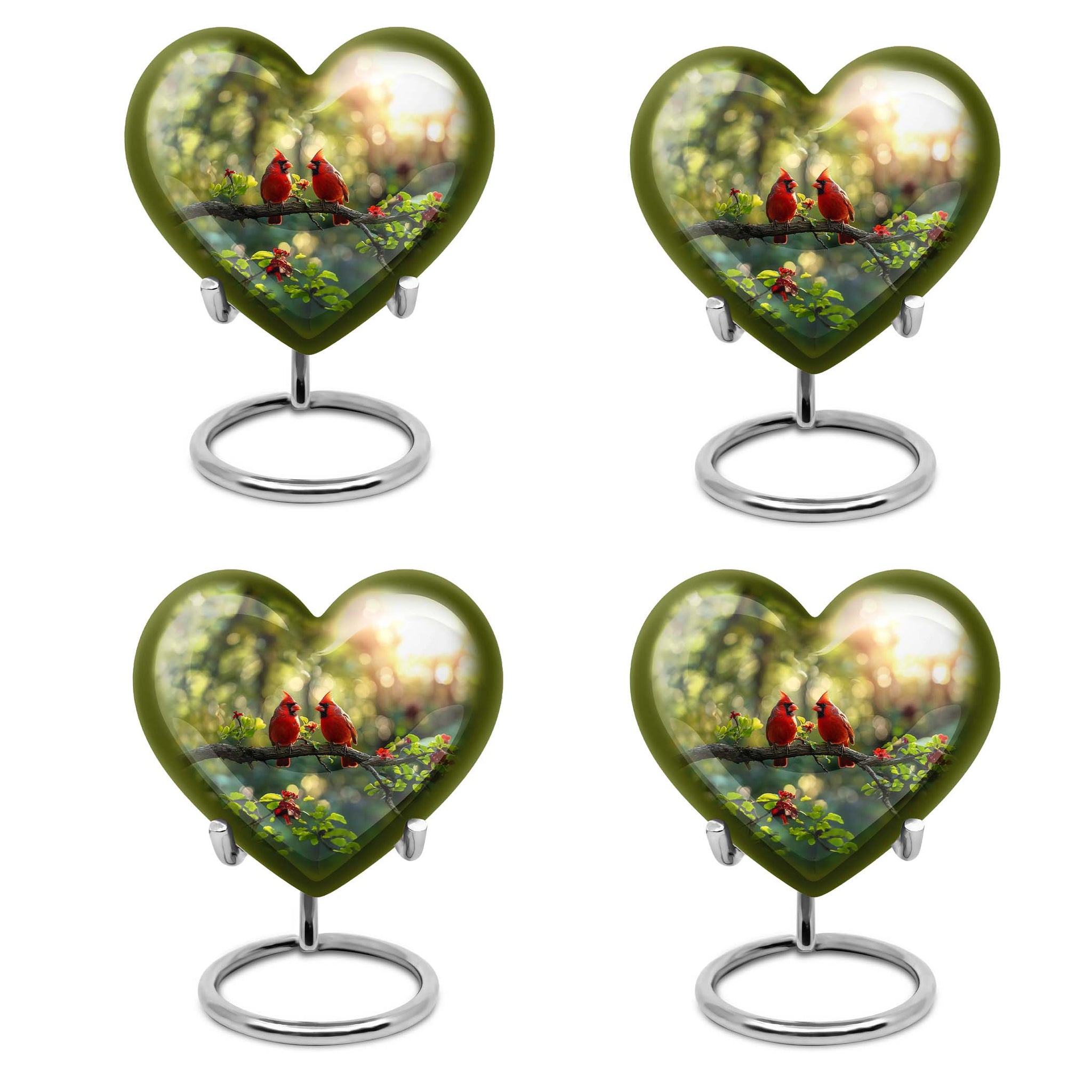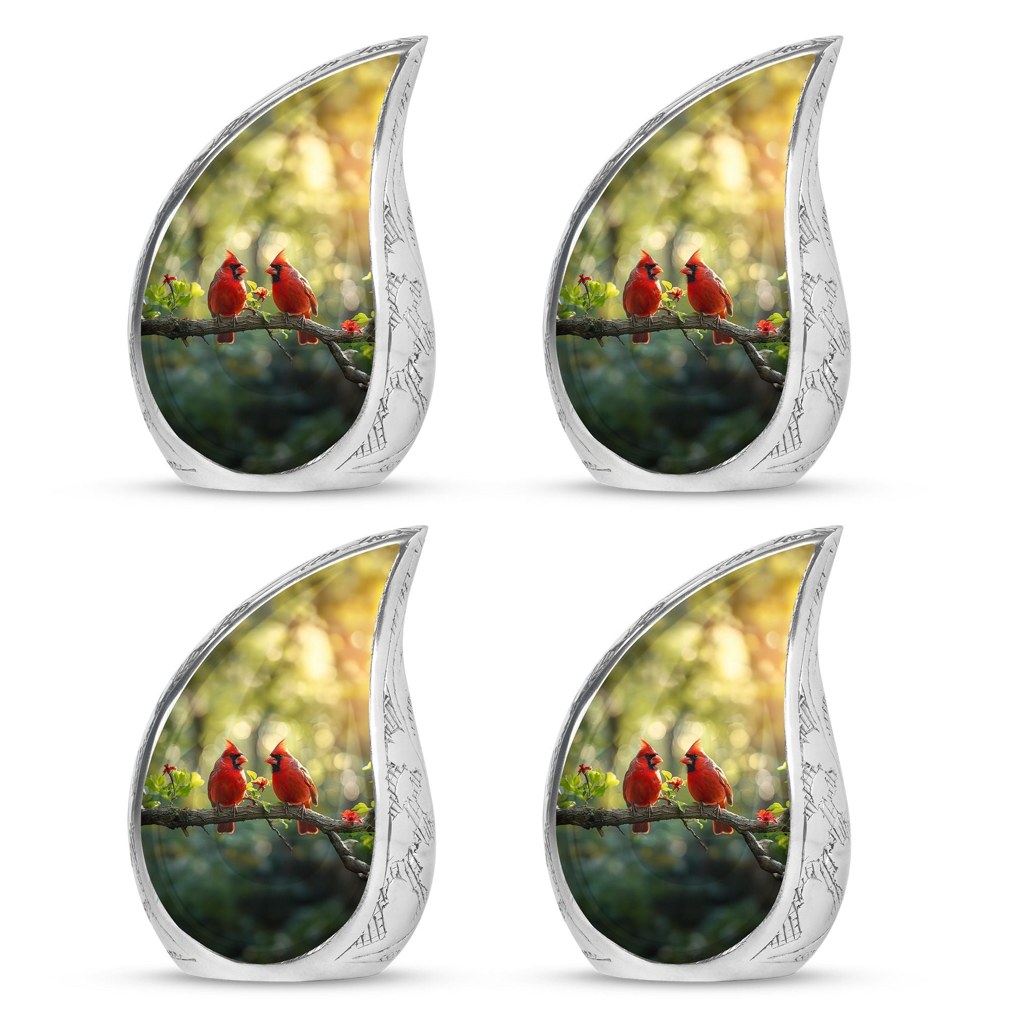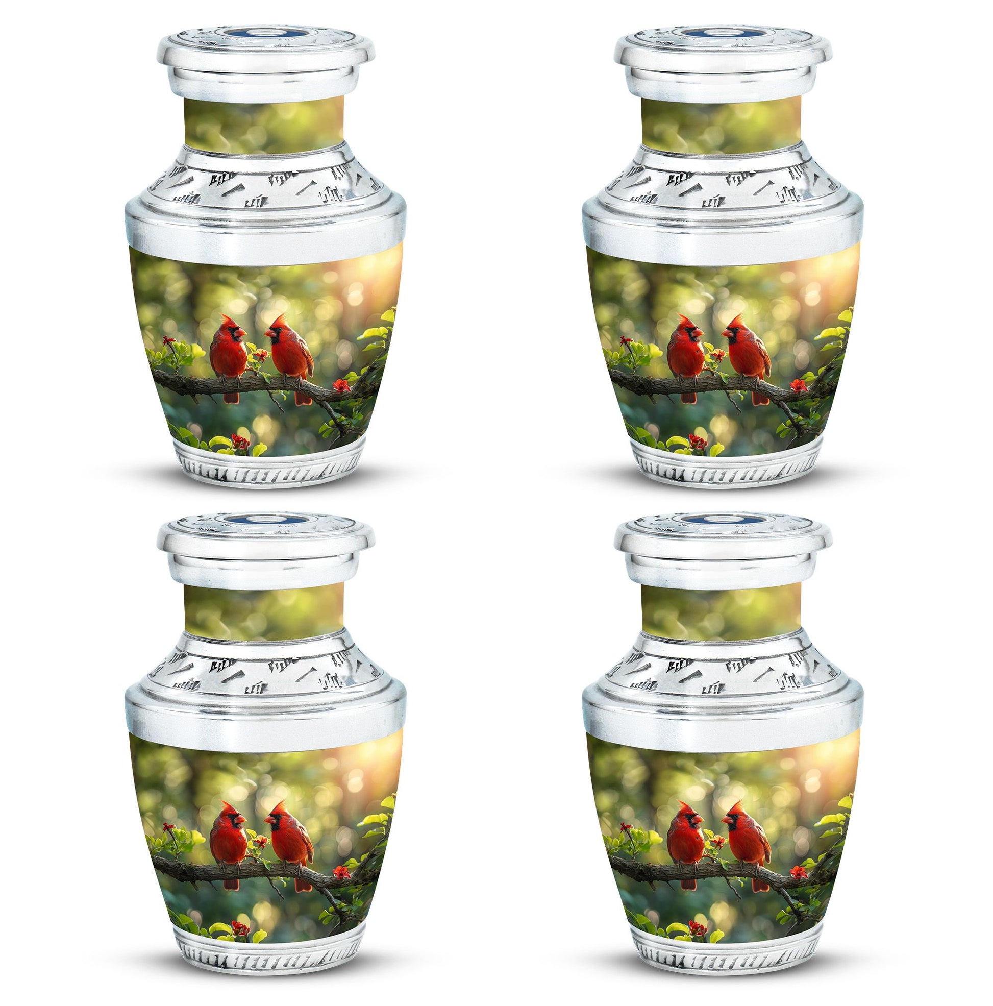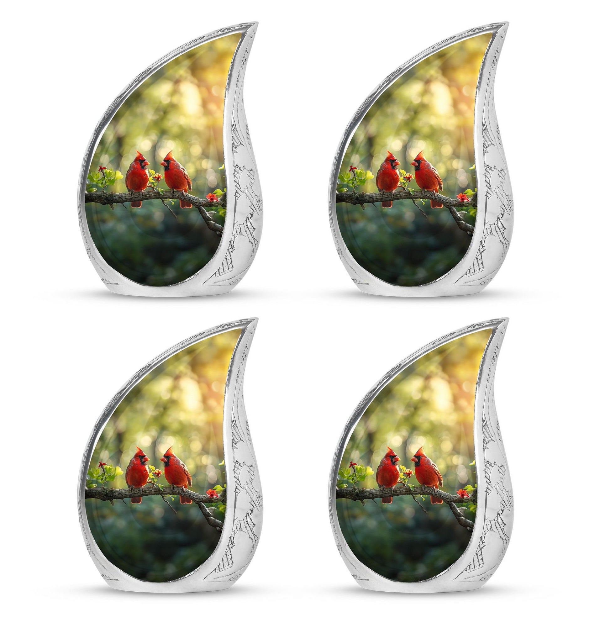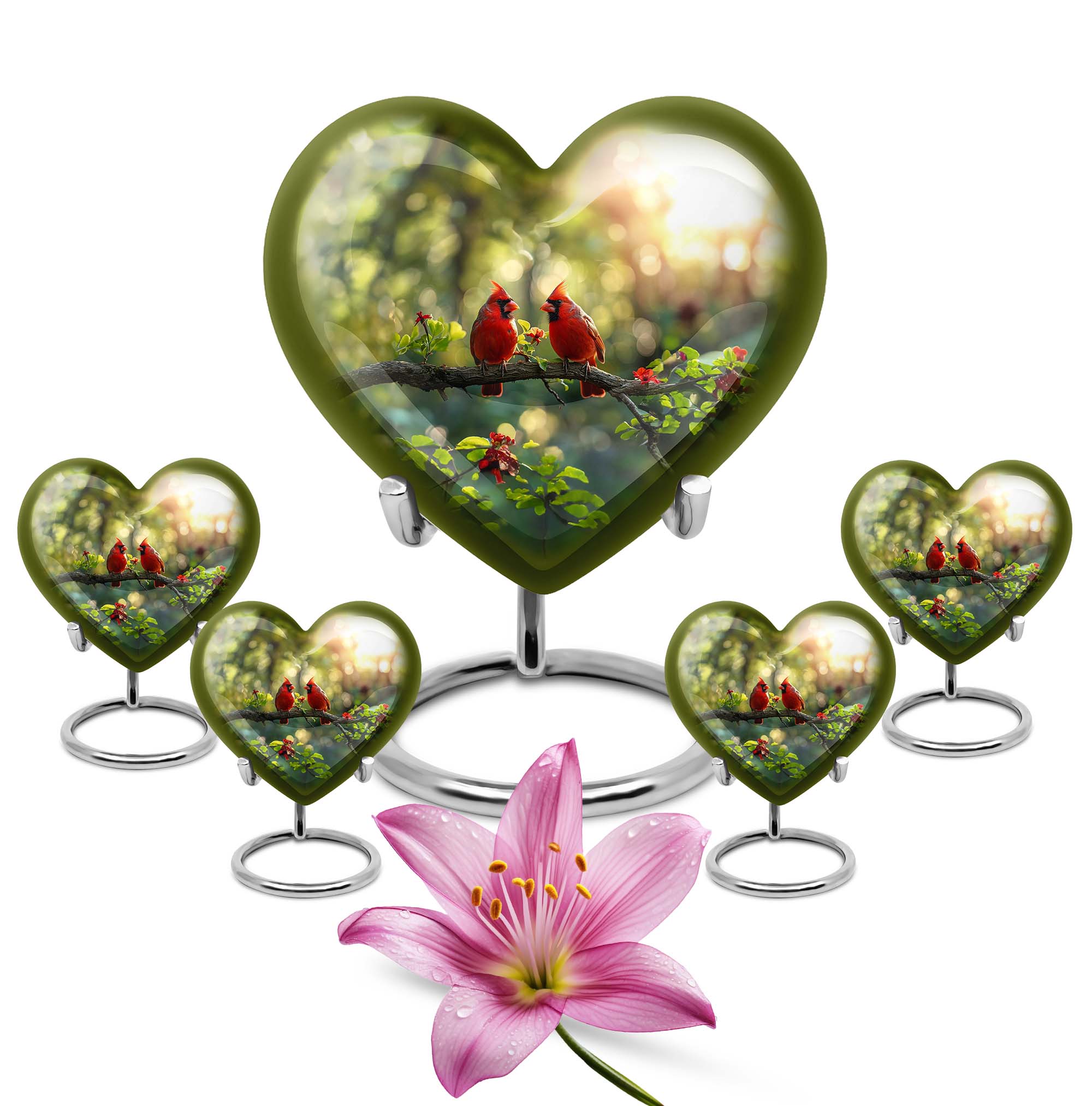 Beautifully crafted, this funeral urn features durable aluminum construction with a secure screw-top lid, ensuring ashes remain safely protected. The green background adorned with cardinal bird couples adds warmth and serenity. Whether used as an adult funeral urn, part of funeral urns for human ashes small, or treasured as keepsake funeral urns, this piece blends artistry with strength, providing a meaningful way to honor a life well-lived.