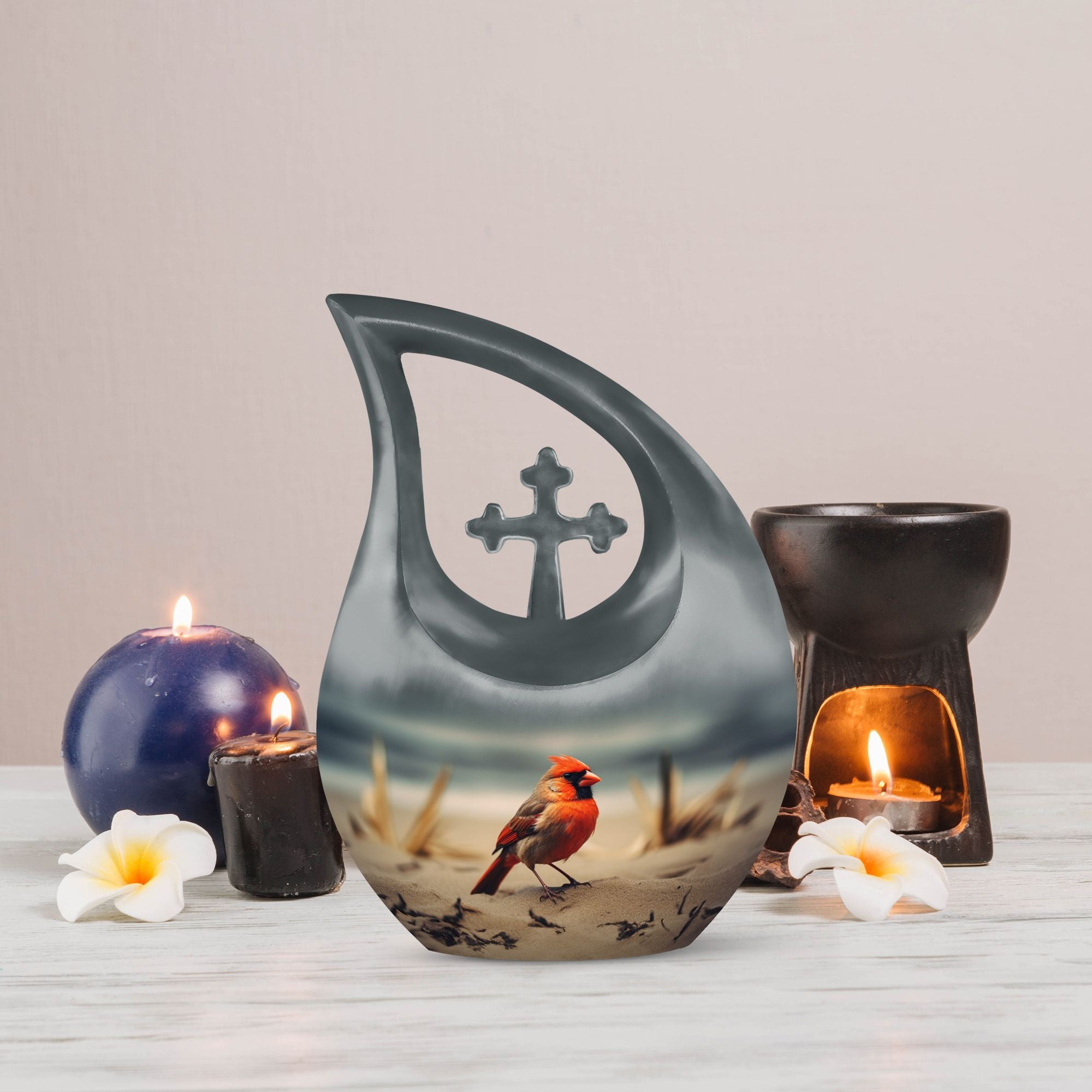 This Cardinal Bird Memorial Ashes Urn brings gentle comfort and serenity, blending symbolic cardinal artwork with a soothing beach-inspired design. It offers a heartfelt tribute for families seeking urns for adult female, urns for human ashes adult male, or a meaningful way to honor a beloved parent, partner, or friend.