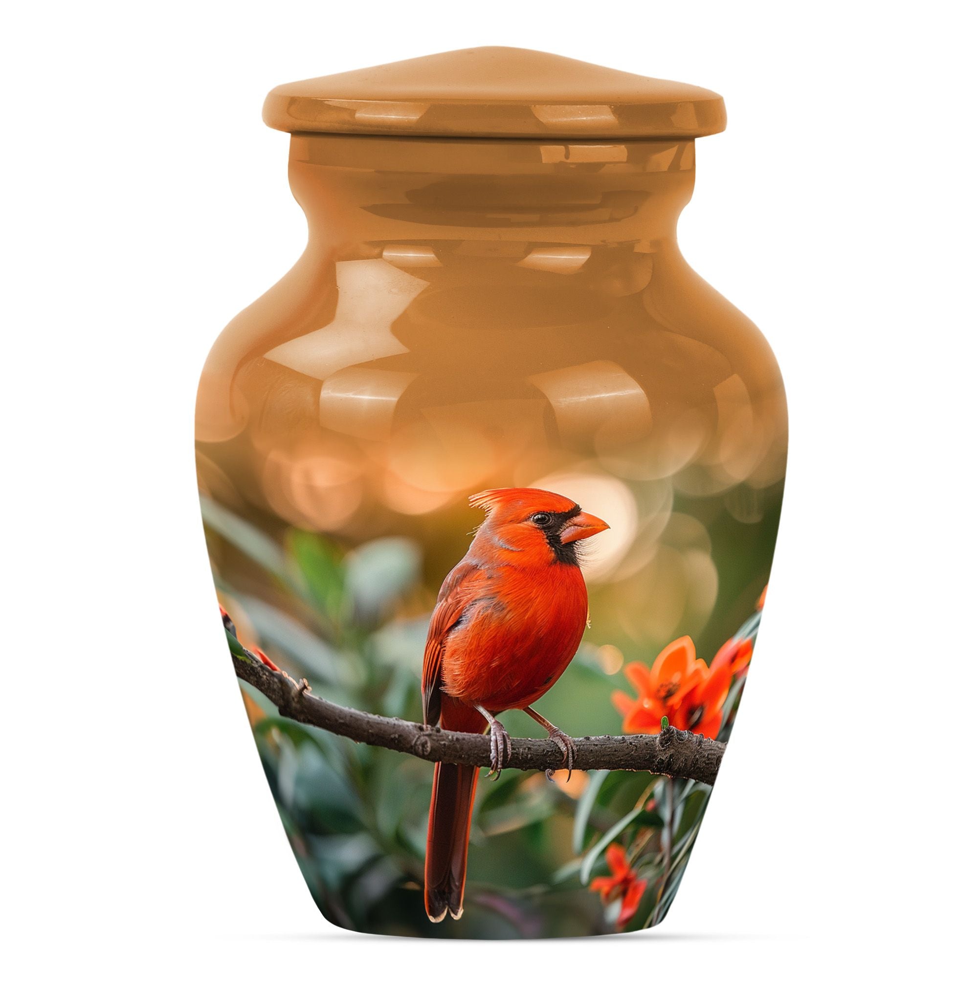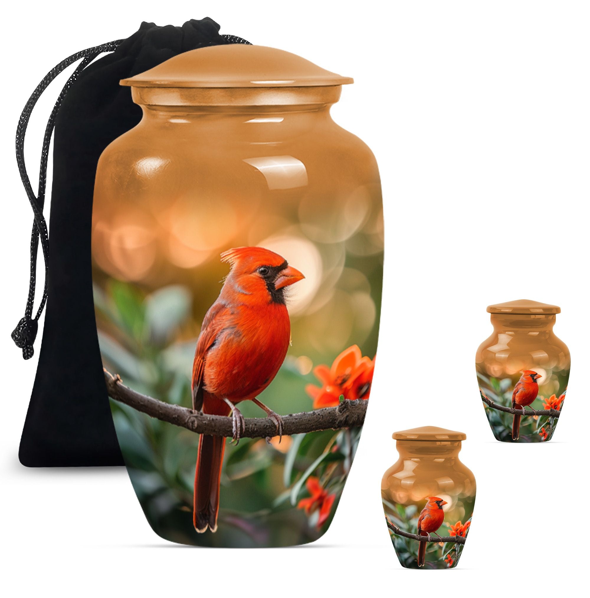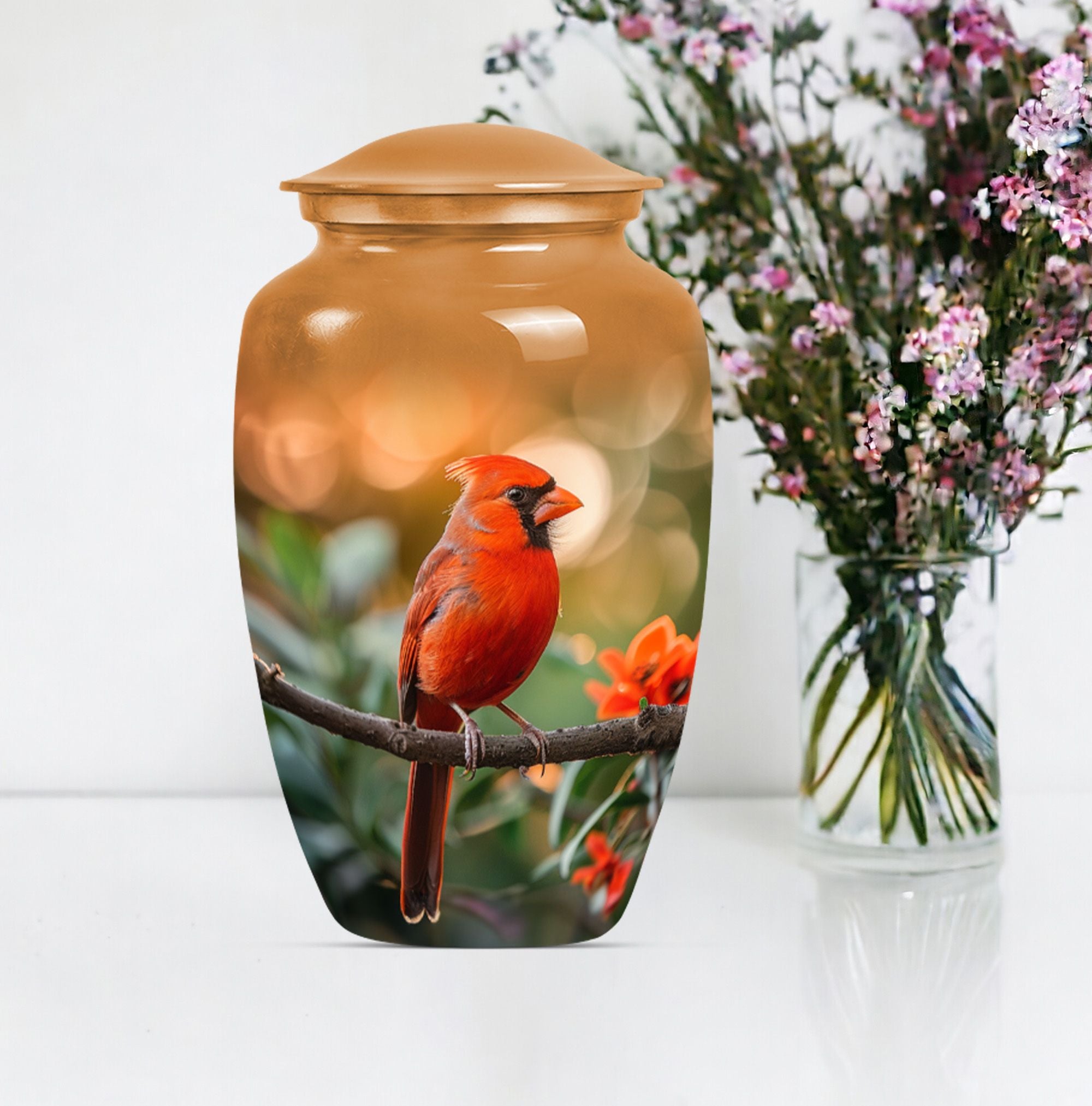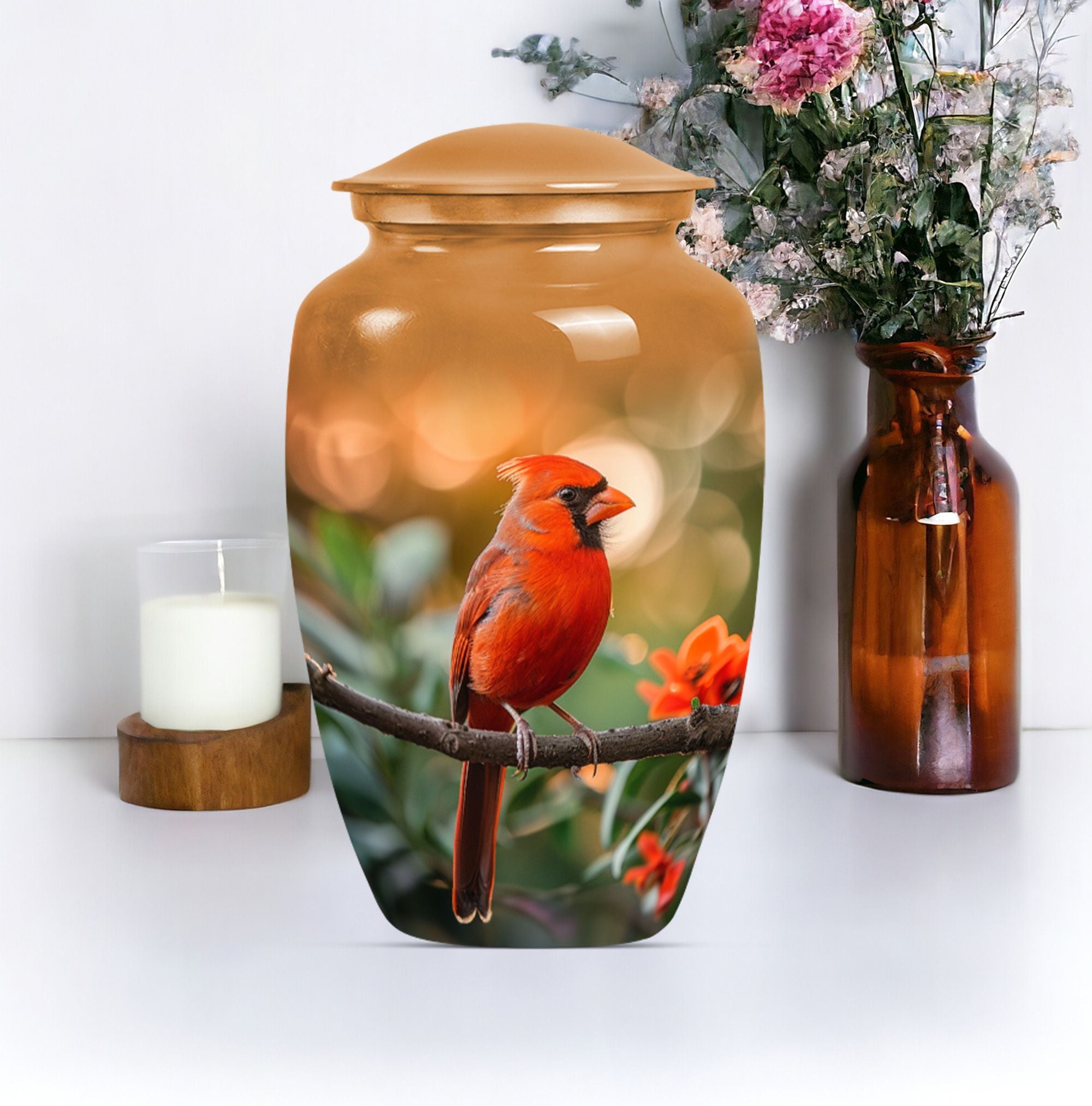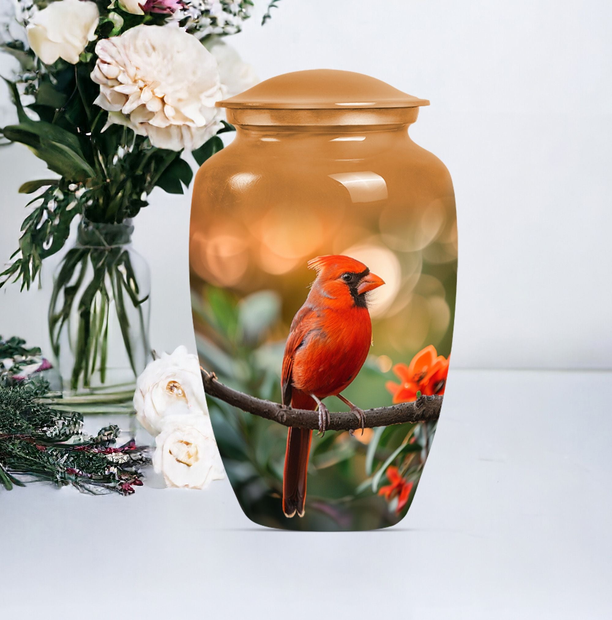 Celebrate and remember the life of your loved ones with our Cardinal bird urn, a dignified final resting place to honor their memory. This large urn is meticulously crafted from superior aluminium featuring a unique wolf howling theme that adds a touch of solemnity and tranquility. Measuring 10 inches in height and weighing a solid 3.3 pounds, this memorial urn can hold up to 200 cubic inches of ashes. For your convenience, this urn comes with a velvet pouch, providing a respectful containment for the ashes. Further, you can personalize it with engraved names, making it a one-of-a-kind tribute to your loved one. This memorial adult urn is perfect for burial in ground or can simply be placed on your mantle as a constant reminder of the cherished moments. It seamlessly marries functionality and sentiment, ensuring your loved one's memory stands the test of time. Please note: this product doesn't feature any specific design.