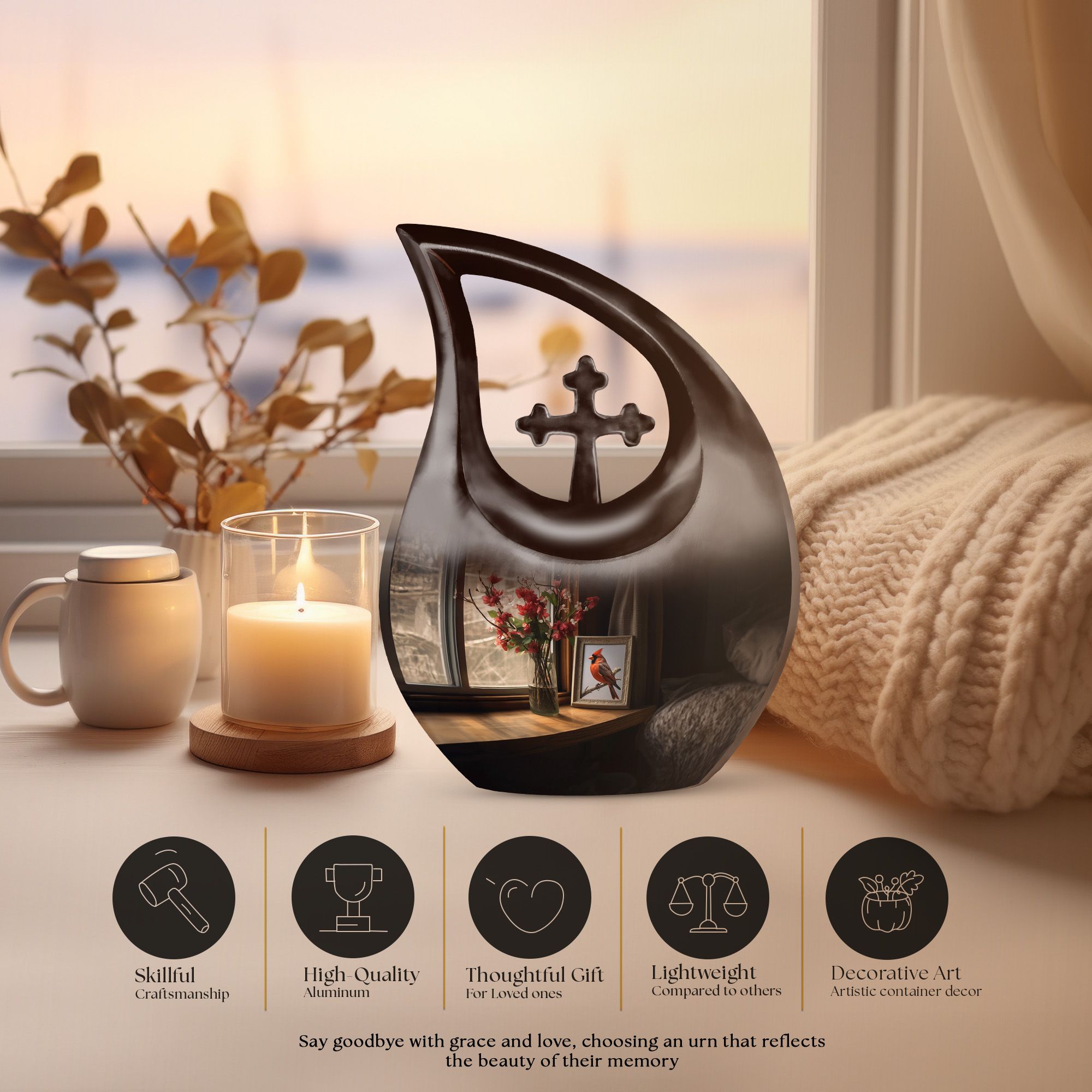 Crafted from premium aluminum, this urn showcases a serene brown finish complemented by a delicate cardinal motif, representing guidance and spiritual presence. Its compact size makes it ideal for families needing small urns for human ashes adult male, urns for adult female mom, or urns for human ashes adult female small size. The secure screw-top lid keeps ashes safe, while its refined shape offers a timeless look suitable for display or remembrance ceremonies. Whether chosen as an urn for ashes adult male dad or for honoring a cherished mother, its high-quality craftsmanship ensures lasting strength and beauty.