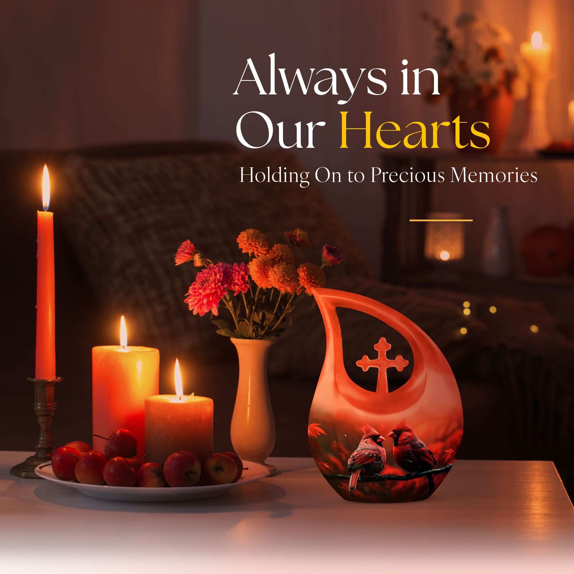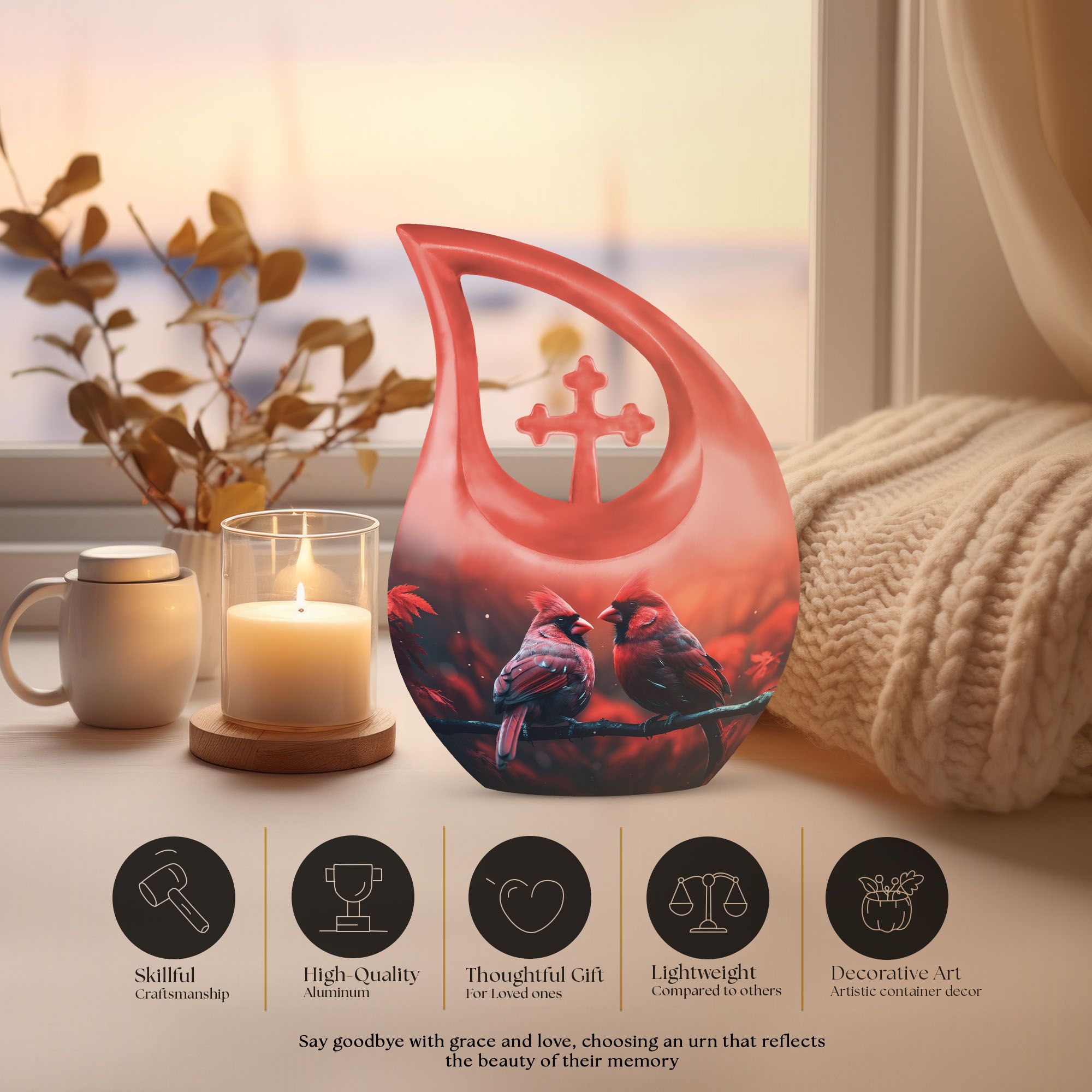 Celebrate everlasting togetherness with the Cardinal Bird Pairs Memorial Urn, a beautifully designed romantic red urn for lovers. Crafted to represent devotion and unity, this urn features an elegant pair of cardinals—symbols of enduring love and faith.