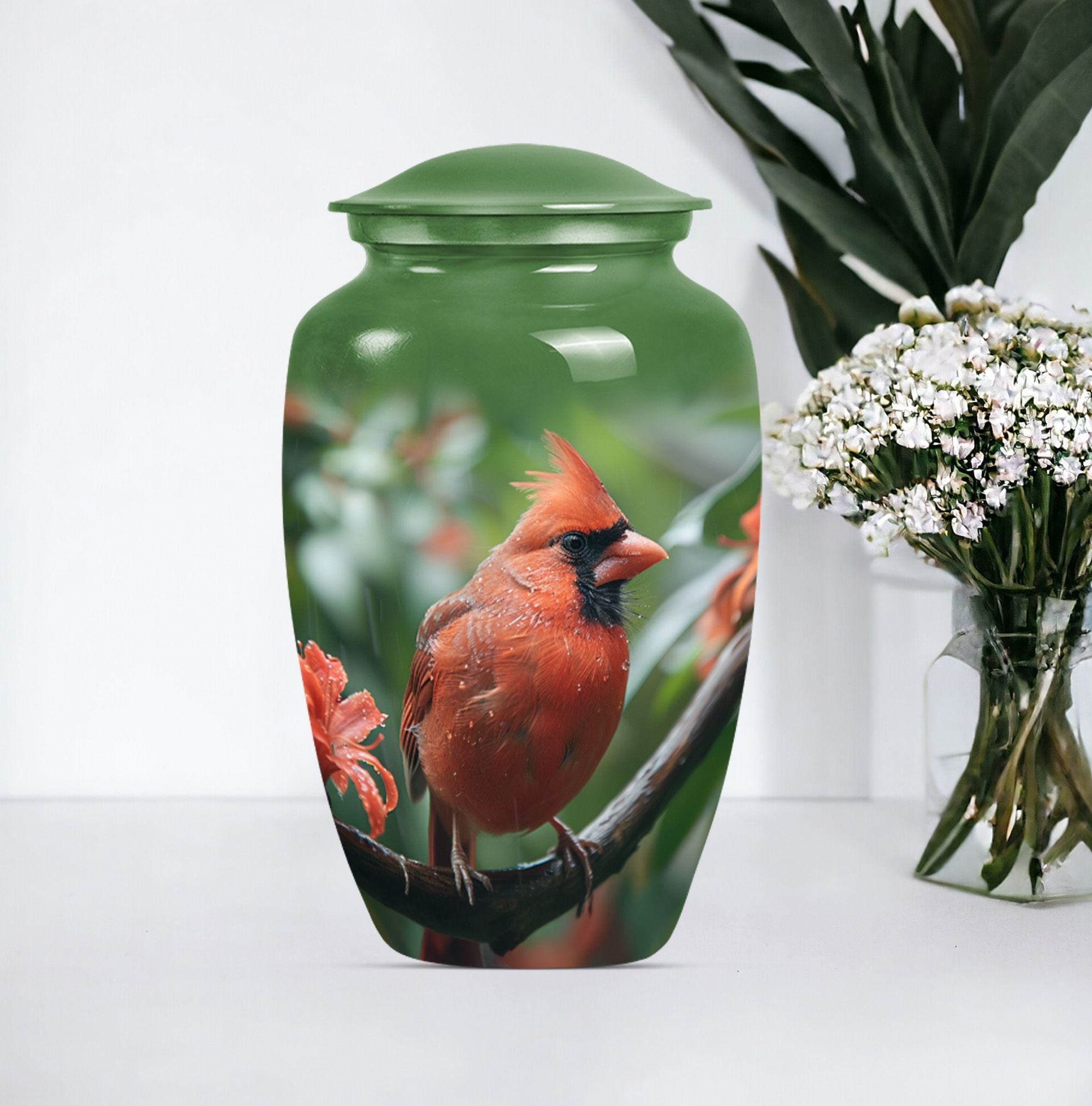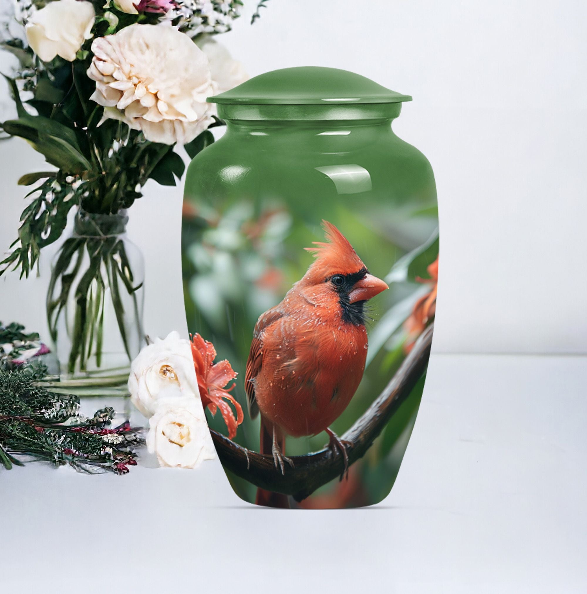 Enhance your memorial service with our gently crafted 'Cardinal Bird Urn', perfectly sized at 10 inches for an intentional and meaningful display. These funeral urns bear a touch of eternal tranquility while ensuring the safe containment of ashes, provided with a subtle velvet pouch. Despite its classic, sophisticated design, it brings an air of serenity to your ceremony. Cast from robust and durable aluminium, our respectful cremation urn weighs a solid 3.3 pounds, symbolizing the everlasting bond you keep with the unforgettable. The notable capacity of 200 cubic inches ensures space for adult human ashes, offering a fitting tribute to your loved ones. Perfectly for those searching for 'cremation urns for dad' or 'burial urns for cremation ashes'. Add a personal touch with our customization option: engrave names to bring a unique, personal feel to this truly essential memorial item. Our 'Wolf Howling' theme presents a design that honours the strength and resilience of your loved one.
