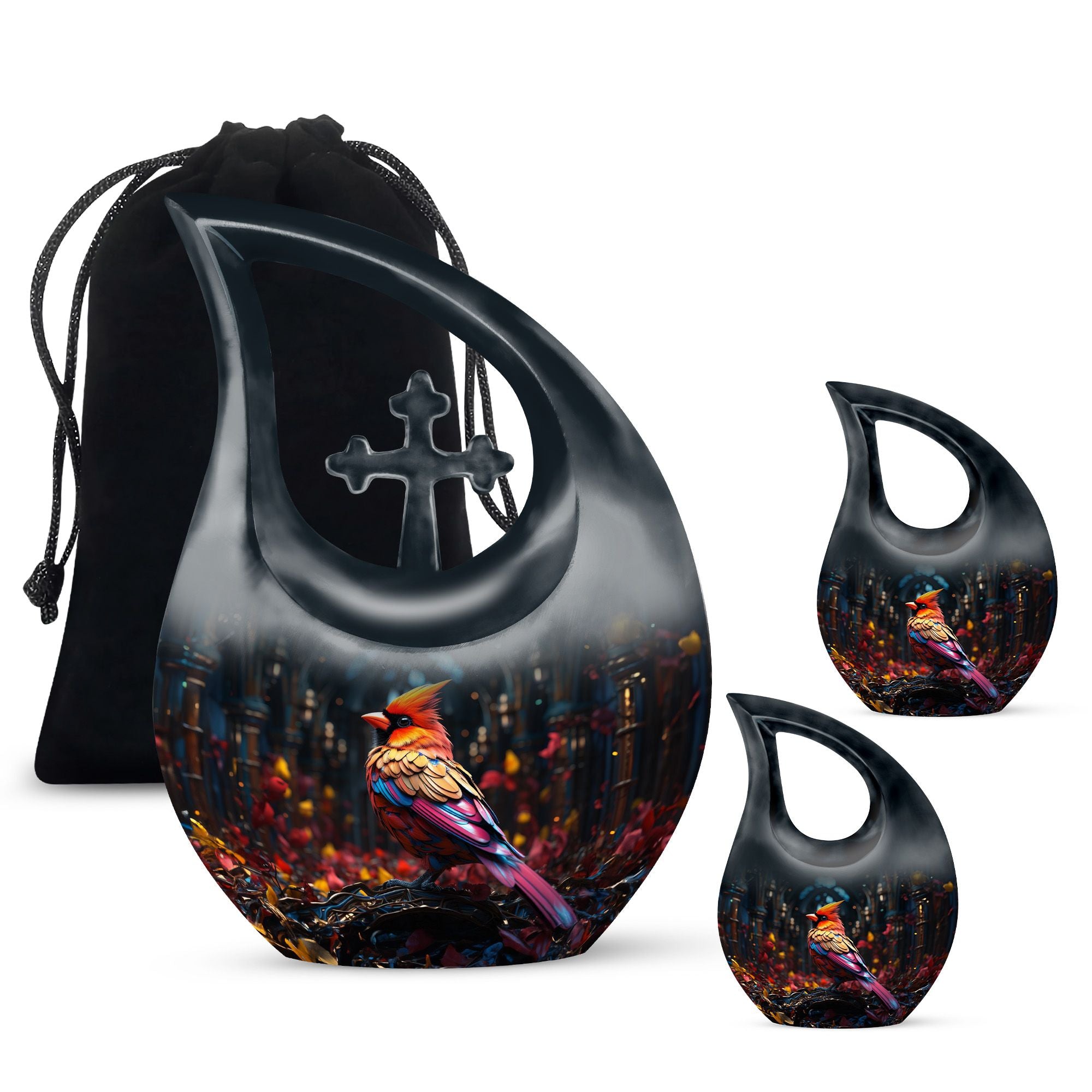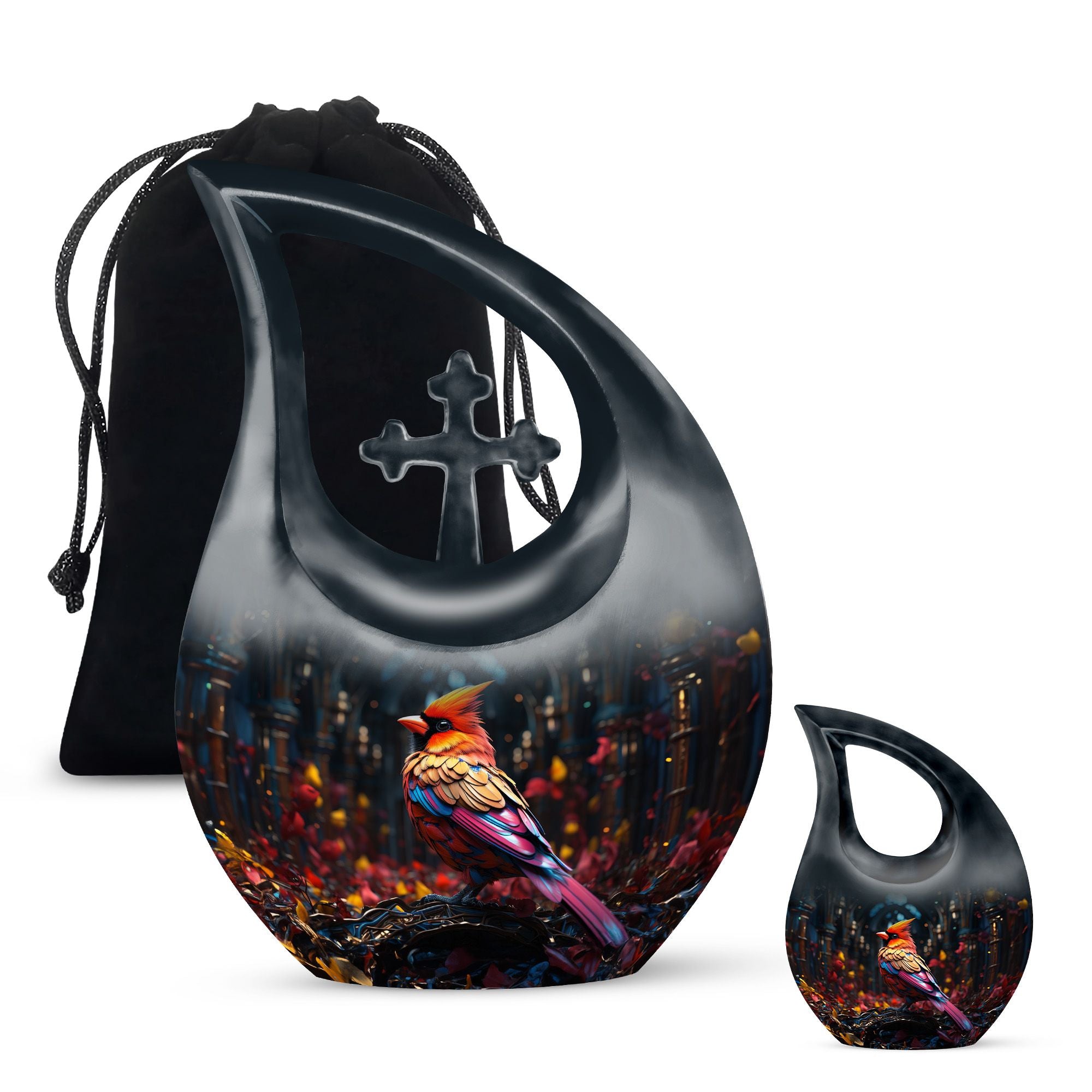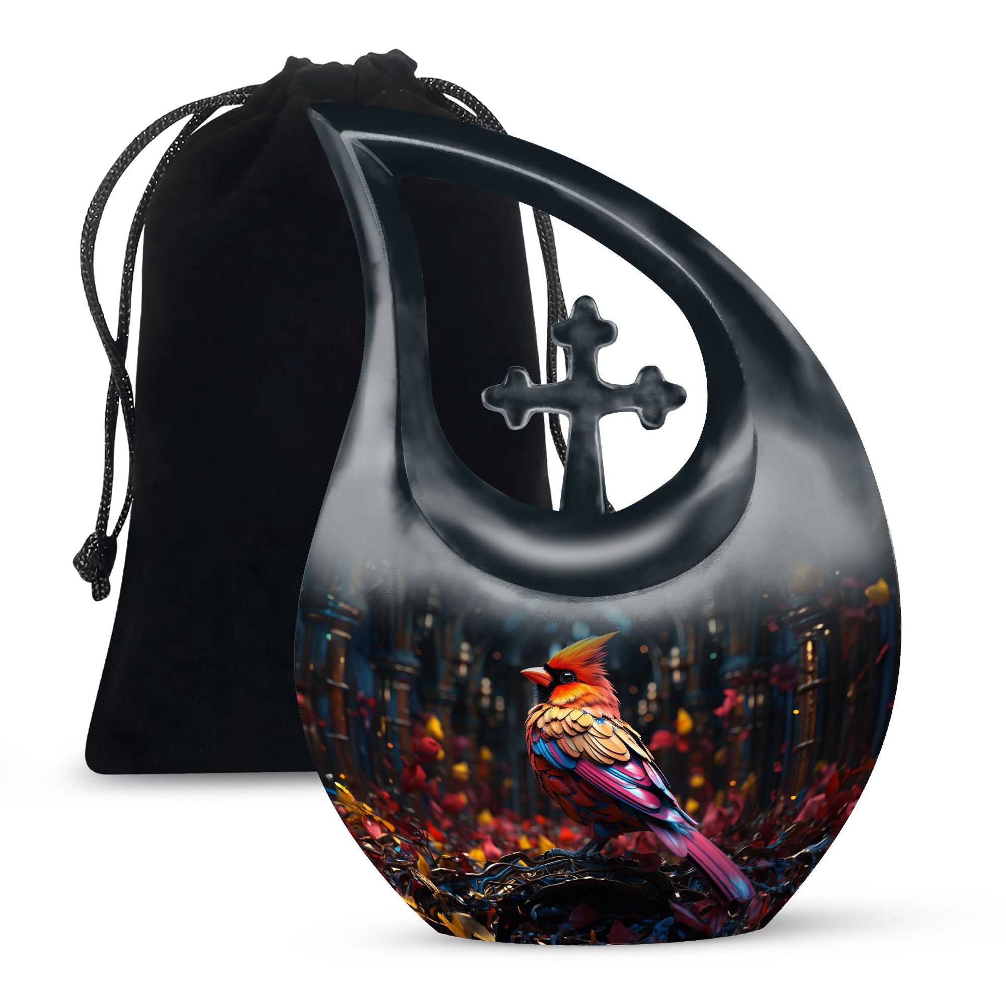 Honor your loved one's memory with our uniquely crafted Cardinal Bird Urn, an epitome of elegance and grace. Made from high-quality aluminium, this Large Urn, measuring at a height of 10 inches, ensures strong durability. This cremation box carries an impressive weight of 3.3 pounds, attesting its robust structure. It features a serene Cardinal Bird theme, making it not just another grey box, but a divine piece of art. Our urn is functional and aesthetically soothing, with a capacity to contain 200 cubic inches of ashes. Along with this sturdy urn, we include a velvet pouch, ensuring a sacred containment of the ashes. For a more personal touch, you have the option to customize this beautiful piece with engraved names. Let this Cardinal Bird Urn be a profound, yet peaceful way for the burial service. (*Please note, the Cross Drop design is not part of this item specifications). Key phrases for search: memorial urns, Purple Urns, Small Urns For Ashes, Urns For Ashes, Mini Urns For Ashes.