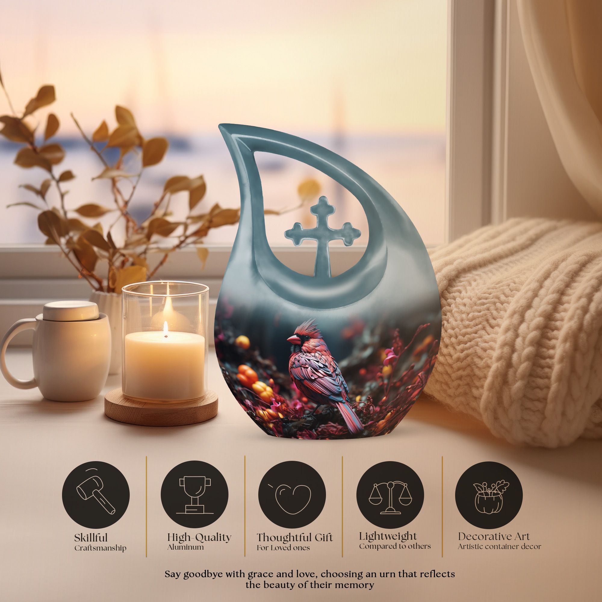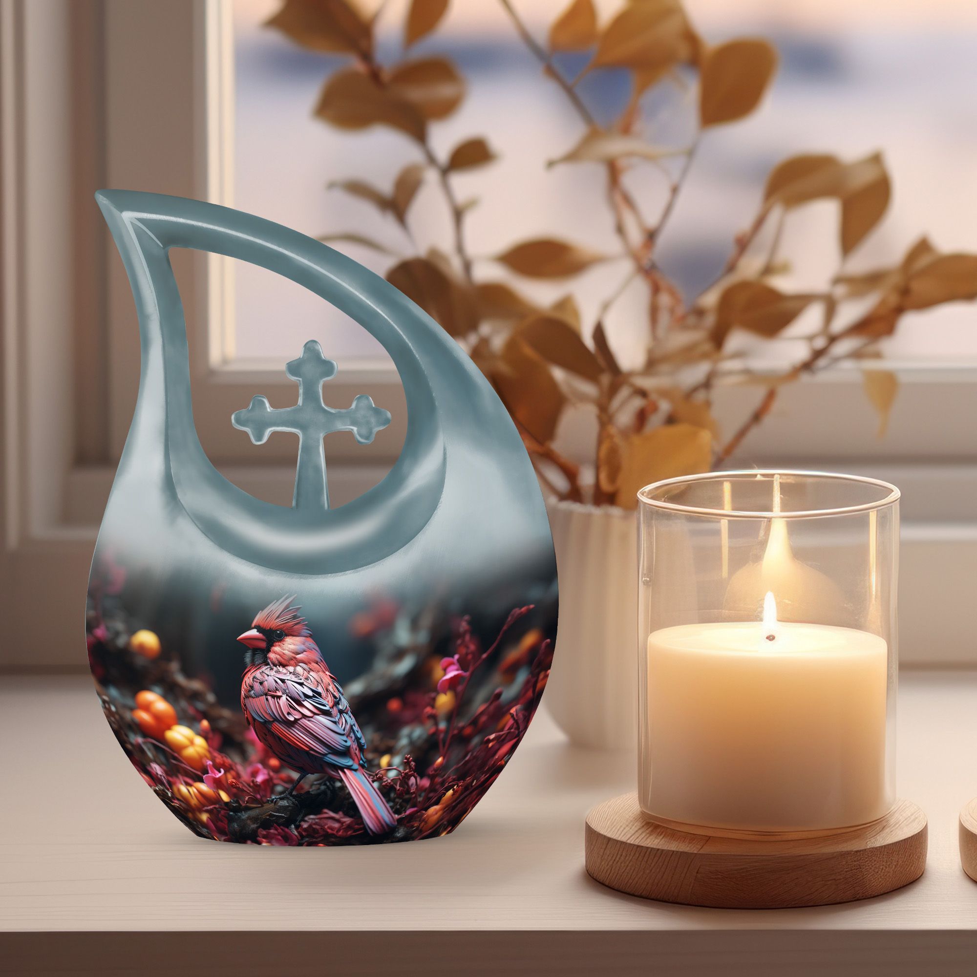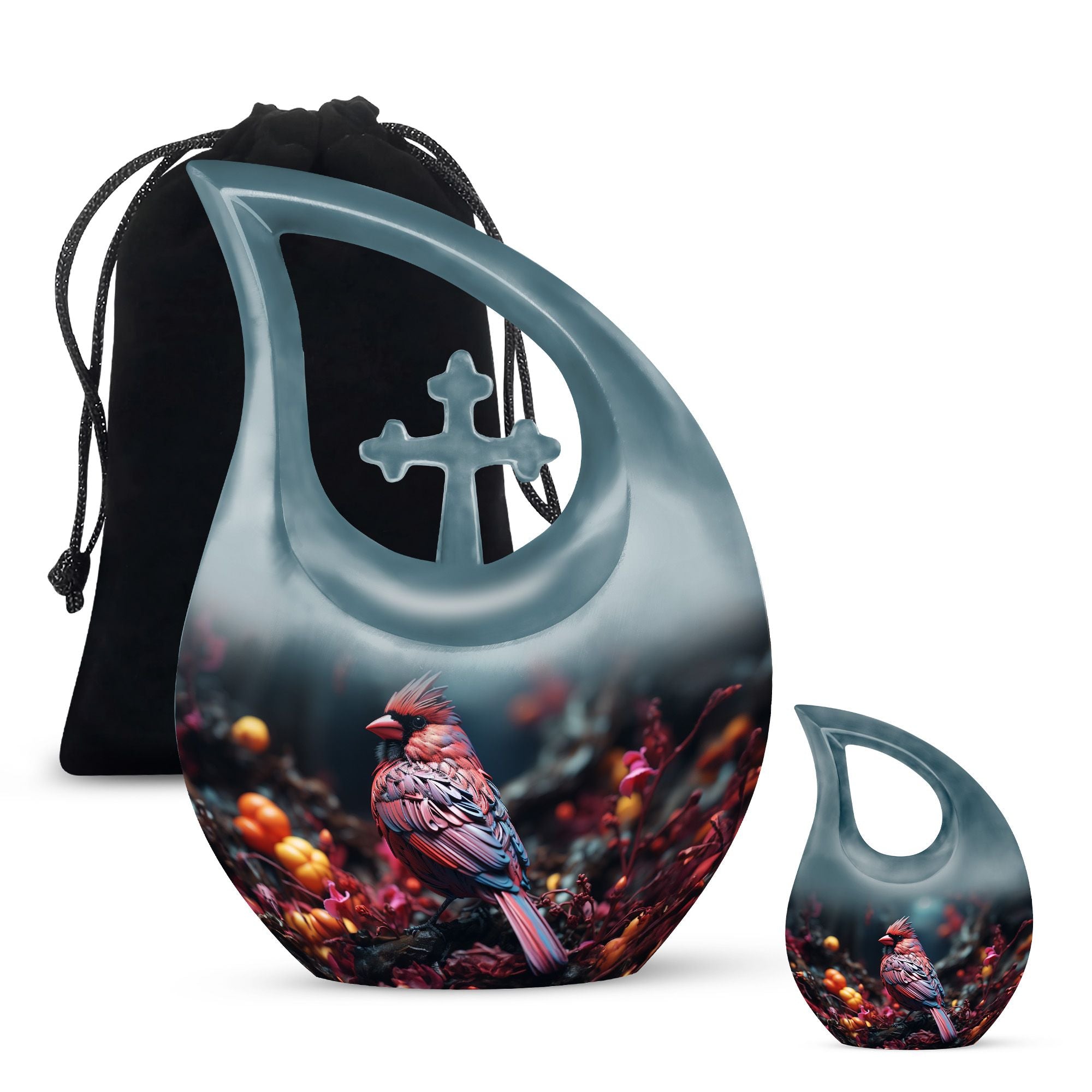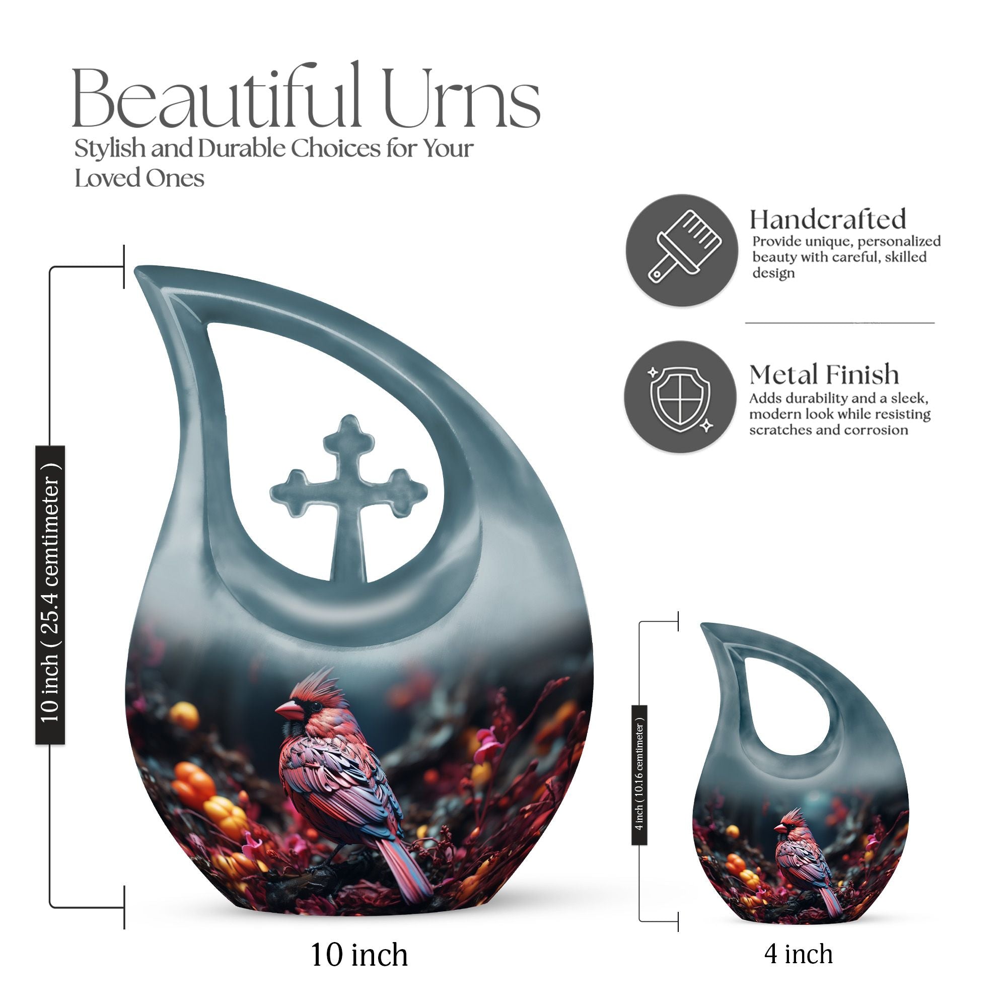 Showcase your honor to your dearly departed with the 10 inch Cardinal Bird Urn. This beautiful piece belongs to our category of Memorial Urn for Ashes, which is designed uniquely with an exquisite Cross Drop theme. The urn is delicately made from durable aluminium and punctiliously finished off with a Cardinal Bird design and a Cross Drop motif, to achieve a truly exceptional piece. Securing a weight of 3.3 pounds and dimensioned at 10 inches height, it provides a stately volume of 200 cubic inches for the containment of ashes. Moreover, the urn comes with a complimentary velvet pouch ensuring safe and respectful containment. Not only that, but also it extends an option to personalize with engraved names making each urn a unique commemorative memento. The Cardinal Bird Urn is a majestic resting place and a charming keepsake urn ingraining the loving memories forever. Searching keywords like 'Custom Urns for Ashes', 'Large Urns', or 'Keepsake Urns' might lead you to this exquisite piece.