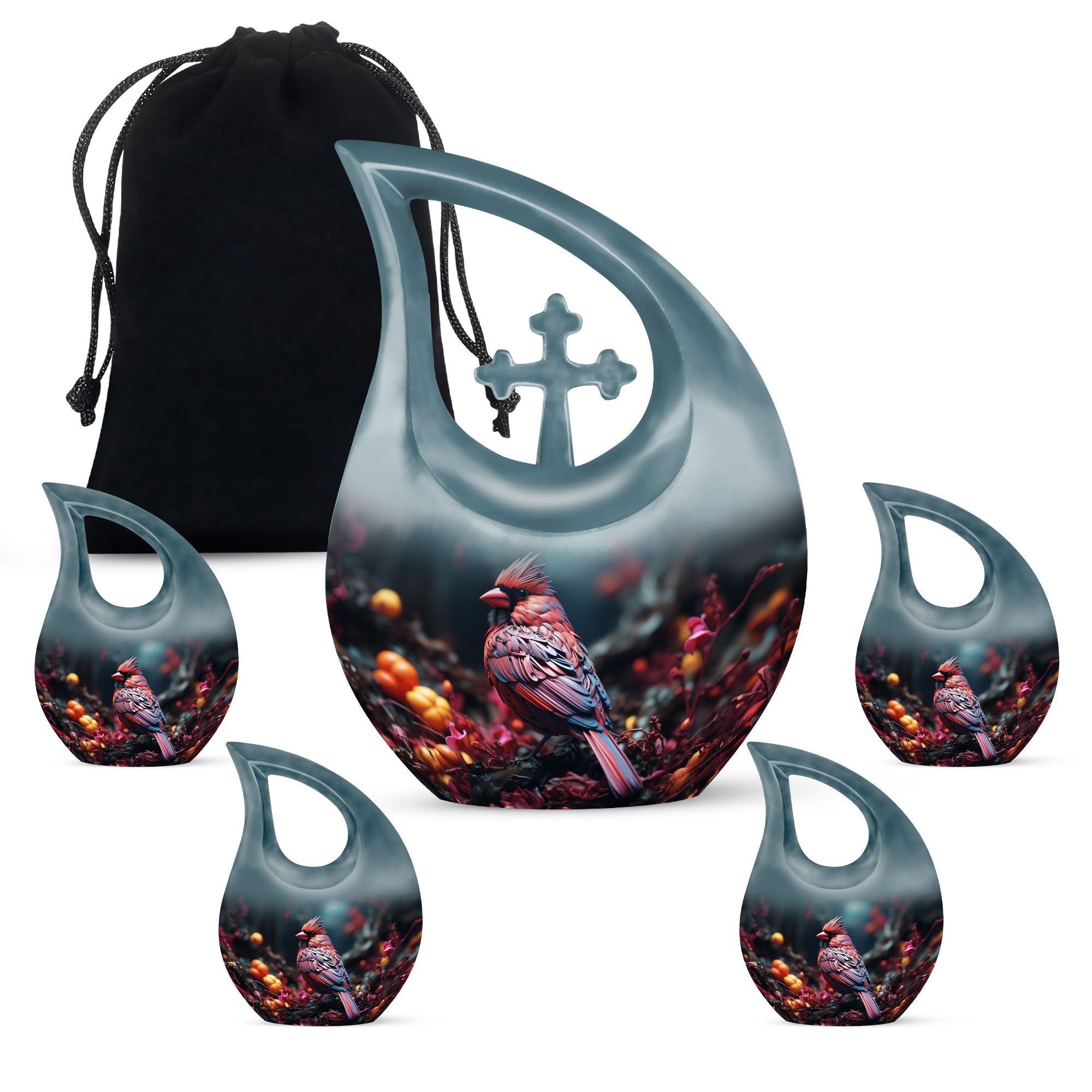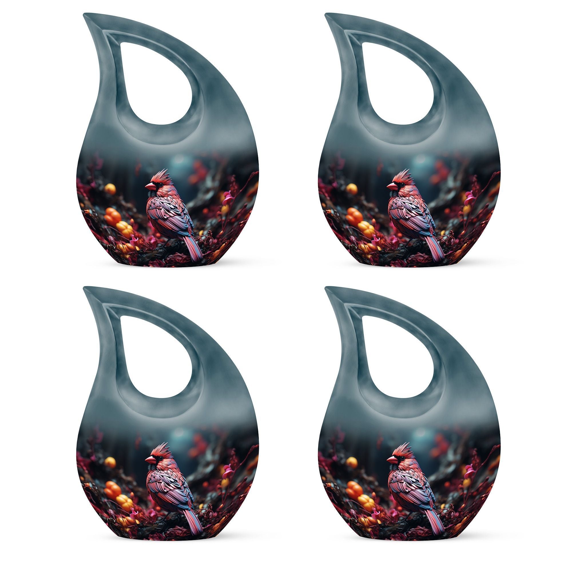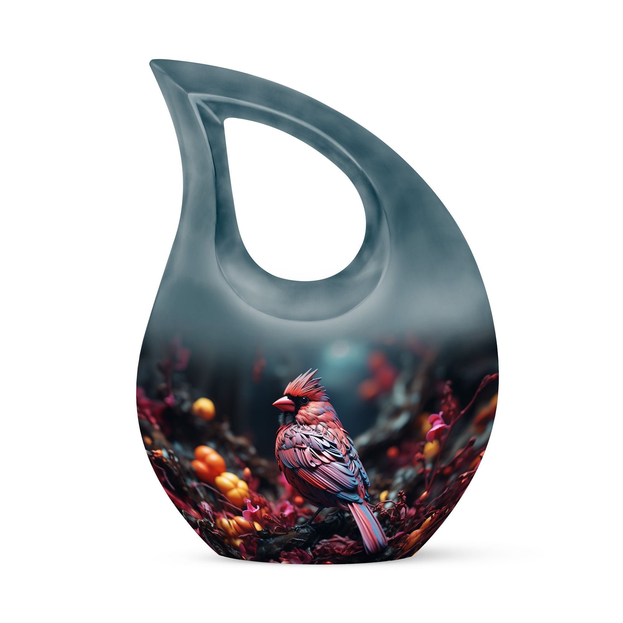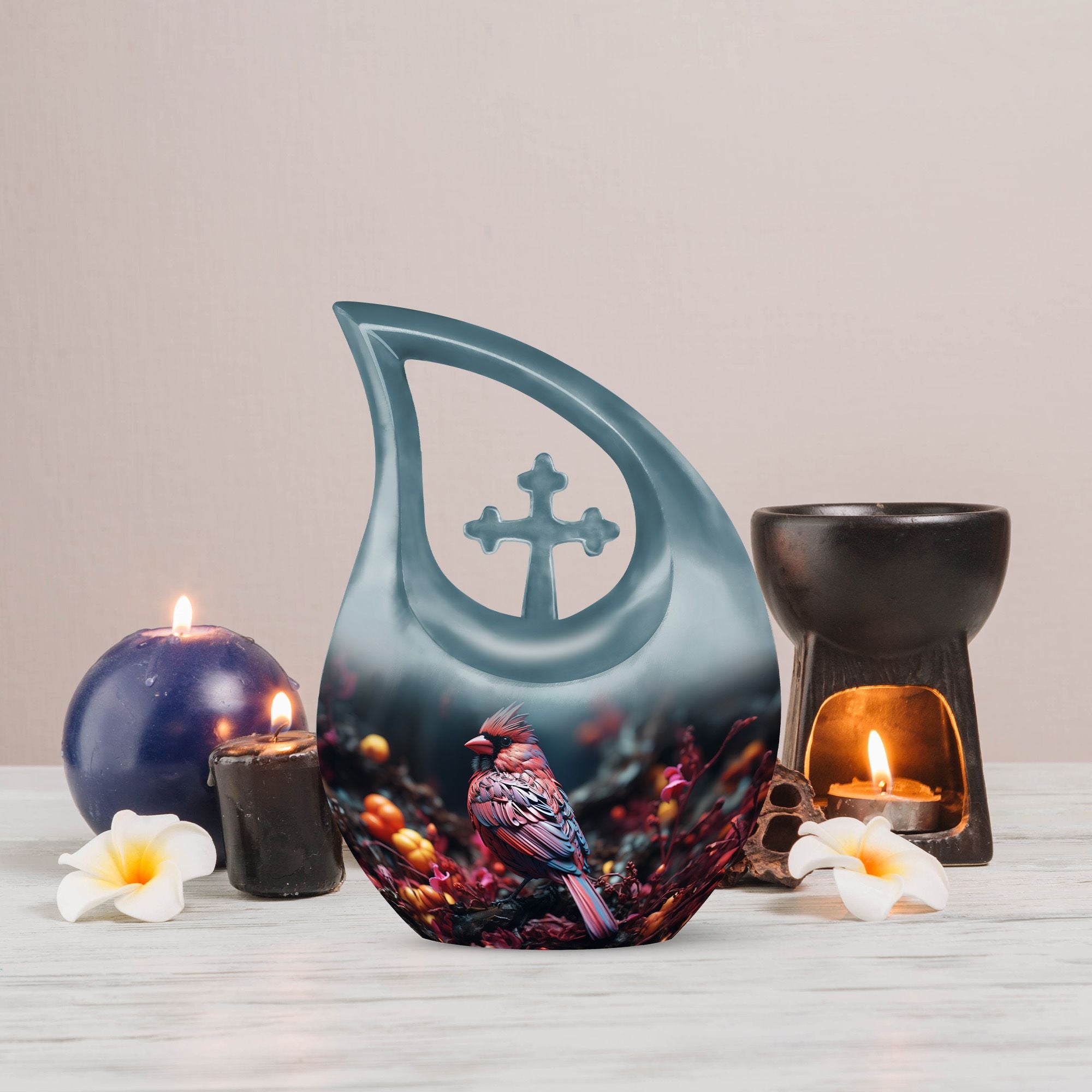 Showcase your honor to your dearly departed with the 10 inch Cardinal Bird Urn. This beautiful piece belongs to our category of Memorial Urn for Ashes, which is designed uniquely with an exquisite Cross Drop theme. The urn is delicately made from durable aluminium and punctiliously finished off with a Cardinal Bird design and a Cross Drop motif, to achieve a truly exceptional piece. Securing a weight of 3.3 pounds and dimensioned at 10 inches height, it provides a stately volume of 200 cubic inches for the containment of ashes. Moreover, the urn comes with a complimentary velvet pouch ensuring safe and respectful containment. Not only that, but also it extends an option to personalize with engraved names making each urn a unique commemorative memento. The Cardinal Bird Urn is a majestic resting place and a charming keepsake urn ingraining the loving memories forever. Searching keywords like 'Custom Urns for Ashes', 'Large Urns', or 'Keepsake Urns' might lead you to this exquisite piece.