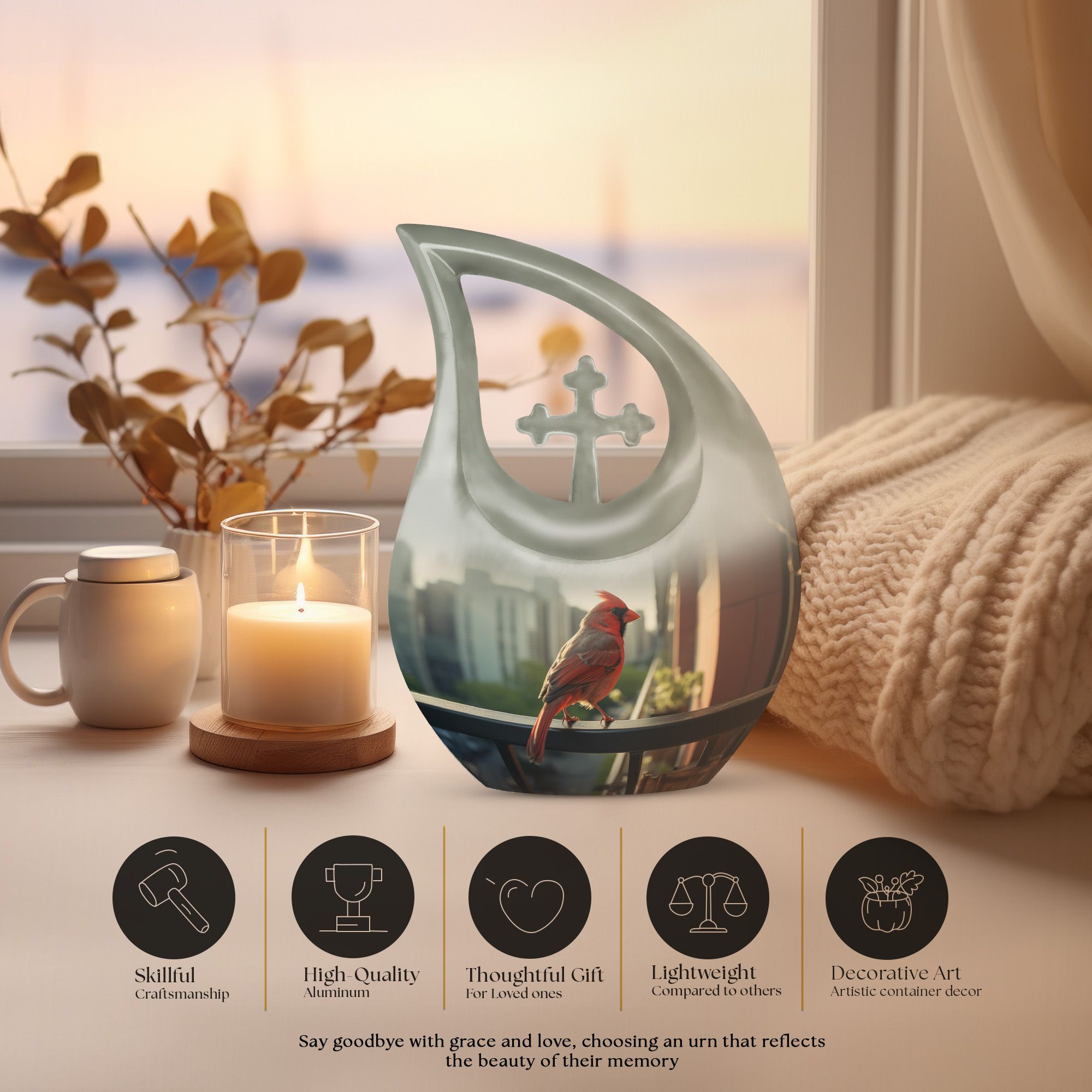 Beautifully crafted from durable aluminum, this urn features a serene cardinal design that stands as a symbol of guidance and spiritual connection. Whether you need a classic funeral urn, adult funeral urn, or funeral urns for human ashes small for companion displays, its craftsmanship ensures long-lasting dignity. The secure screw-top lid provides peace of mind, while the polished finish enhances its elegance, making it suitable for home display, burial, or memorial services.