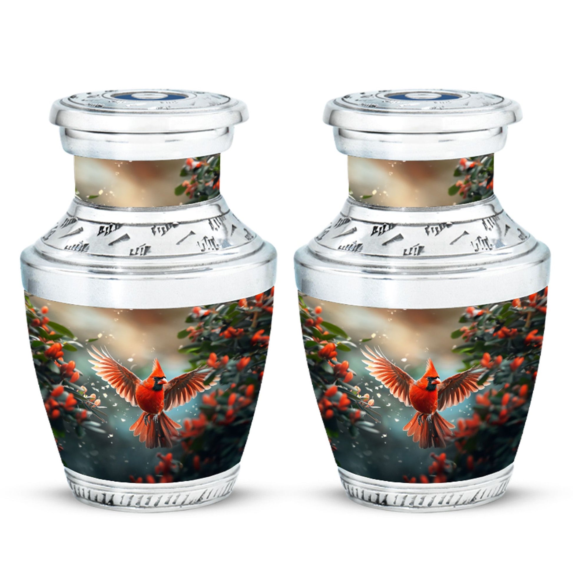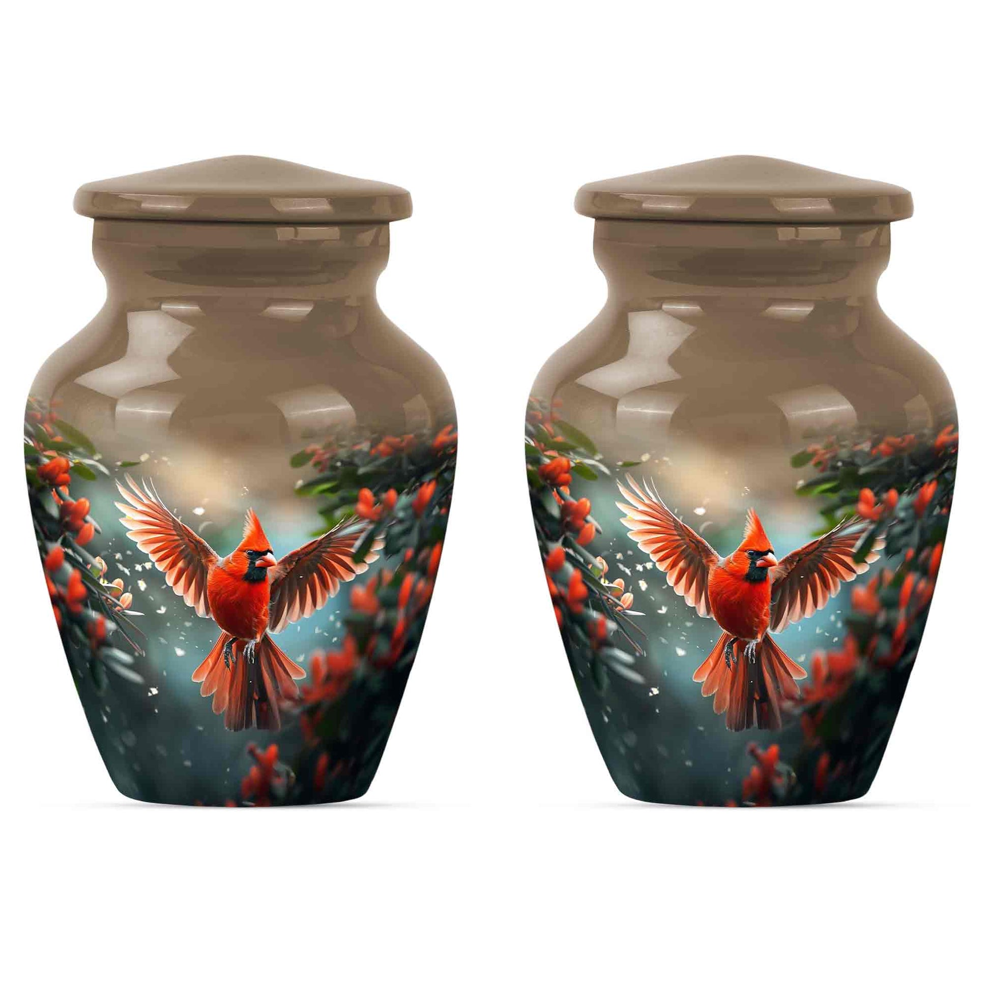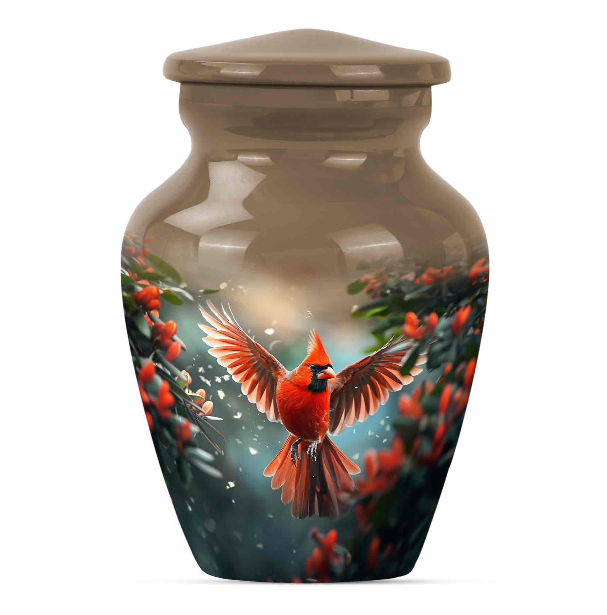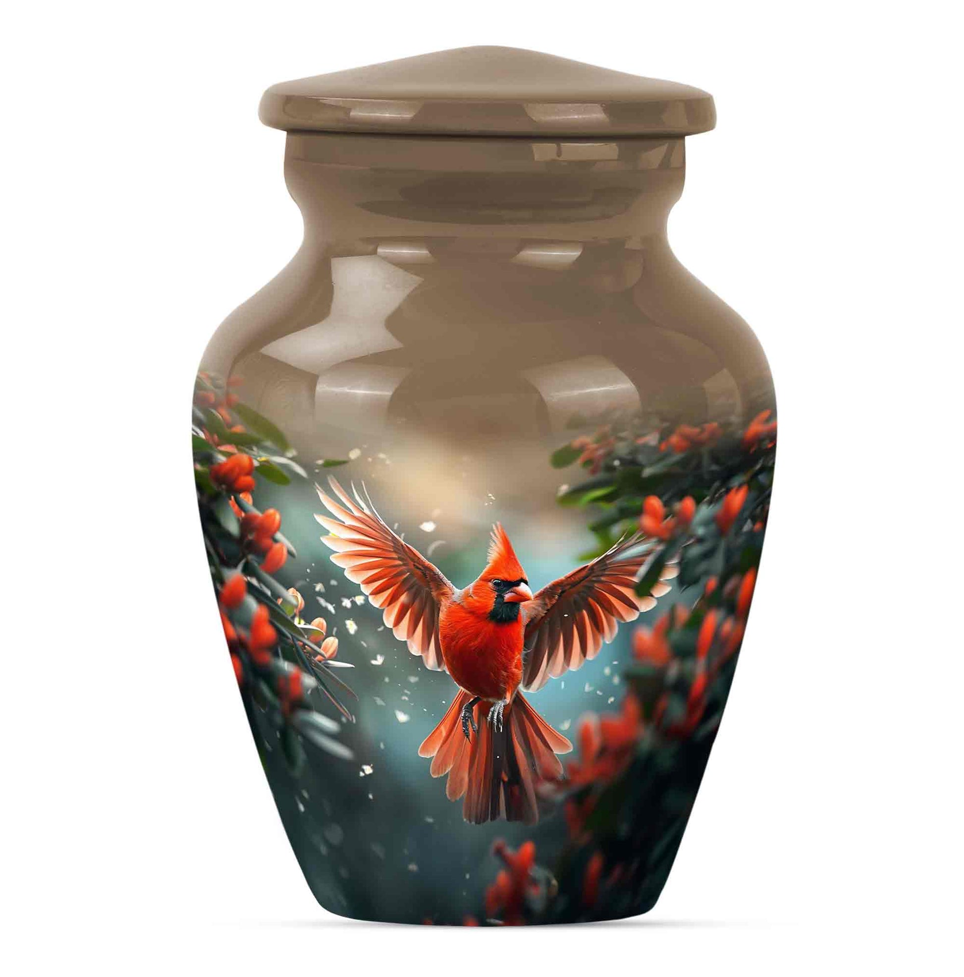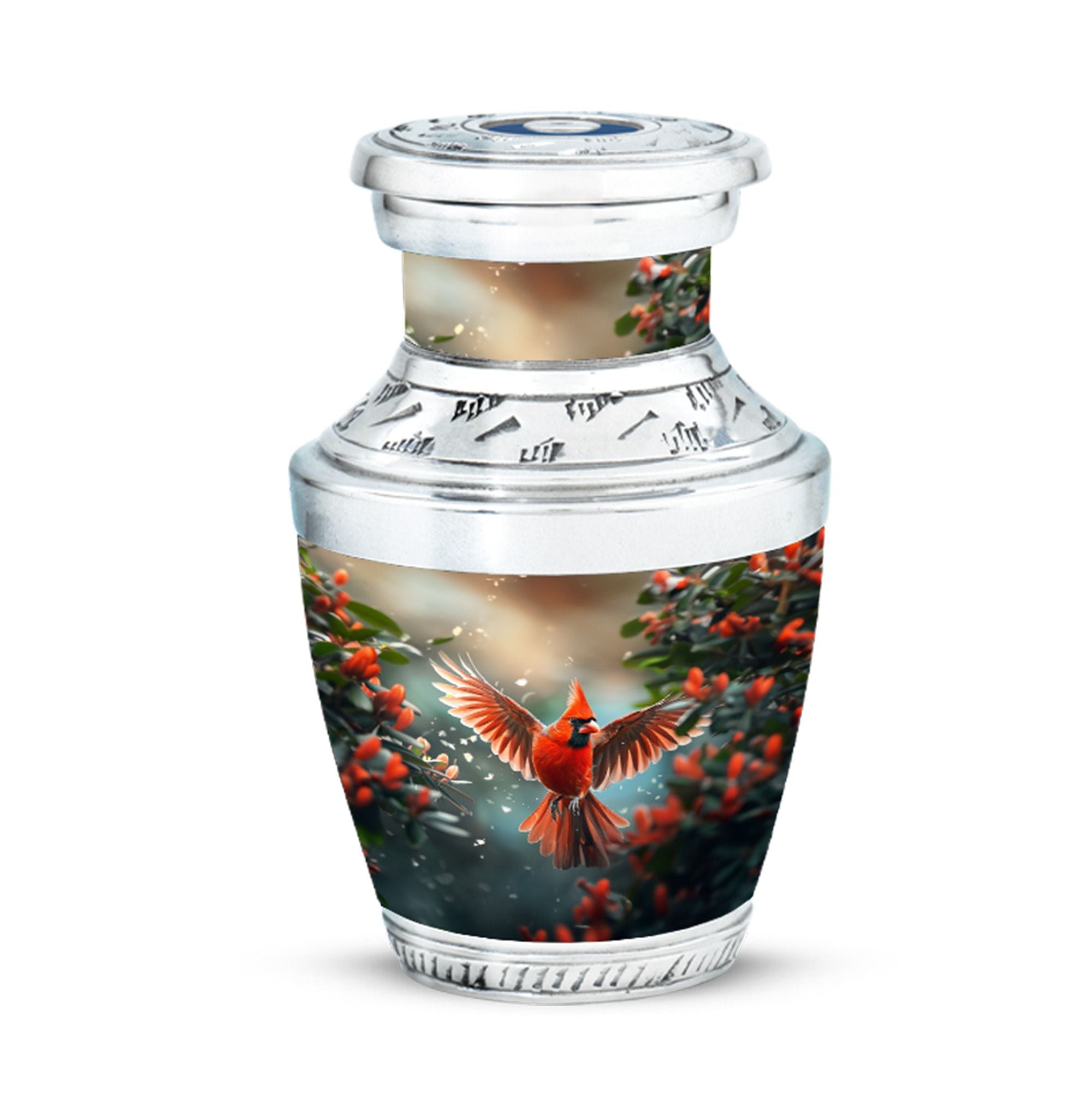 Crafted with care from durable aluminum, this urn features a vivid cardinal bird design and a secure screw-top lid. Its compact size makes it perfect as small urn for human ashes keepsake, small keepsake urn, or urns for ashes small keepsake. It is suitable for honoring parents, serving as small urns for human ashes keepsake dad or small urns for human ashes keepsake mom.