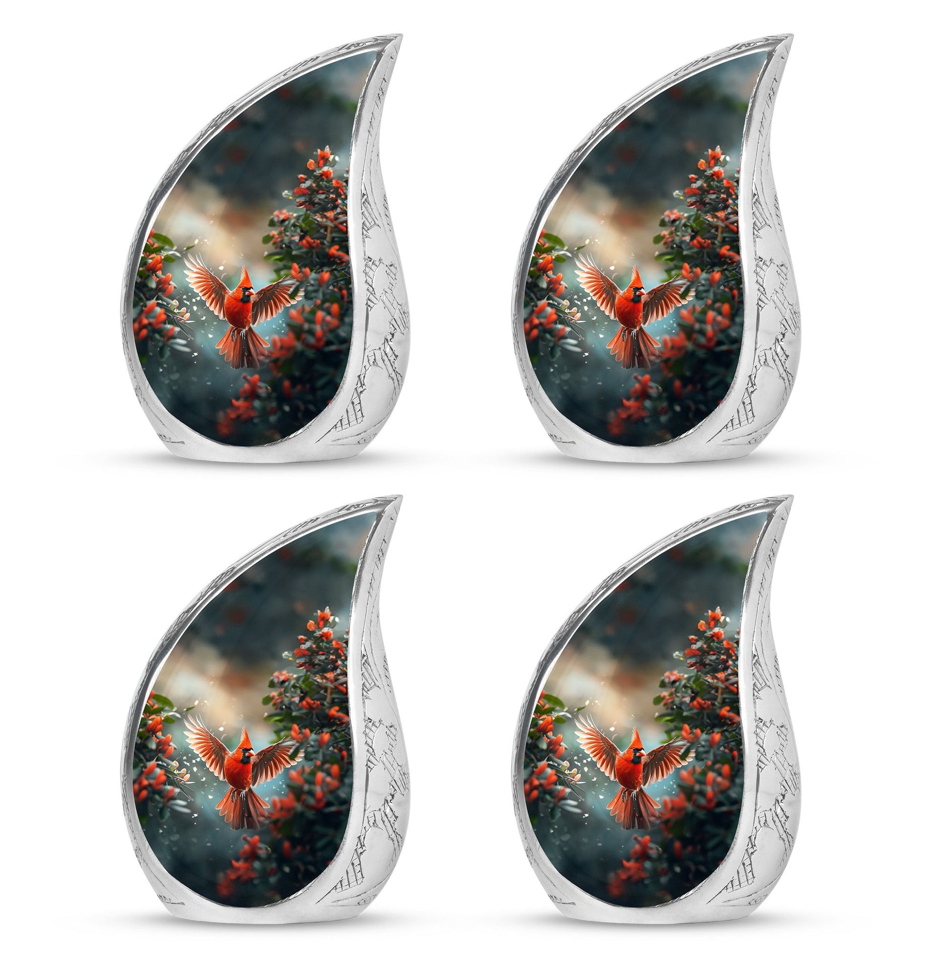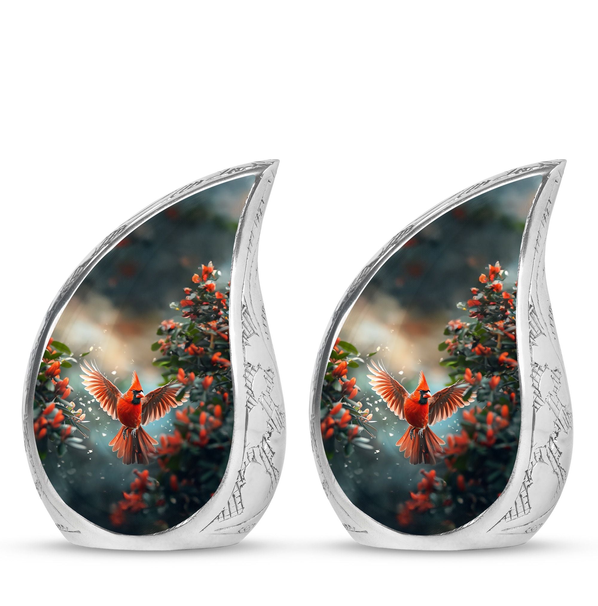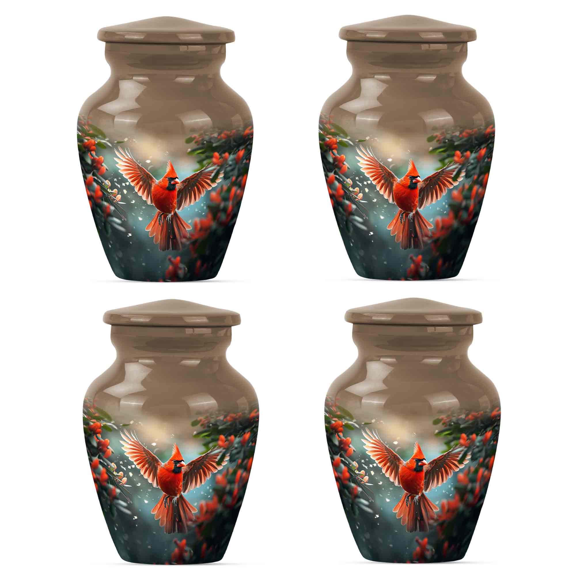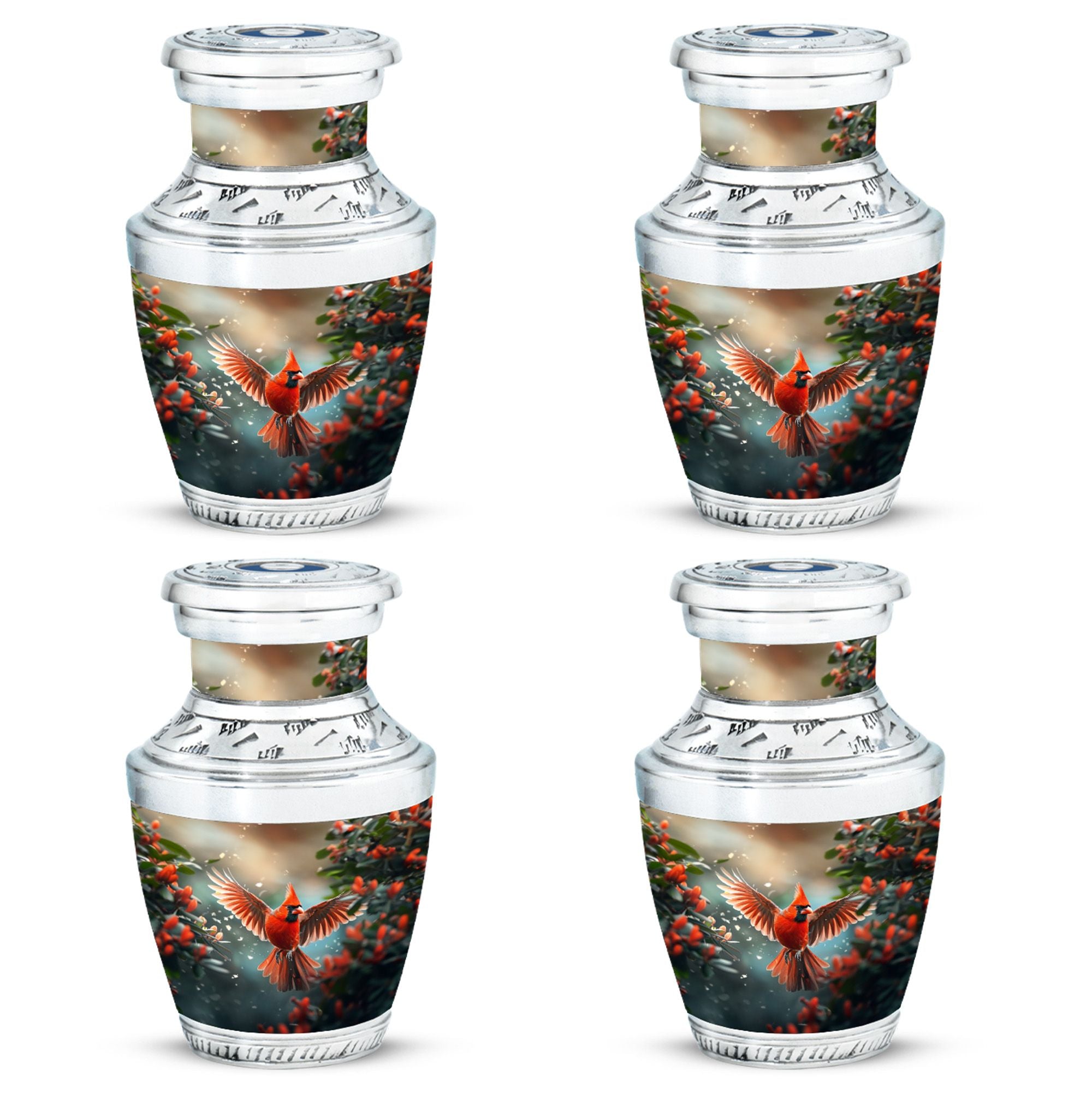 Crafted with care from durable aluminum, this urn features a vivid cardinal bird design and a secure screw-top lid. Its compact size makes it perfect as small urn for human ashes keepsake, small keepsake urn, or urns for ashes small keepsake. It is suitable for honoring parents, serving as small urns for human ashes keepsake dad or small urns for human ashes keepsake mom.