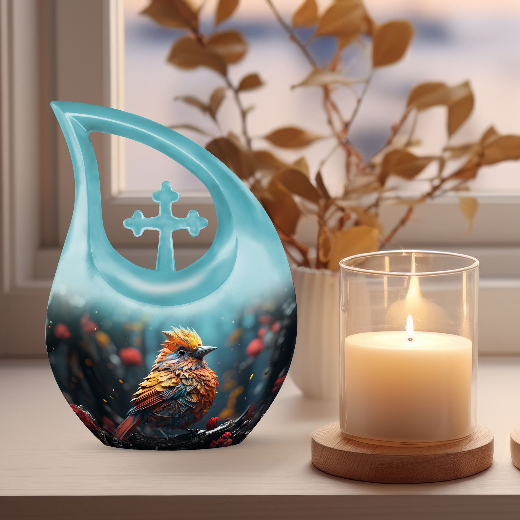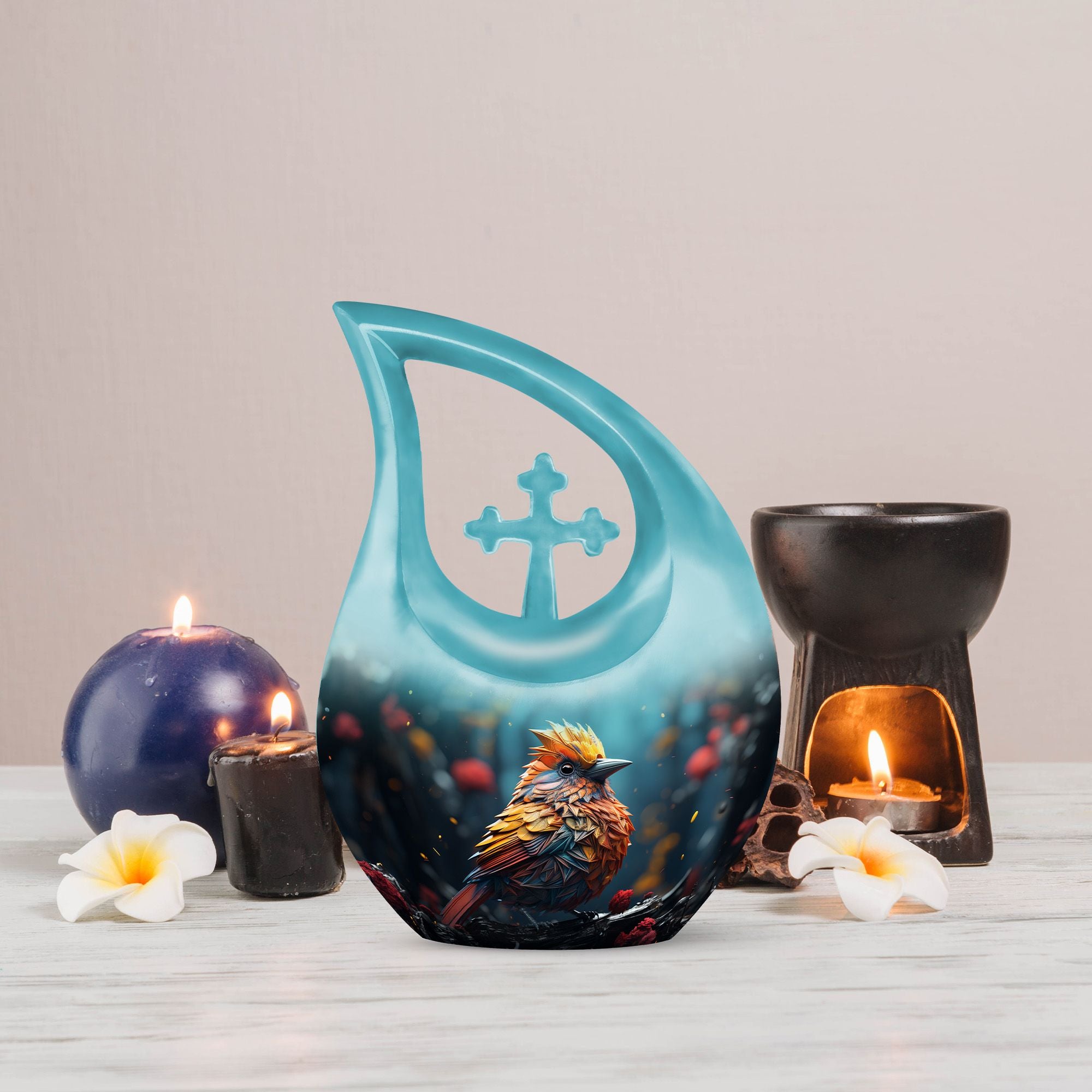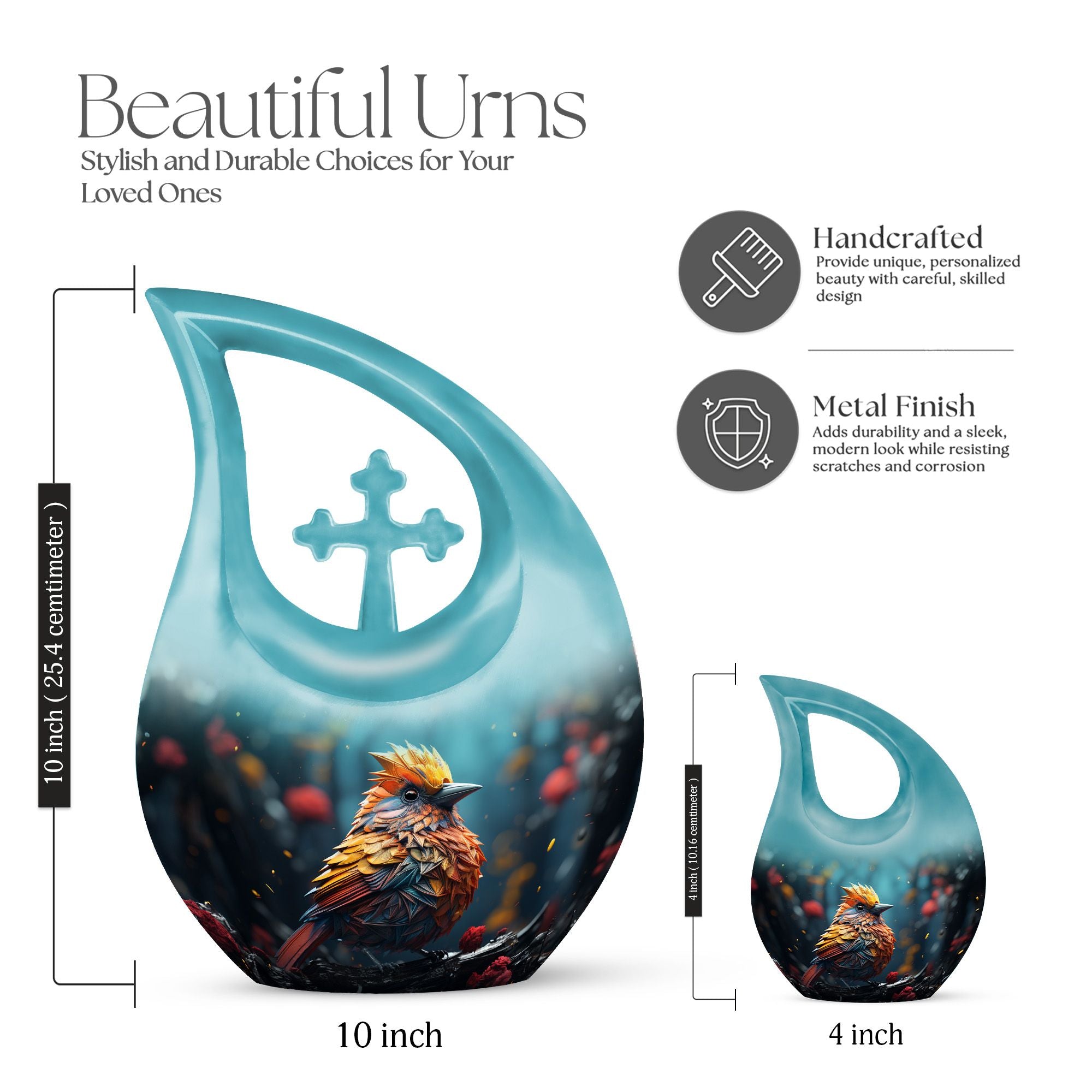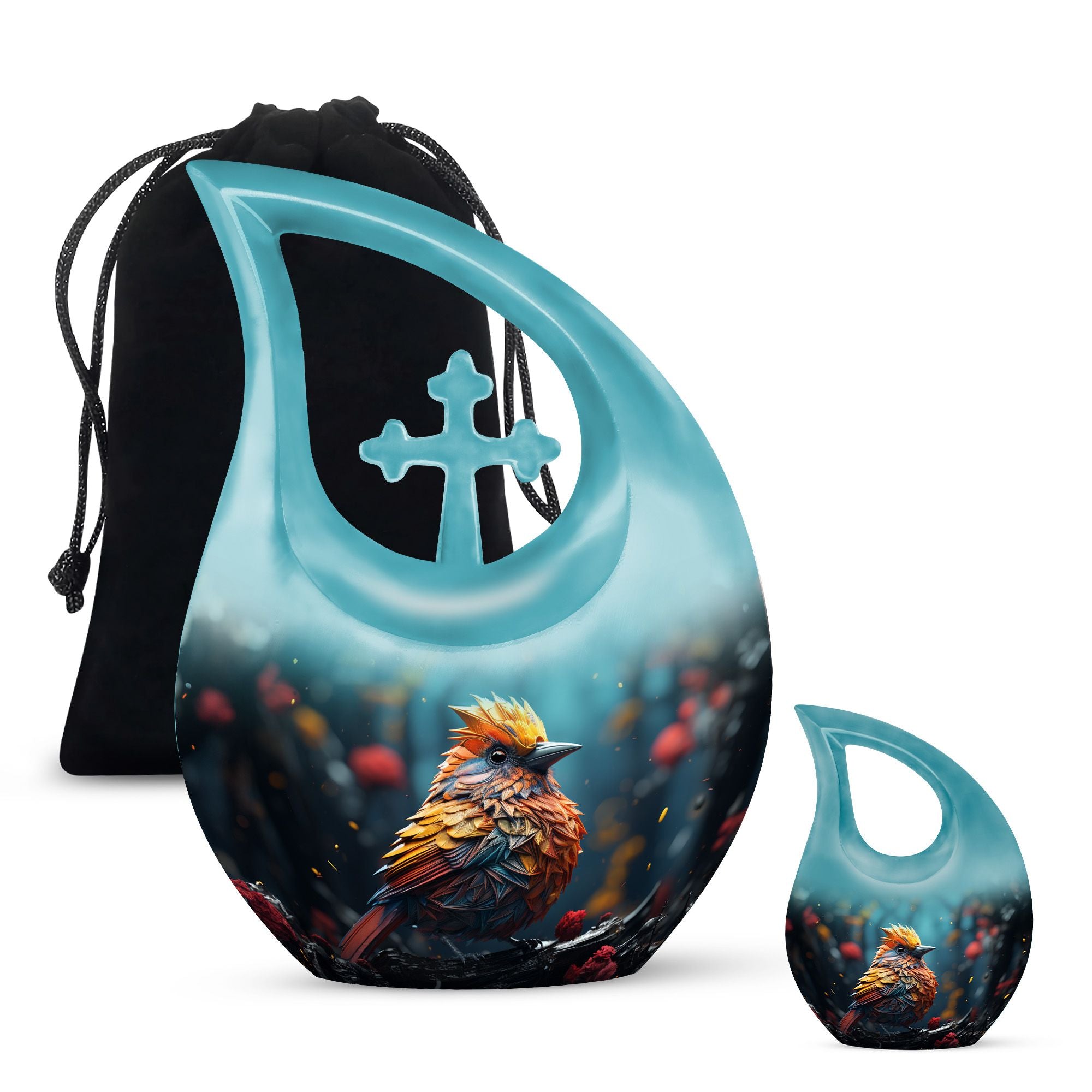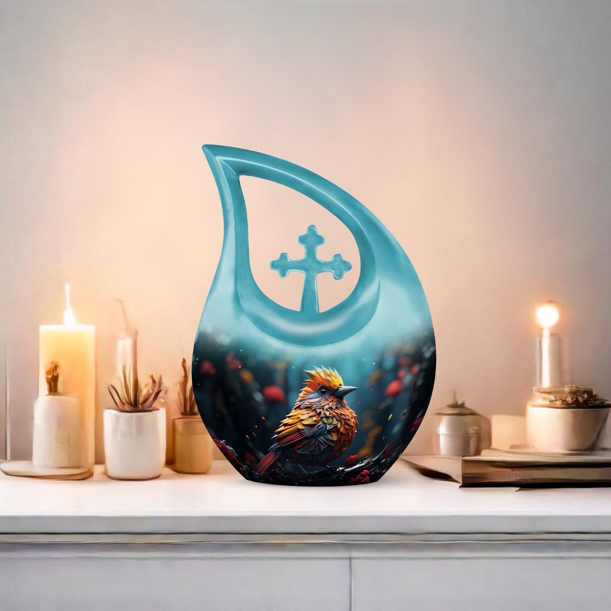 Honor the memory of a loved one with this captivating Cardinal Bird Urn. This 10-inch aluminium urn stands out with its unique 'Cross Drop' theme, resonating not just the beauty but also the freedom of a cardinal bird. Perfect for those in pursuit of affordable, yet symbolic memorial urns, this urn weighs a solid 3.3 pounds and can hold up to 200 cubic inches of ashes. Along with the urn, this package also includes a velvet pouch, a seemly containment for the ashes. But what sets this item apart is its ability to be personalized. Customize it with engraving to bear the name of your beloved departed, preserving their memory in the most intimate way. So, when thinking cremation urns or burial urns, consider this Cardinal Bird Urn—a perfect choice for a beautiful, lasting memorial.