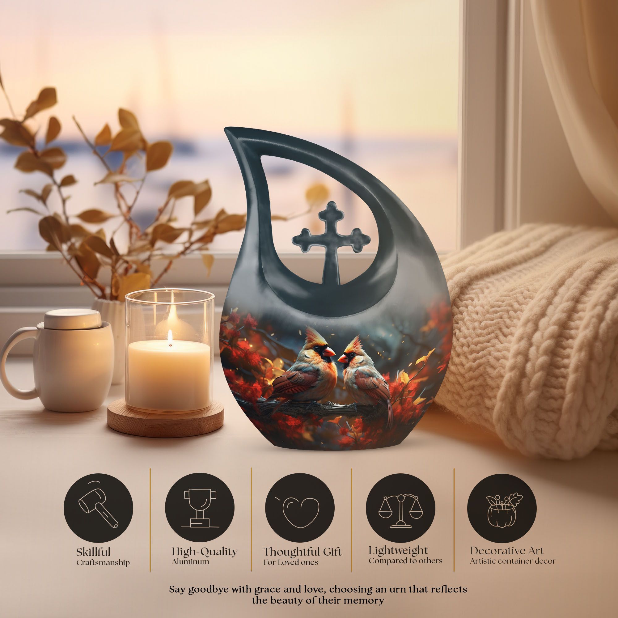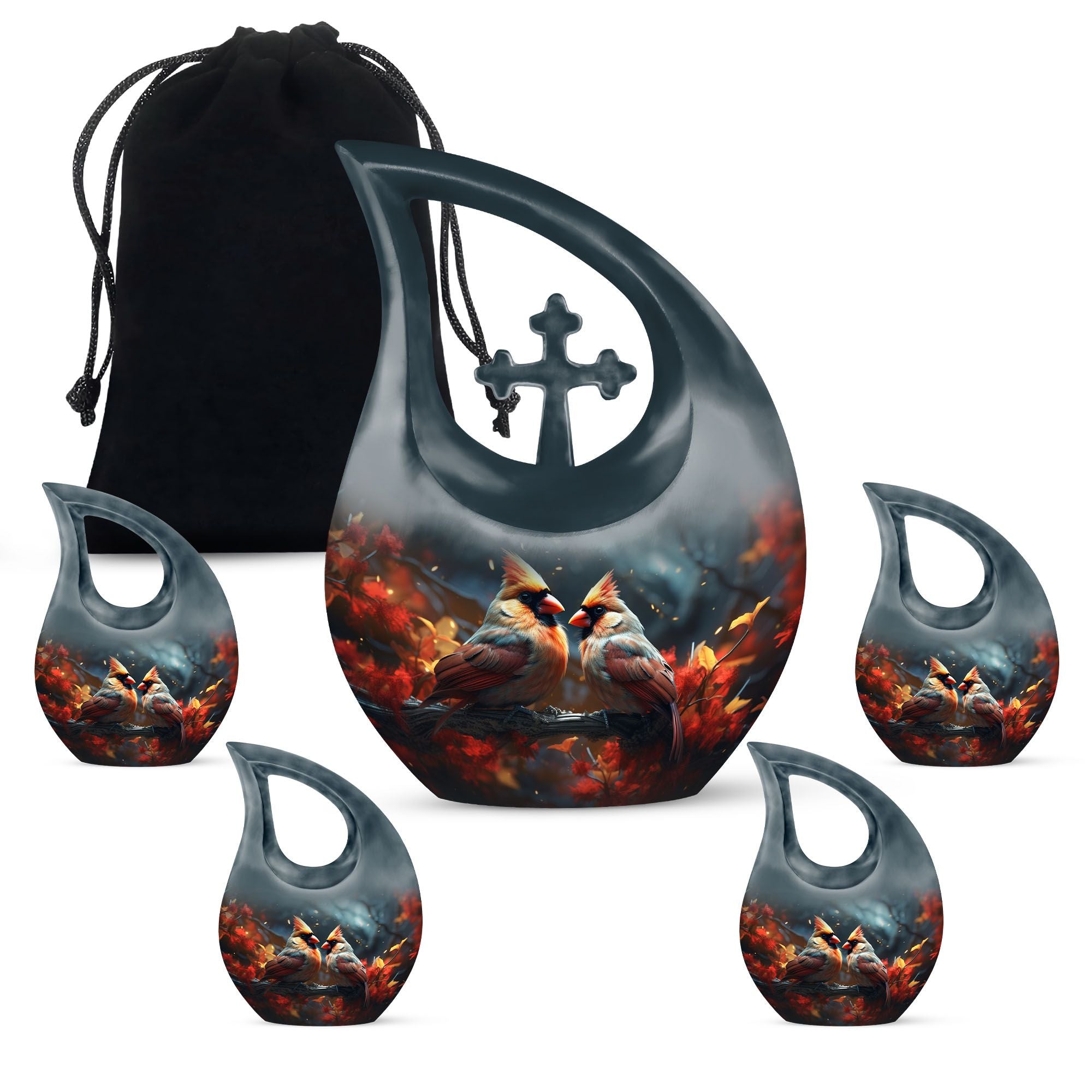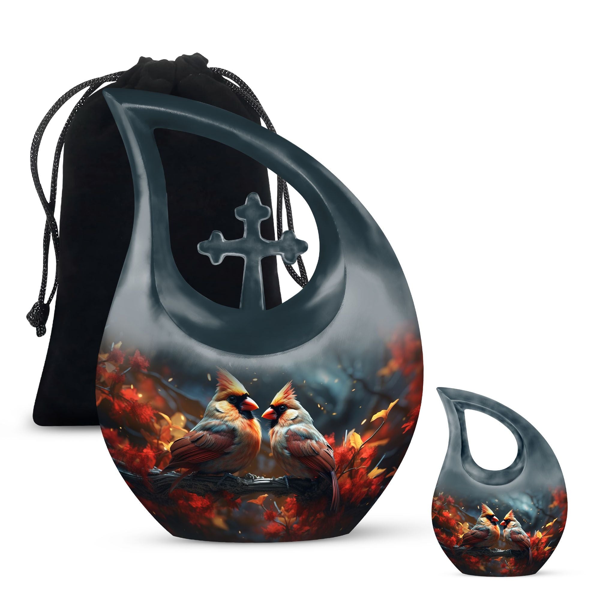 Celebrate everlasting love and togetherness with the Orange Cardinal Bird Cremation Urn for Couples, a stunning symbol of devotion and peace. Designed for both men and women, this urn embodies warmth and remembrance, ideal for urns for ashes adult female mom or human urns for ashes adult male. Expertly crafted from premium aluminum, this large and keepsake urn set features a radiant orange and gold cardinal motif — representing faith and eternal love. The fine artistry and protective lacquer finish ensure that these urns for adult male and urns for adult female ashes remain beautiful for generations. The secure screw-top lid keeps the ashes safe and preserved with dignity. Perfect for display or burial, this urn set can serve as ash urns for humans male or urns for ashes adult female mother, offering families the option to share and cherish memories through matching keepsakes. Features: Material: Premium handcrafted aluminum Dimensions: Height 10 inches (large urn), 3 inches (keepsake urns) Capacity: Large urn holds 200 cubic inches; keepsakes hold a portion of ashes Lid: Secure screw-top lid for safe closure Design: Orange cardinal birds on floral backdrop — symbolizing love and remembrance Use: Suitable adult male urn, urn for adult female ashes, or couple memorial keepsakes The Orange Cardinal Bird Cremation Urn Set is a heartfelt tribute — a radiant reflection of shared love that continues to soar, even beyond life itself.