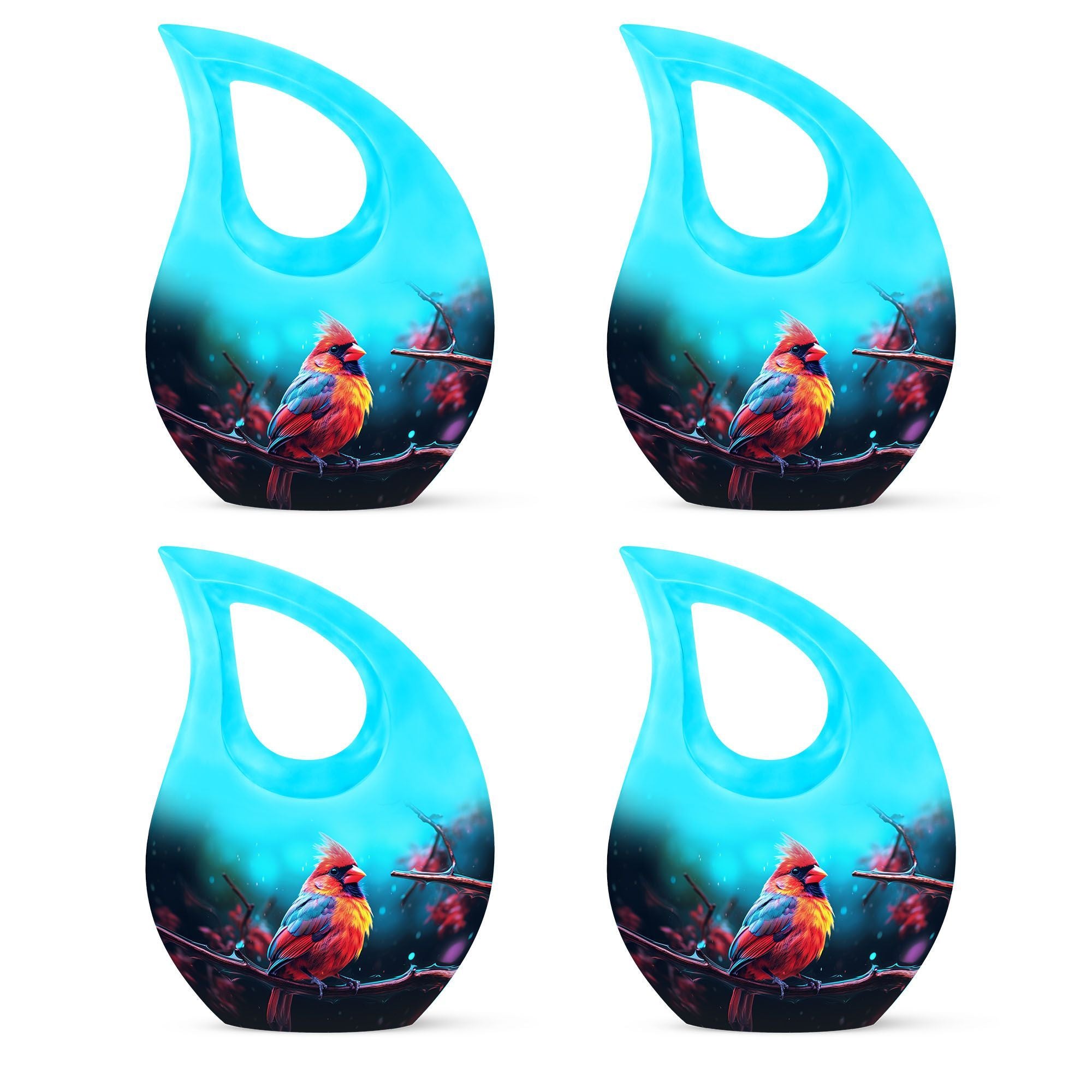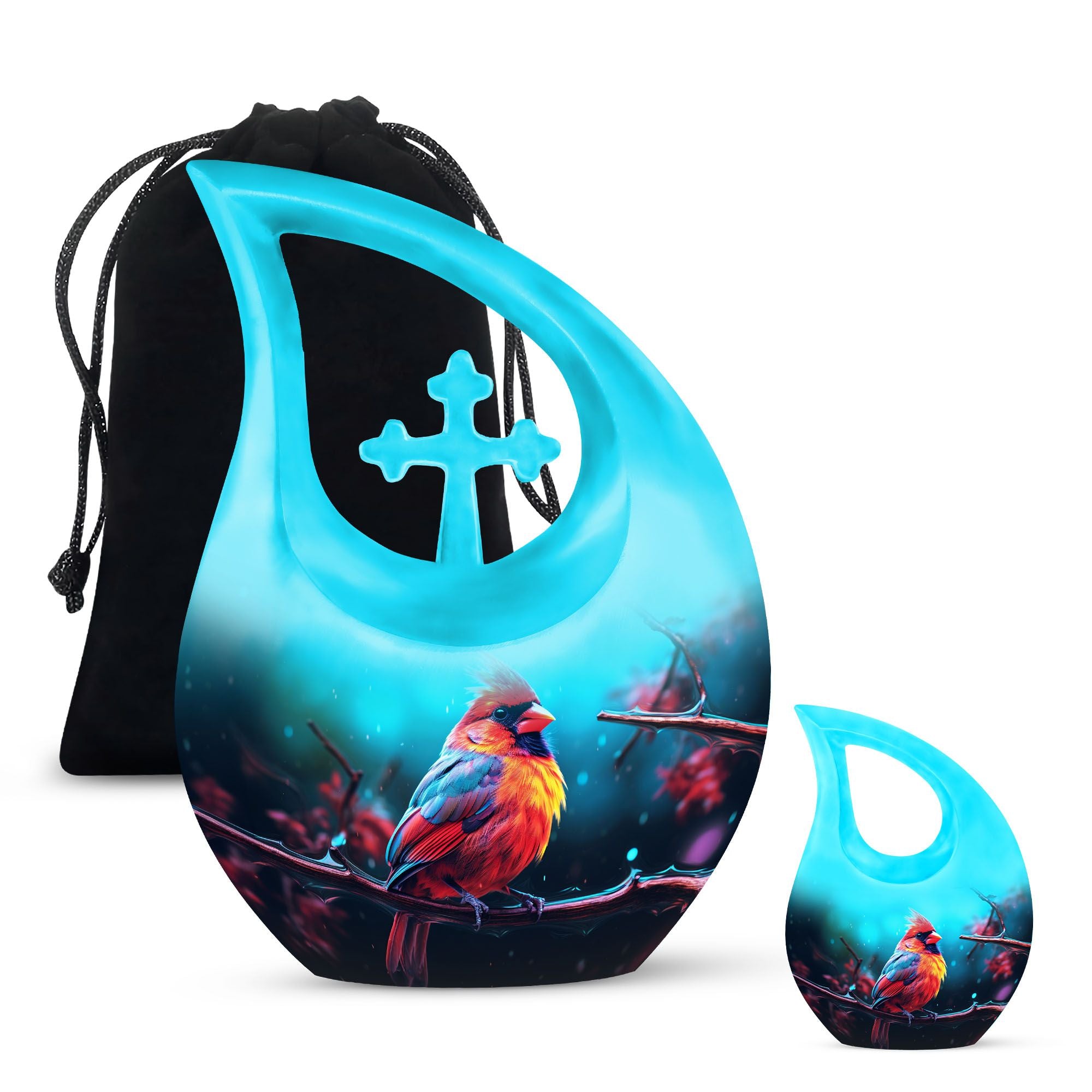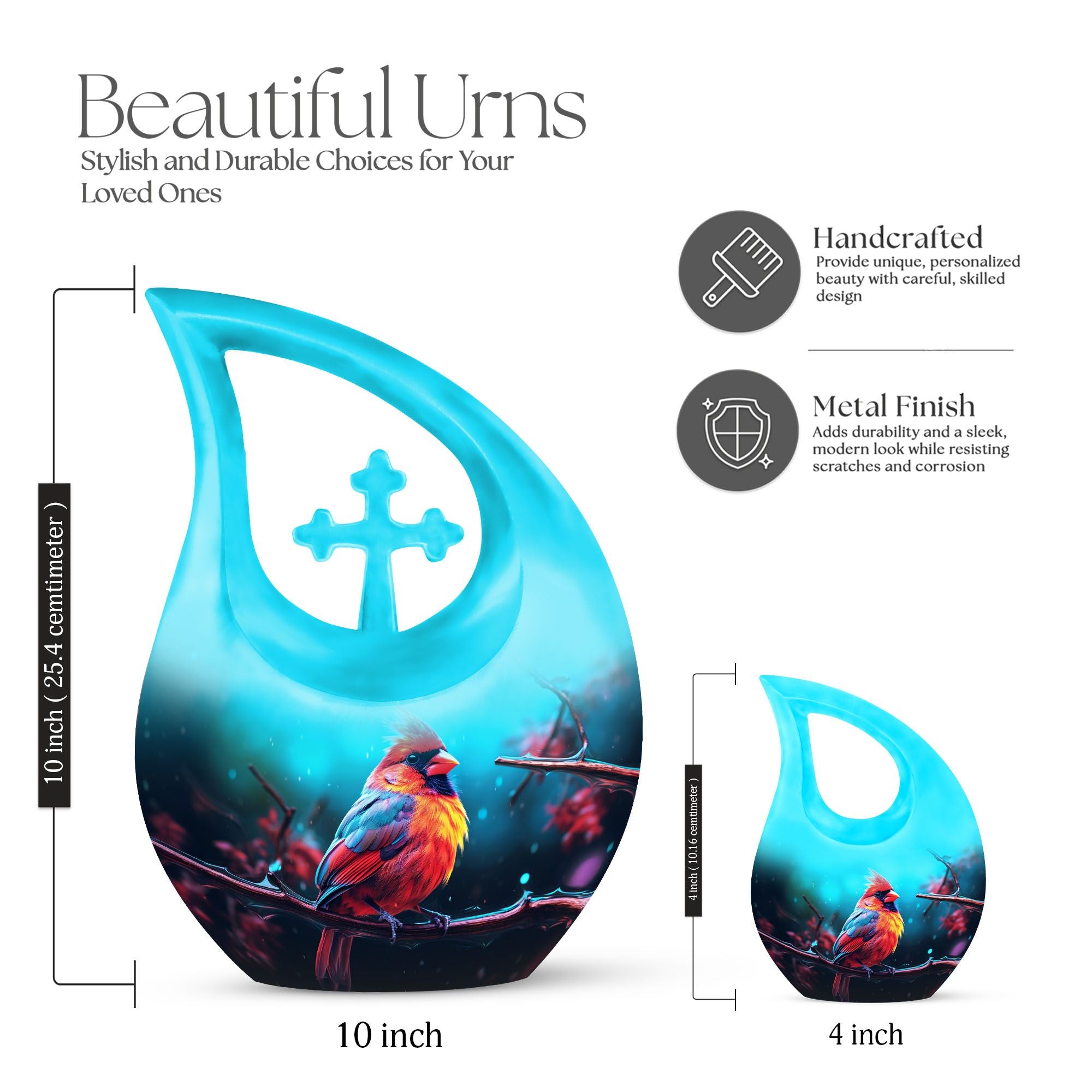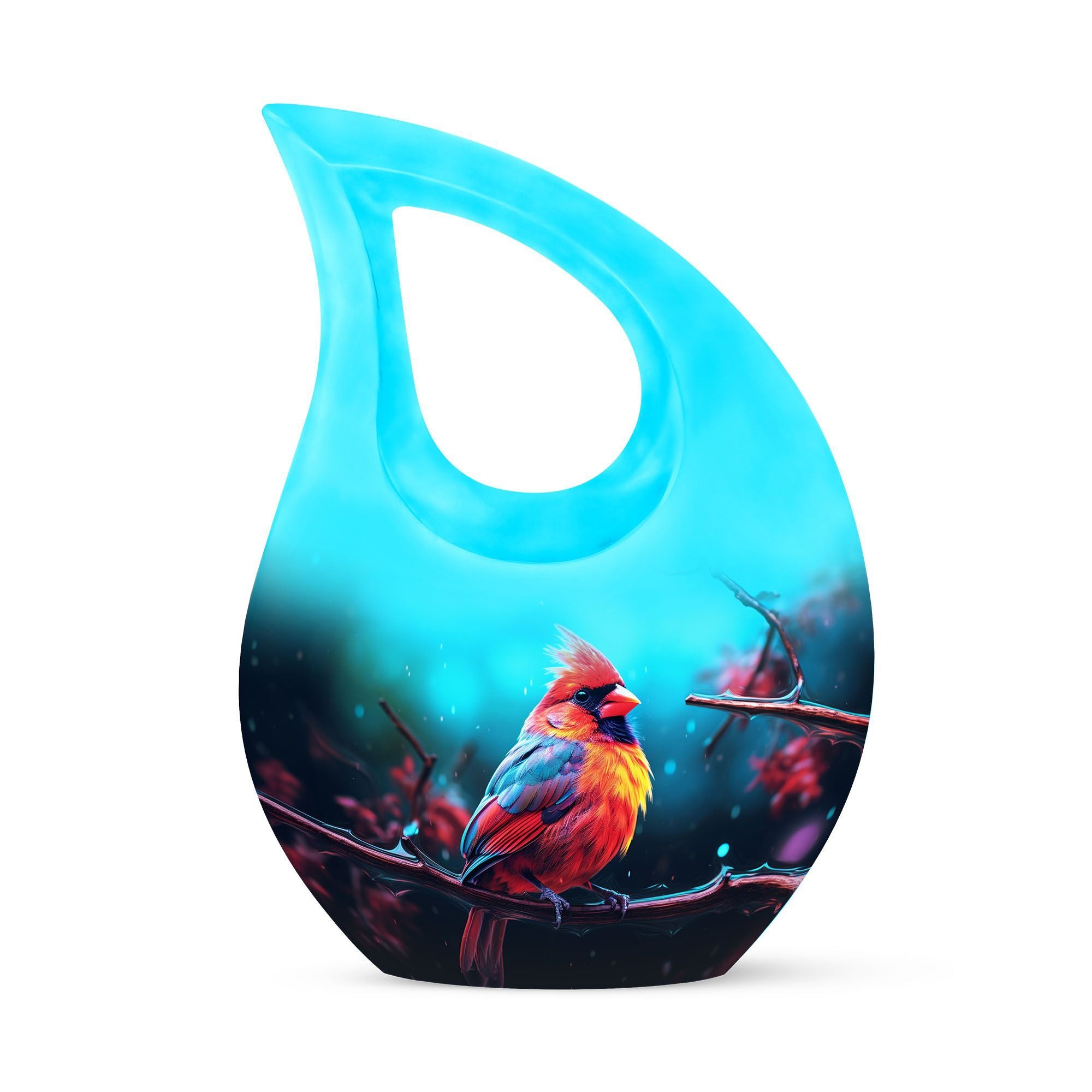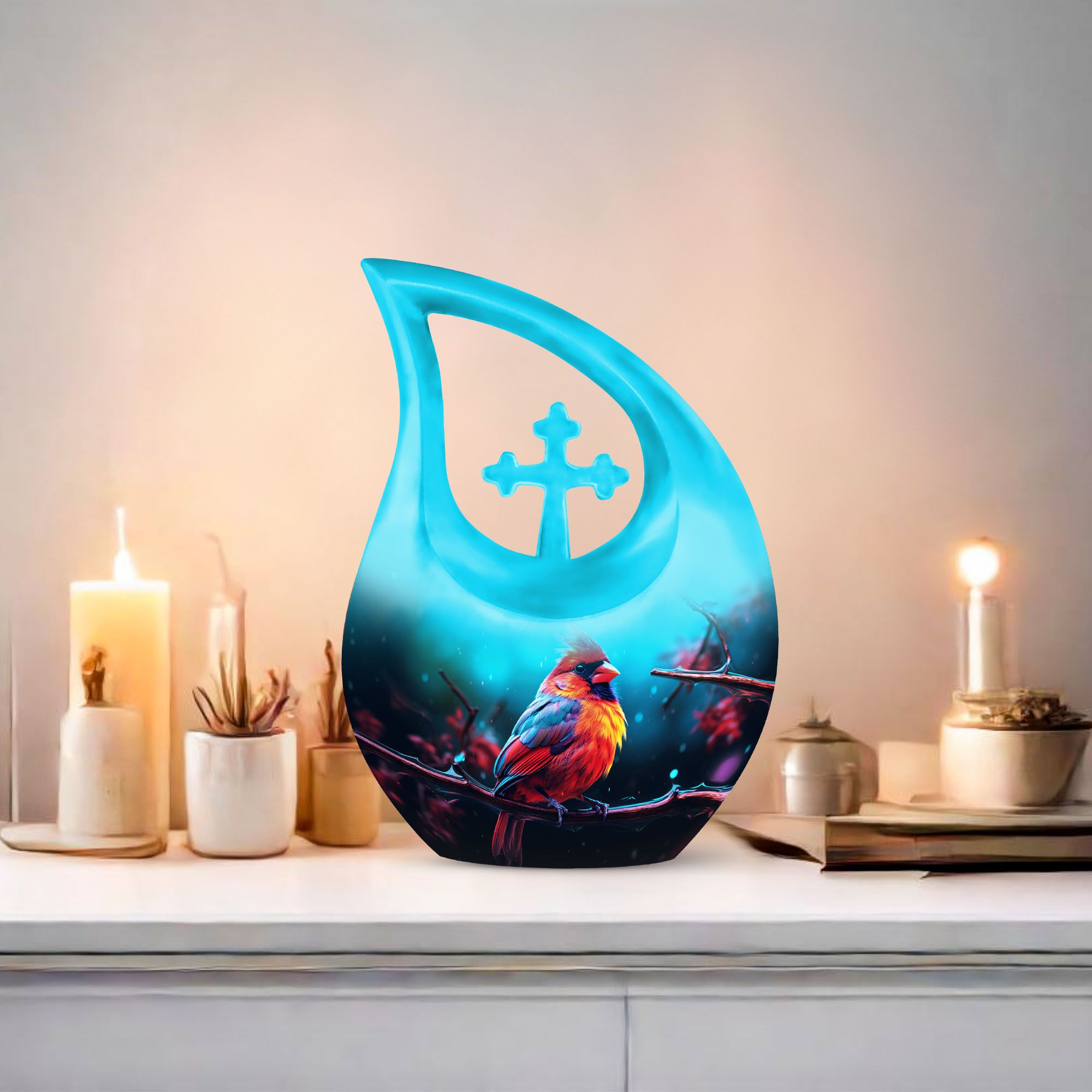 Handcrafted with care, this blue artistic memorial urn features a vivid red cardinal set against a peaceful blue background, representing the balance between earth and sky. Made from durable aluminium, it combines strength, artistry, and comfort. Its compact size makes it perfect as urns for ashes adult male small keepsake, for home memorials, or as part of burial urns for human ashes adult male arrangements. The secure screw-top lid ensures safe preservation, while the graceful design brings calm and beauty to any setting.