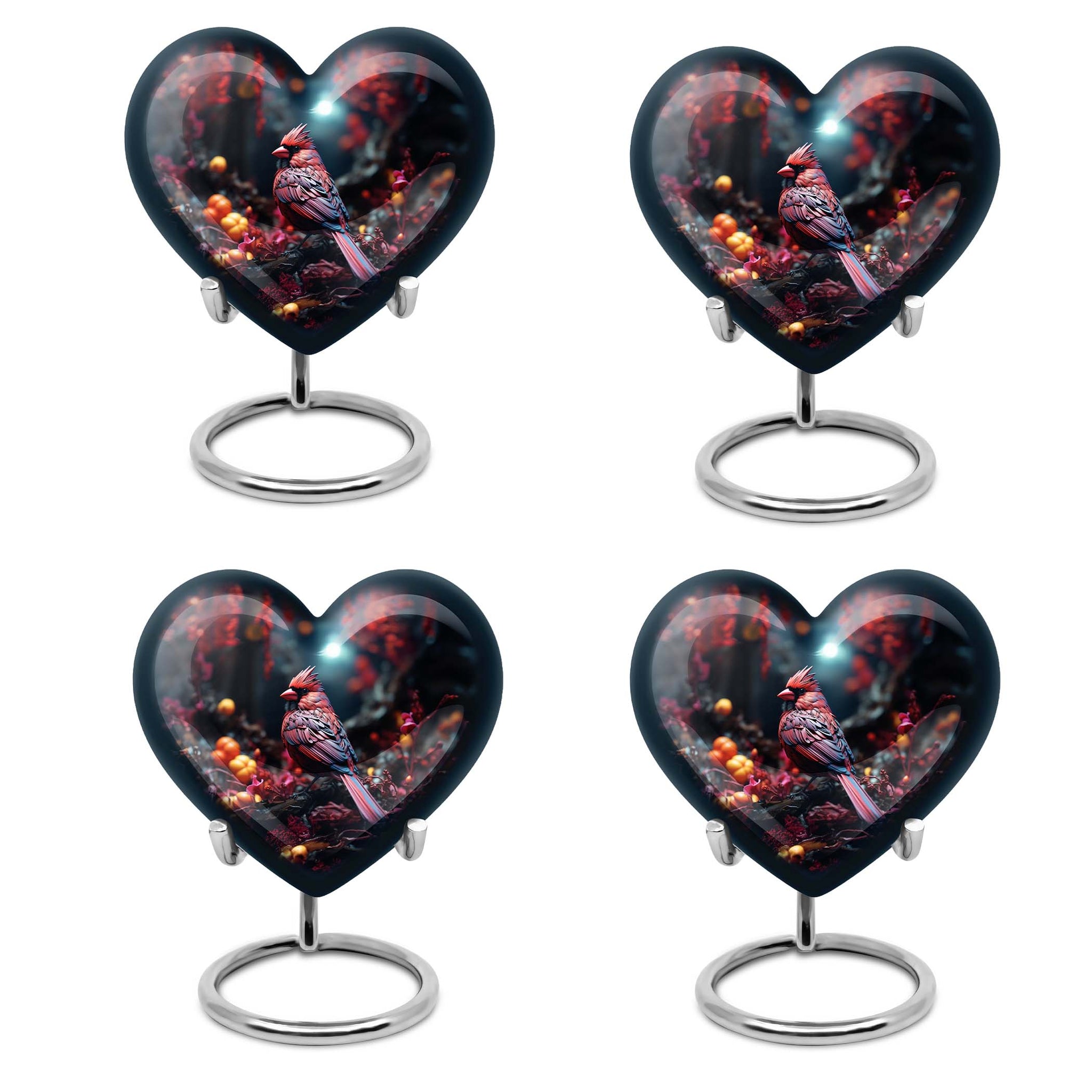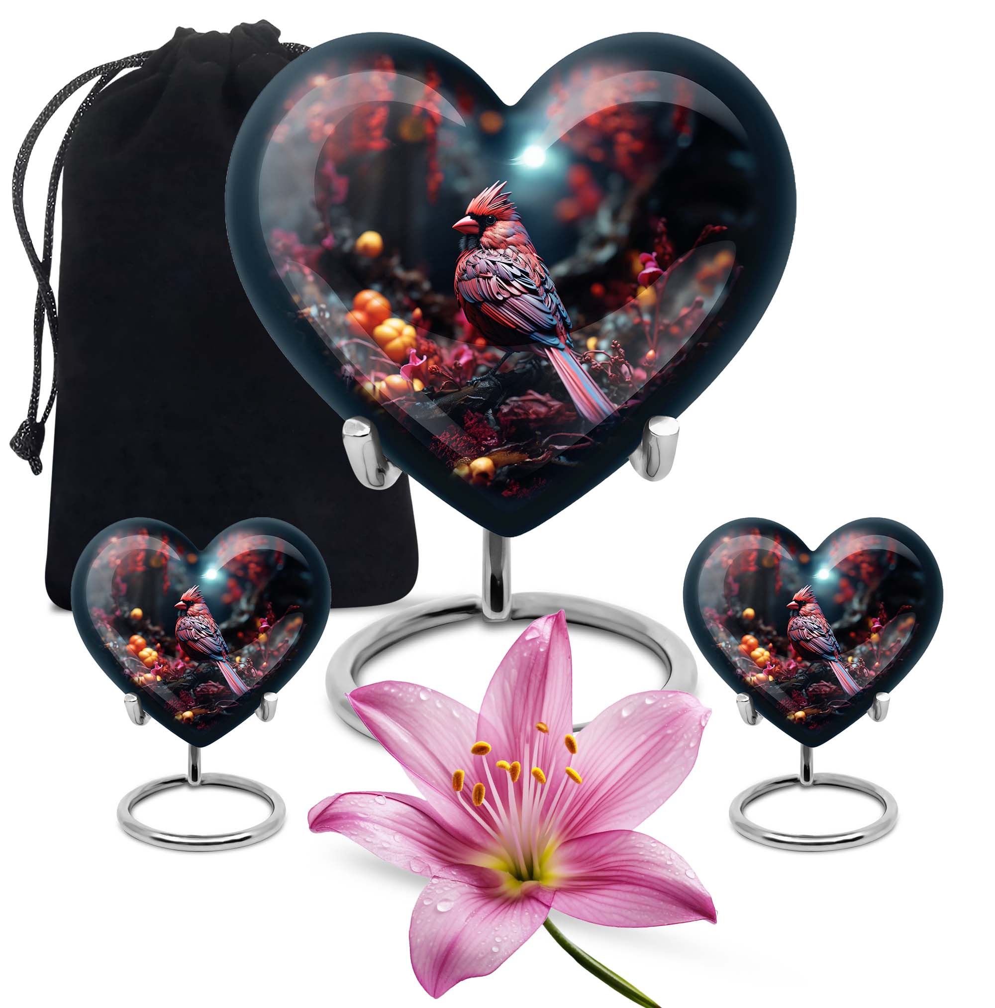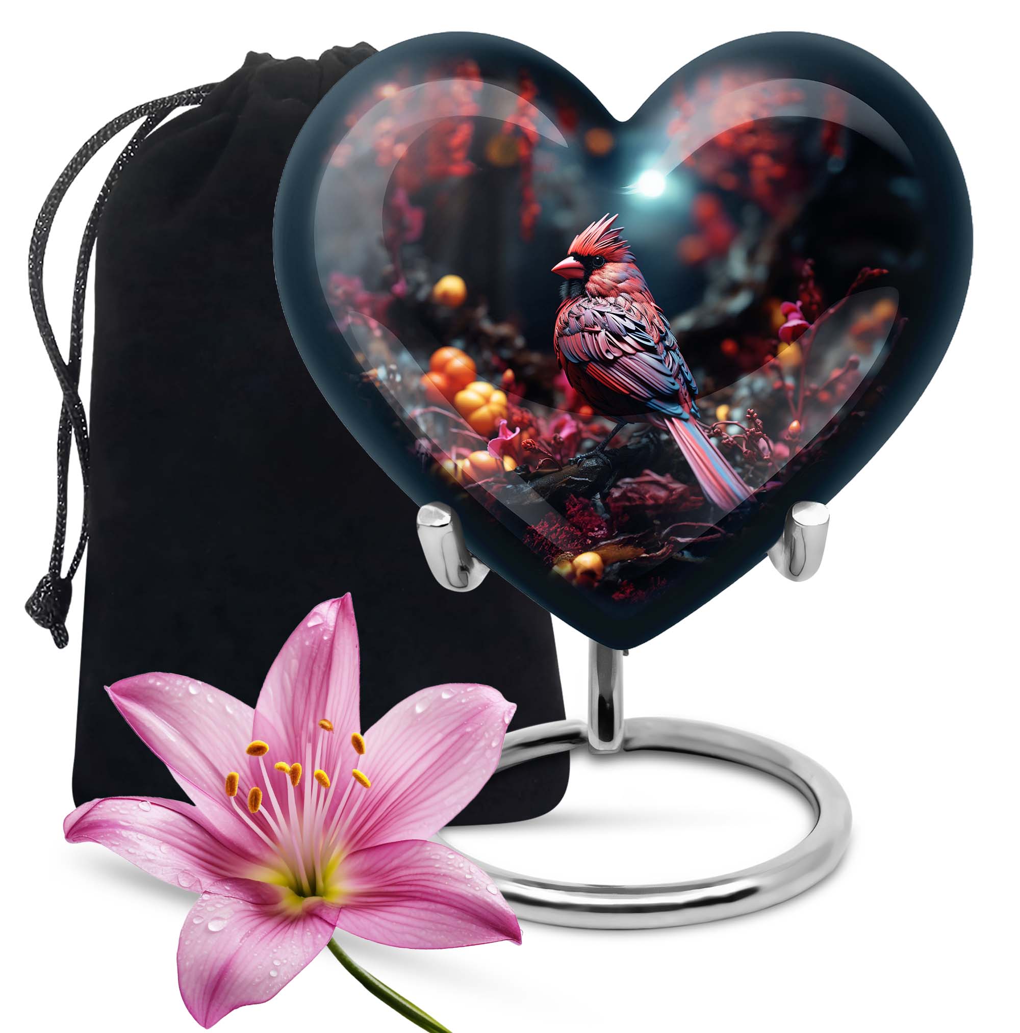 Immerse yourself in the tranquillity of connection, a representation of devotion, with our ‘Cardinal Bird Urn’. Soothingly polished, handcrafted from premium aluminium, this large urn is an amalgamation of strength, repose and fond memories. It stands 10 inches in height, weighing 3.3 pounds, exhibiting a level of substantial grandeur as well as the capacity to be subtly understated. This burial urn has been masterfully detailed with an abstract theme, mirroring the uniqueness of every life journey. What makes this swirl of emotions more personal is your ability to engrave a name, adding a layer of intimacy. The urn sits comfortably within a velvet pouch, aiding in safe containment and respect of your loved one's ashes. The ‘Cardinal Bird Urn’ confidently carves a niche for itself in your heart, bringing an echo of harmony that speaks to funeral extra large urn requirements, or simply as a shrine to keep human urn ashes. A superior choice within the ‘memorial urns’ domain, representing a bridge that links hearts across an ethereal divide.