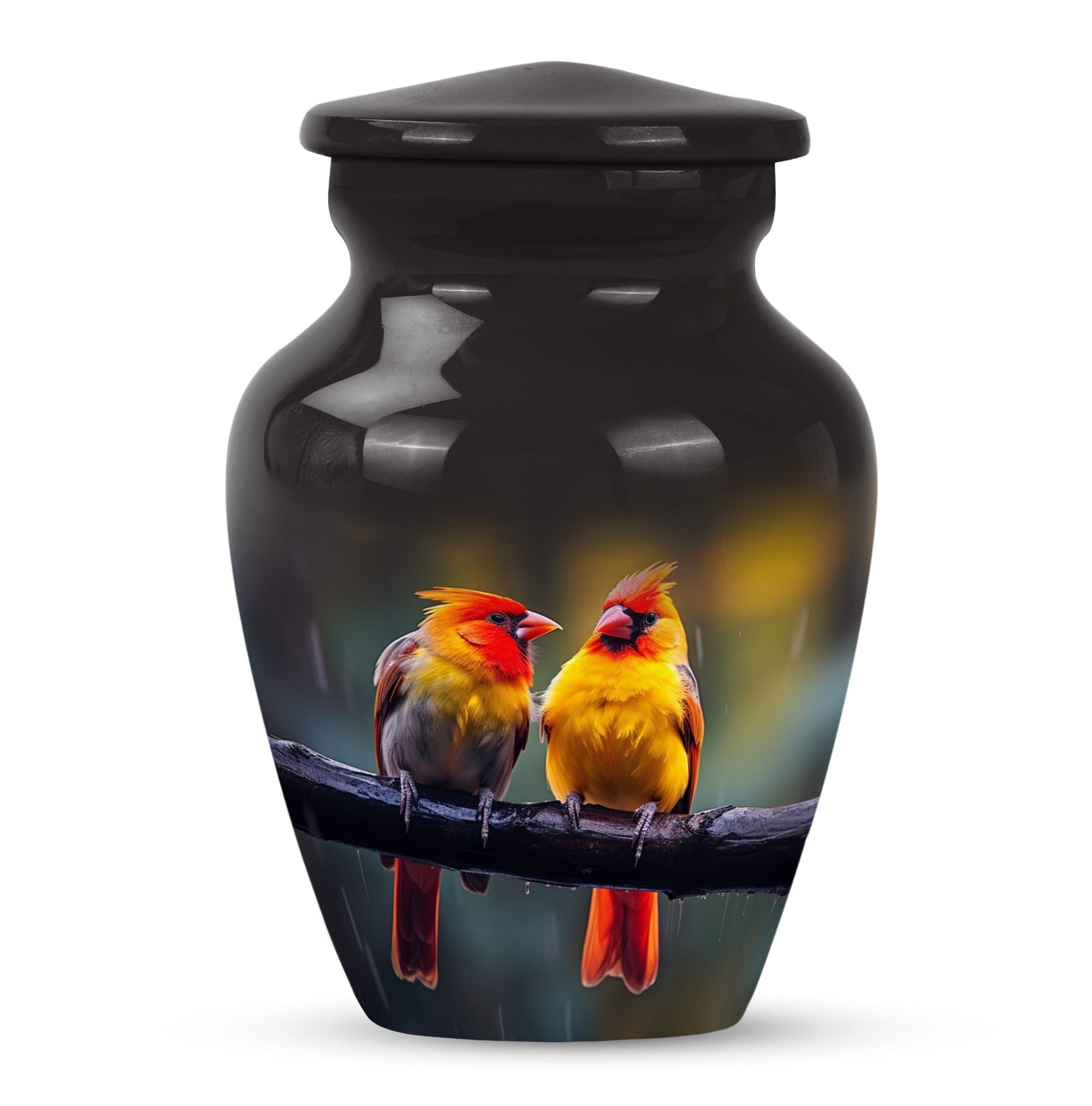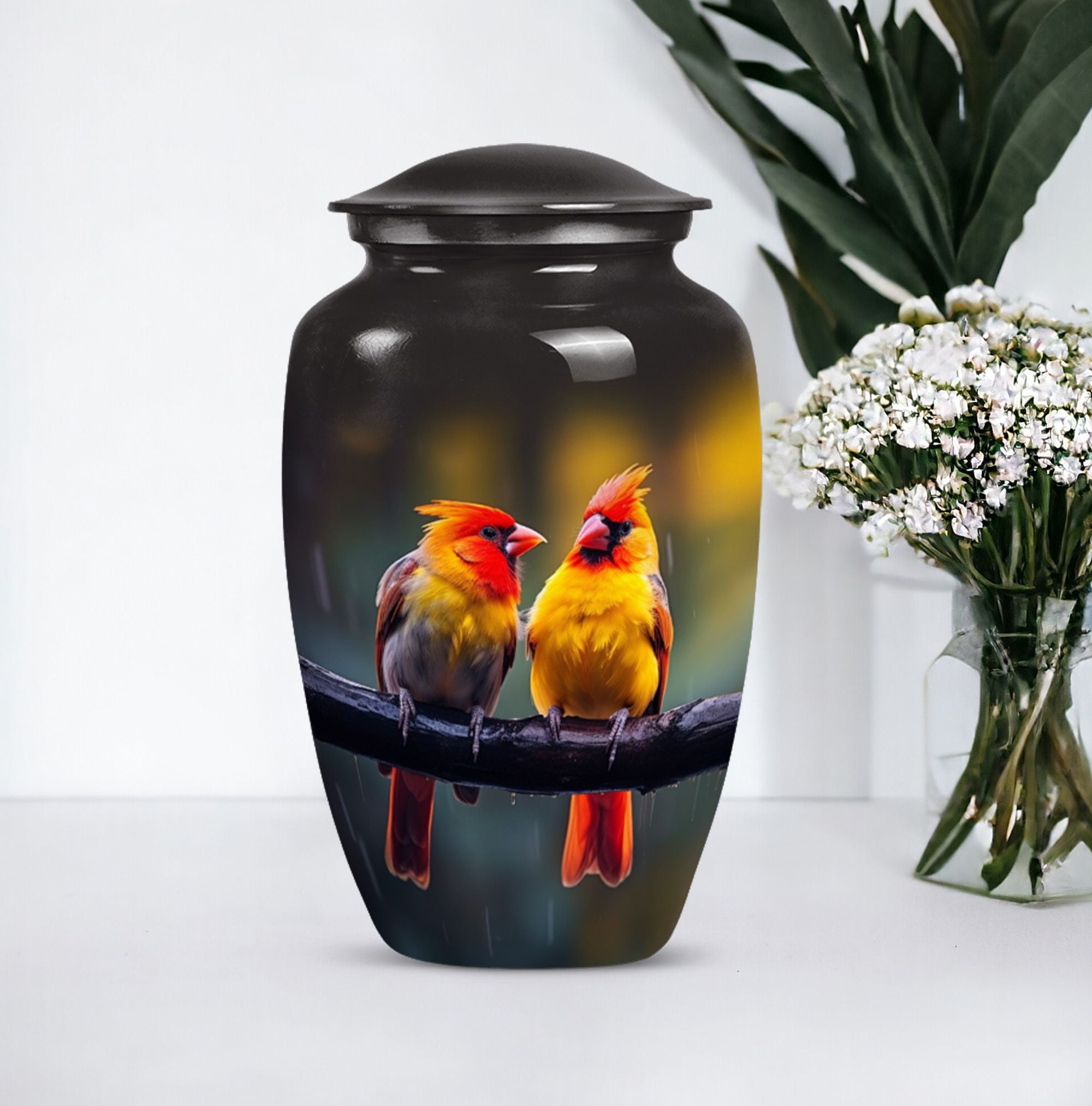 Crafted with care and encrusted with the enigmatic symbolism of a cardinal bird, this 10-inch classic urn serves as the perfect sanctity for your loved one's ashes. Weighing a sturdy 3.3 pounds, this urn is composed of durable aluminium sure to endure the cycles of time. With a generous capacity of 200 cubic inches, it graciously accommodates adult human ashes, juxtaposing abstract themes with tangible comfort. Each of our large urns comes with a velvet pouch, providing additional safe containment. The cardinal bird urn can be personalized, allowing you to engrave the names of your loved ones, adding a heartfelt touch to this solemn possession. Uncommon phrases to consider when seeking such commemorative items might be 'human ash adult,' 'cremation medium urns for human ashes,' or 'funeral cremation urns.' Reflect on the moments, cherish the memories, and honor your treasured ones with this exquisite memorial urn.
