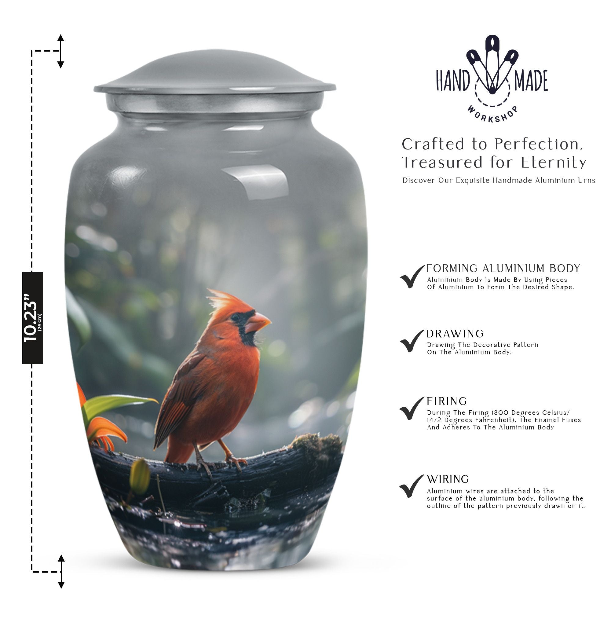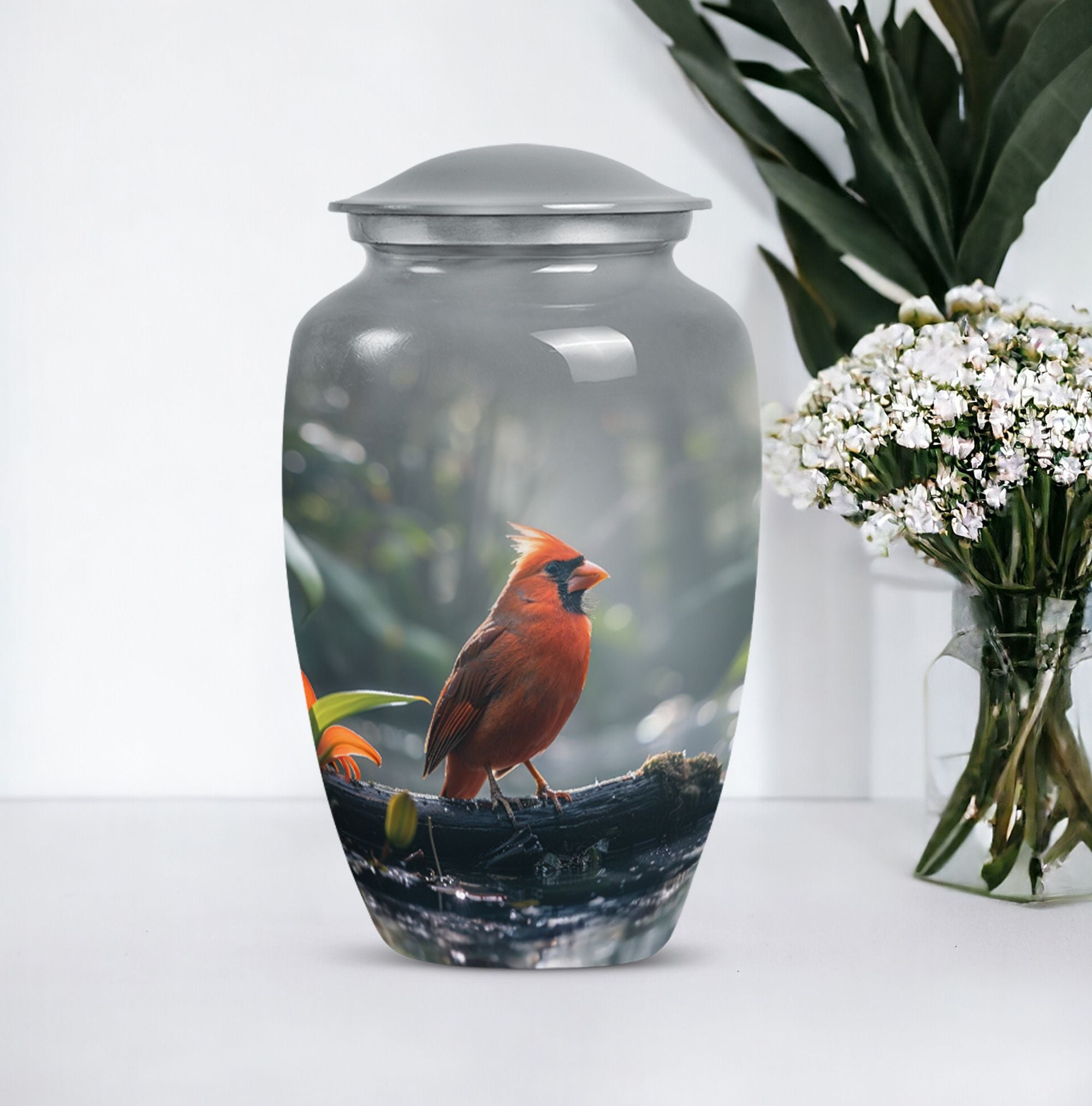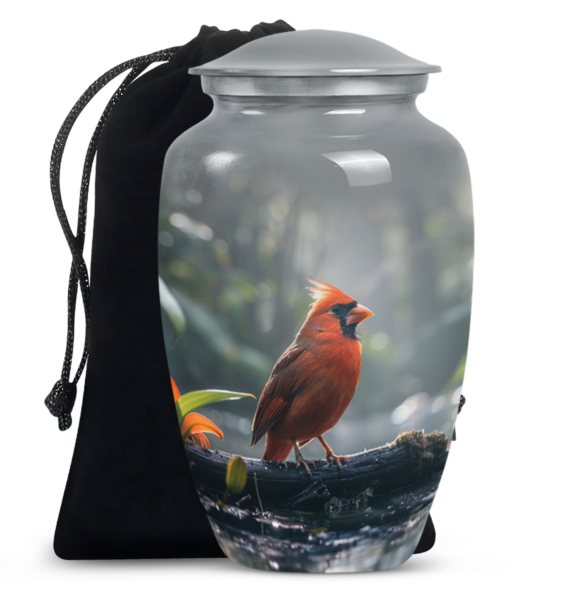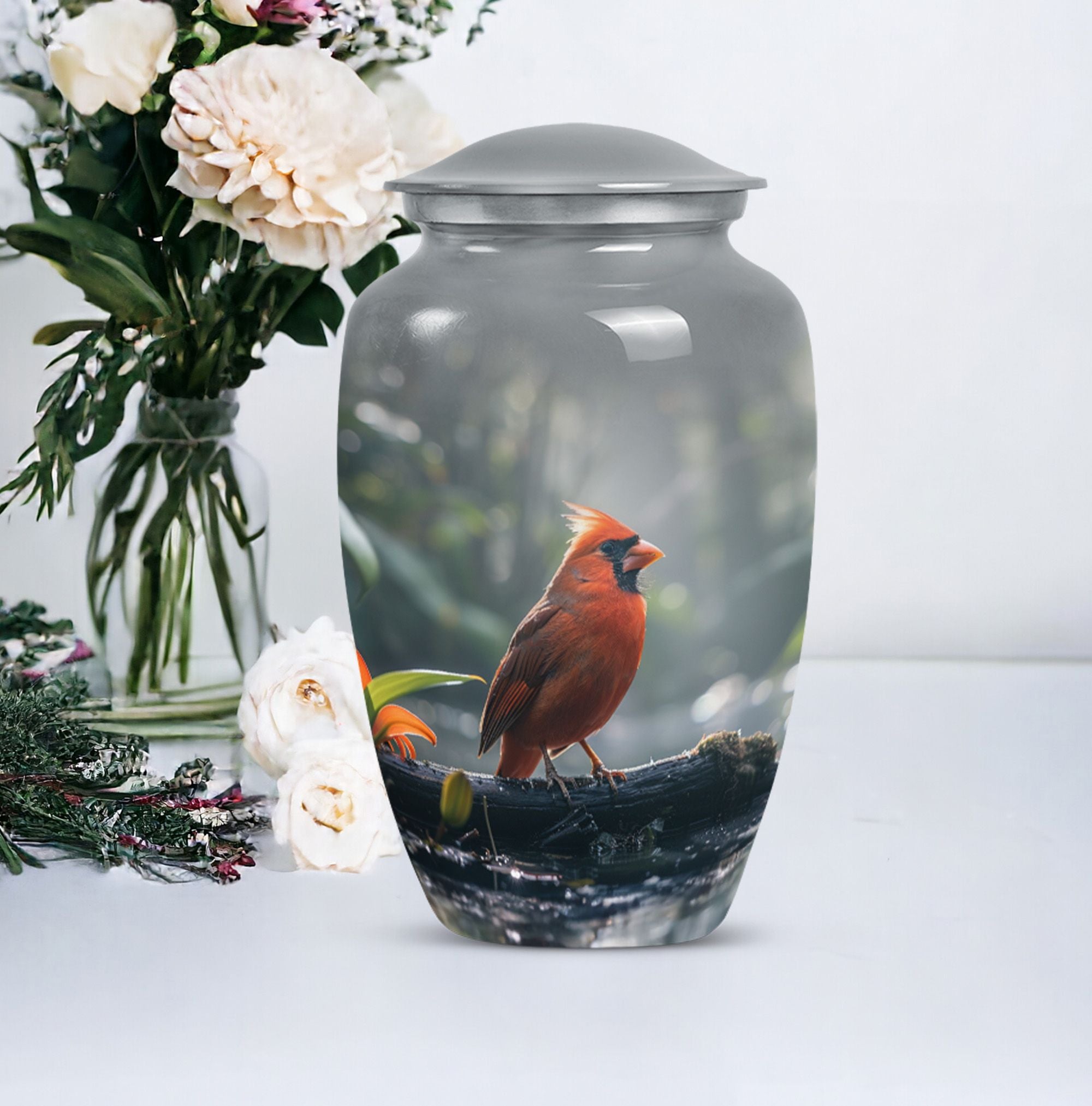 Introducing our Cardinal Bird Urn, a touching tribute to symbolize eternal peace for your loved ones who have passed on. This product is part of our large urns collection specifically designed for adult human ashes. Crafted from sturdy, lightweight aluminium, our Urn measures 10 inches in height, effortlessly balancing visual appeal with resilience. Its capacity for containment is generous at 200 cubic inches - a respectful resting place for the ashes of an adult male or female. The urn is easily customizable - a special feature that allows you to personalize with engraved names, adding a heartfelt touch to remember your loved ones by. The Urn comes with a velvet pouch, ensuring the respected ashes are carefully and safely contained. Its abstract theme reflects an artistic and meaningful sentiment. The Cardinal Bird Urn is more than a cremation urn; it's a tasteful reflection of life, love, and the journey that lies beyond.