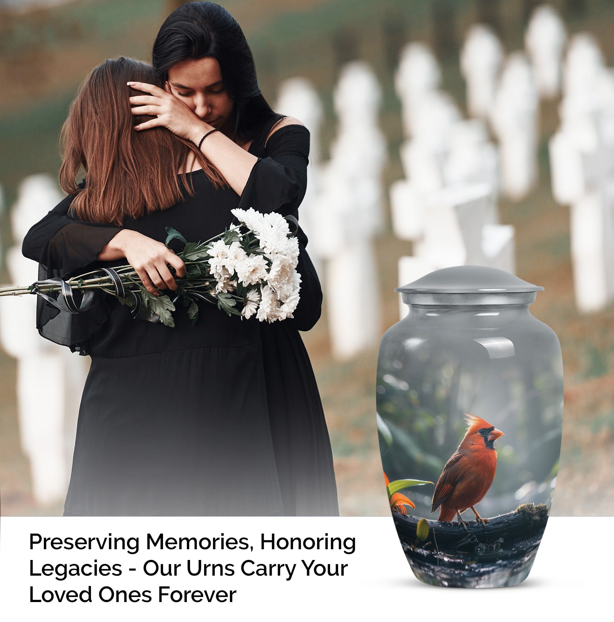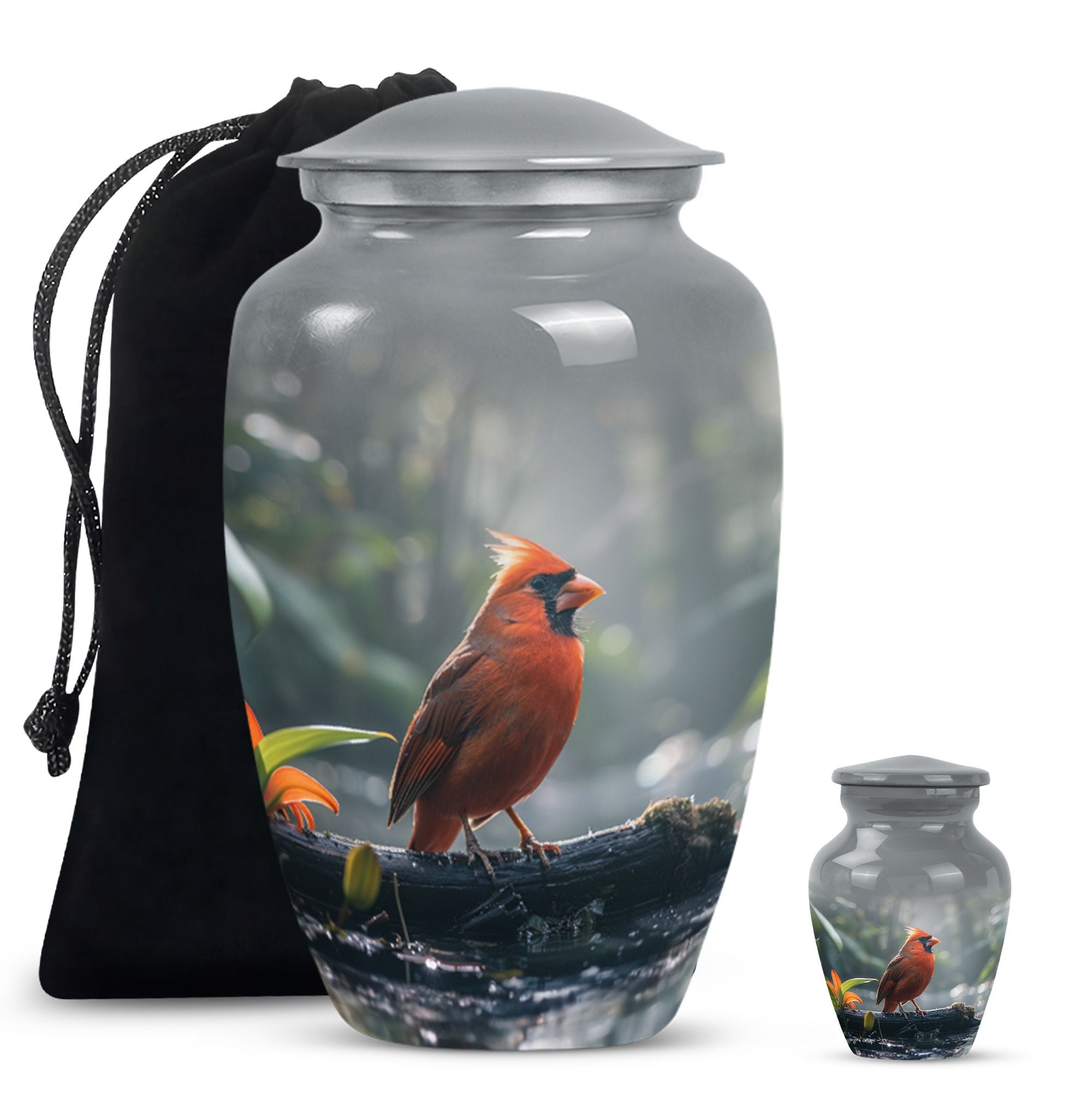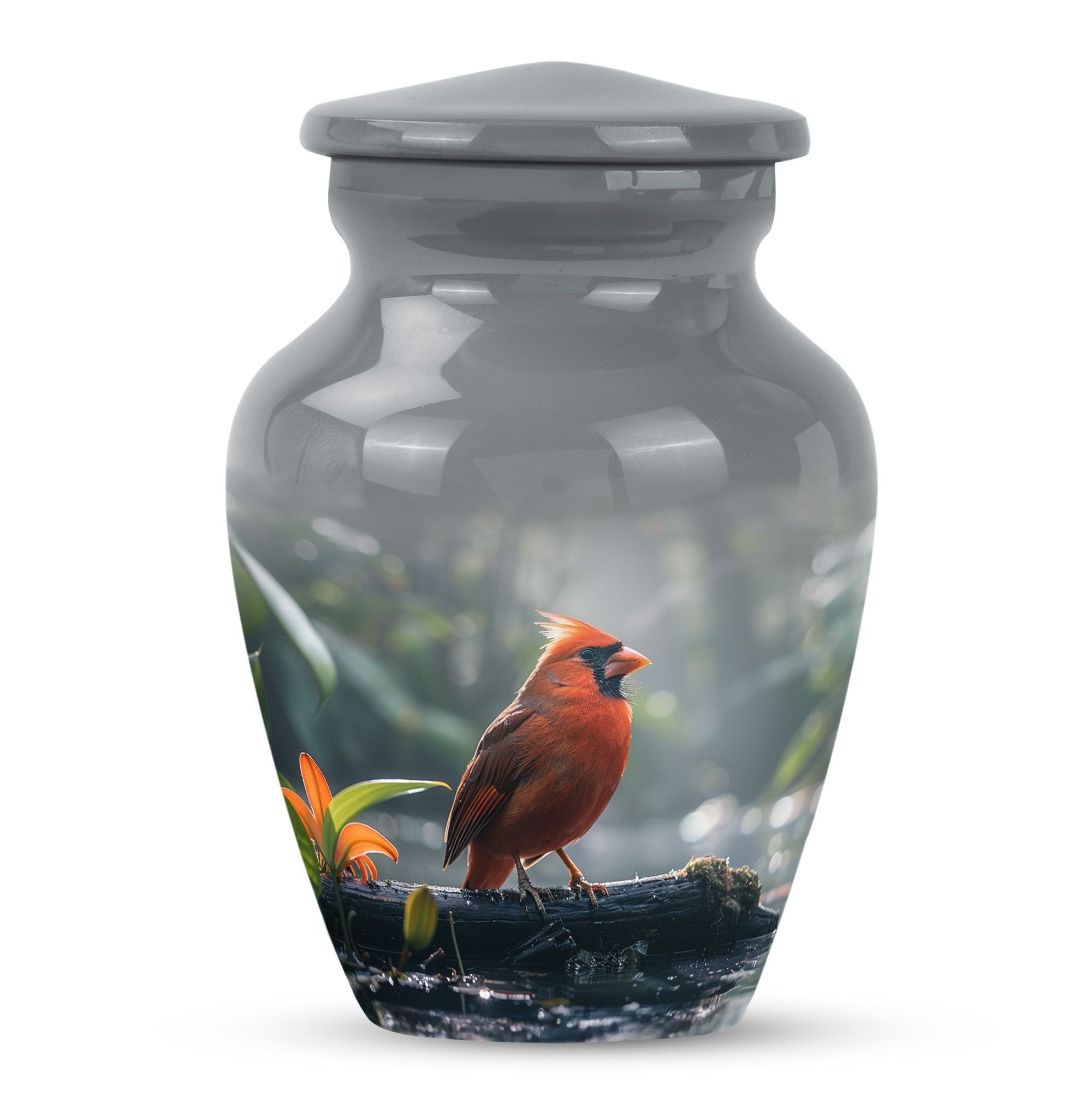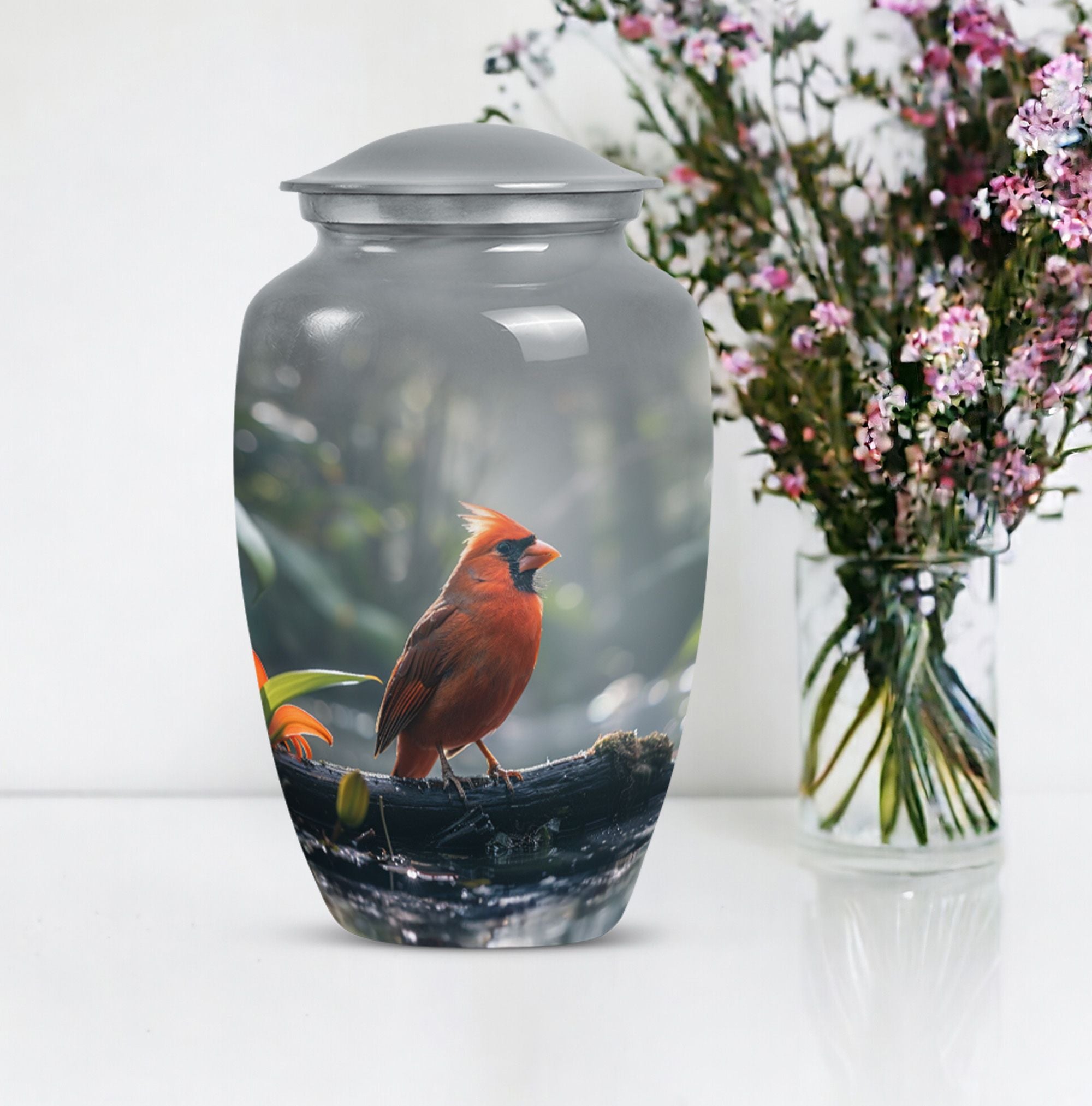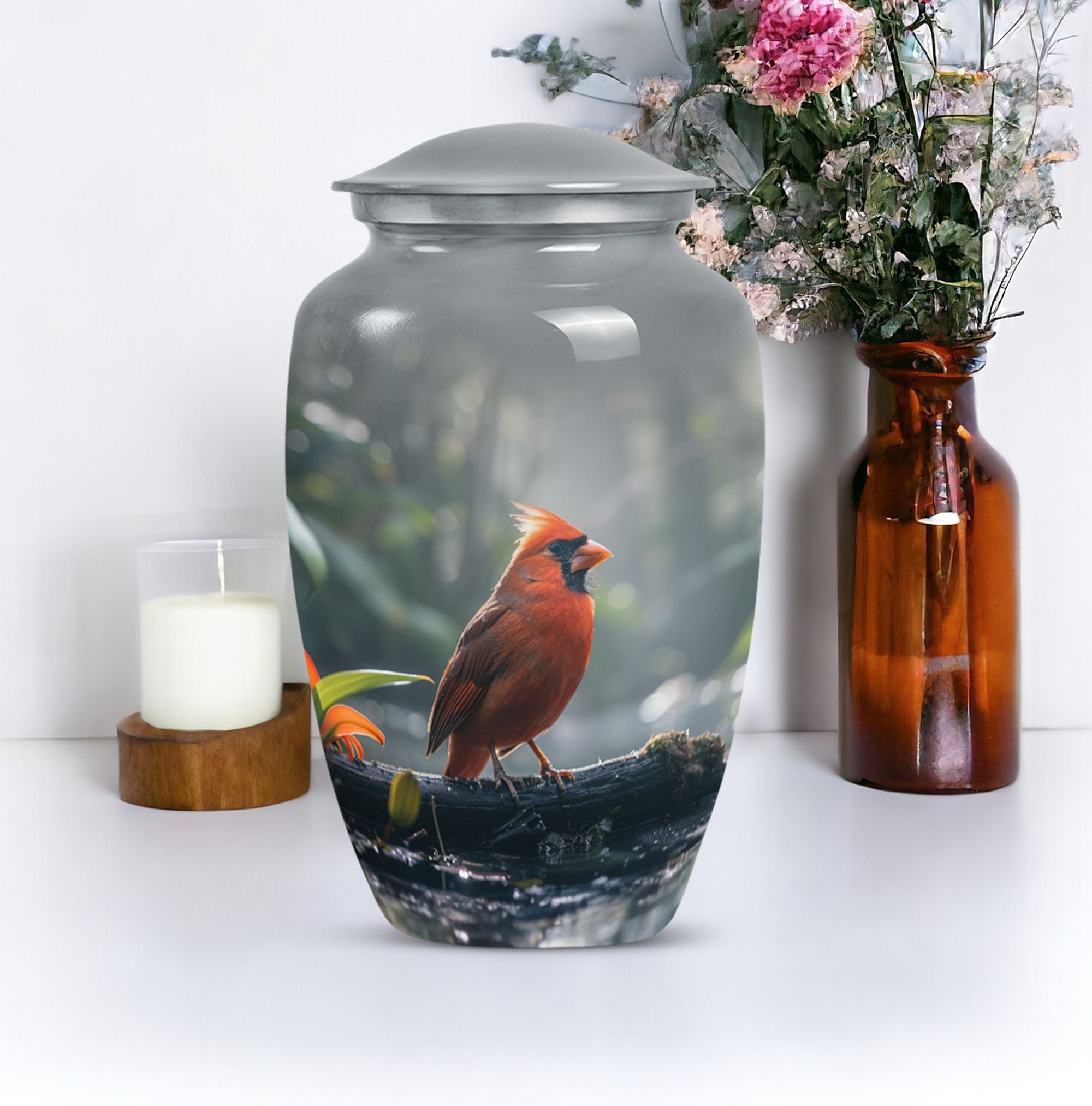 Introducing our Cardinal Bird Urn, a touching tribute to symbolize eternal peace for your loved ones who have passed on. This product is part of our large urns collection specifically designed for adult human ashes. Crafted from sturdy, lightweight aluminium, our Urn measures 10 inches in height, effortlessly balancing visual appeal with resilience. Its capacity for containment is generous at 200 cubic inches - a respectful resting place for the ashes of an adult male or female. The urn is easily customizable - a special feature that allows you to personalize with engraved names, adding a heartfelt touch to remember your loved ones by. The Urn comes with a velvet pouch, ensuring the respected ashes are carefully and safely contained. Its abstract theme reflects an artistic and meaningful sentiment. The Cardinal Bird Urn is more than a cremation urn; it's a tasteful reflection of life, love, and the journey that lies beyond.