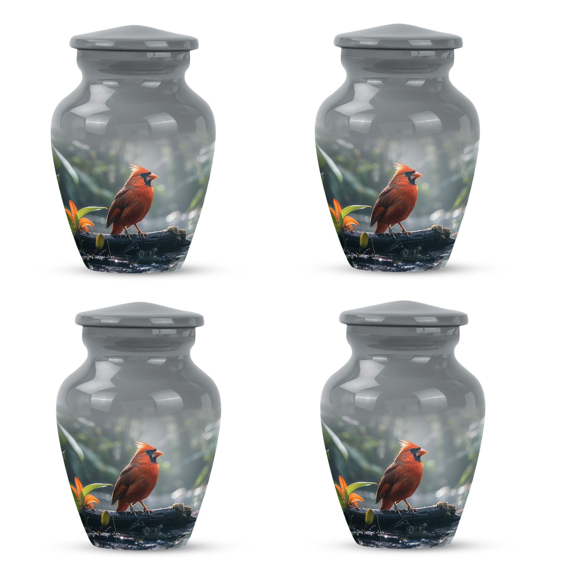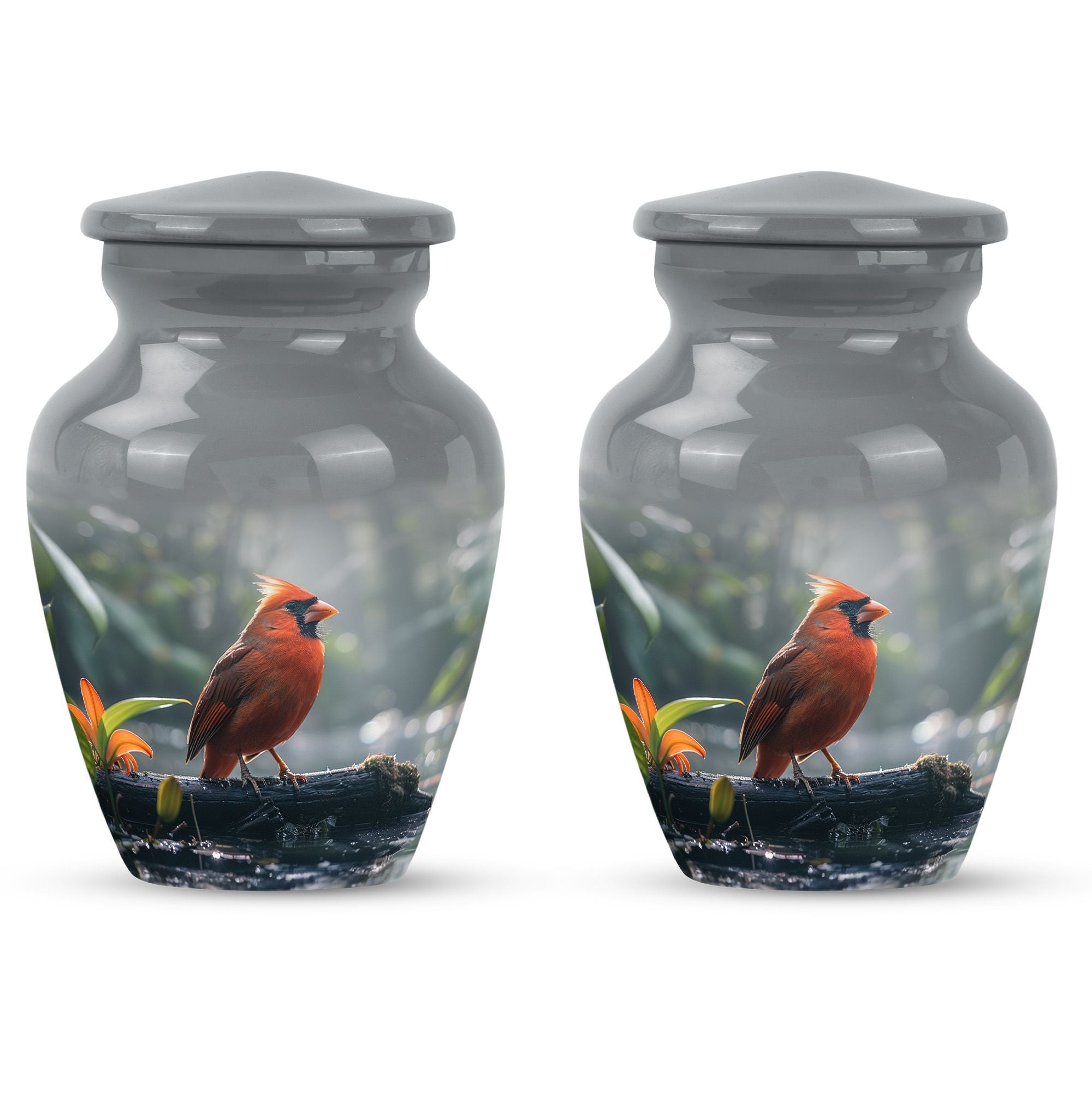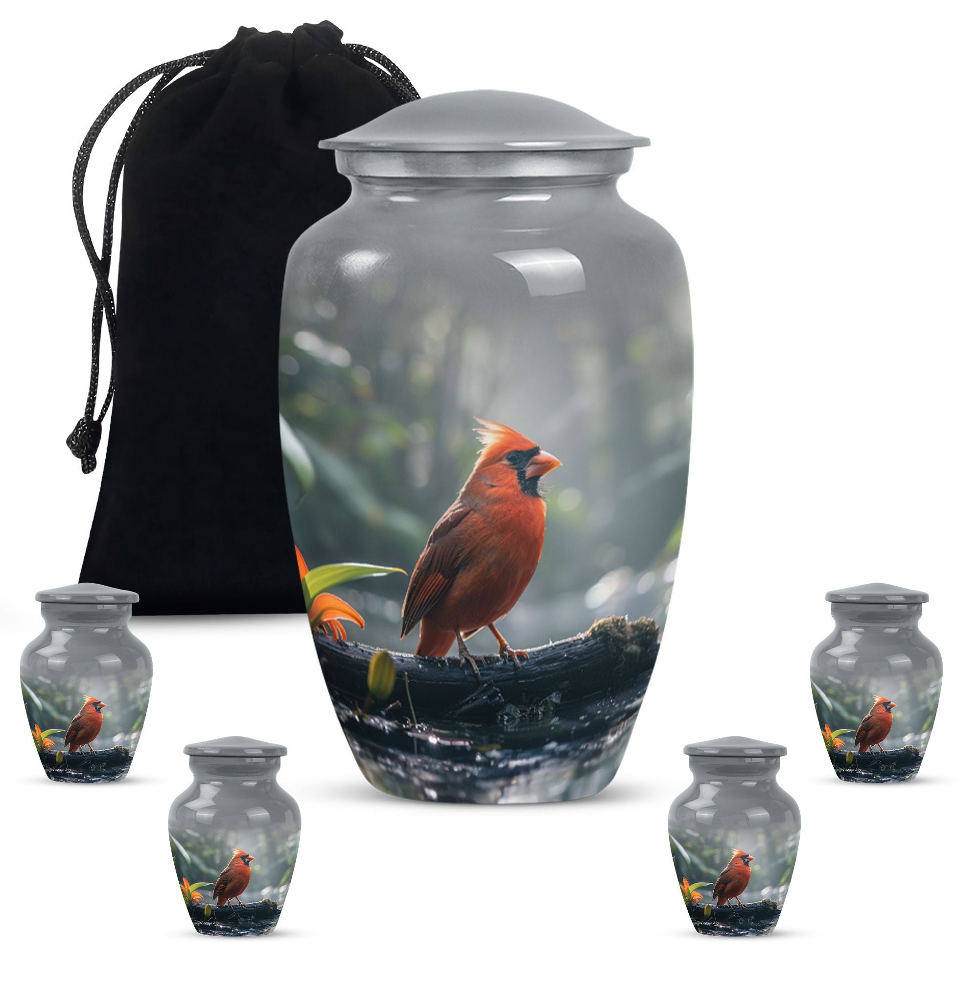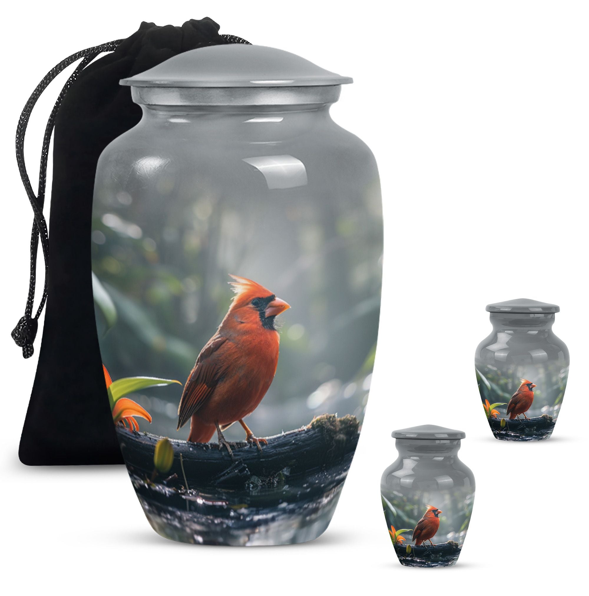 Introducing our Cardinal Bird Urn, a touching tribute to symbolize eternal peace for your loved ones who have passed on. This product is part of our large urns collection specifically designed for adult human ashes. Crafted from sturdy, lightweight aluminium, our Urn measures 10 inches in height, effortlessly balancing visual appeal with resilience. Its capacity for containment is generous at 200 cubic inches - a respectful resting place for the ashes of an adult male or female. The urn is easily customizable - a special feature that allows you to personalize with engraved names, adding a heartfelt touch to remember your loved ones by. The Urn comes with a velvet pouch, ensuring the respected ashes are carefully and safely contained. Its abstract theme reflects an artistic and meaningful sentiment. The Cardinal Bird Urn is more than a cremation urn; it's a tasteful reflection of life, love, and the journey that lies beyond.
