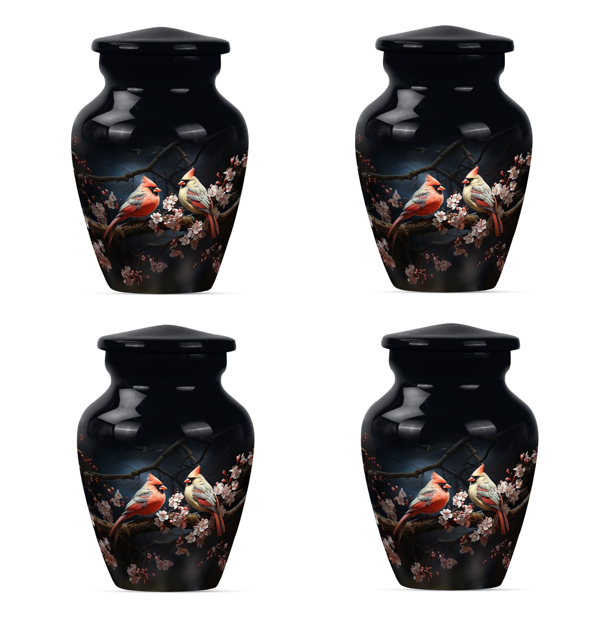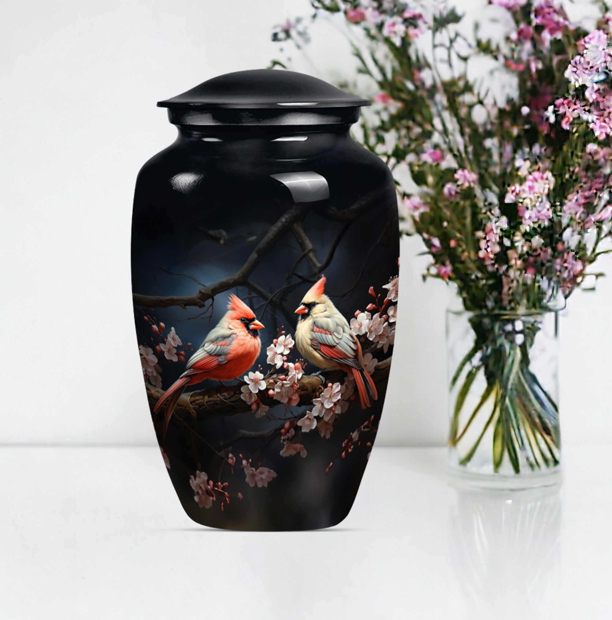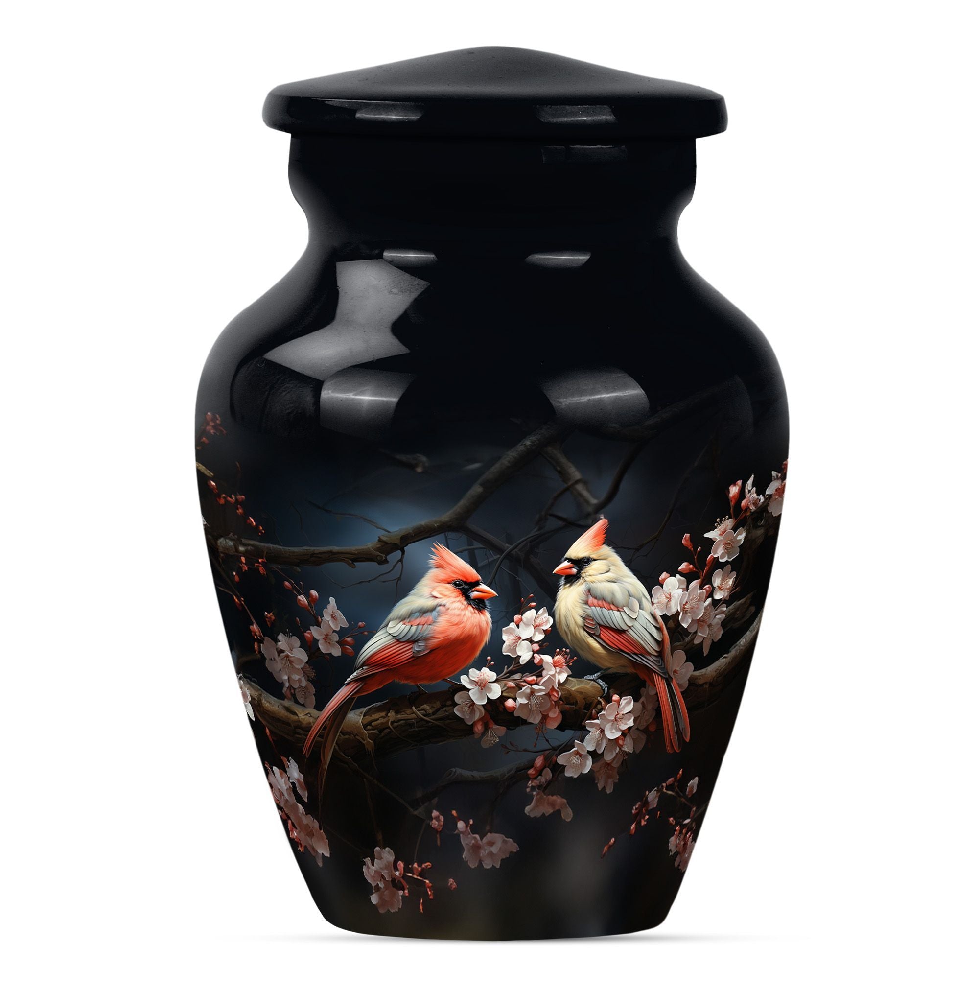Discover the Cardinal bird urn, a timeless and tasteful memorabilia for your loved ones in the form of funeral urns, specifically designed for an adult male dad. This urn, standing 10 inches tall, is an exemplary specimen in the large urns category that can contain approximately 200 cubic inches of matter. Crafted meticulously with superior quality aluminium, it weighs a substantial but not overbearing 3.3 pounds. Adding to its exclusivity, each urn can be personalized with engraved names, making it even more special and close to your heart. Along with the urn, a gentle velvet pouch is provided for containing ashes, safeguarding them with dignity and respect. The theme captures the emotional essence of a wolf howling, symbolizing strength, freedom, and the existence of strong familial connections. As one of the sophisticated memorial urns, it is also suitable as cremation urns for mom or any adult woman. This urn balances ceremonial respect with elegant design, serving as a fitting tribute to the memories of your loved ones.