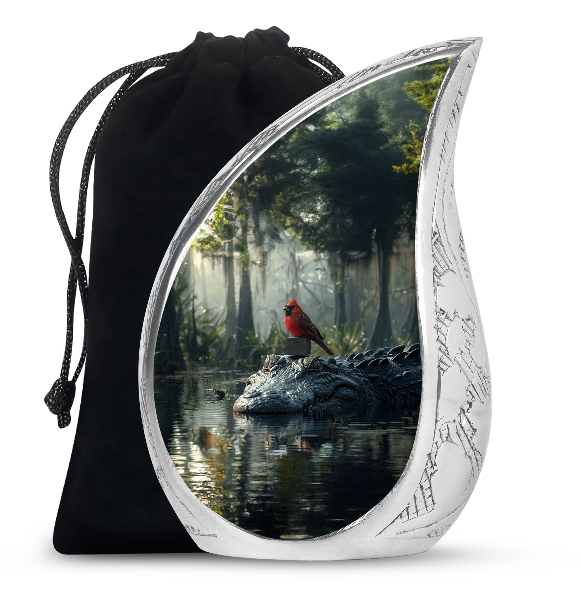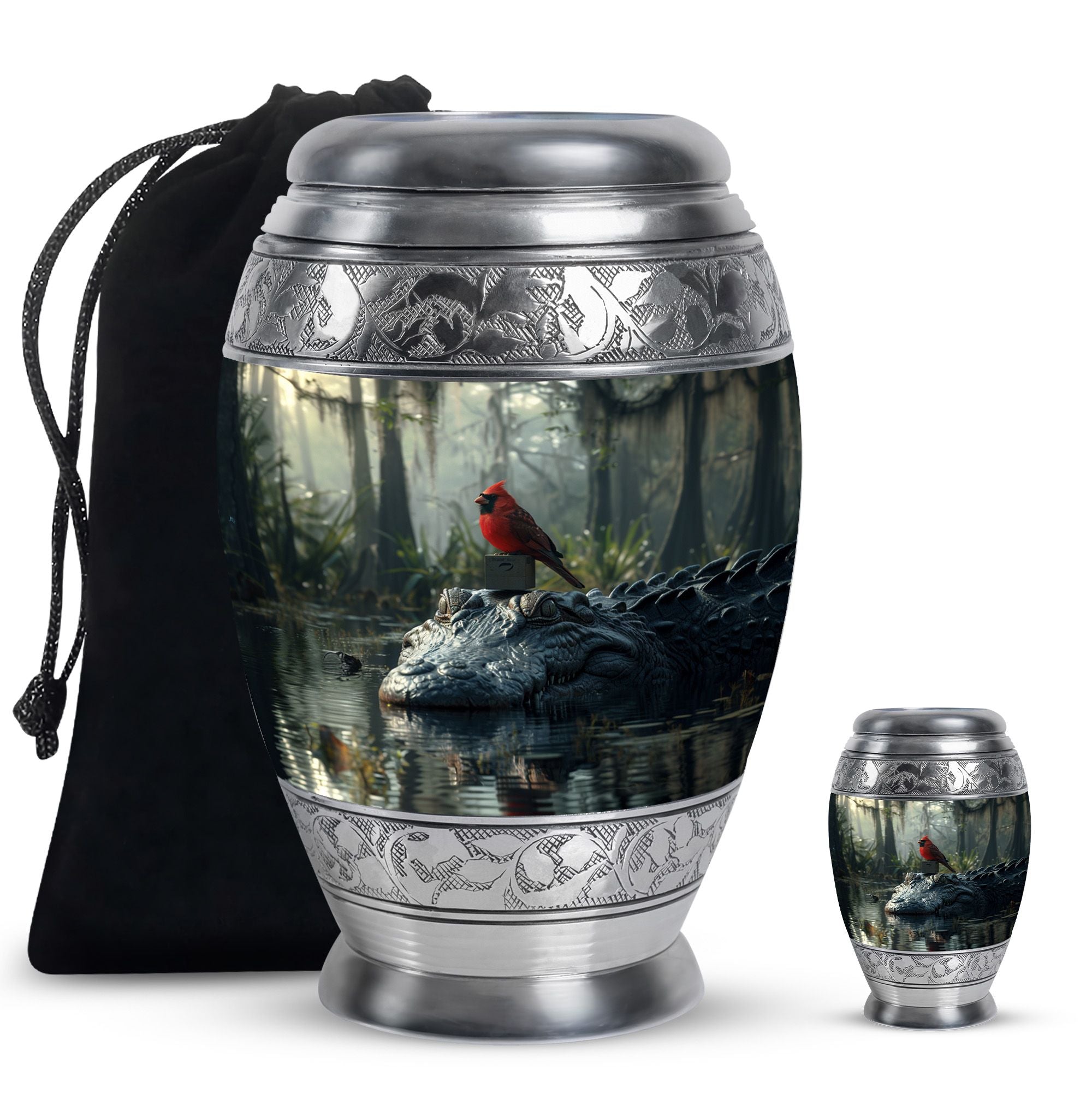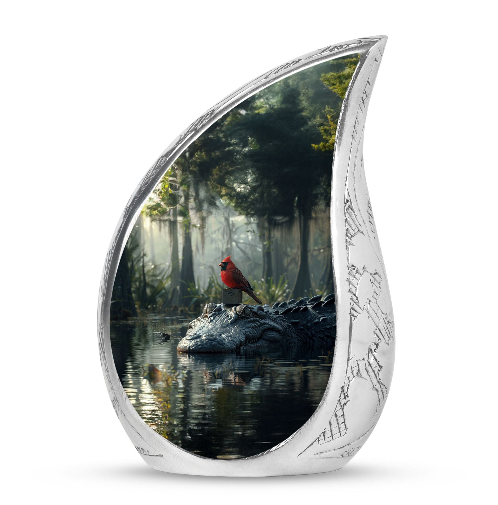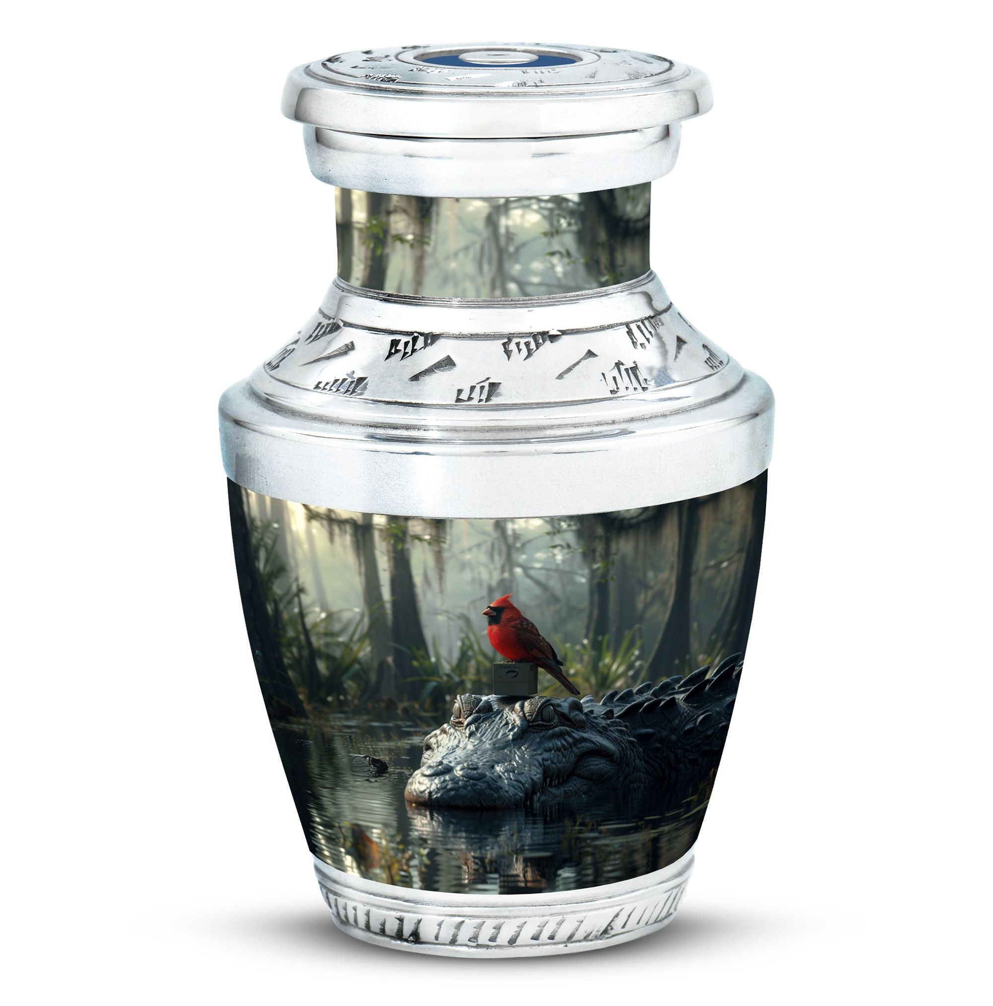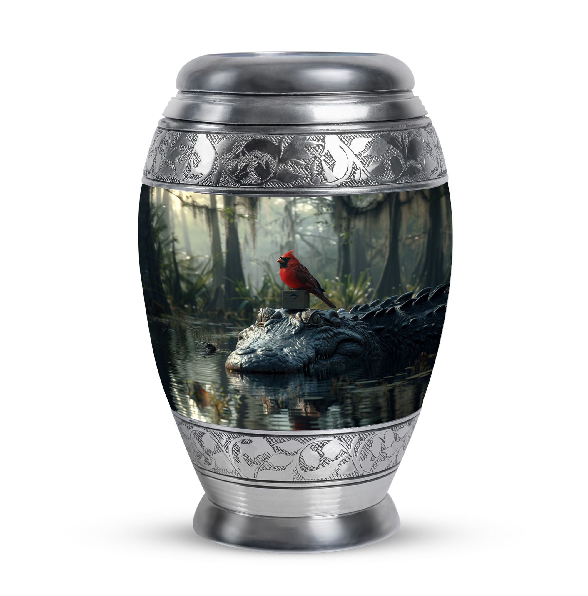Crafted from durable aluminium, this urn showcases a unique crocodile-inspired finish paired with a graceful cardinal bird design, symbolizing hope and remembrance. Its secure screw-top lid makes it reliable for use as adult cremation urns, cremation urn human ashes, or small cremation urns for ashes, blending practicality with artistry.