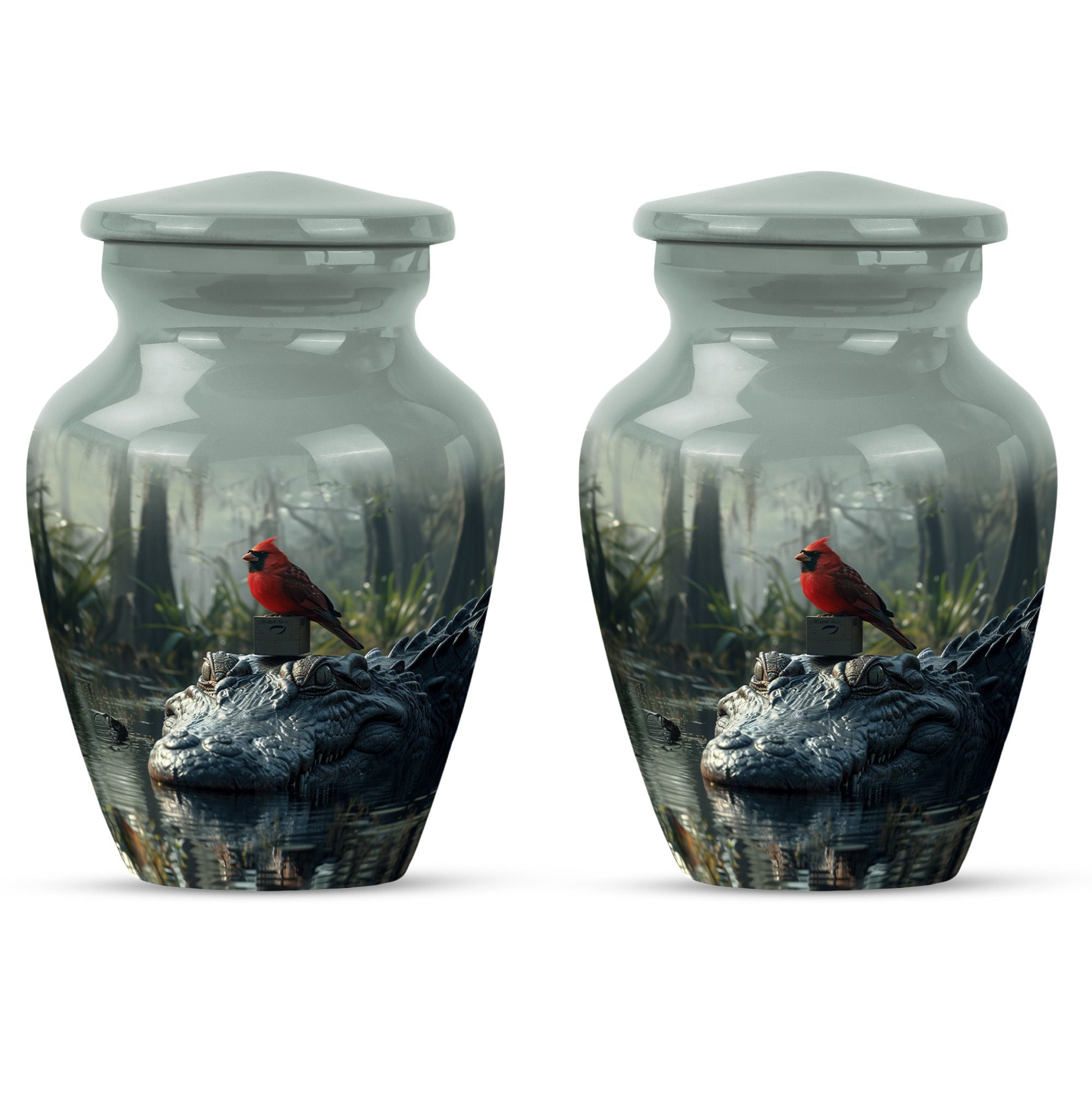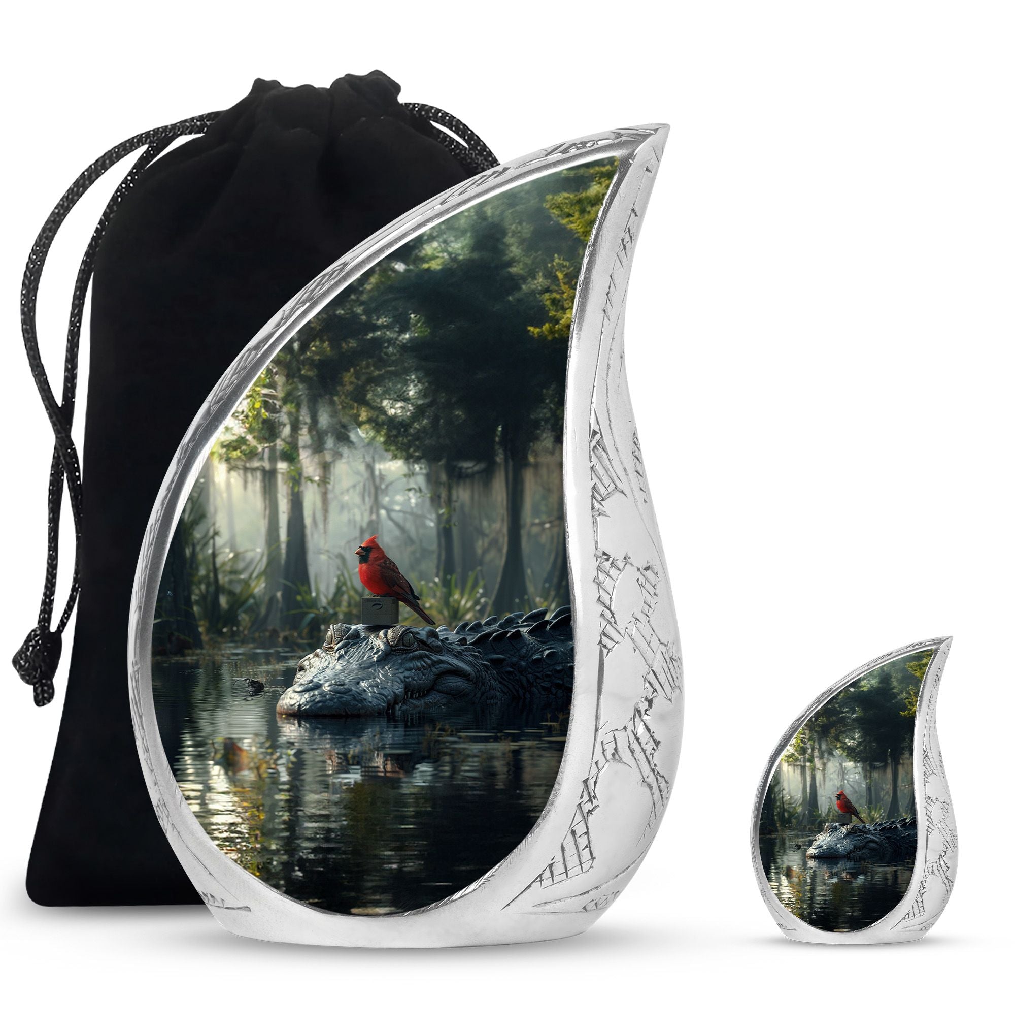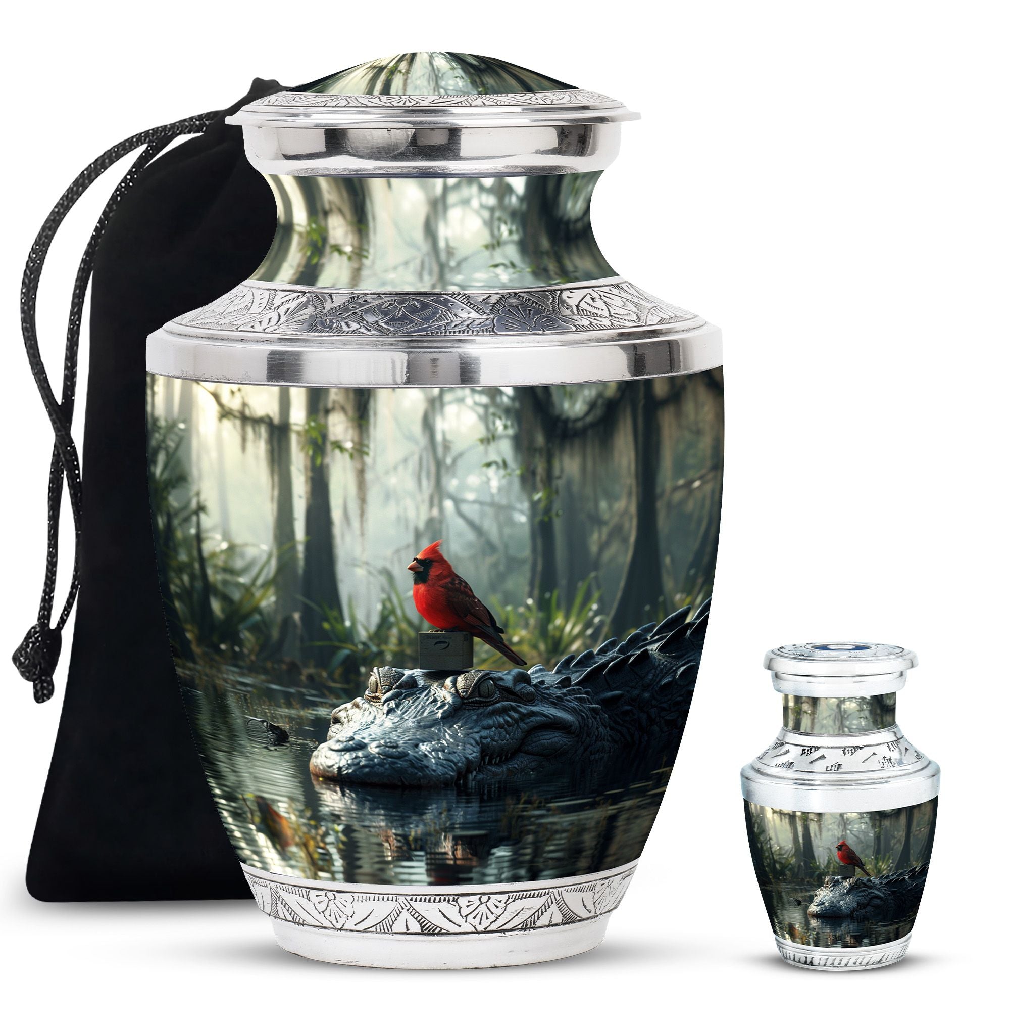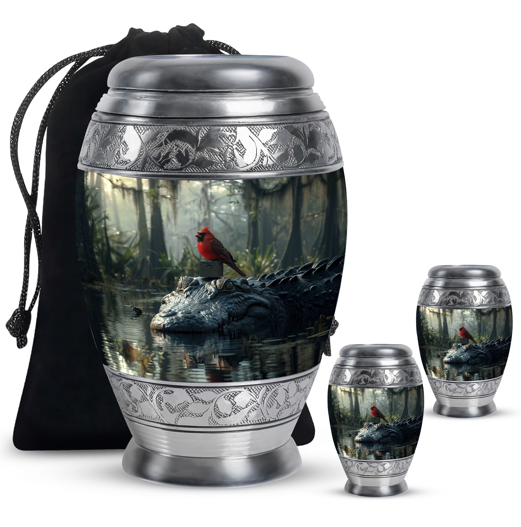 Crafted from durable aluminium, this urn showcases a unique crocodile-inspired finish paired with a graceful cardinal bird design, symbolizing hope and remembrance. Its secure screw-top lid makes it reliable for use as adult cremation urns, cremation urn human ashes, or small cremation urns for ashes, blending practicality with artistry.