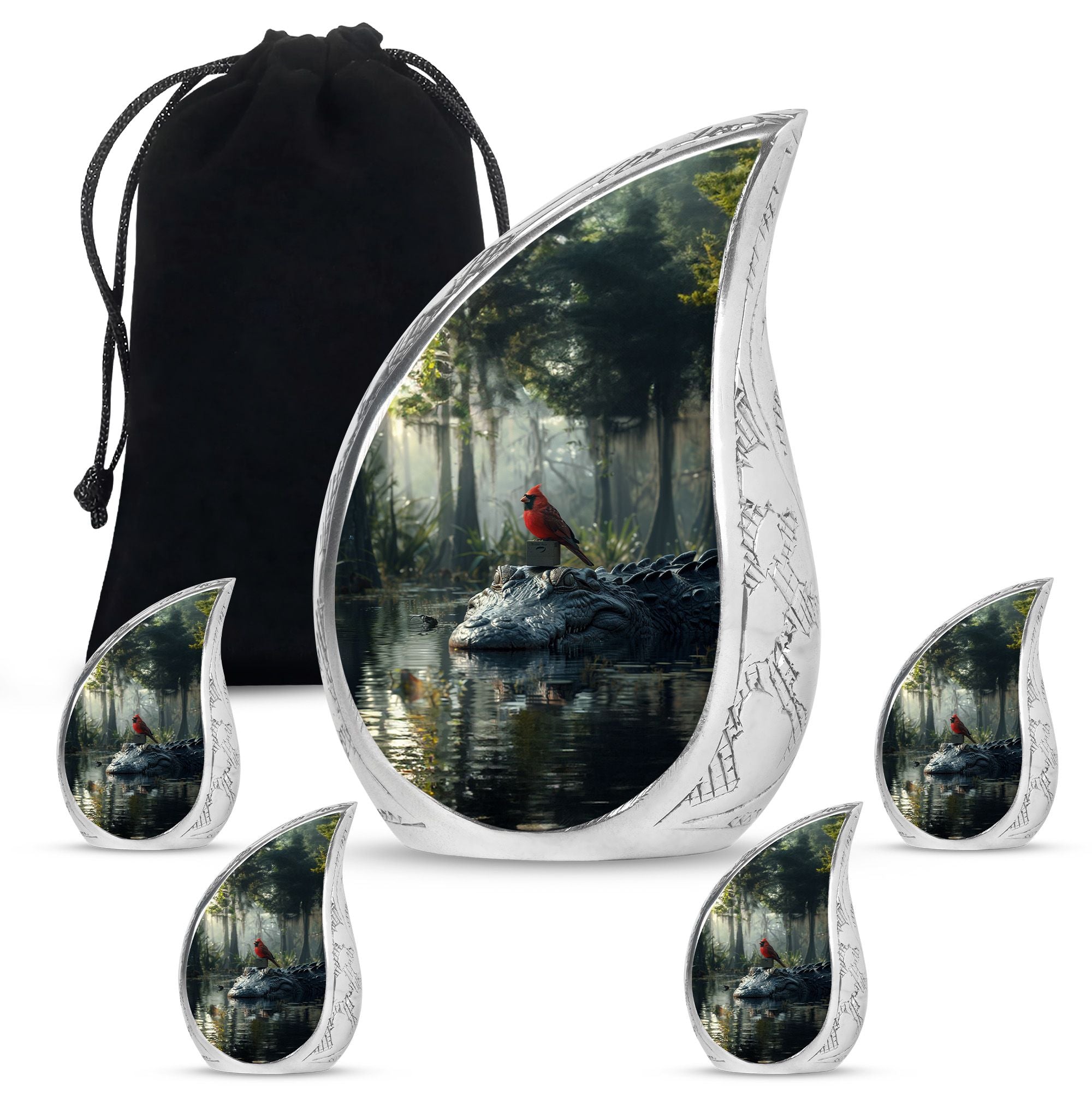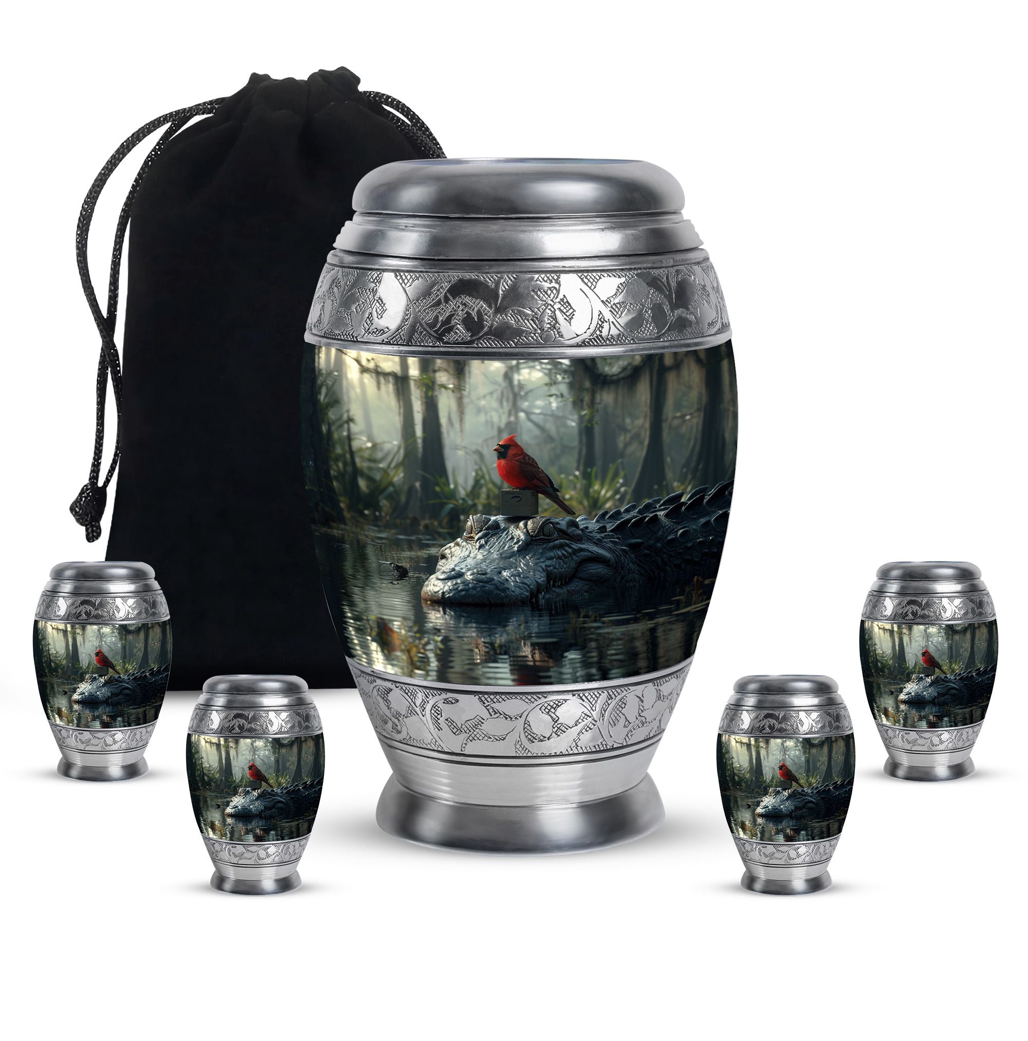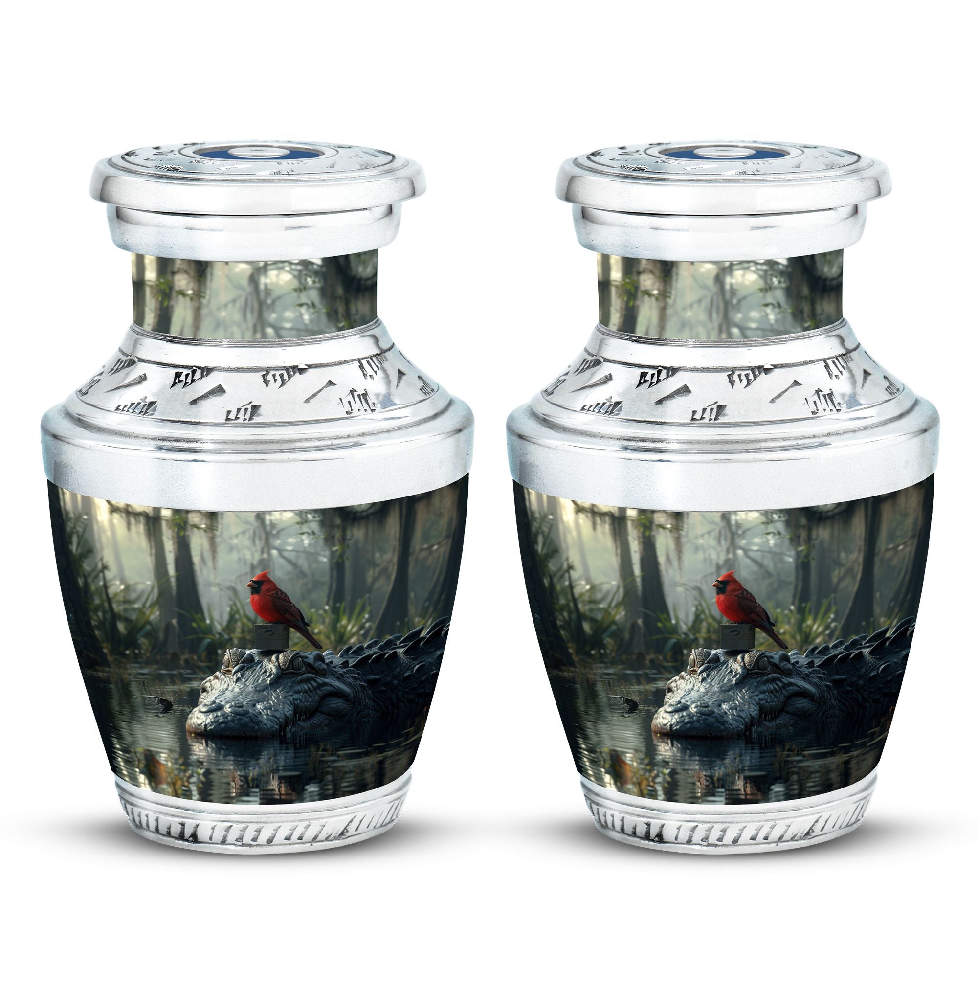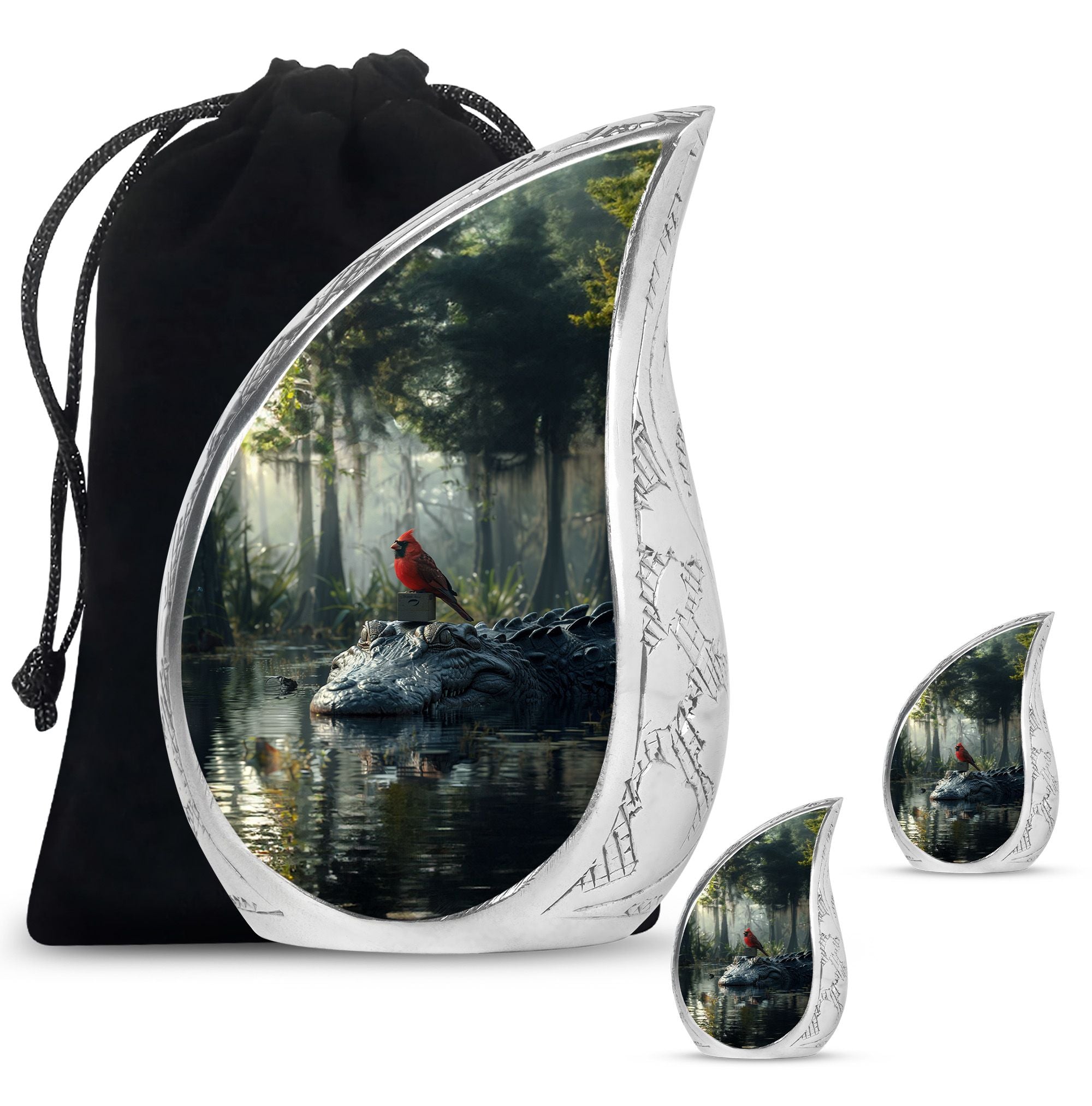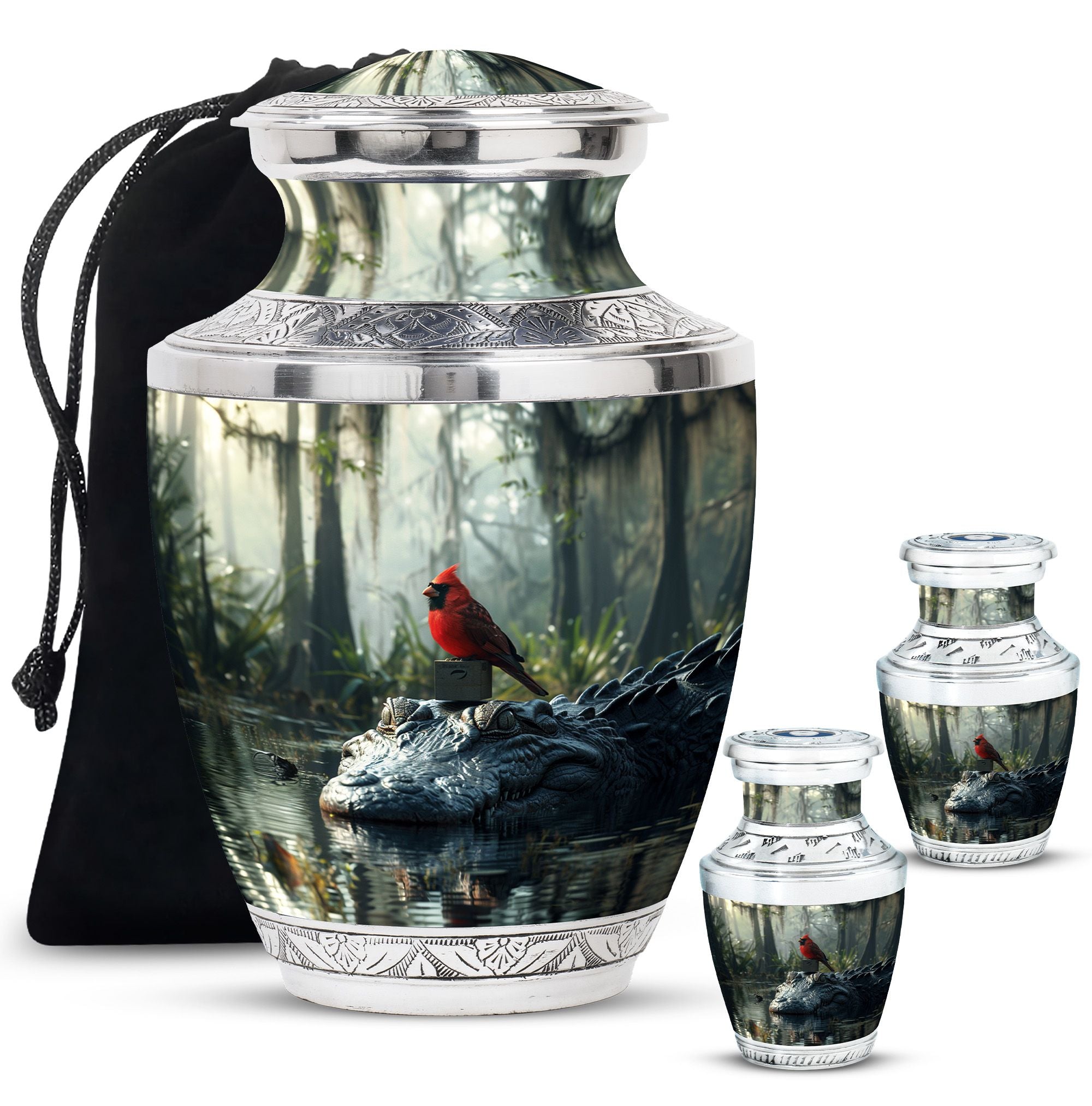 Crafted from durable aluminium, this urn showcases a unique crocodile-inspired finish paired with a graceful cardinal bird design, symbolizing hope and remembrance. Its secure screw-top lid makes it reliable for use as adult cremation urns, cremation urn human ashes, or small cremation urns for ashes, blending practicality with artistry.