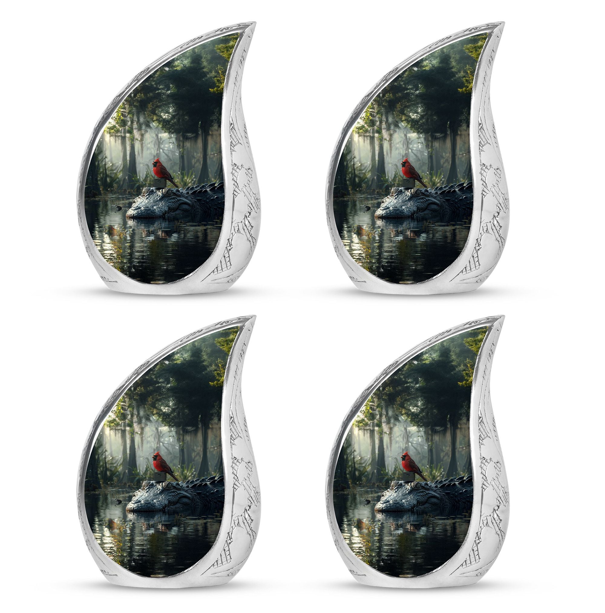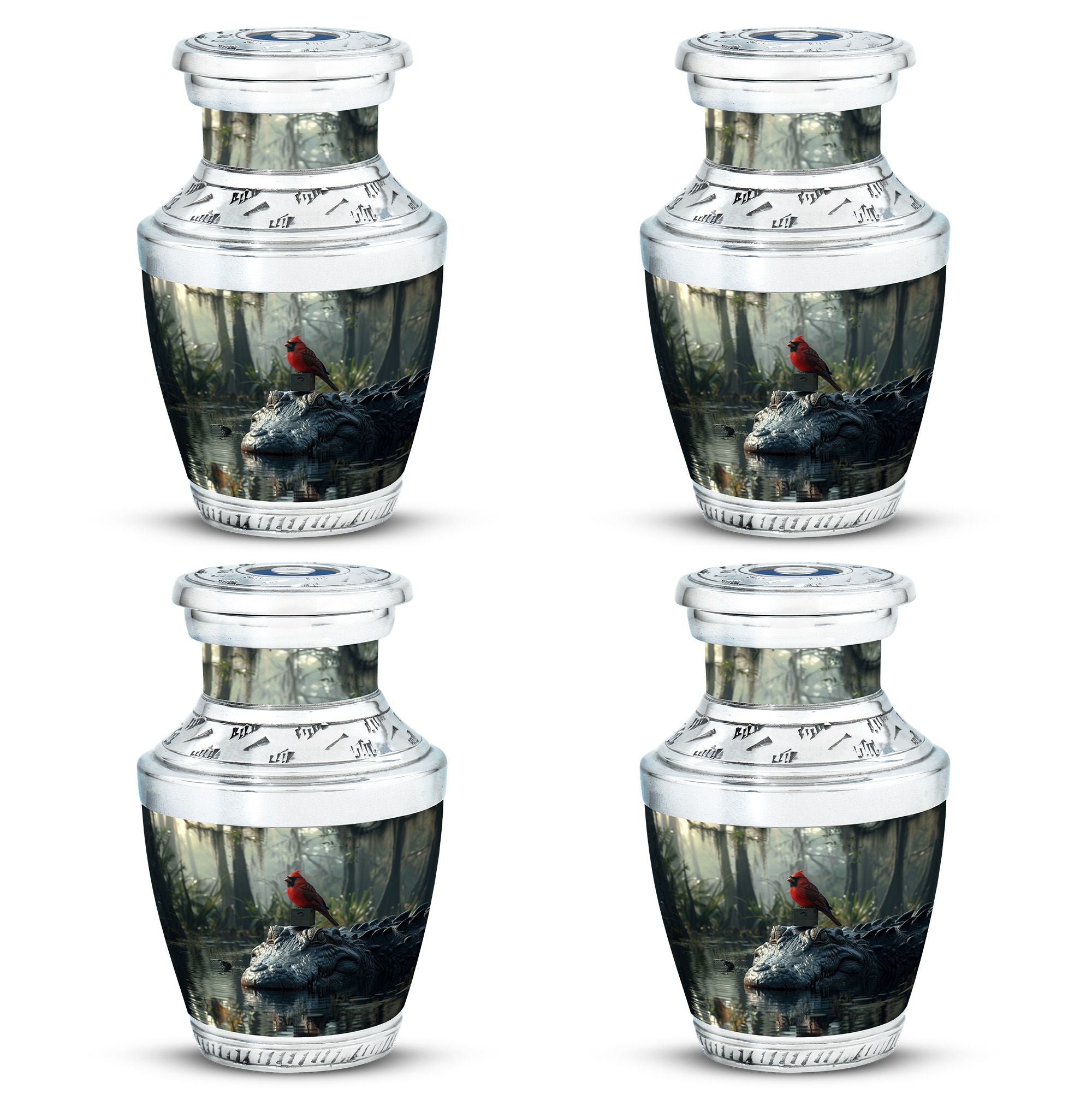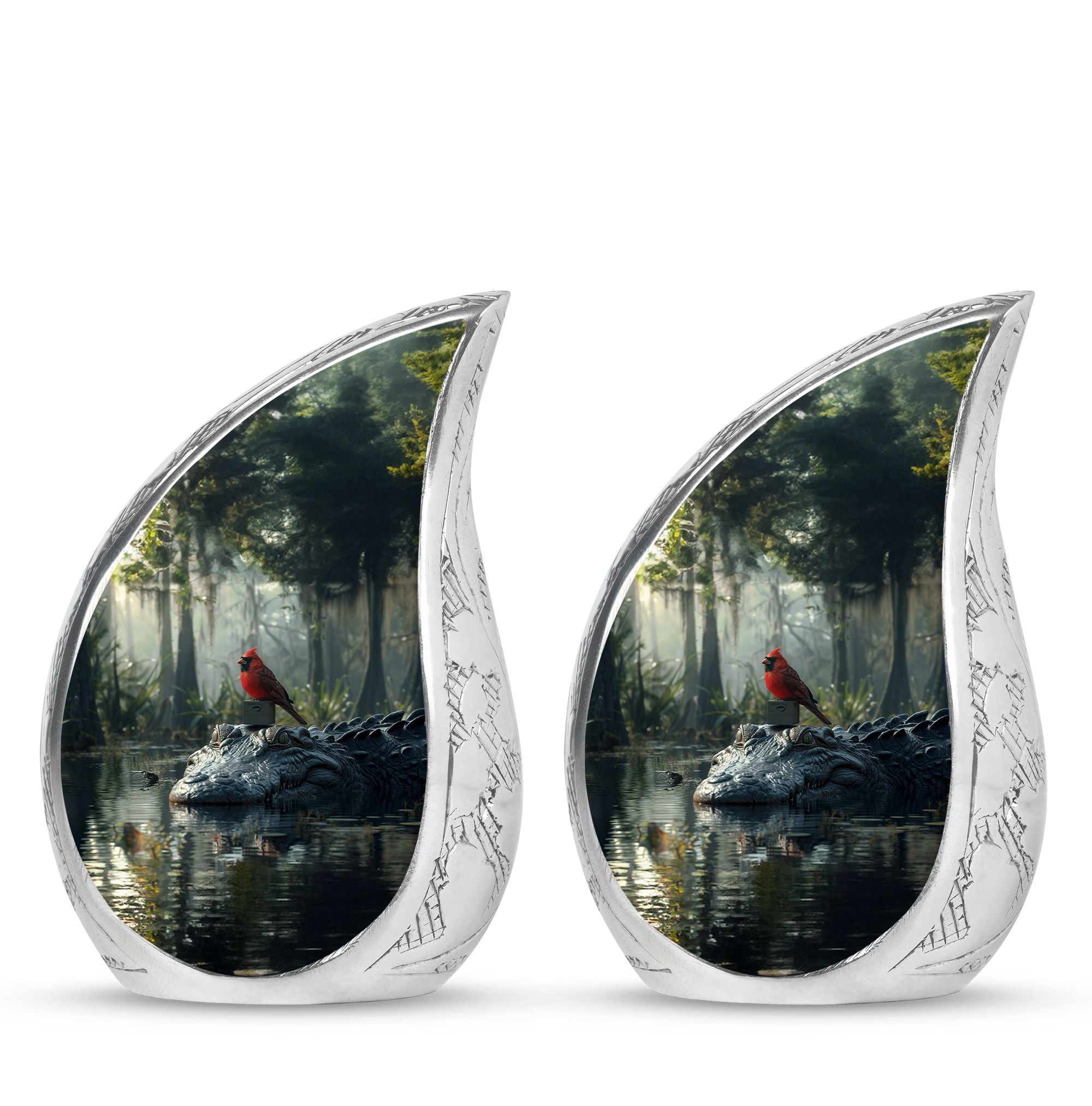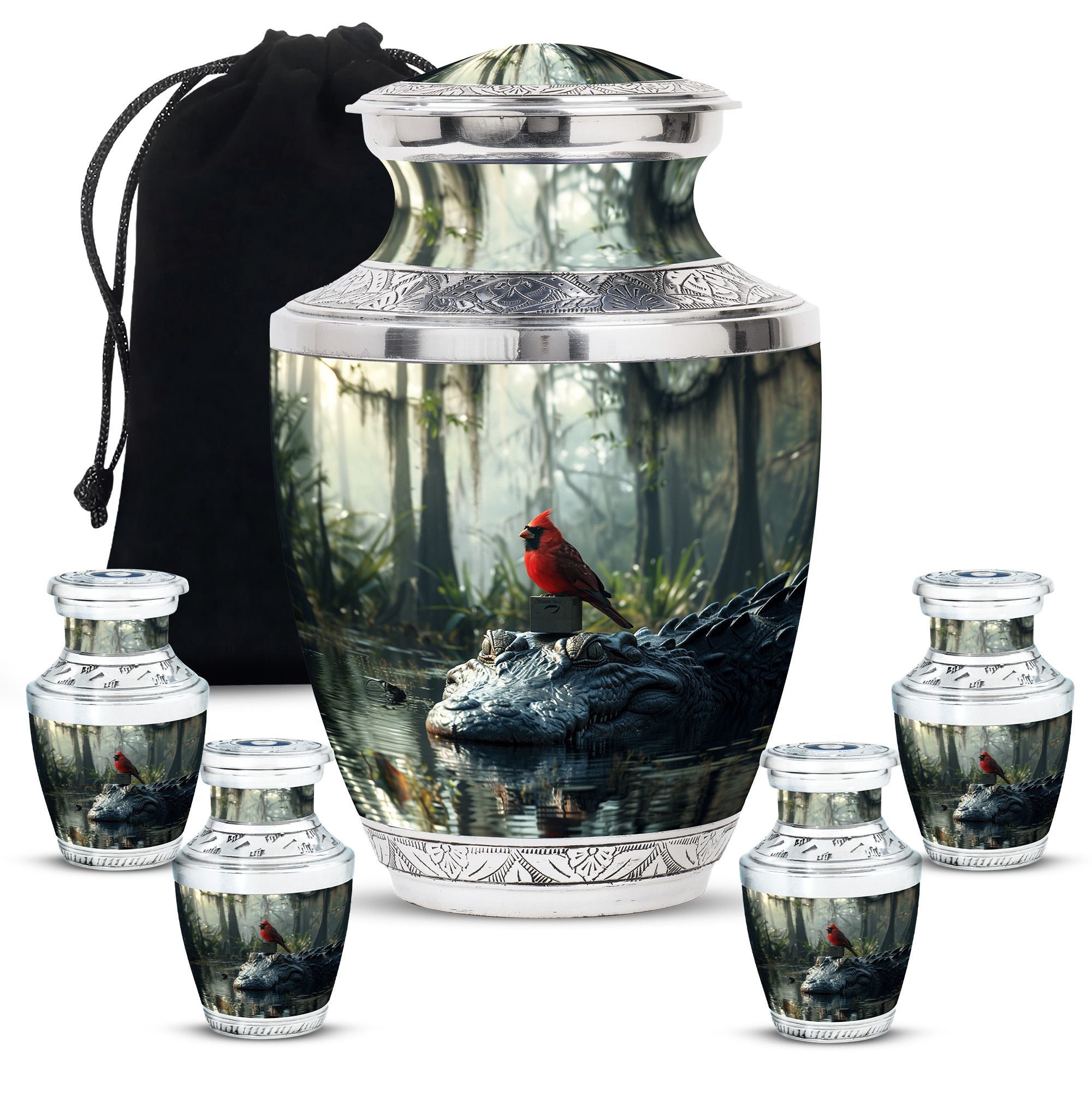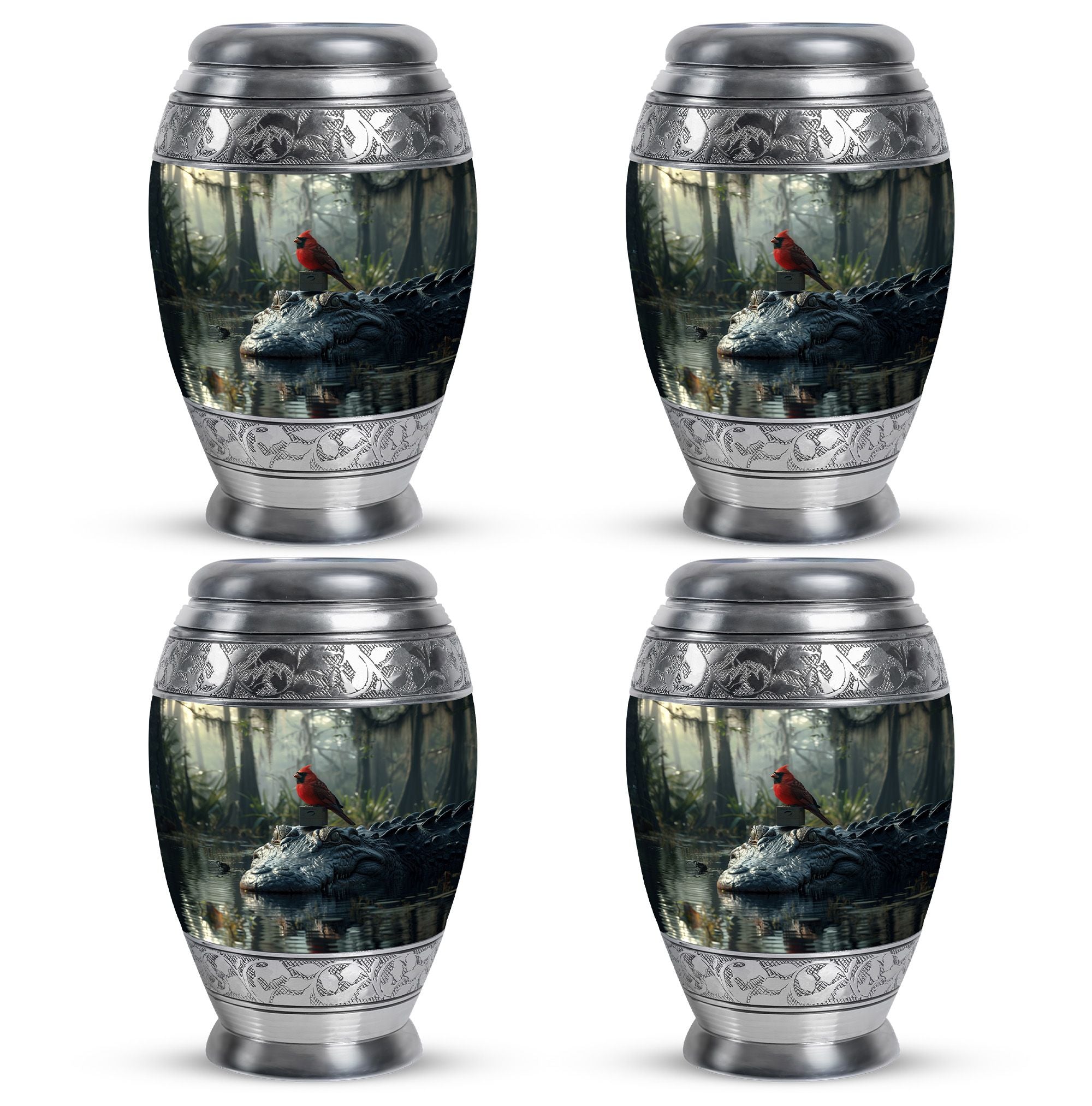 Crafted from durable aluminium, this urn showcases a unique crocodile-inspired finish paired with a graceful cardinal bird design, symbolizing hope and remembrance. Its secure screw-top lid makes it reliable for use as adult cremation urns, cremation urn human ashes, or small cremation urns for ashes, blending practicality with artistry.
